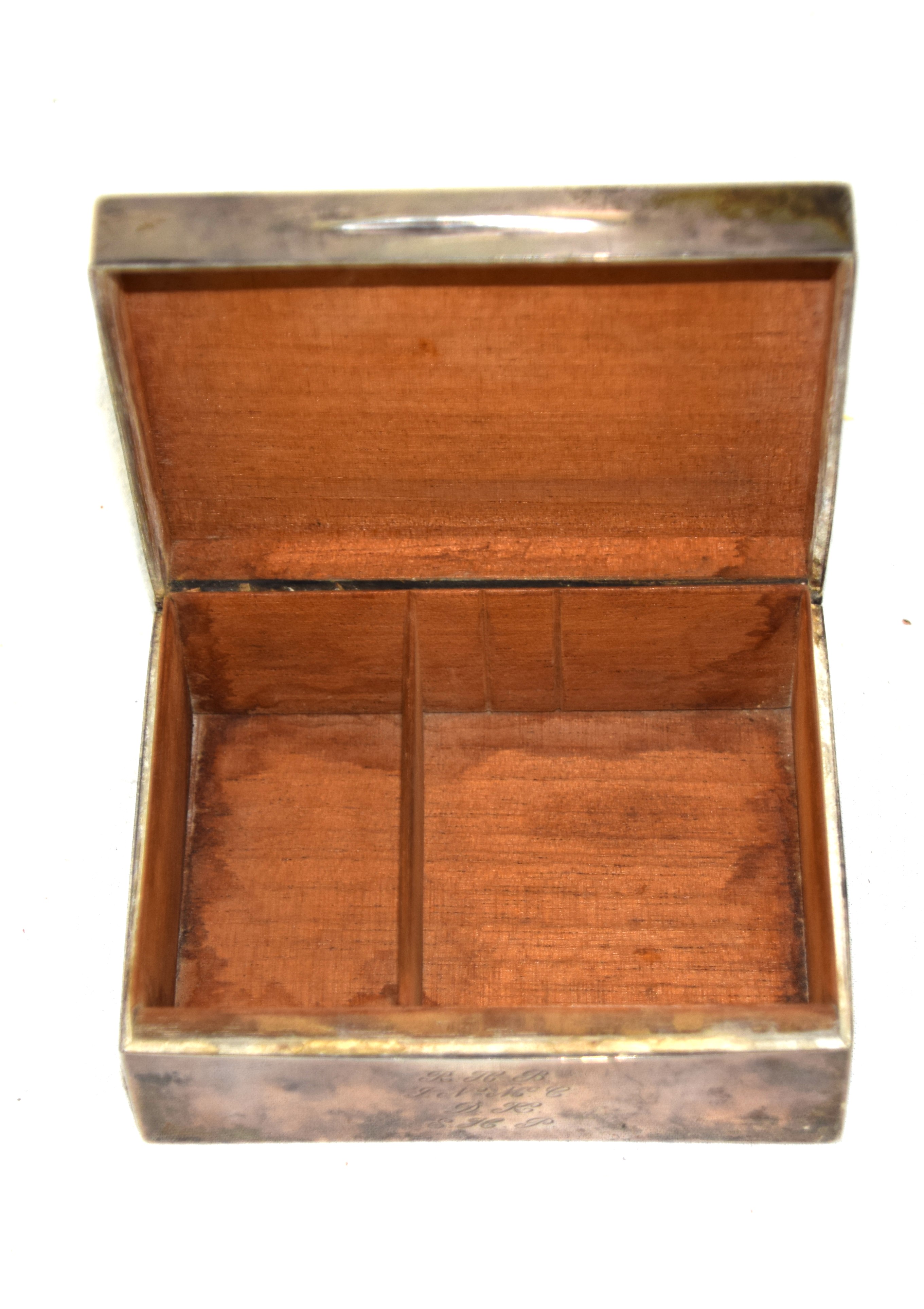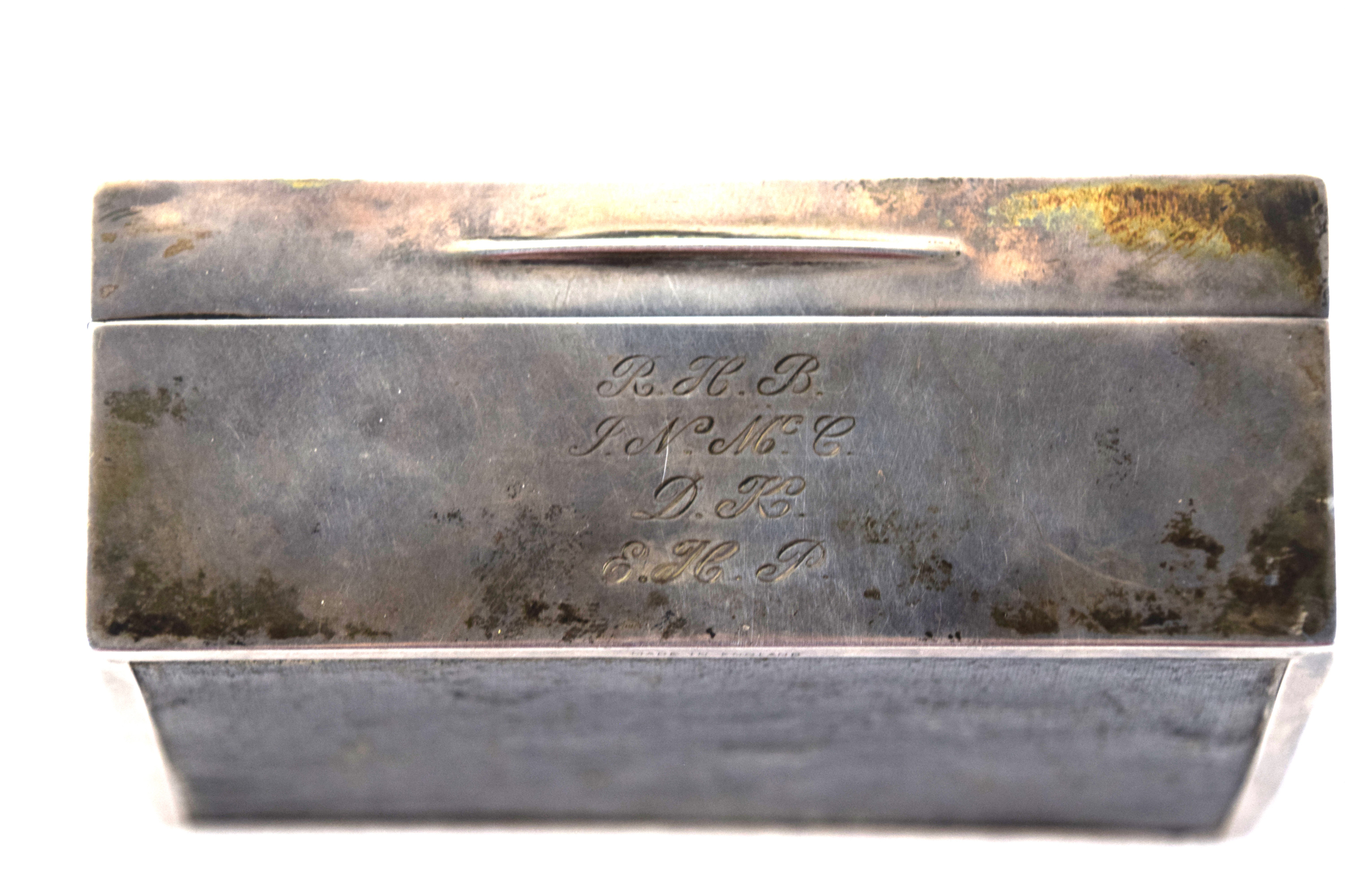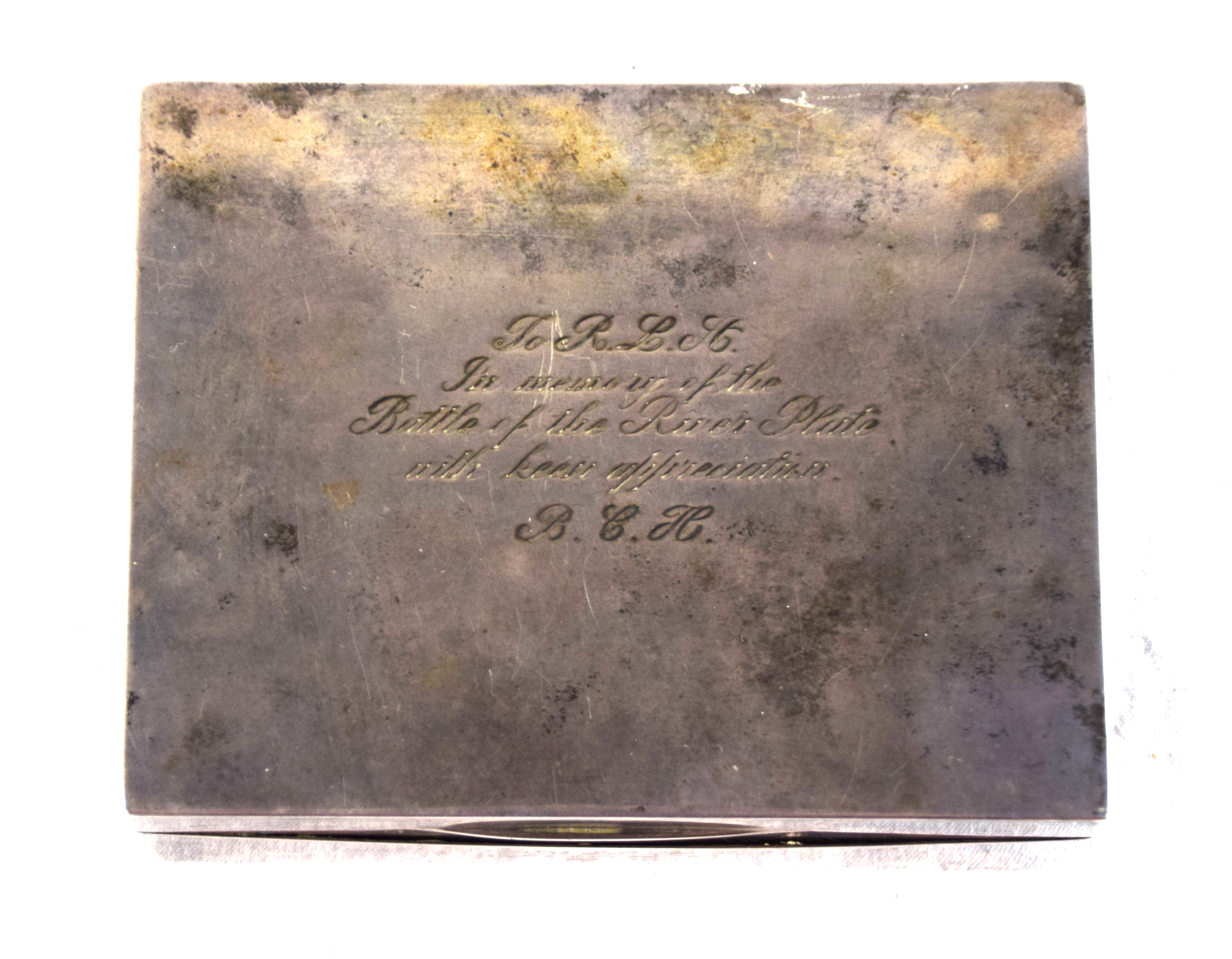A commemorative silver box with the engraving “To R.L.H. In memory of the Battle of the River Plate with keen appreciation. B.C.H.” The battle of River Plate was fought in the South Atlantic on 13 December 1939 as the first British naval battle of the Second World War. The Kriegsmarine heavy cruiser Admiral Graf Spee, commanded by Captain Hans Langsdorff, engaged a Royal Navy squadron, commanded by Commodore Henry Harwood, comprising the light cruisers HMS Ajax, HMS Achilles, and HMS Exeter. Apparently believing that the British had gathered a superior force the Graf Spee was scuttled. R.L.H. maybe Lieutenant Robert Lawrence Heenan of the Exeter. Dimensions: 2″ x 4.5″ x 3.5″