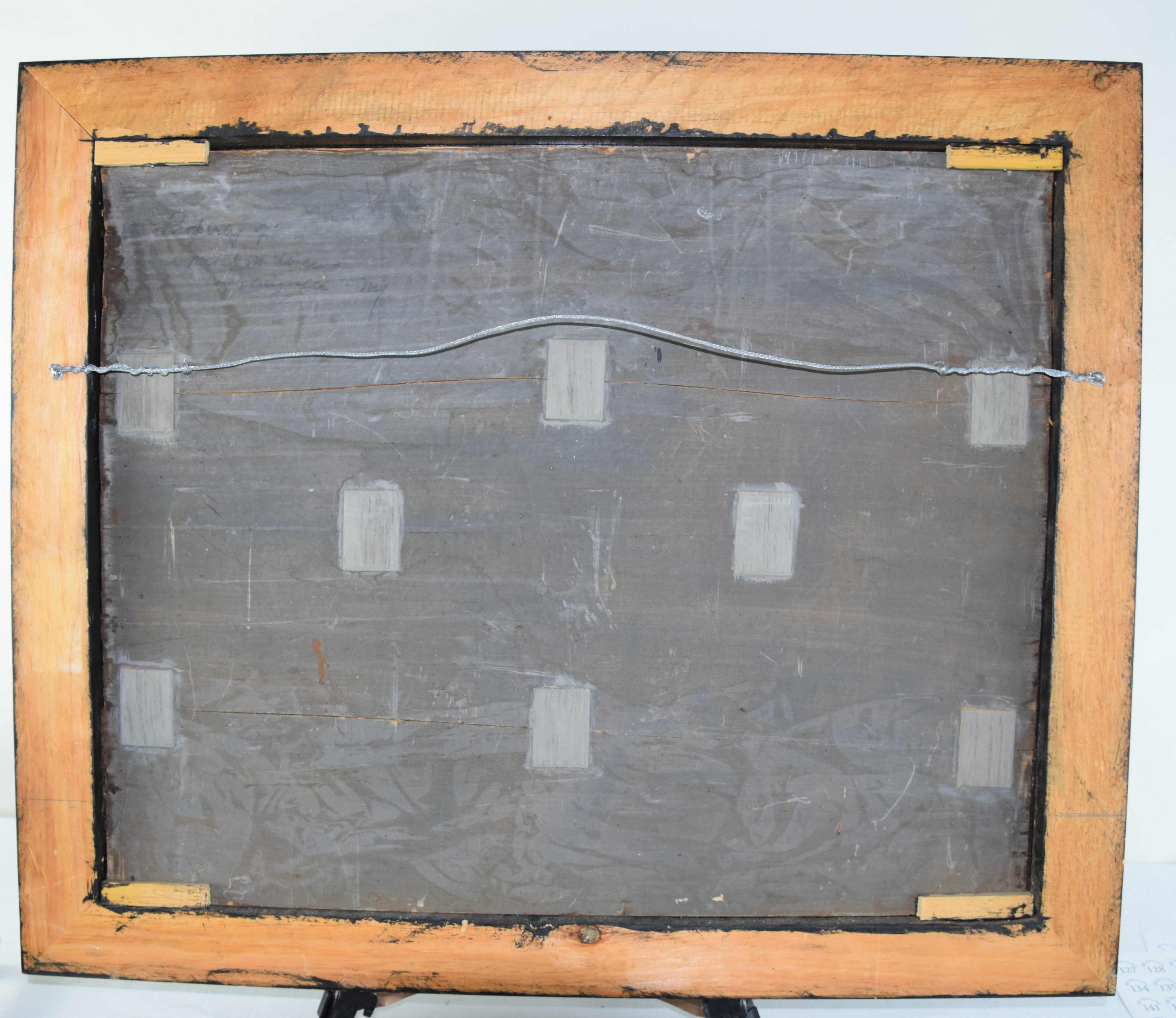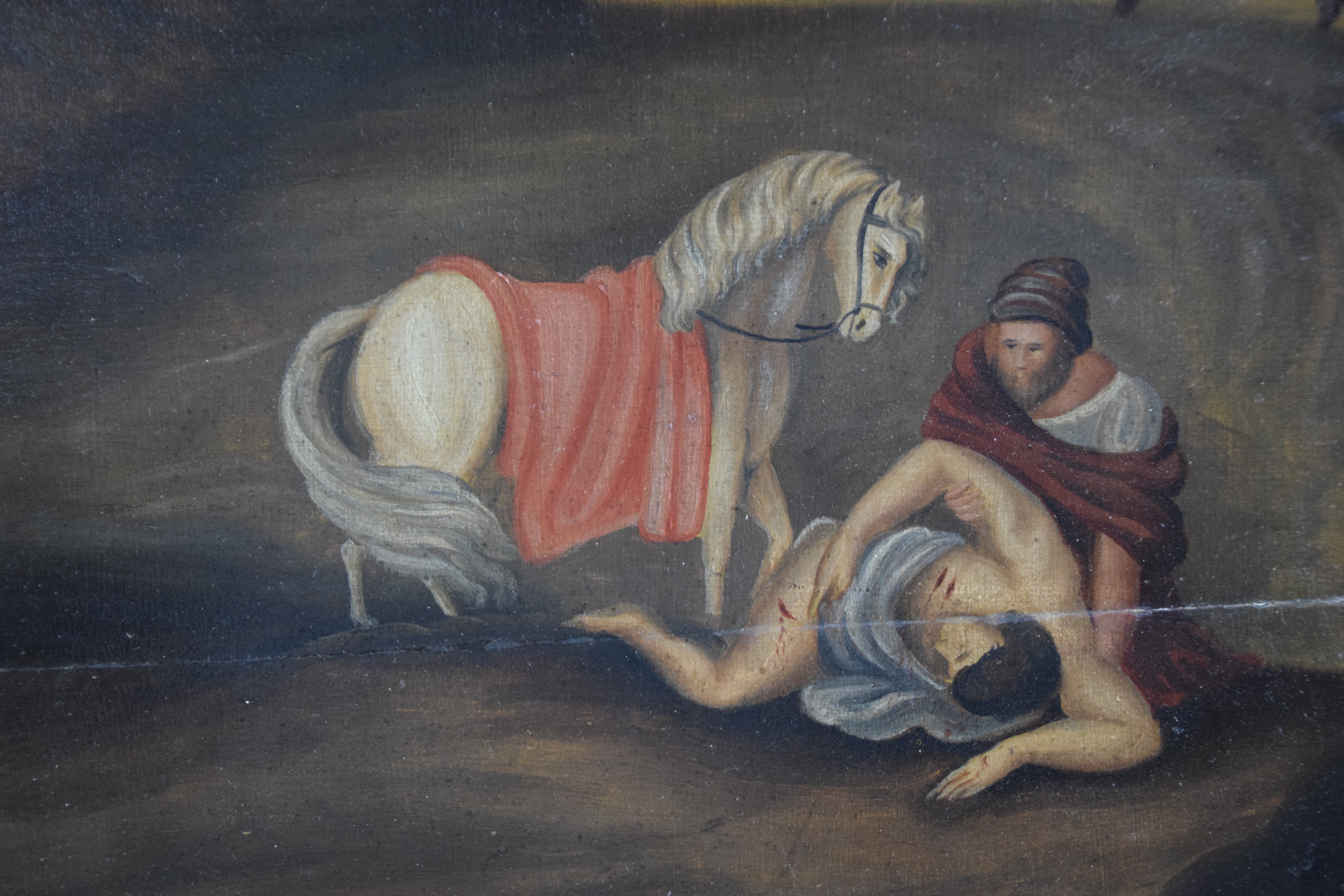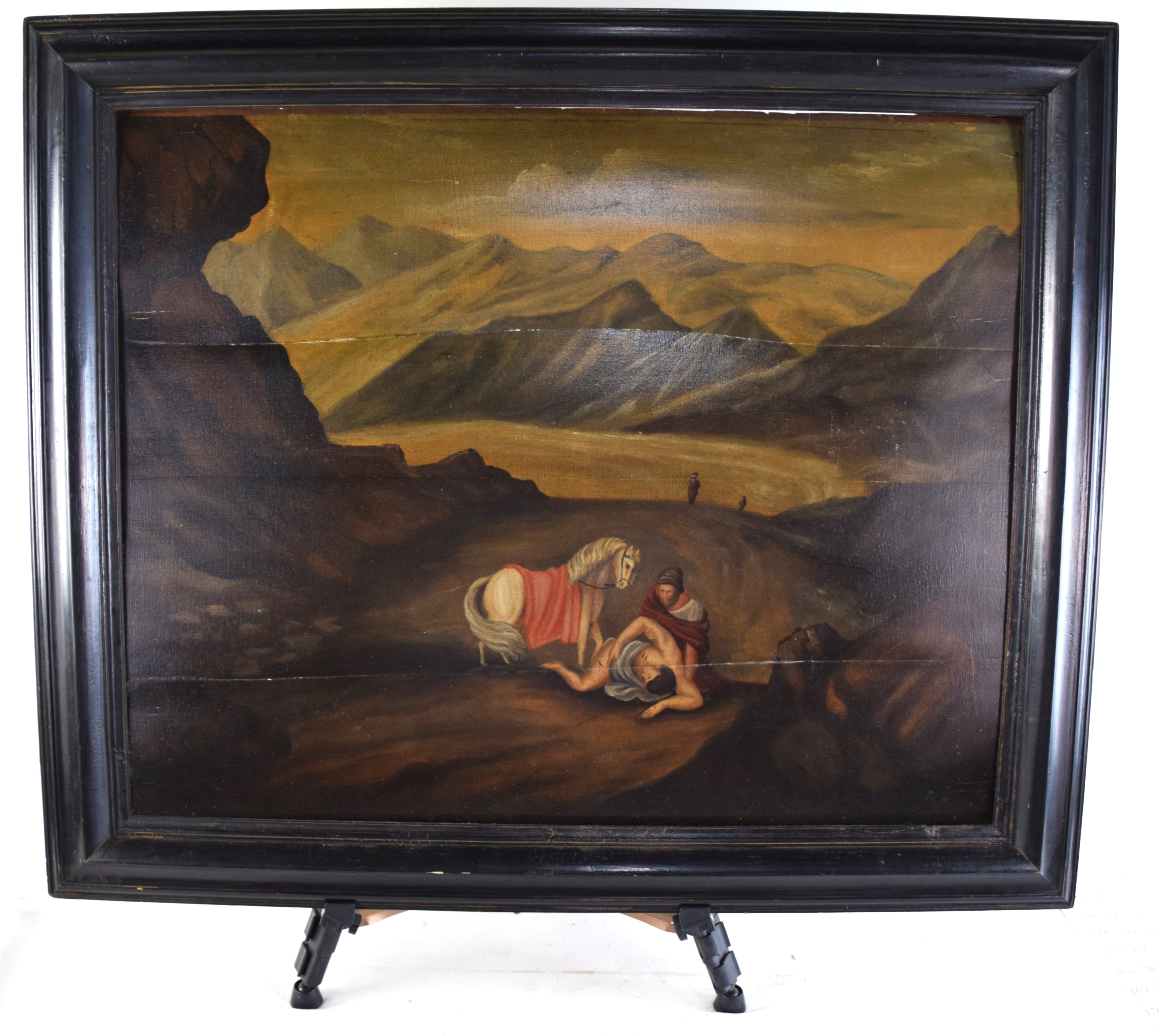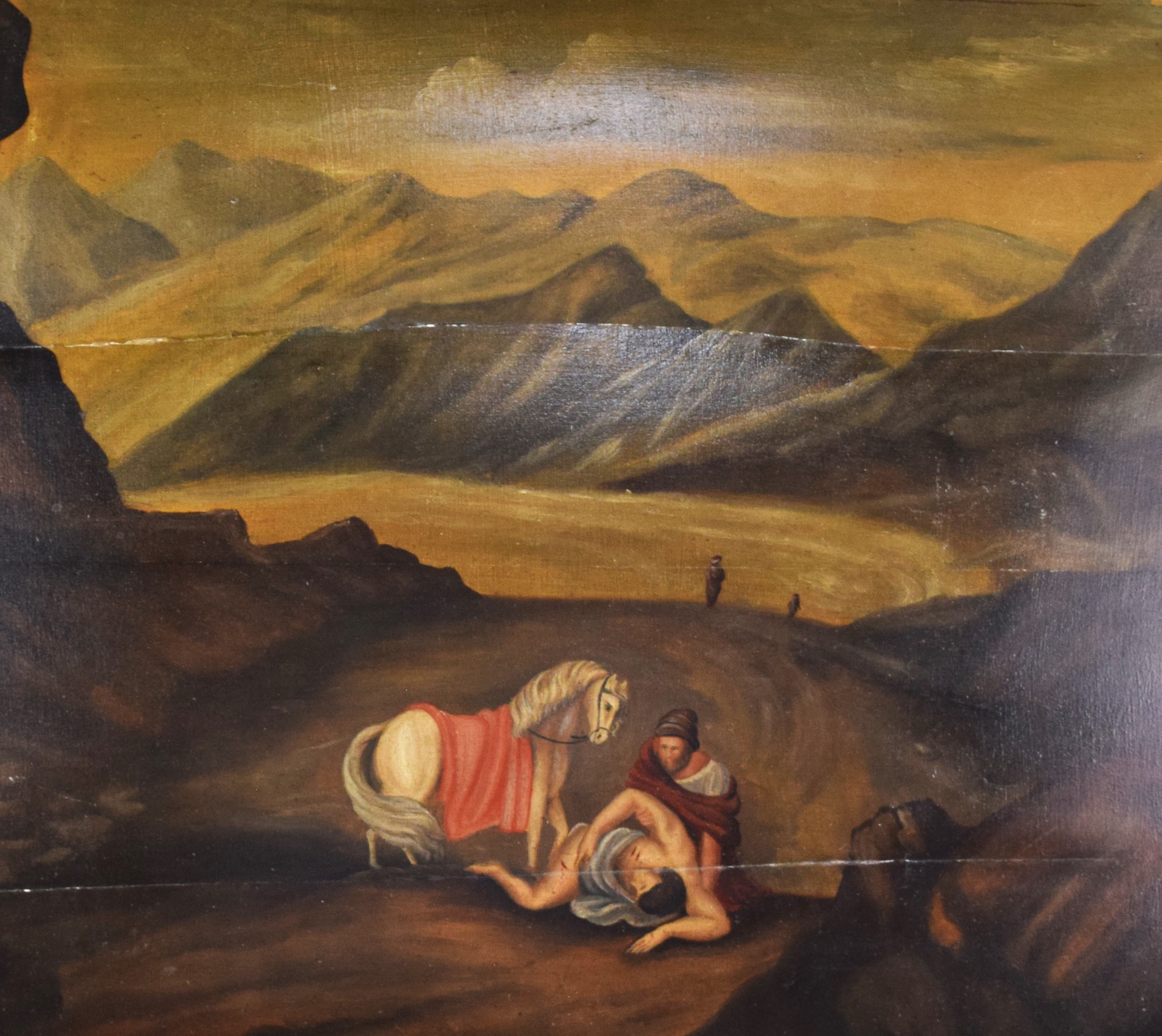 An oil painting on three panels depicting the scene of the Good Samaritan along a mountain road, attributed to Washington Allston. Washington Allston (1779 – 1843) worked in Massachusetts and South Carolina and is known for allegorical, portrait, history and religious painting. Dimensions: 23″ x 28″