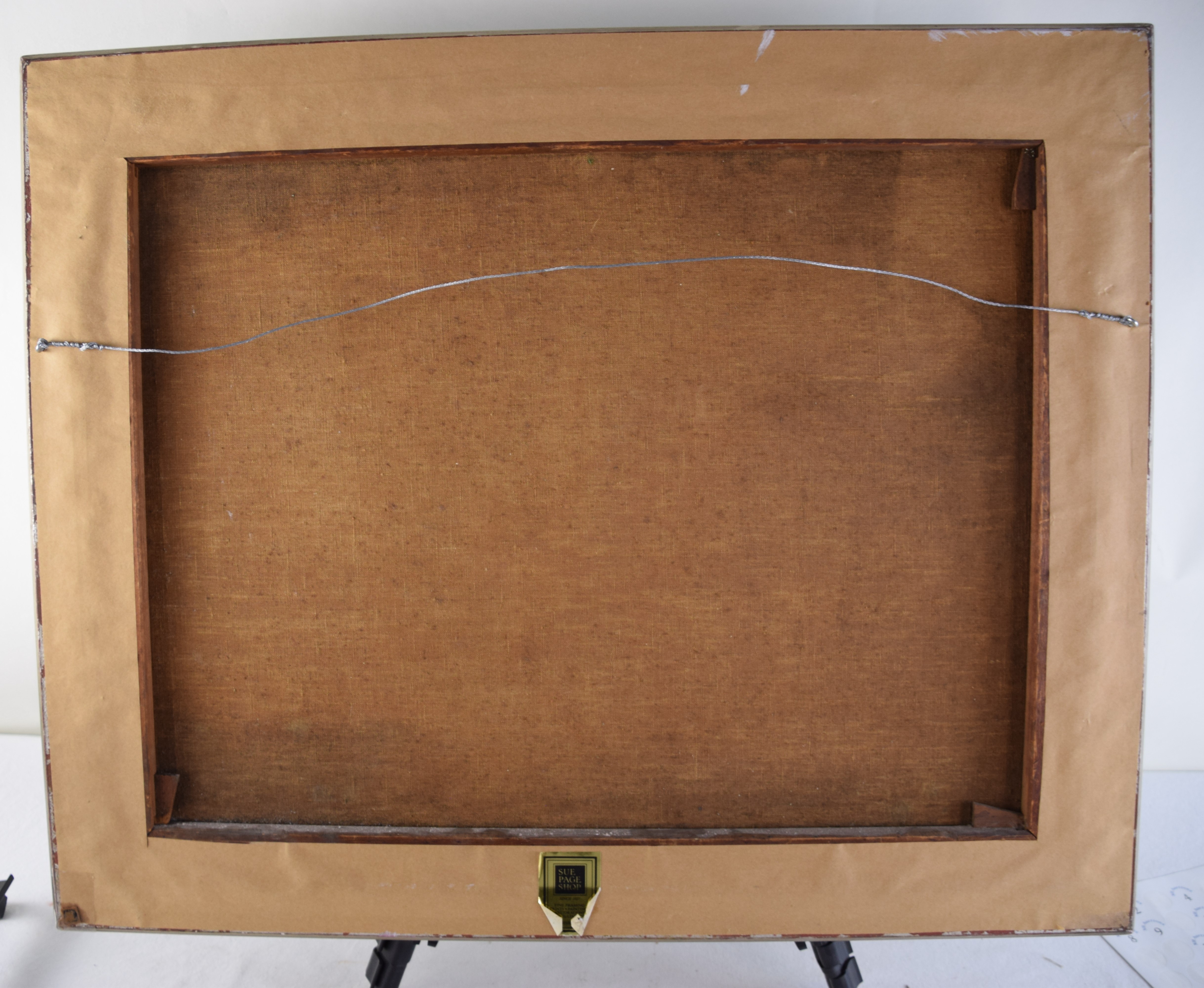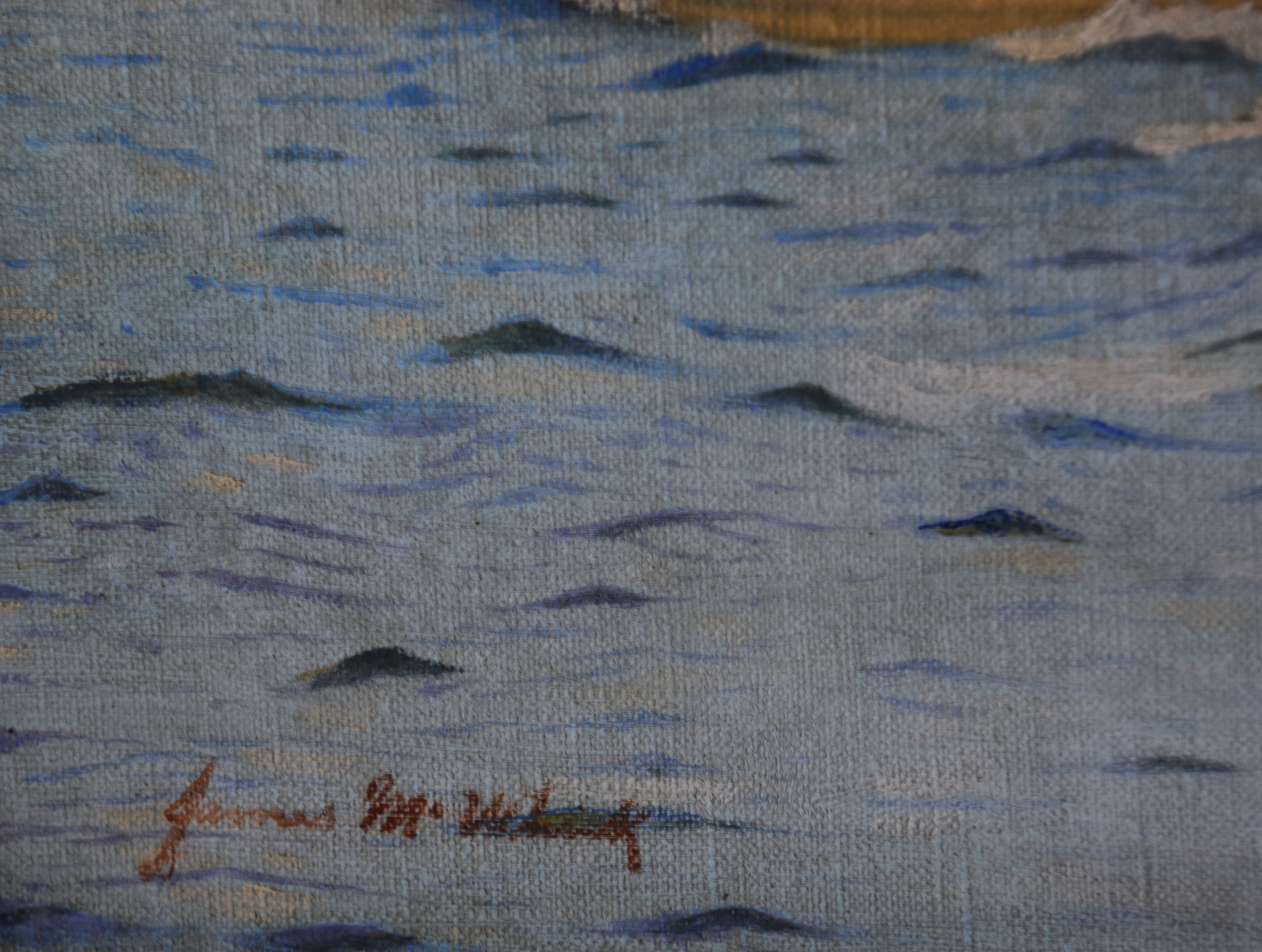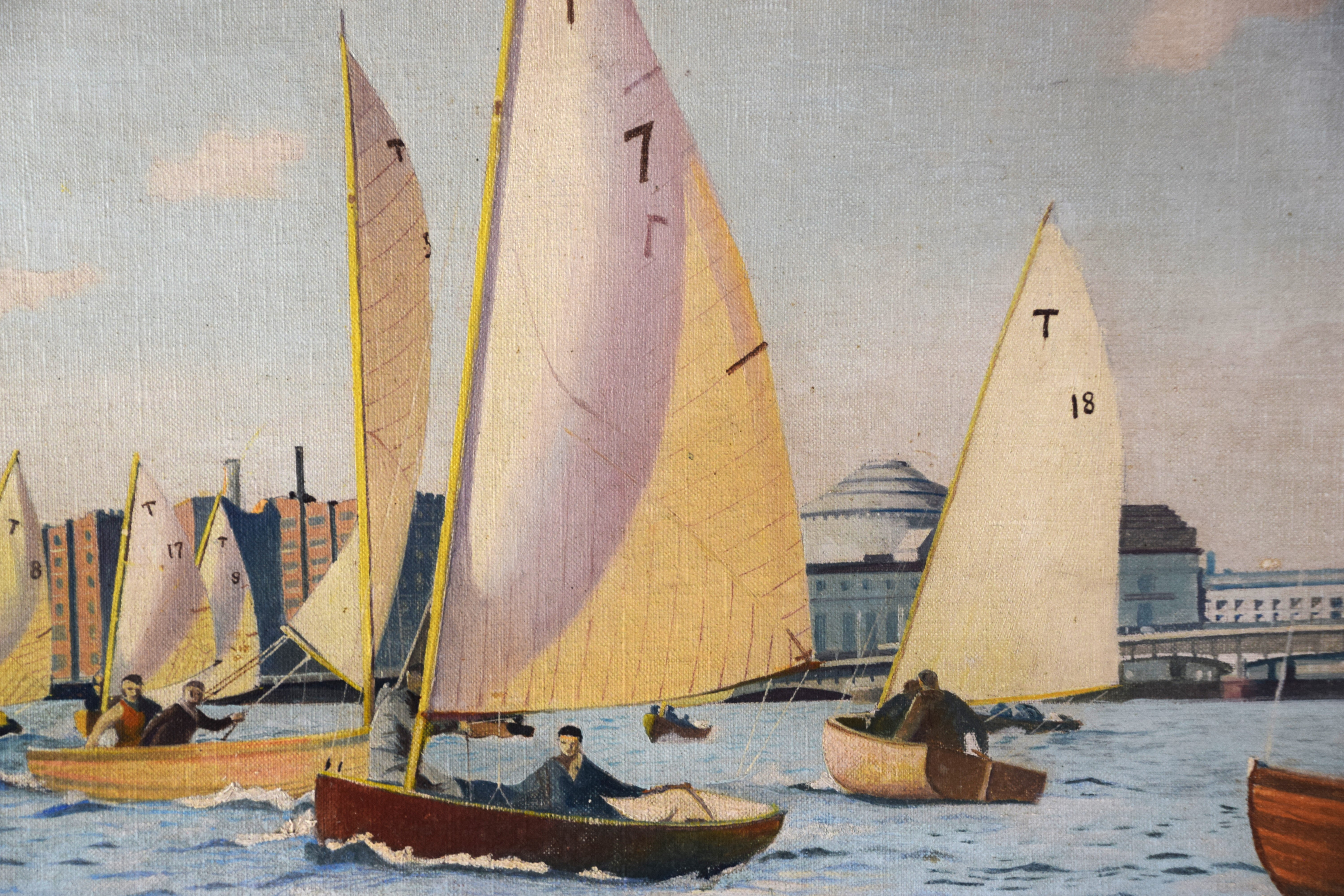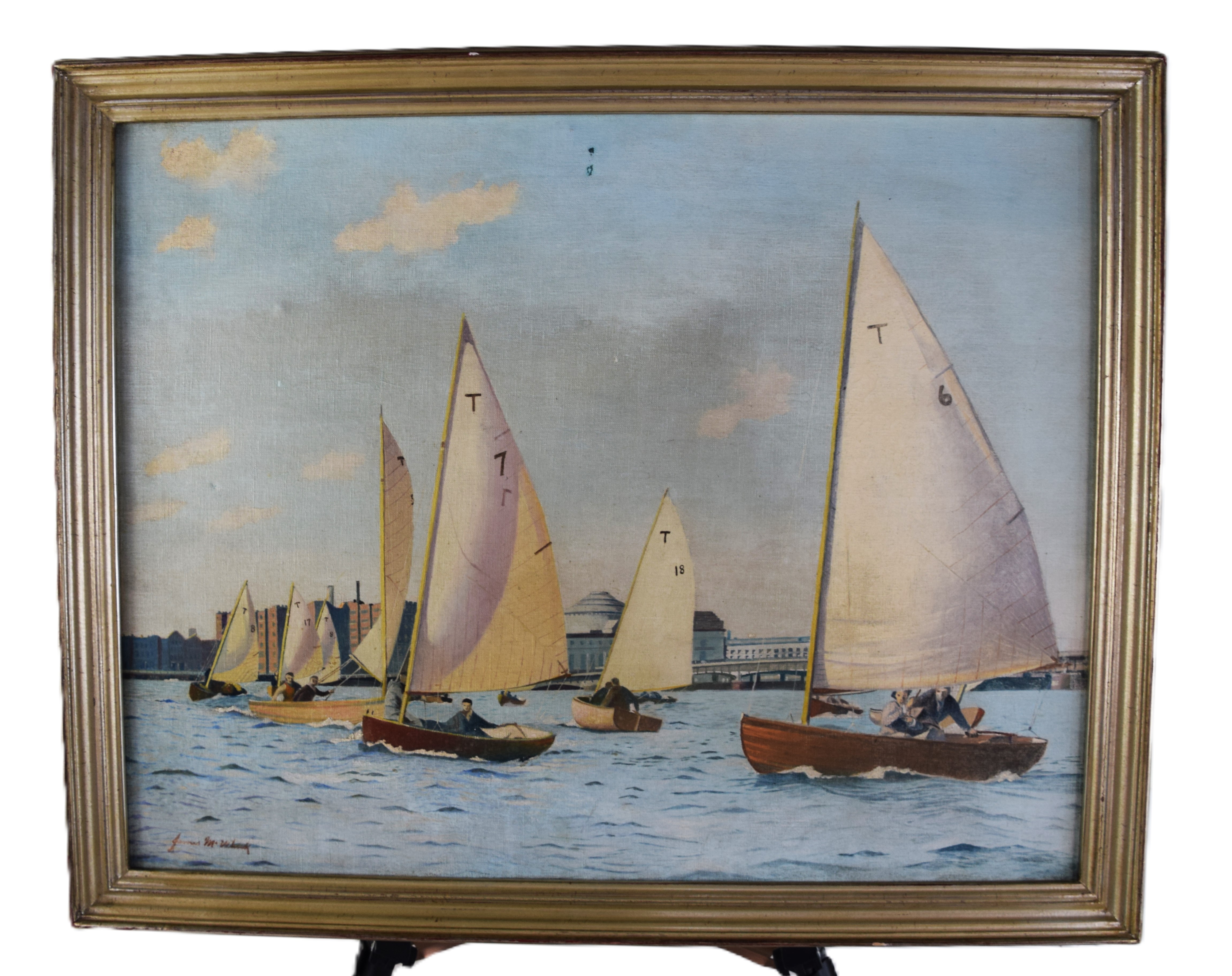 Seven sailboats on the Charles River by MIT, signed lower left illegibly. Dimensions: 21.5″ x 27″