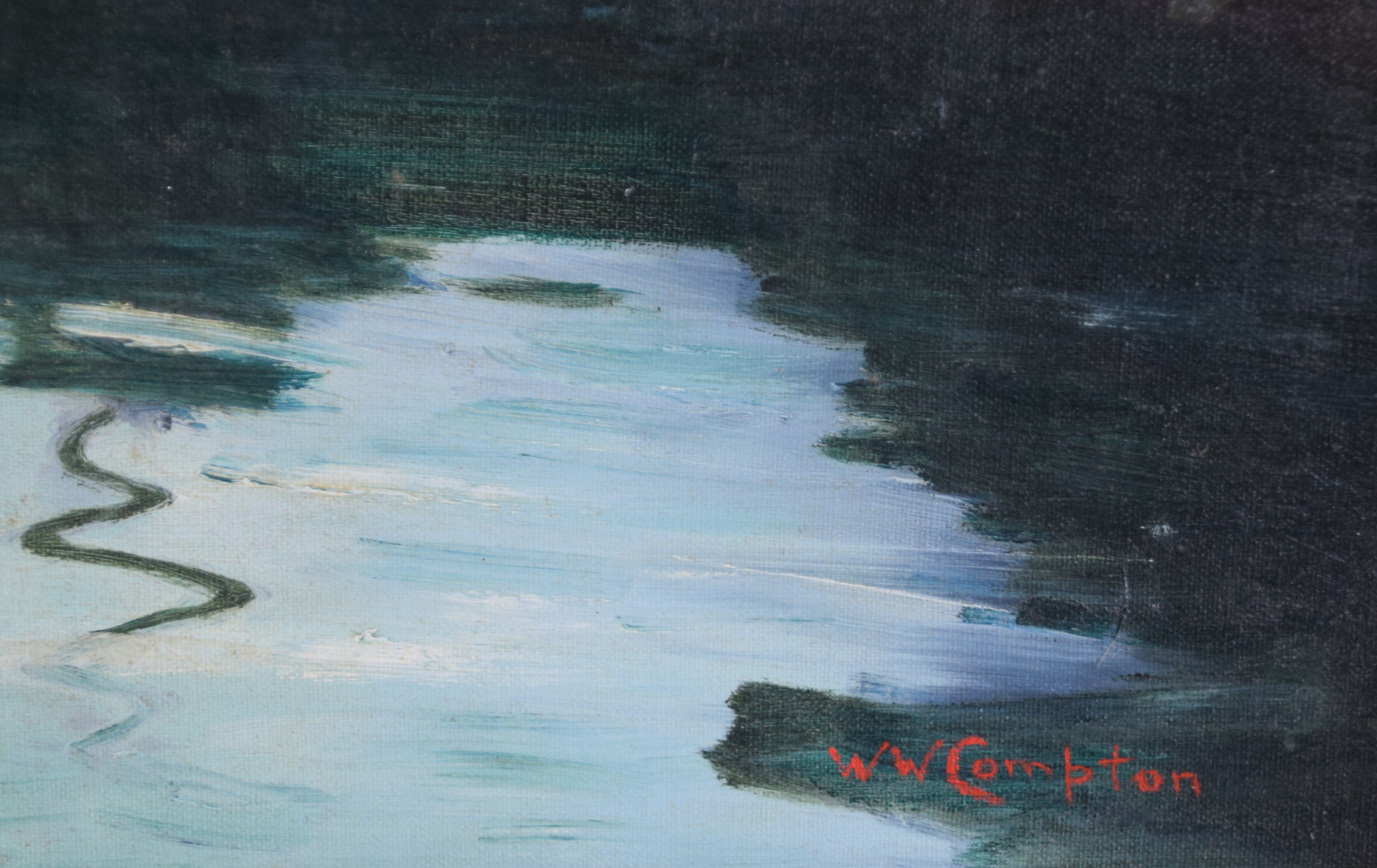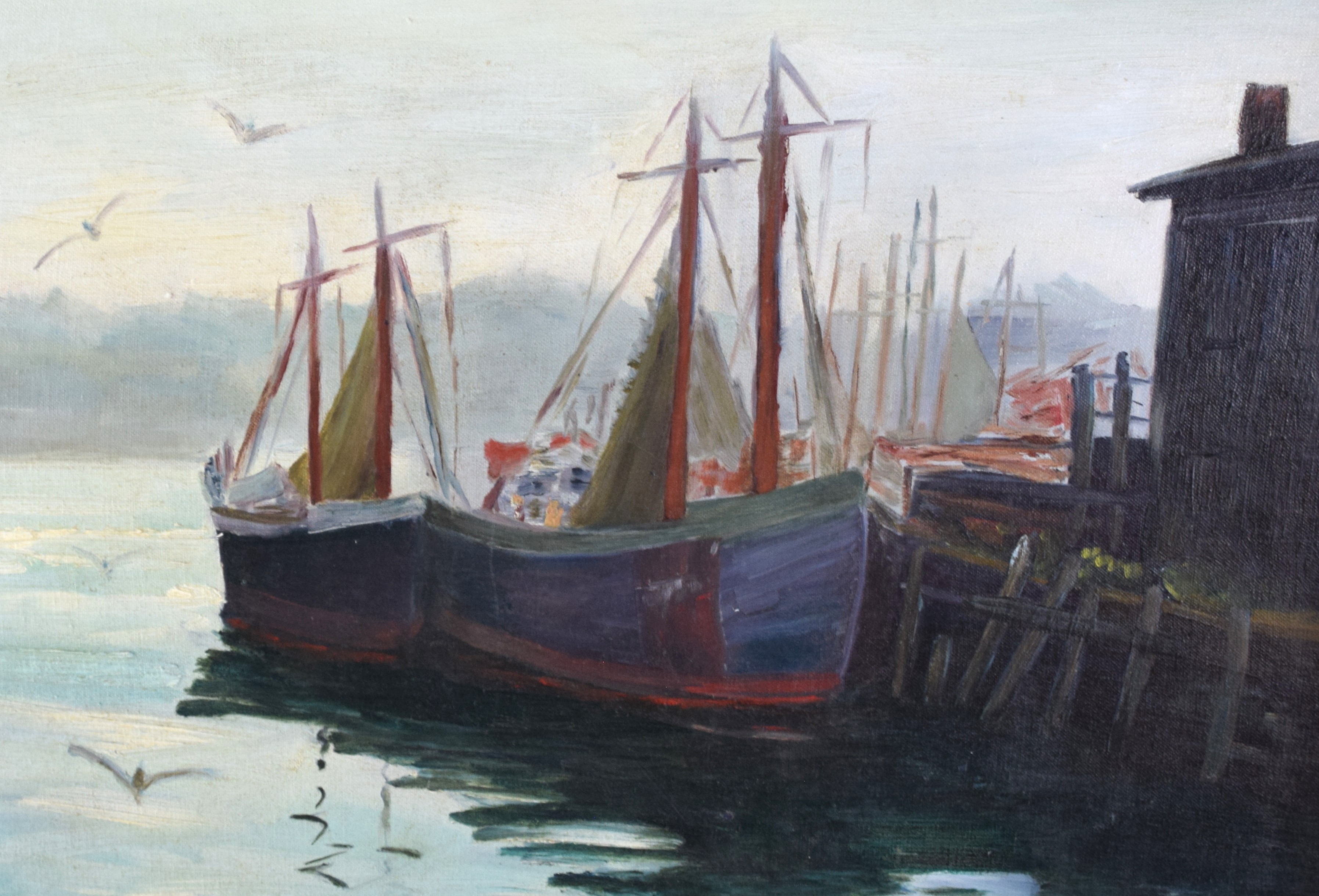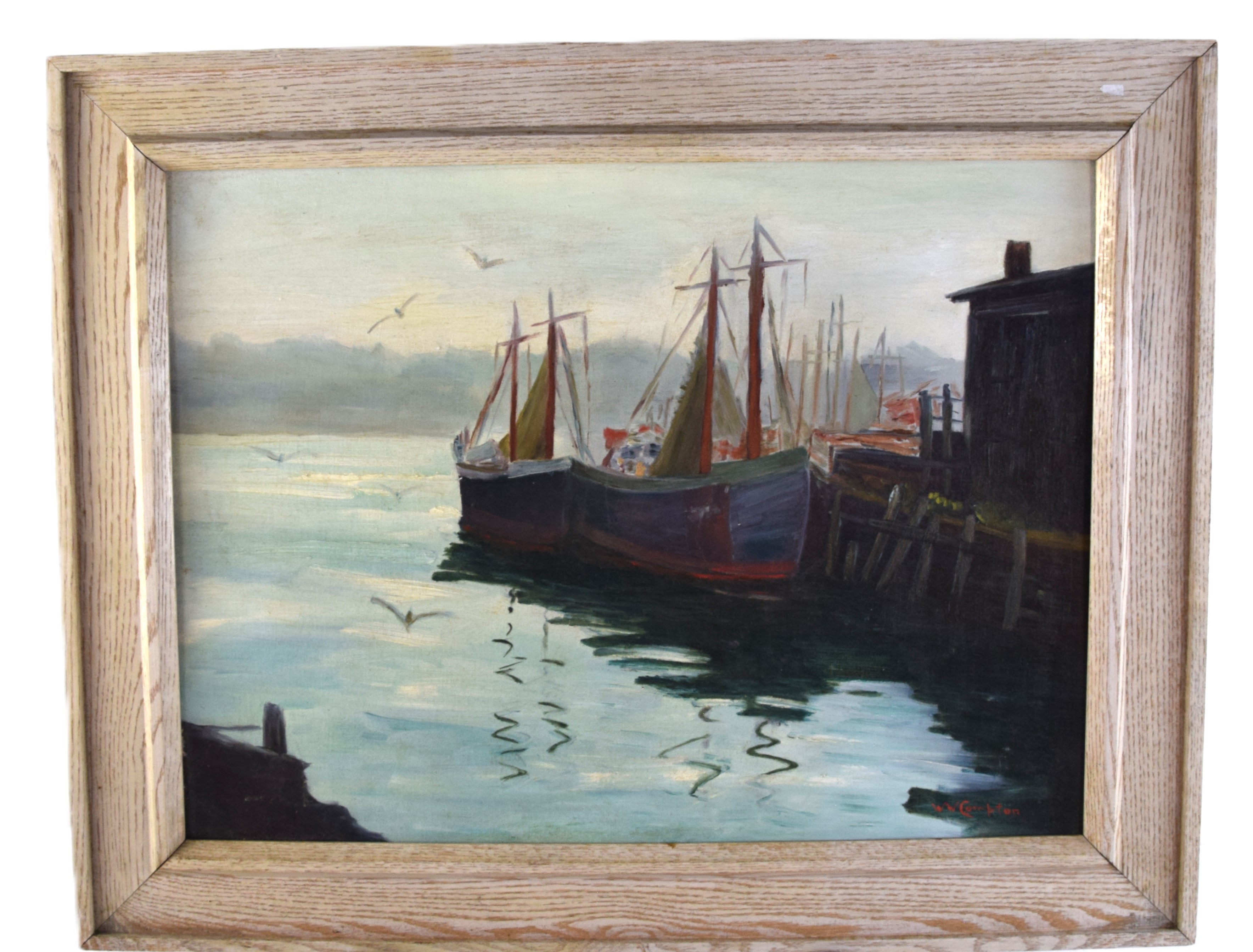 Seascape oil painting on board of a fishing boat at port. Signed lower right W. Compton. Winifred W Compton (1970s) worked in Maine and is known for marine paintings. Dimensions: 17″ x 23″ Image size