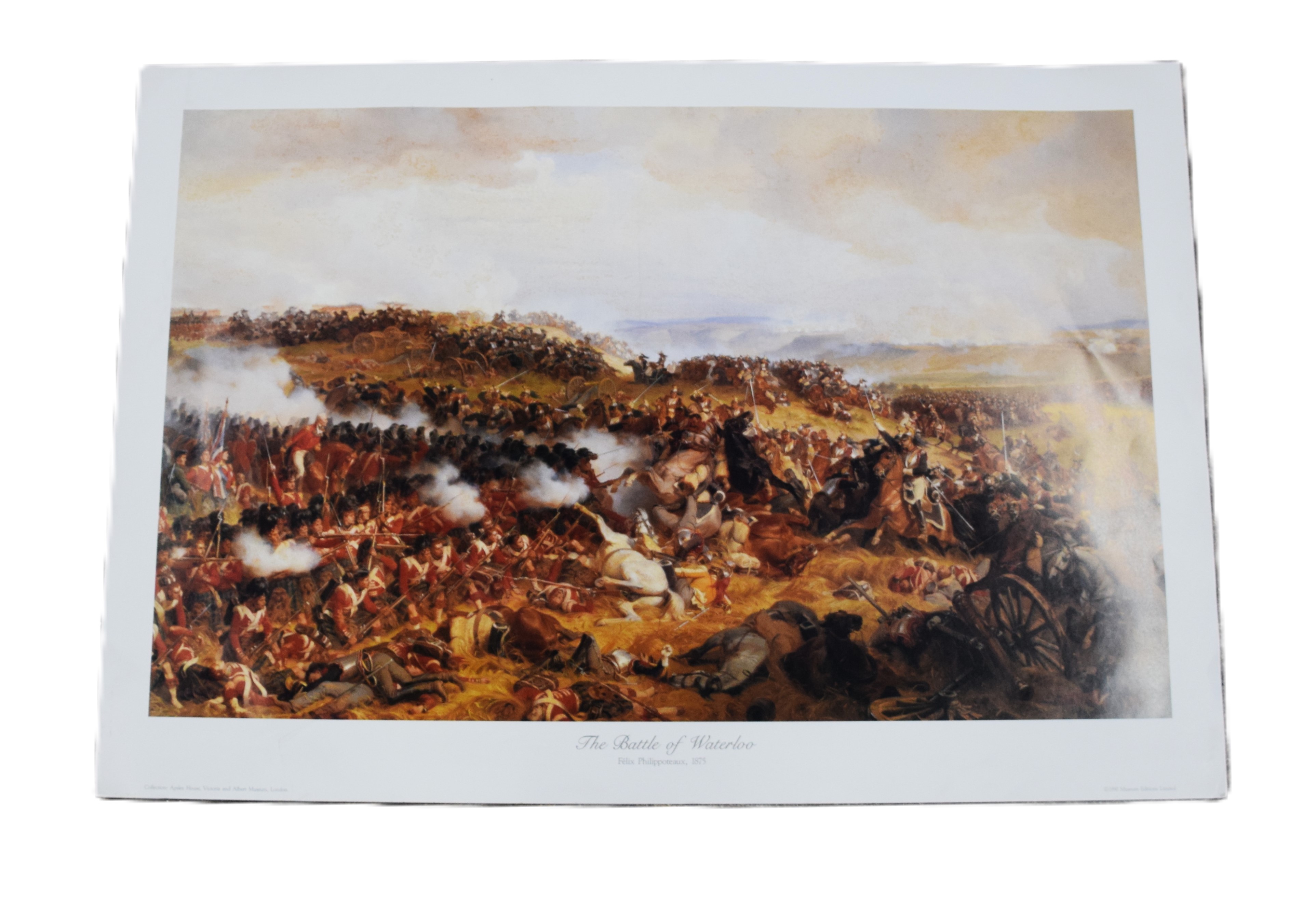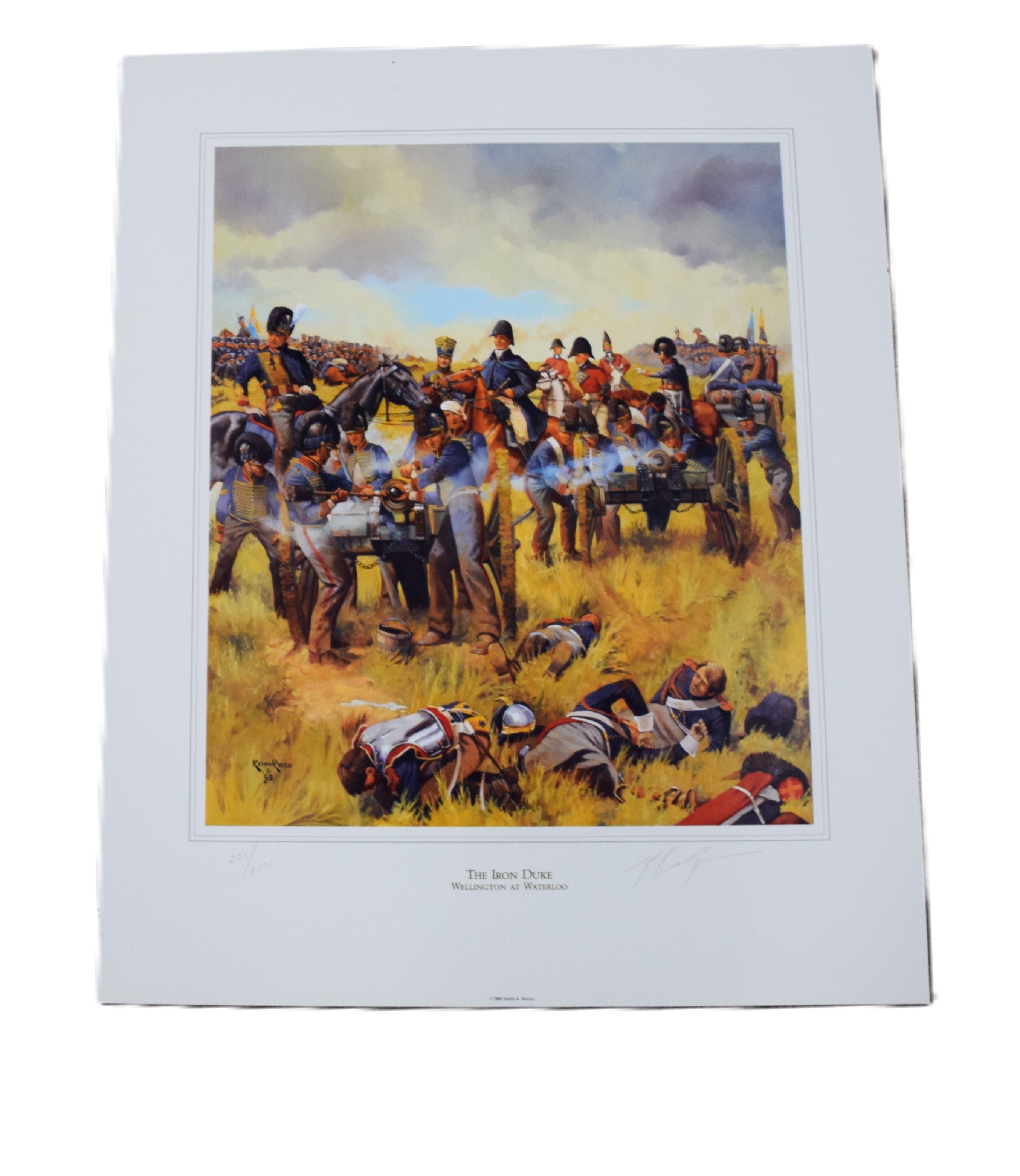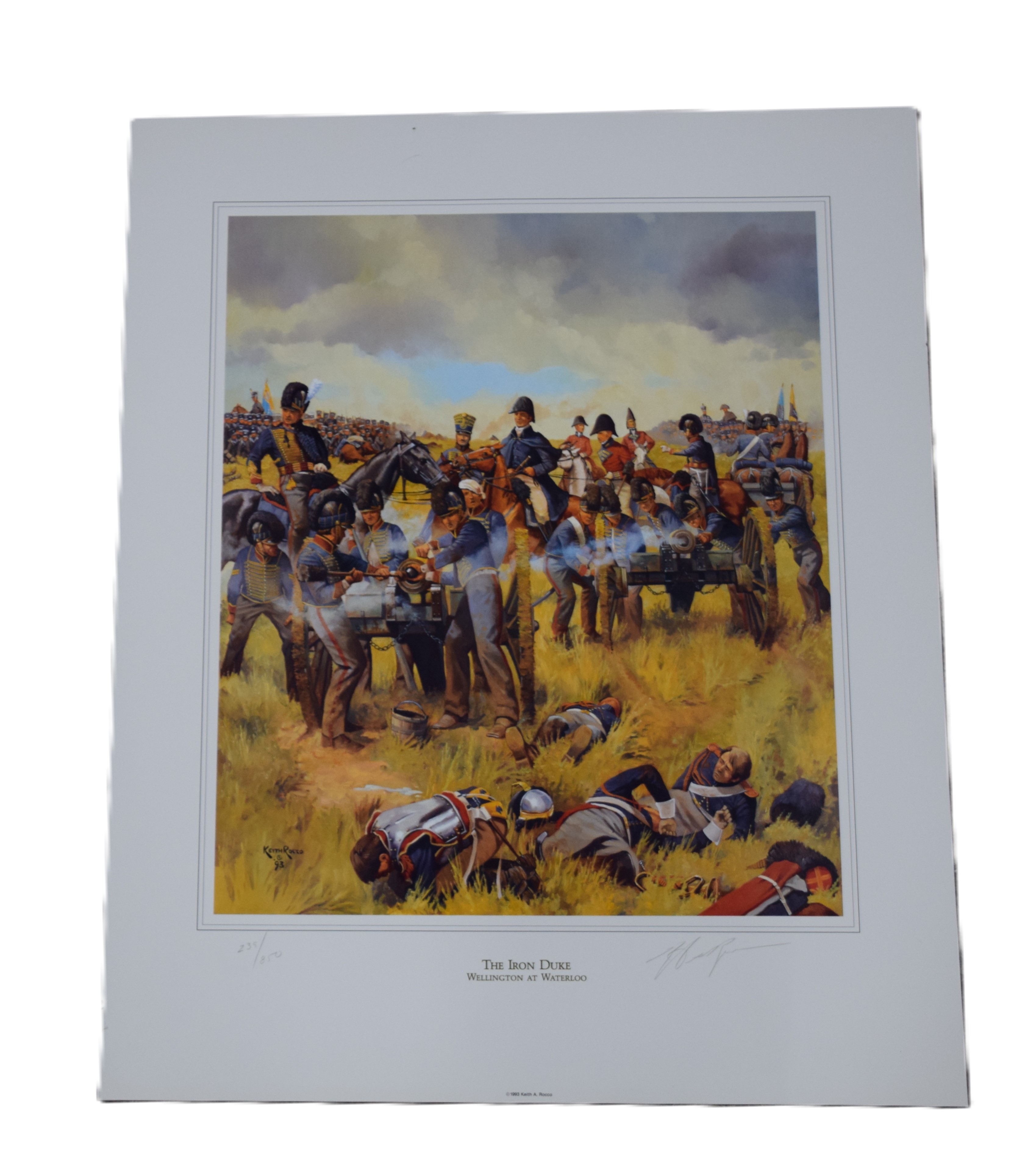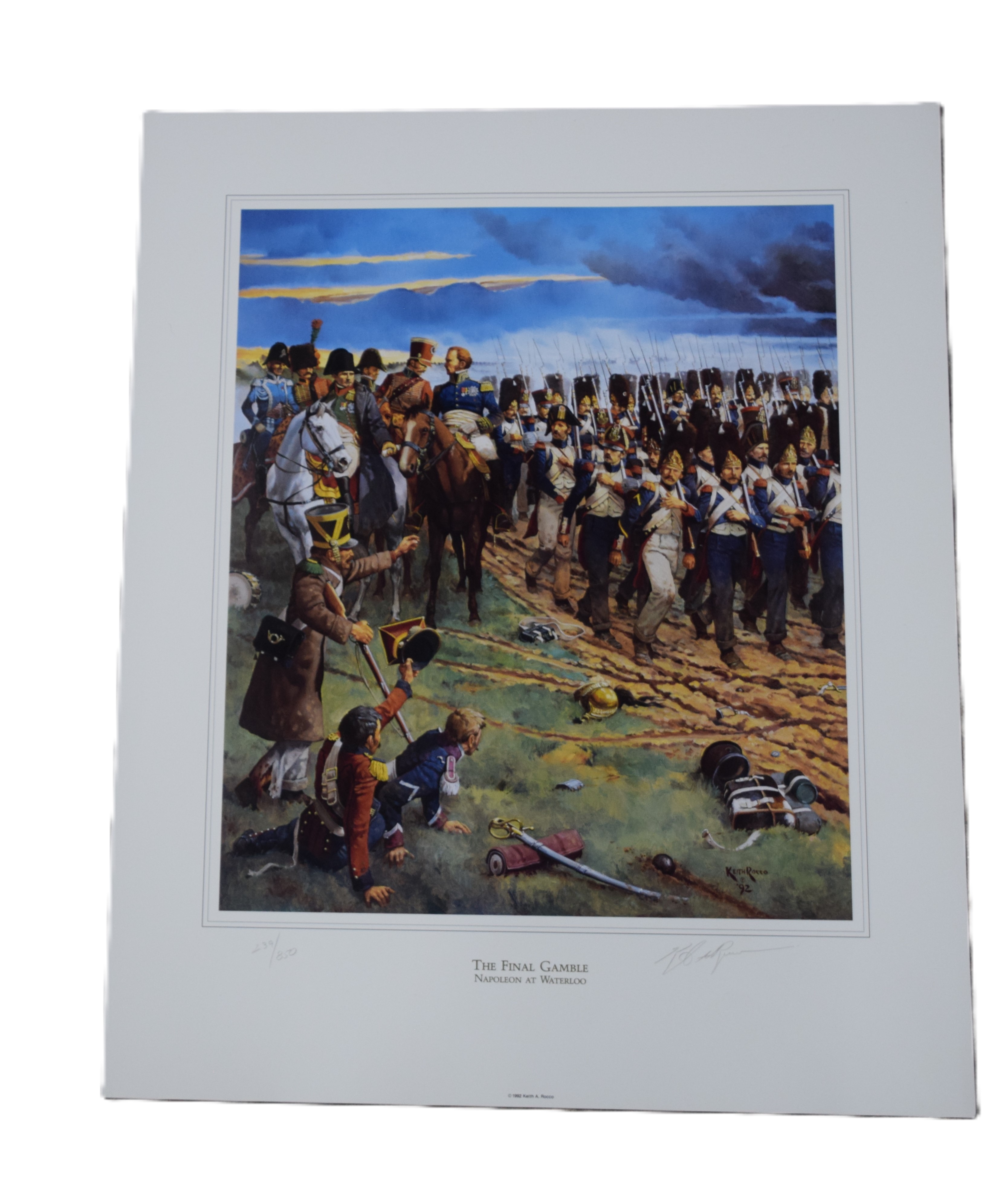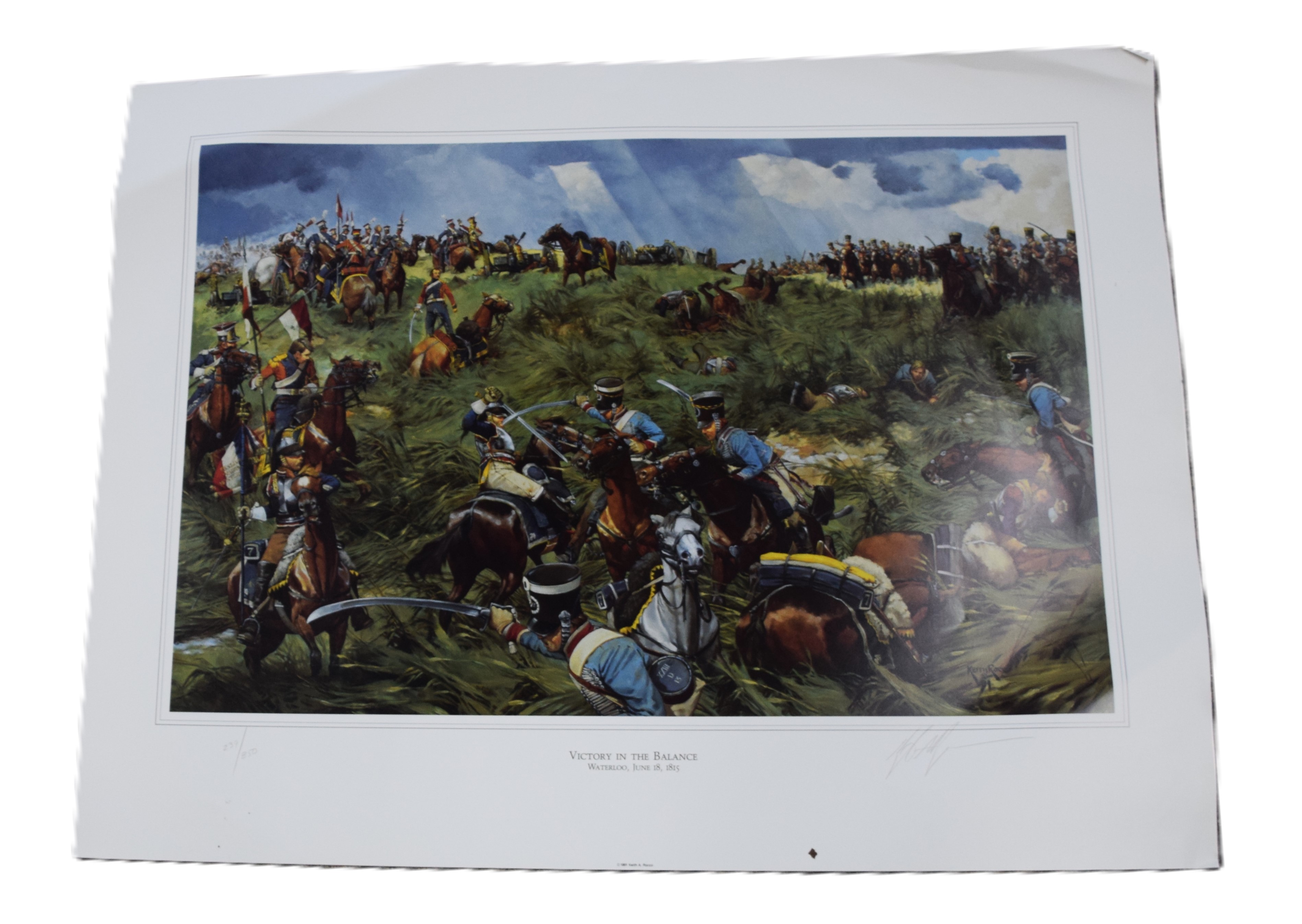 Three signed lithographs (239 of 850) of the Waterloo battlefield-1990 print of Waterloo from Felix Philippteaux, (22″ x 32″), Signed and numbered “The Final Gamble”, ” The Iron Duke” and “Victory In The Balance” (24″ x 20″) along with a Napoleon print by E. Grofts (26″ x 19″) and other prints.