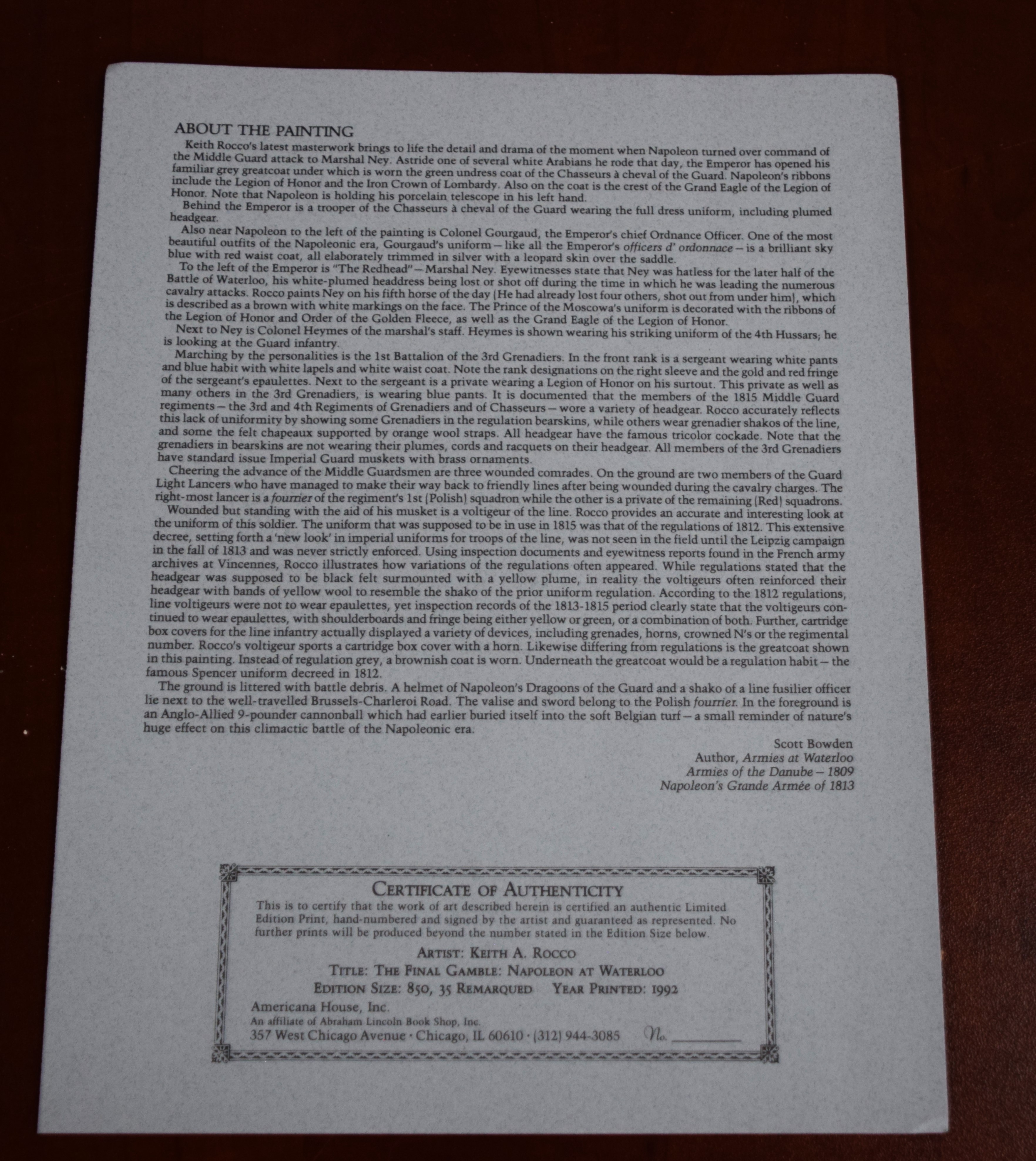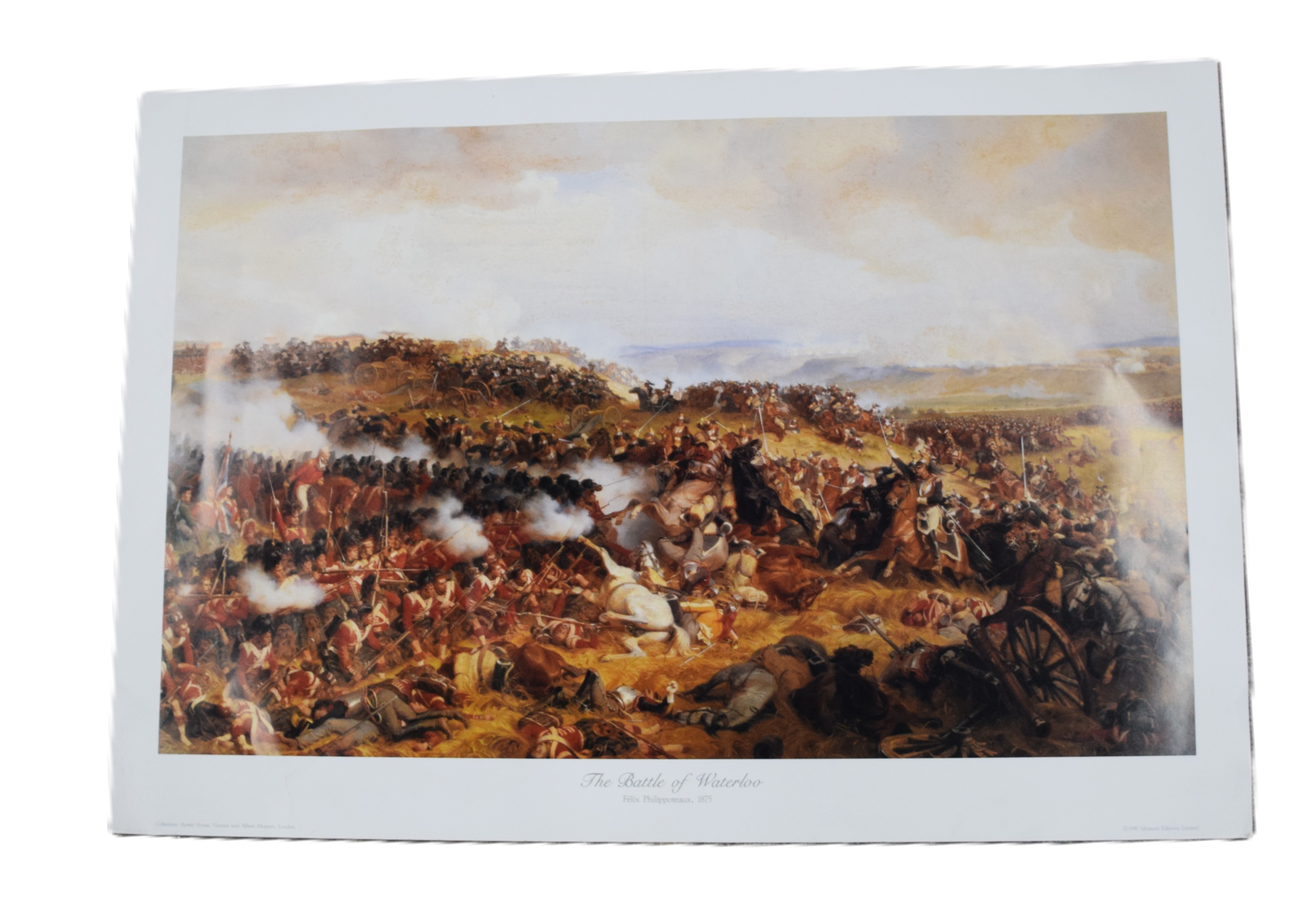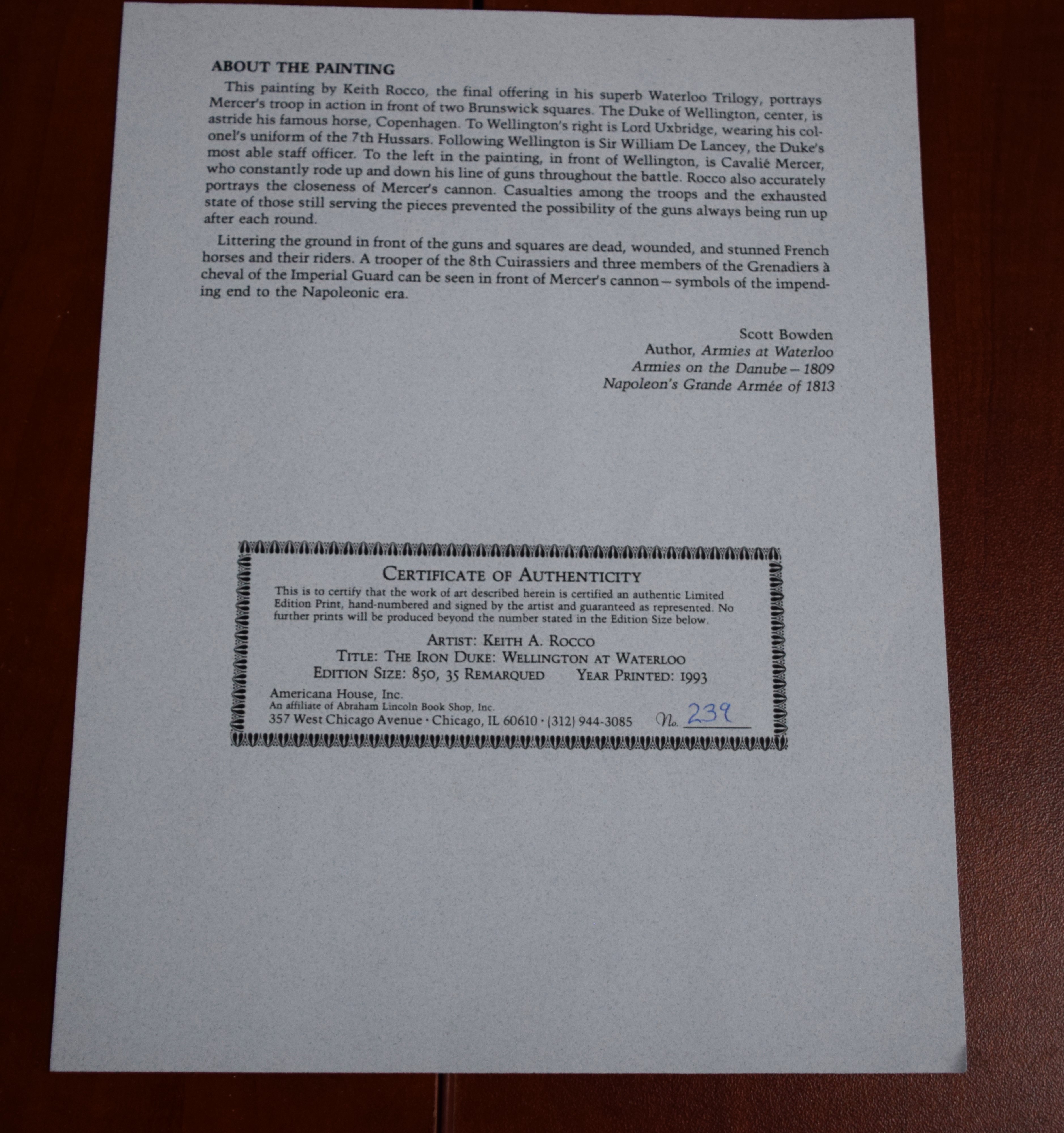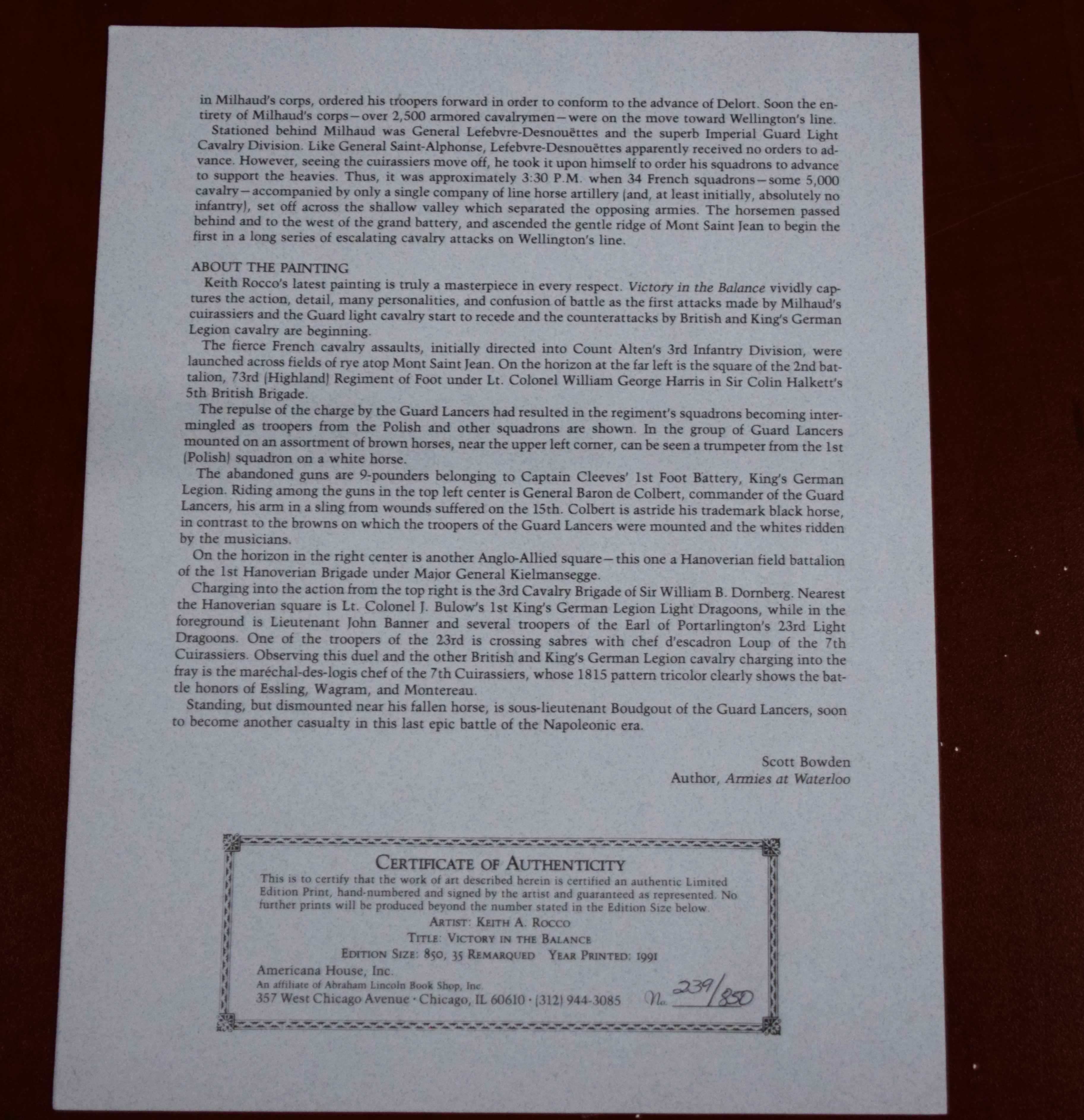 Three signed lithographs (239 of 850) of the Waterloo battlefield-1990 print of Waterloo from Felix Philippteaux, (22″ x 32″), Signed and numbered “The Final Gamble”, ” The Iron Duke” and “Victory In The Balance” (24″ x 20″) along with a Napoleon print by E. Grofts (26″ x 19″) and other prints.