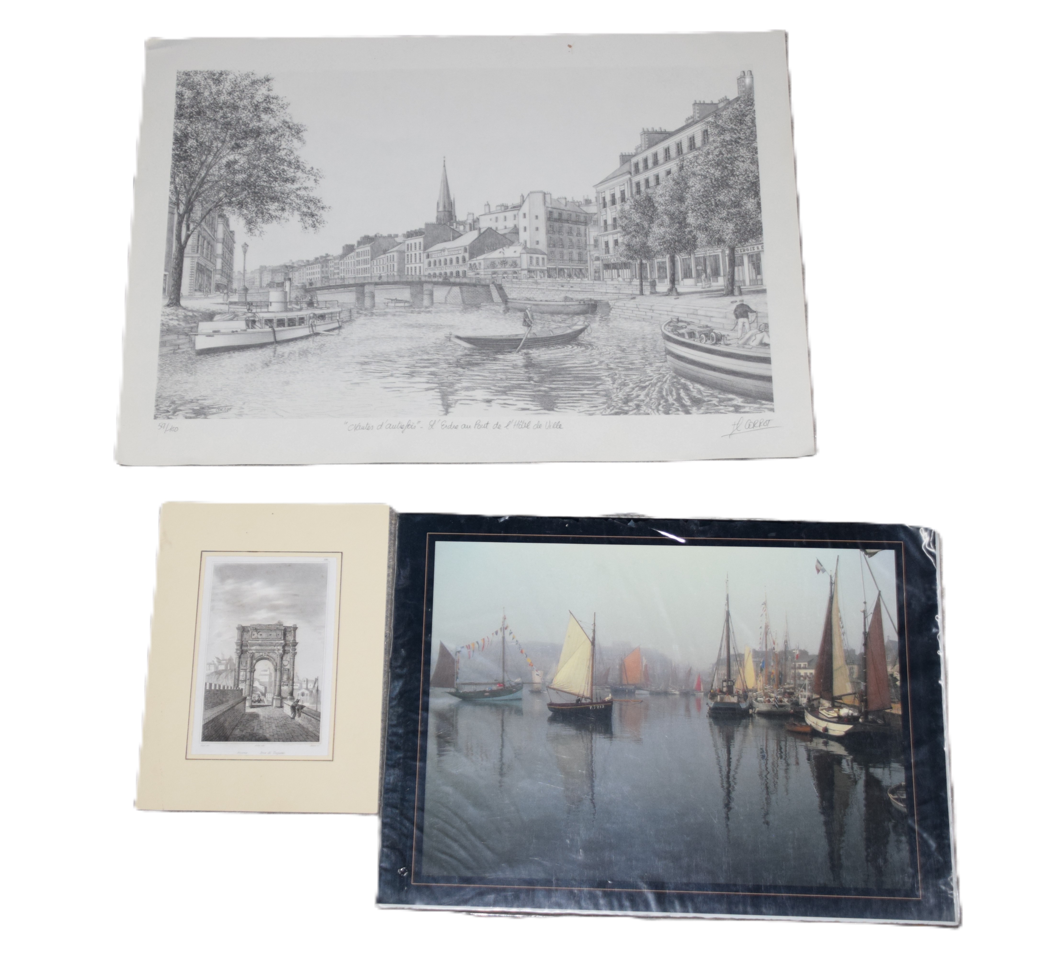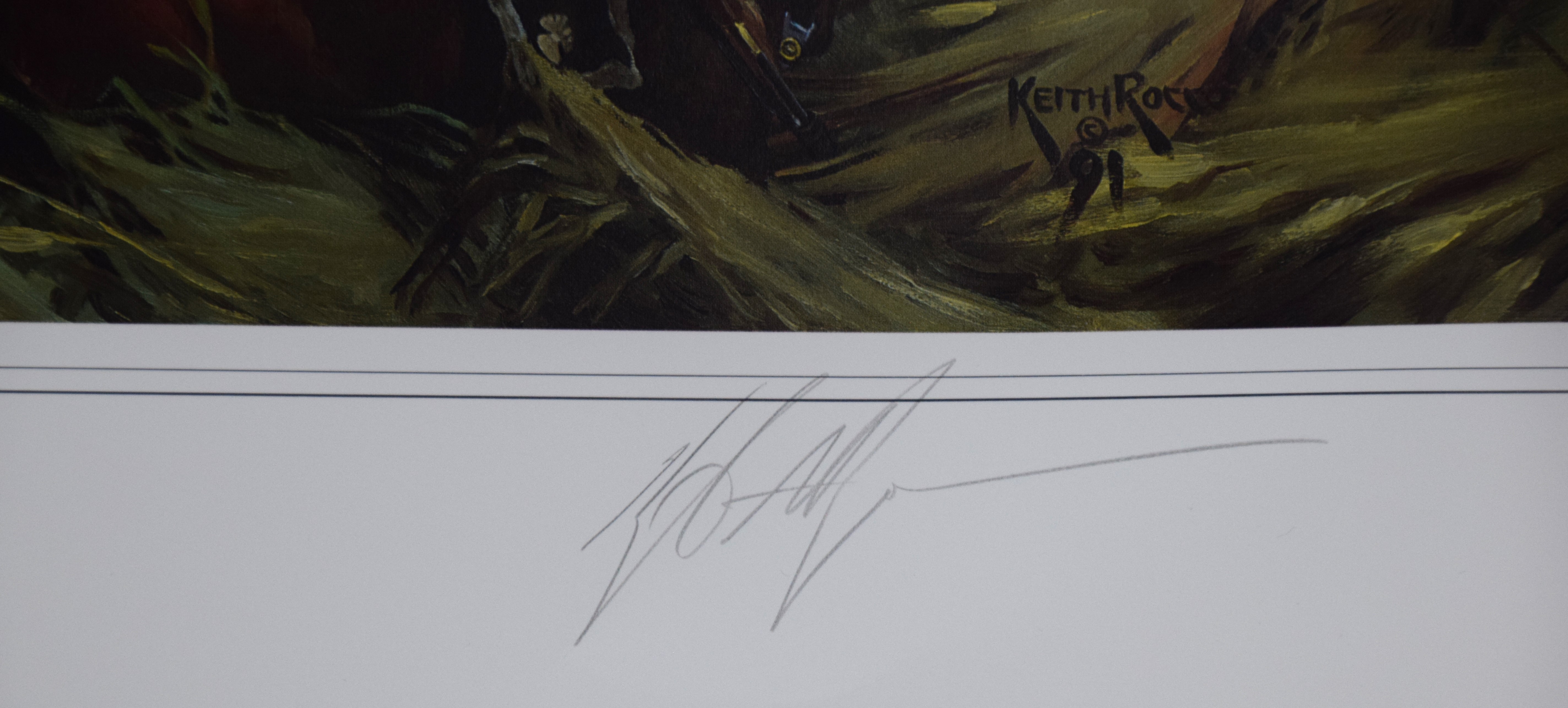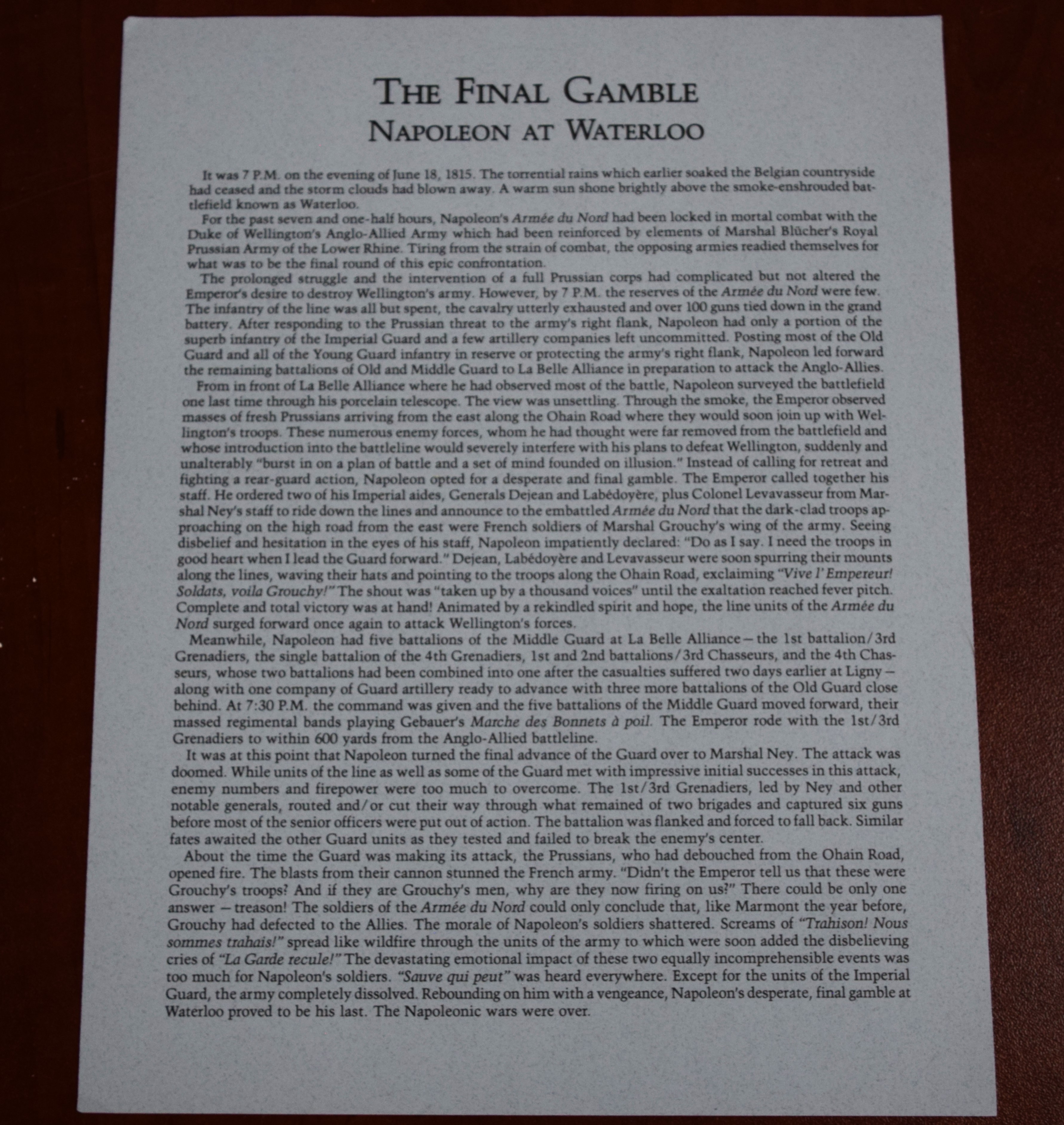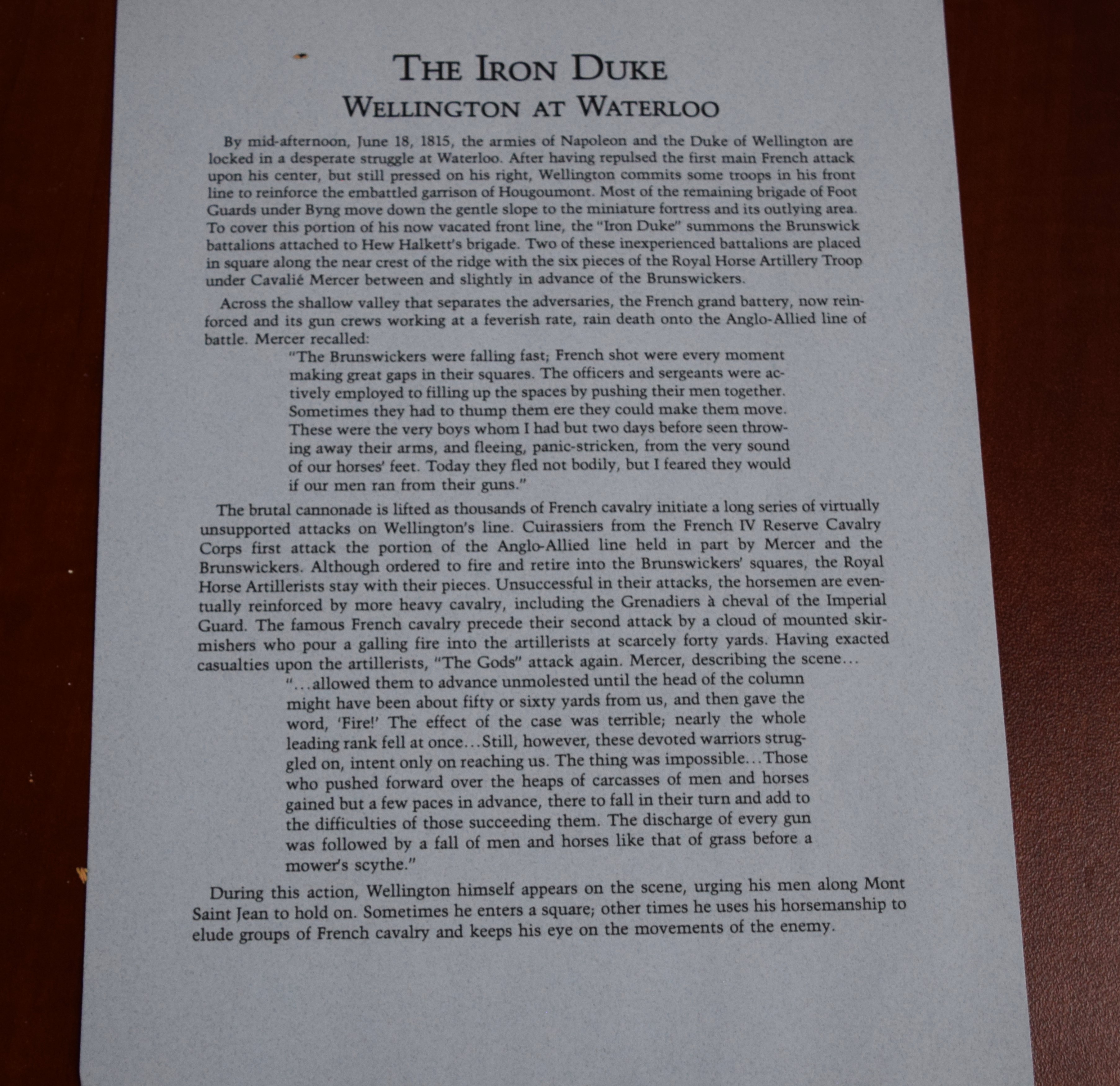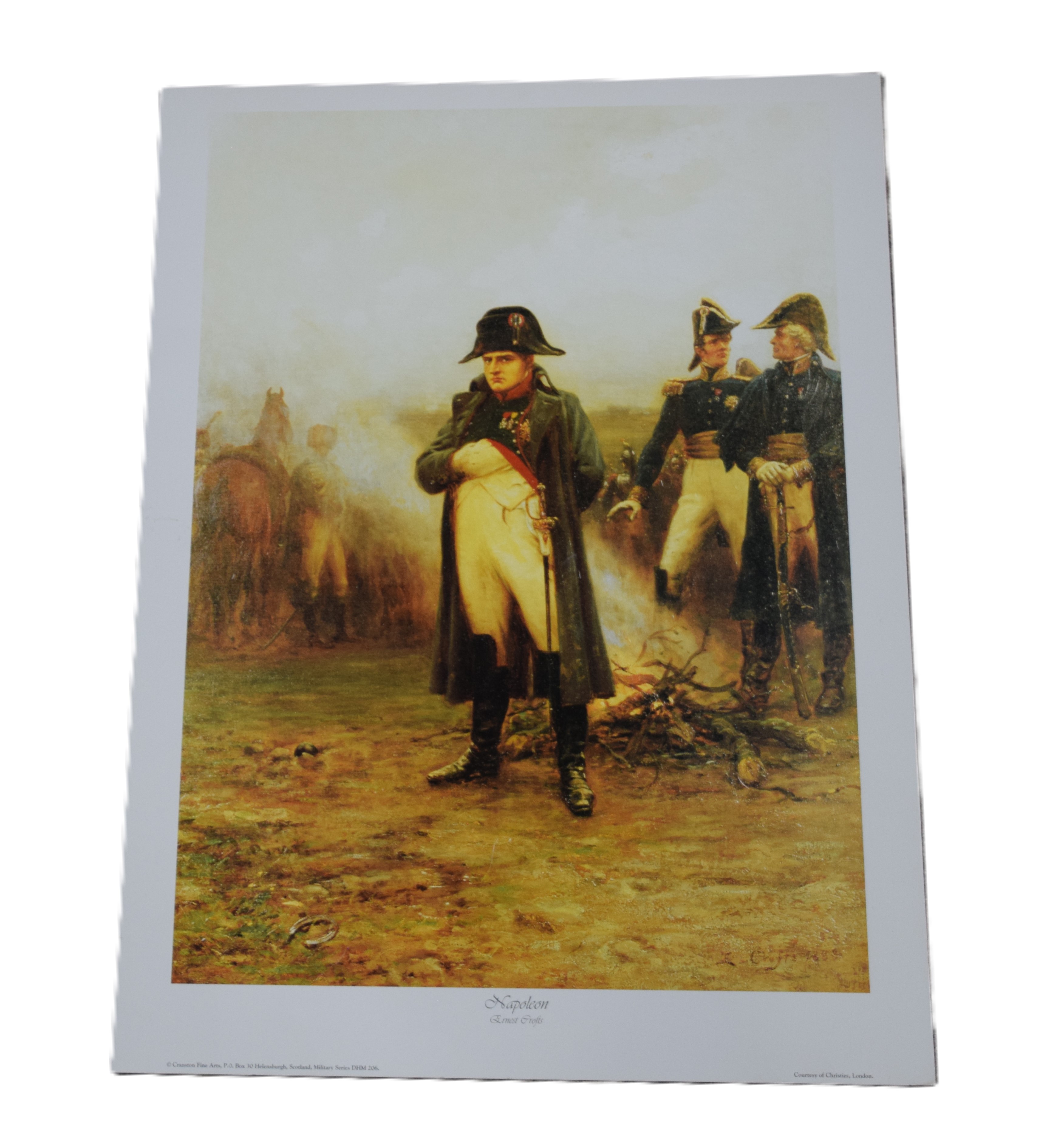 Three signed lithographs (239 of 850) of the Waterloo battlefield-1990 print of Waterloo from Felix Philippteaux, (22″ x 32″), Signed and numbered “The Final Gamble”, ” The Iron Duke” and “Victory In The Balance” (24″ x 20″) along with a Napoleon print by E. Grofts (26″ x 19″) and other prints.