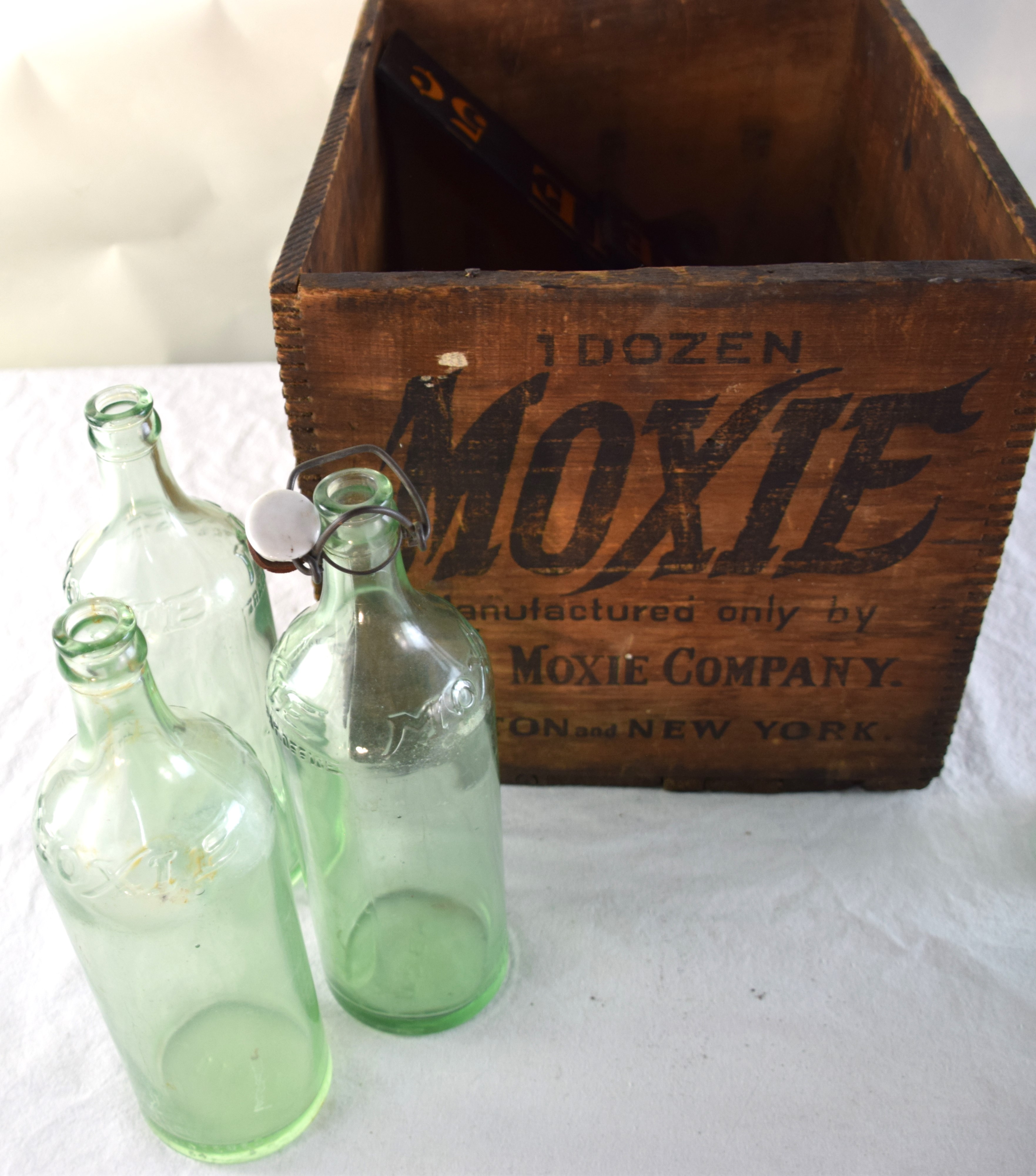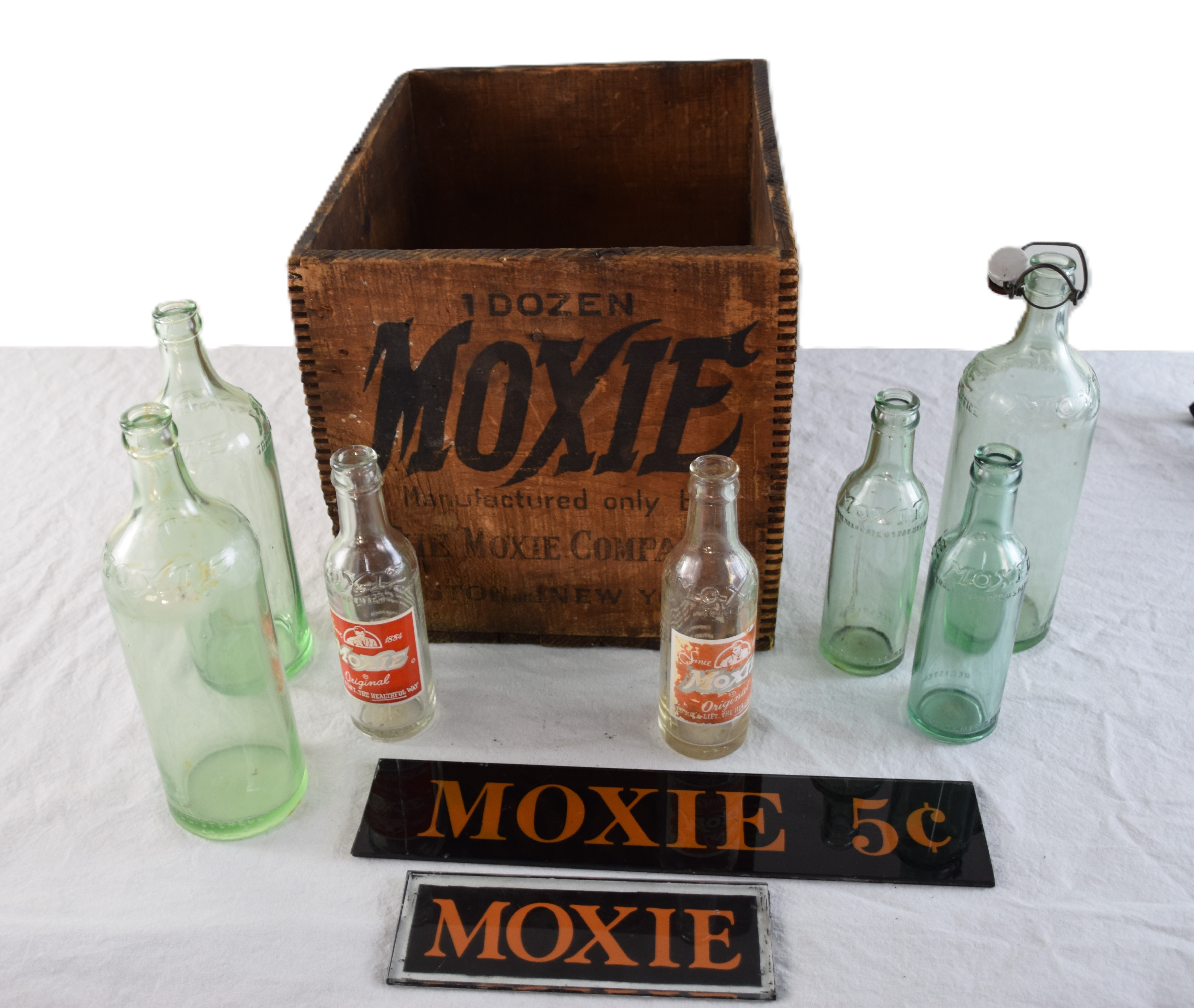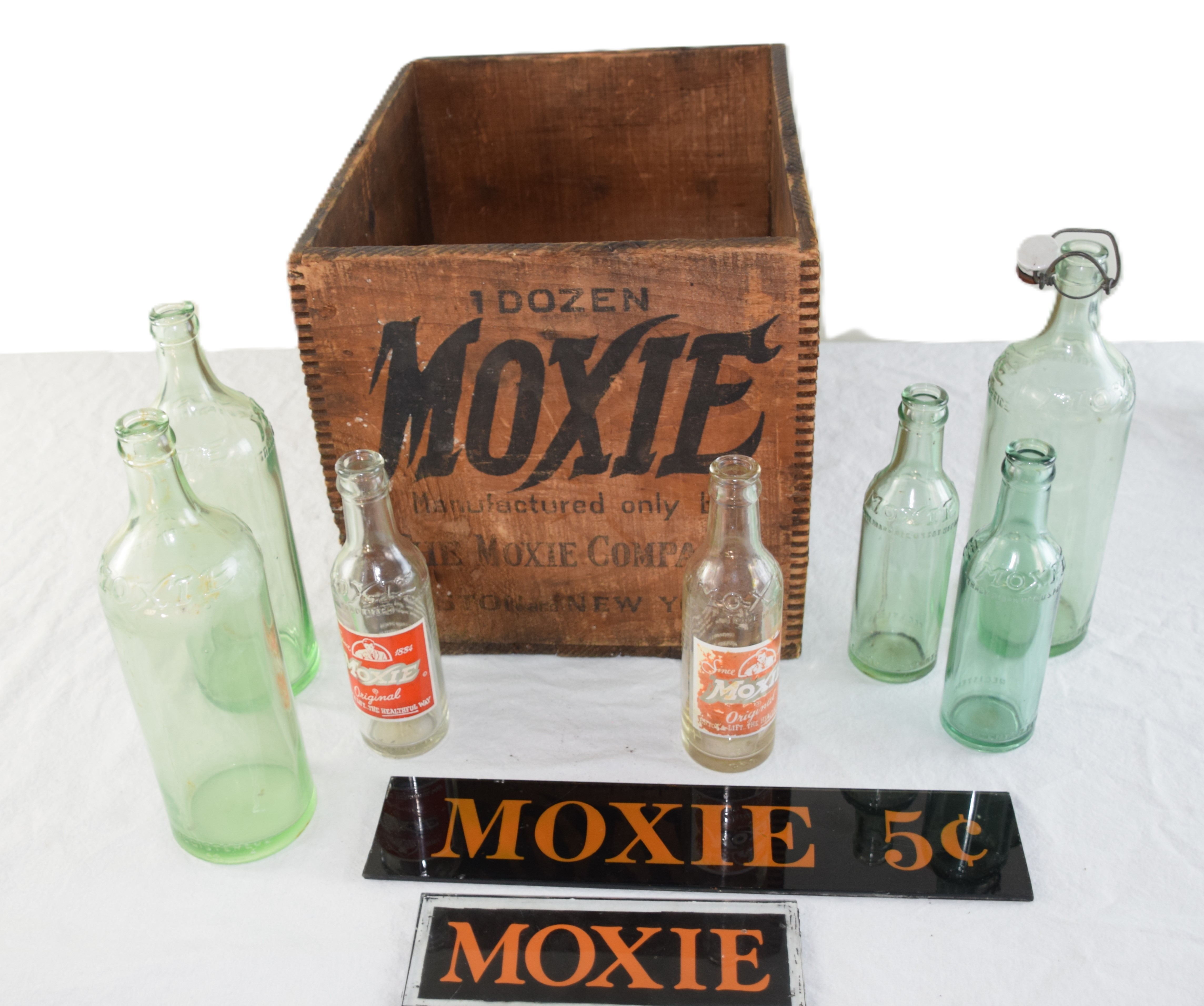 Moxie collection to include an advertising box, seven bottles and two glass signs.