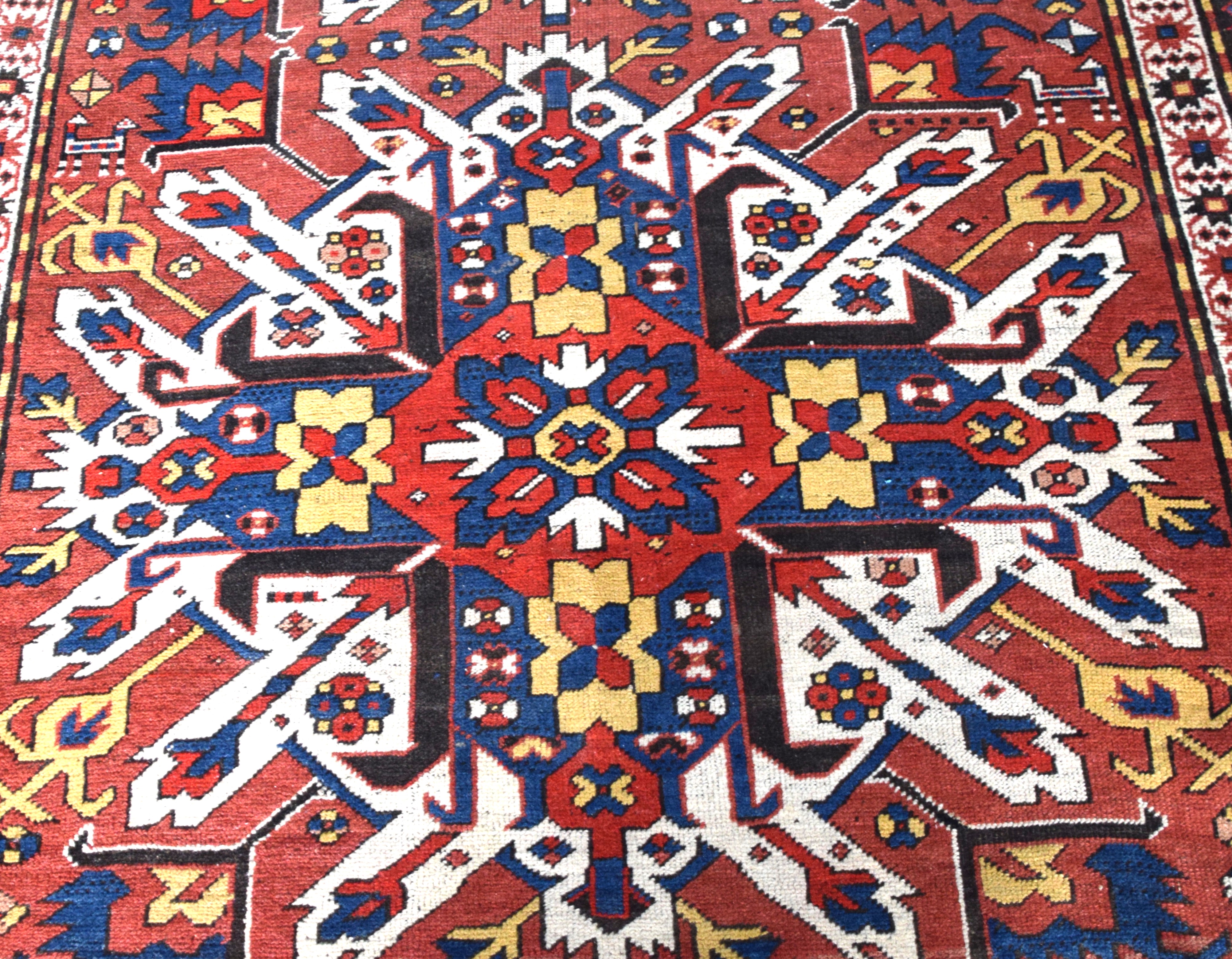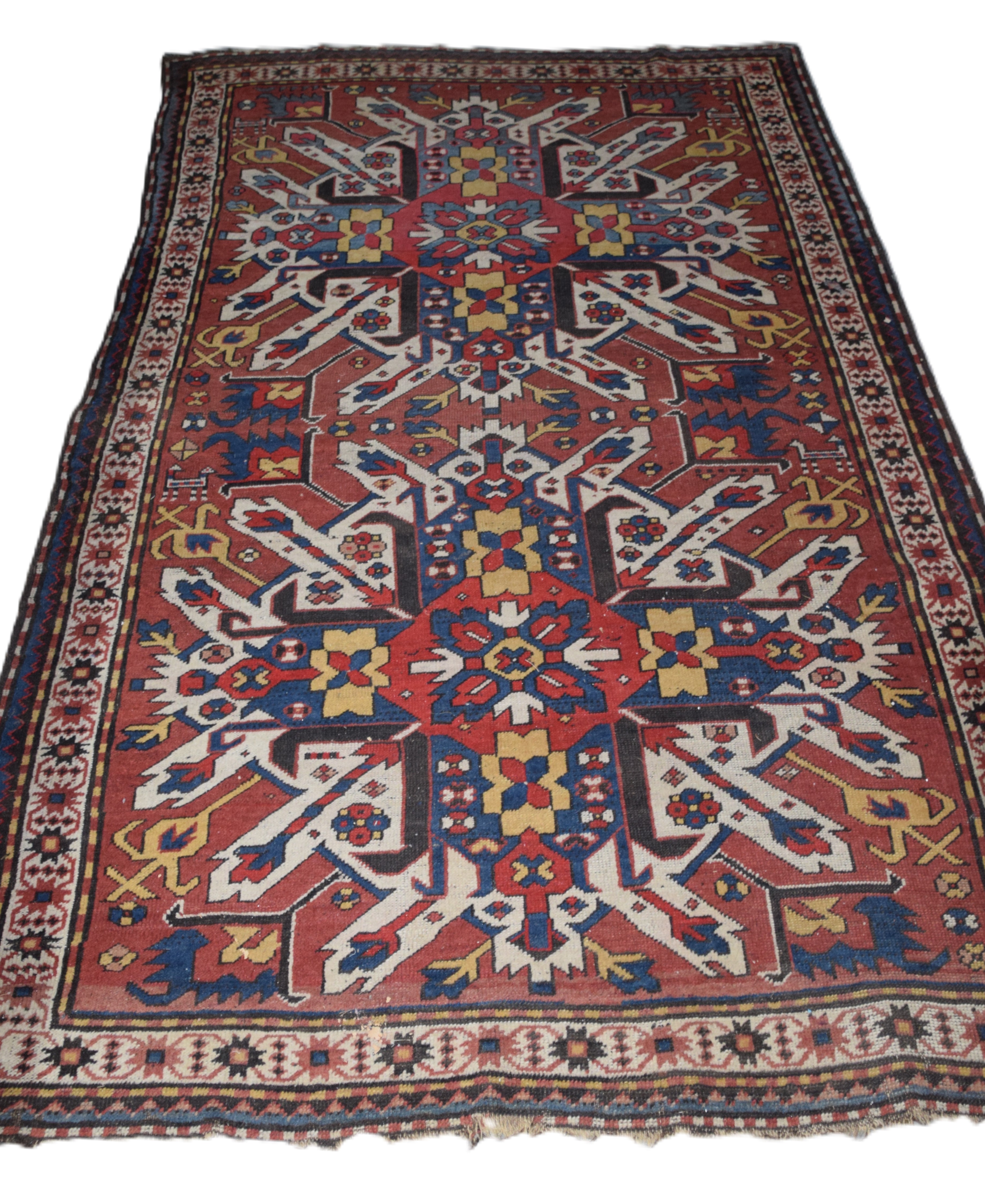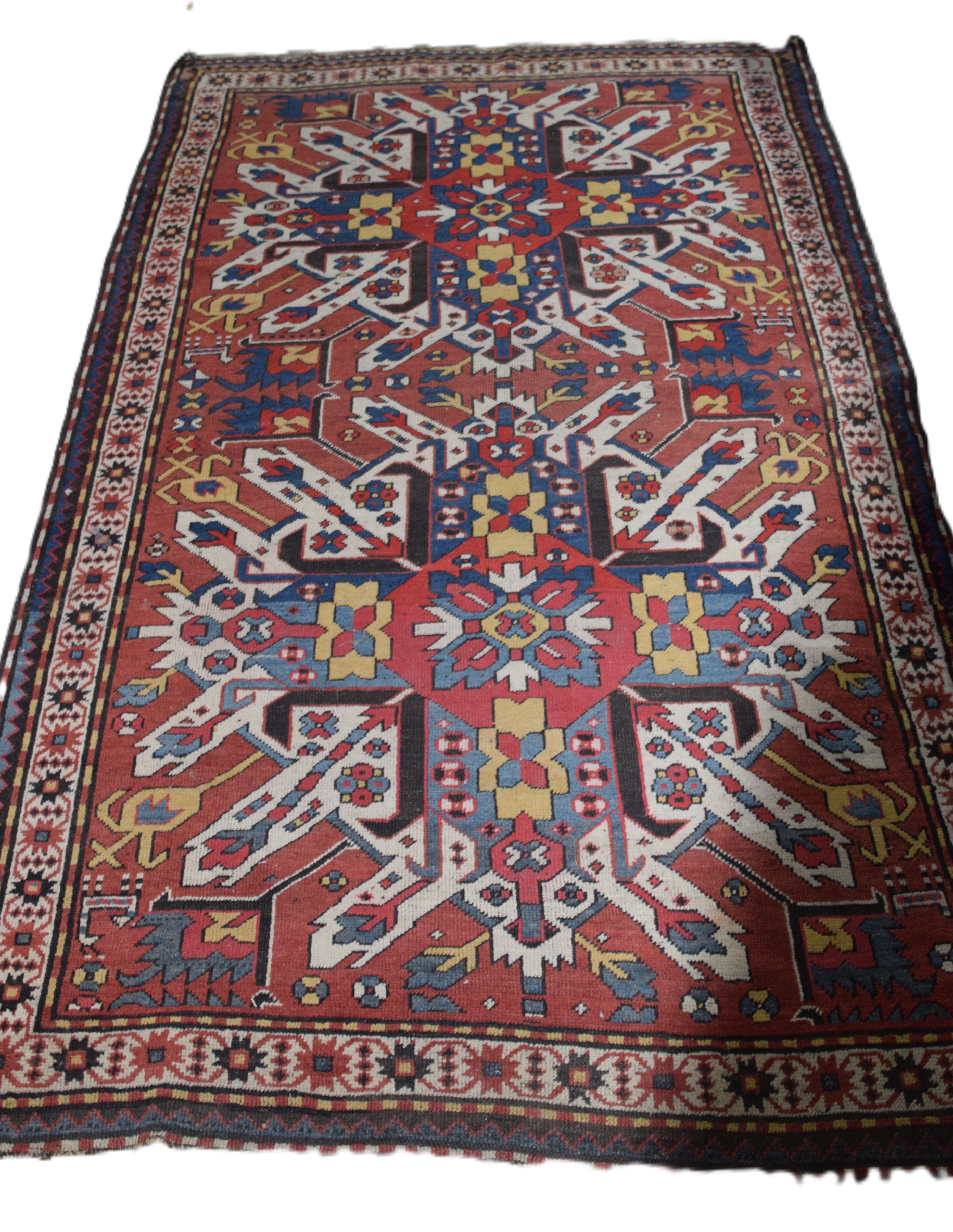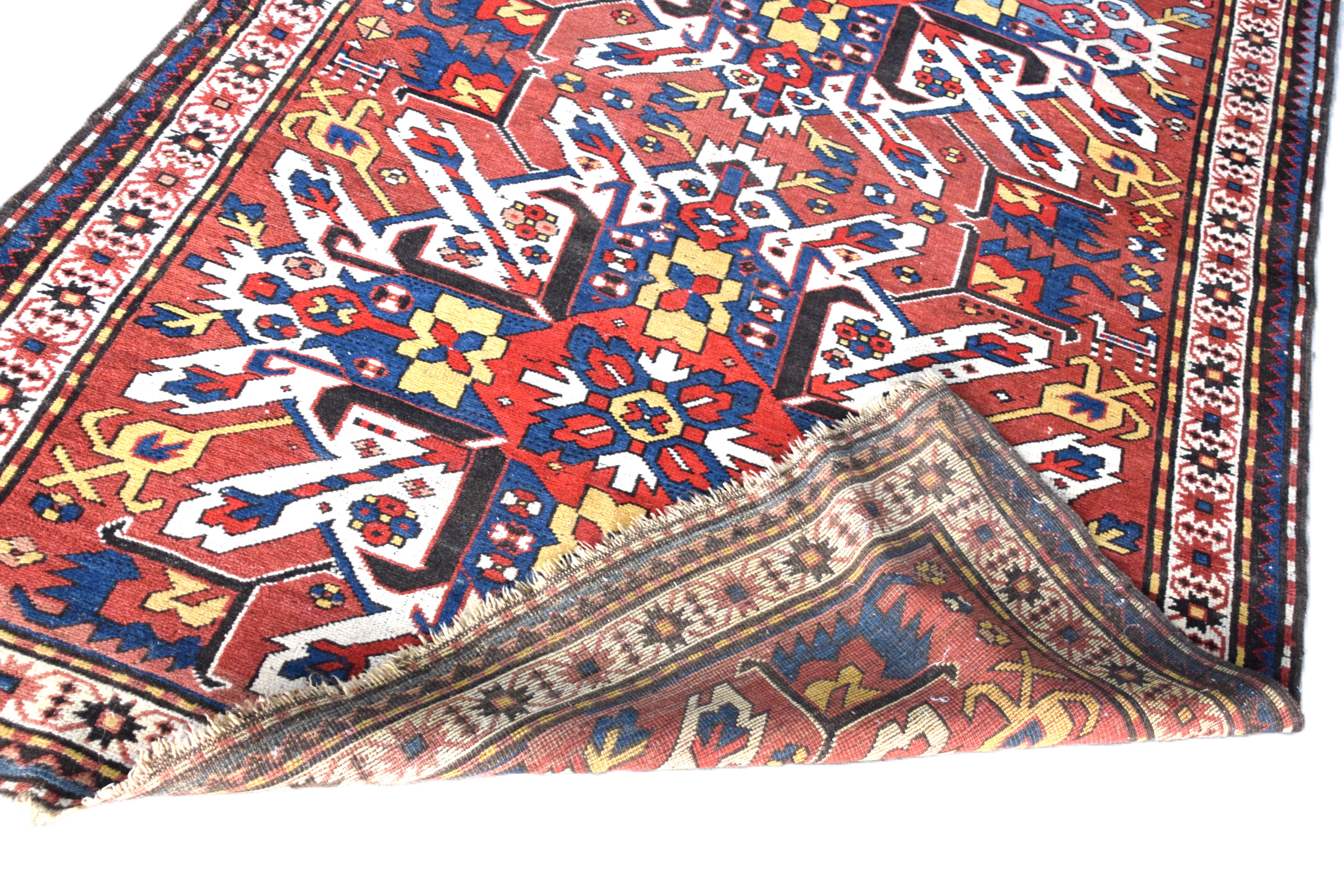 Fine Kazak oriental scatter rug with all over design with red, blue and ivory field, hand-knotted. From a Weare NH estate. Dimensions: 4’6″ x 7′ 7″