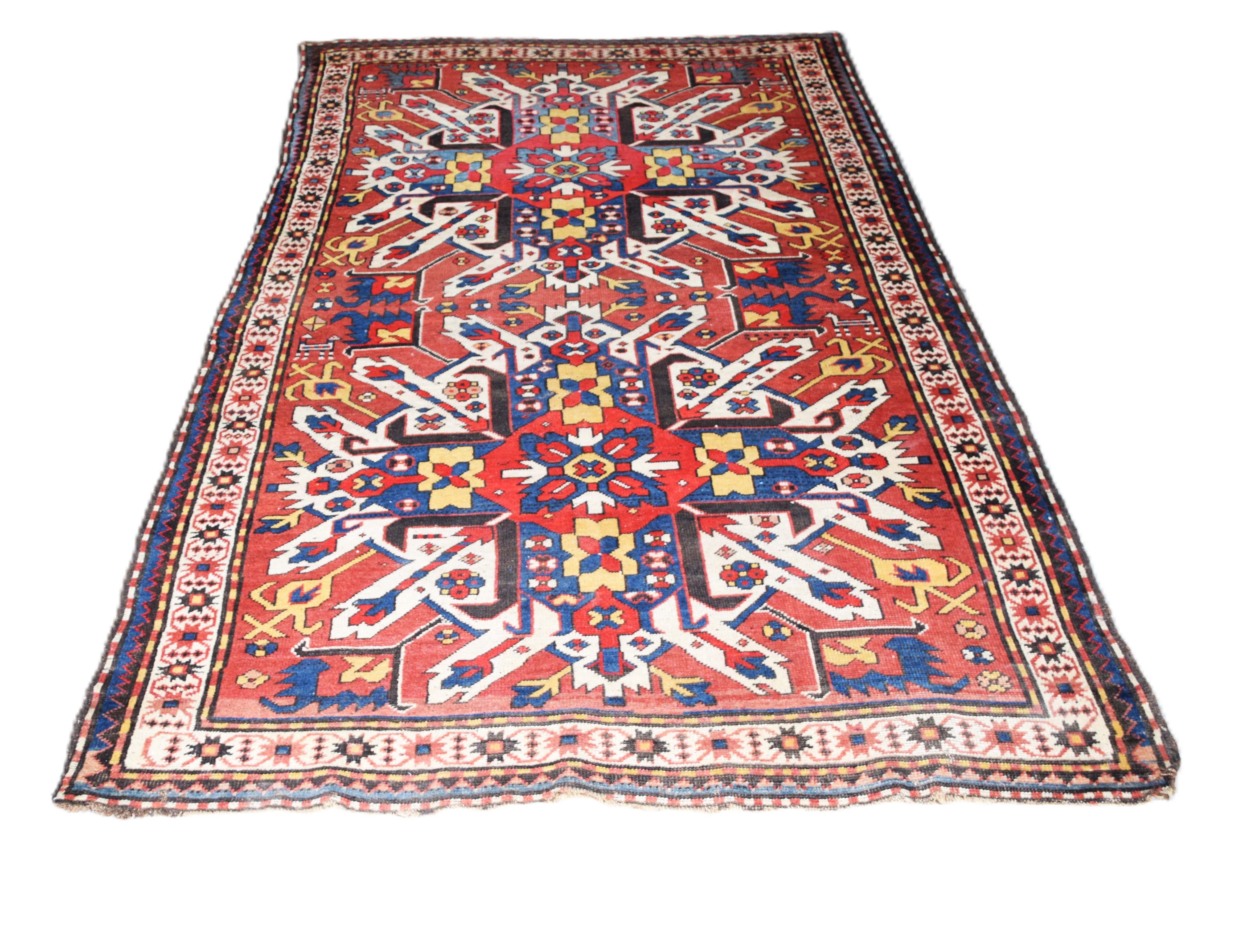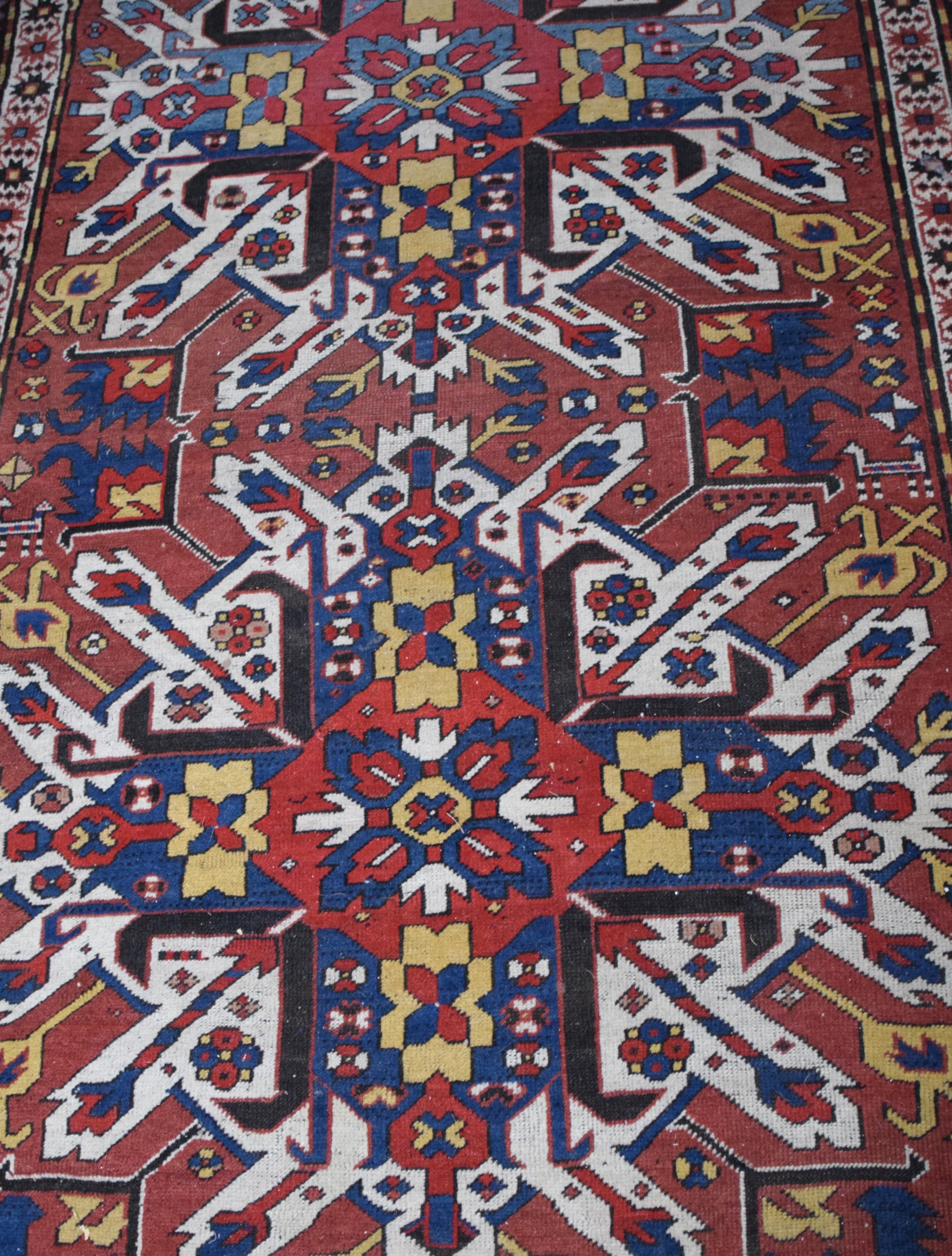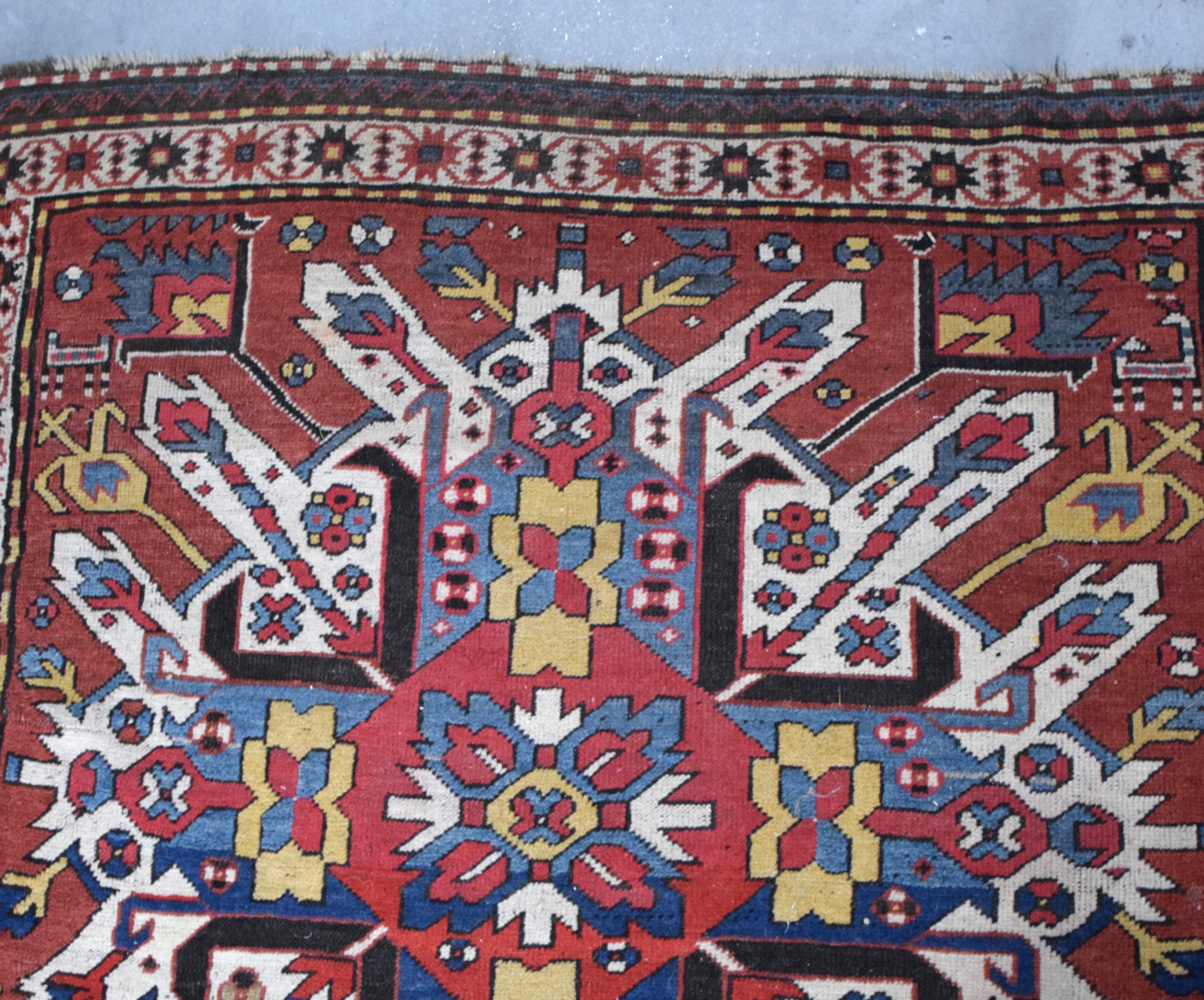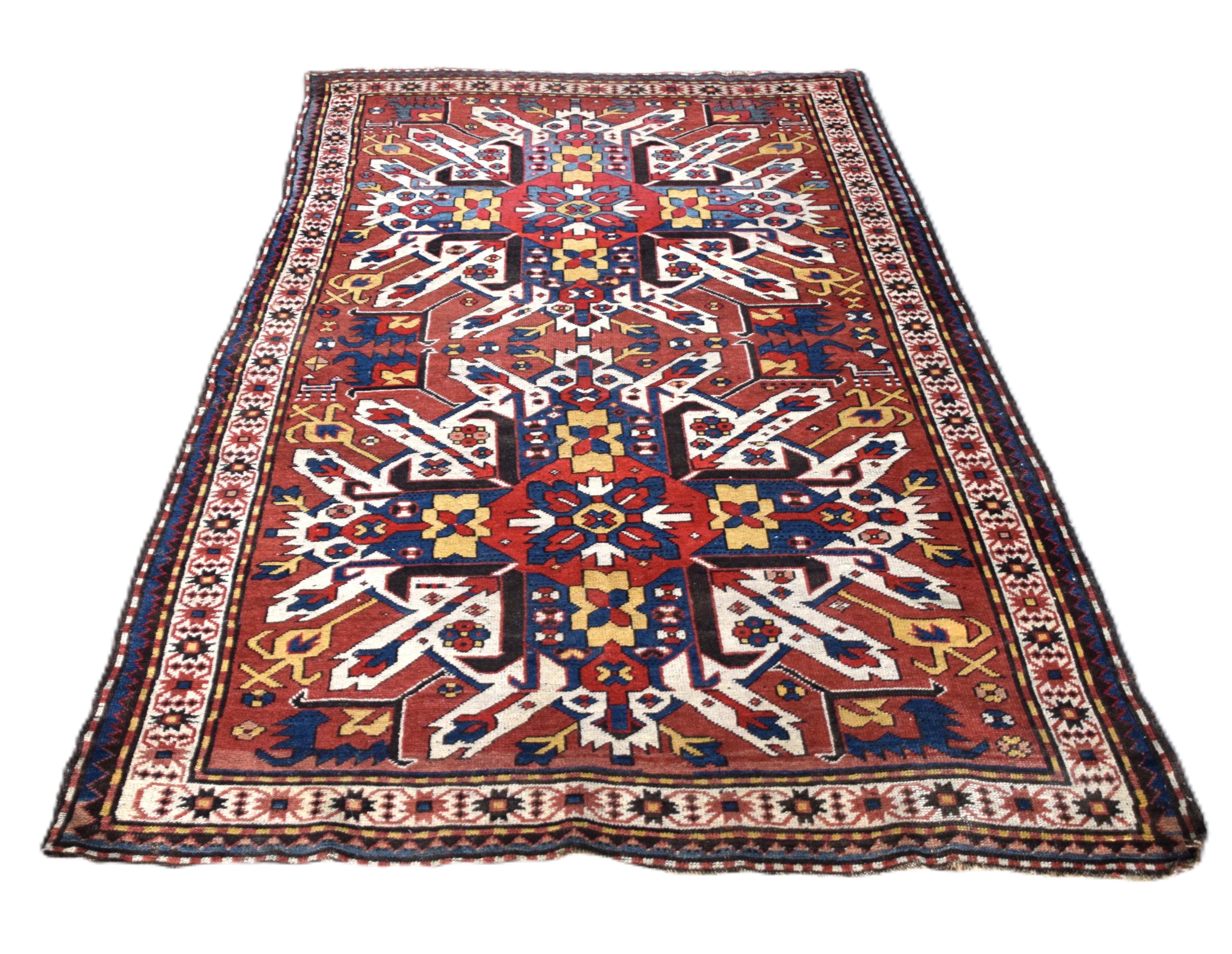 Fine Kazak oriental scatter rug with all over design with red, blue and ivory field, hand-knotted. From a Weare NH estate. Dimensions: 4’6″ x 7′ 7″