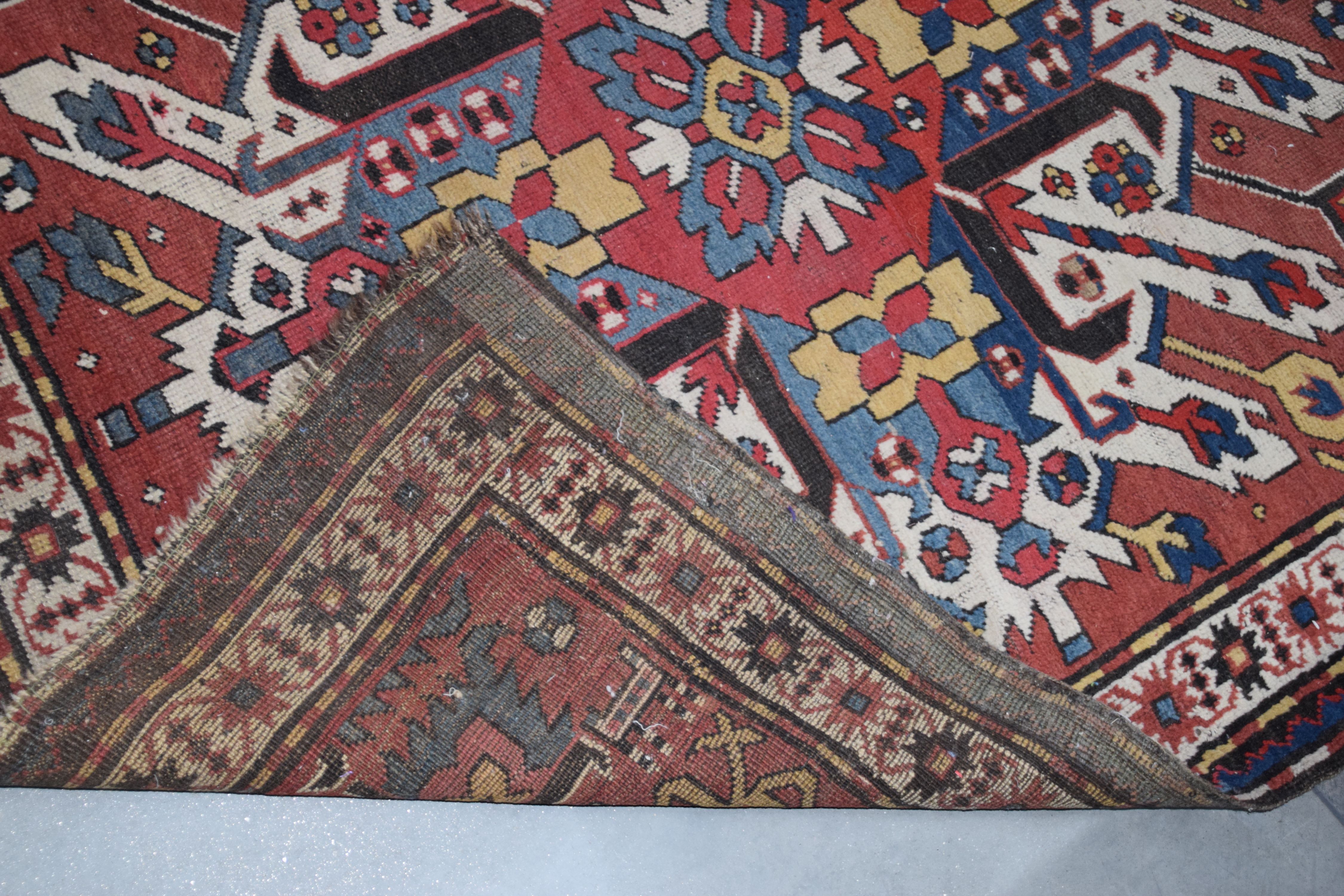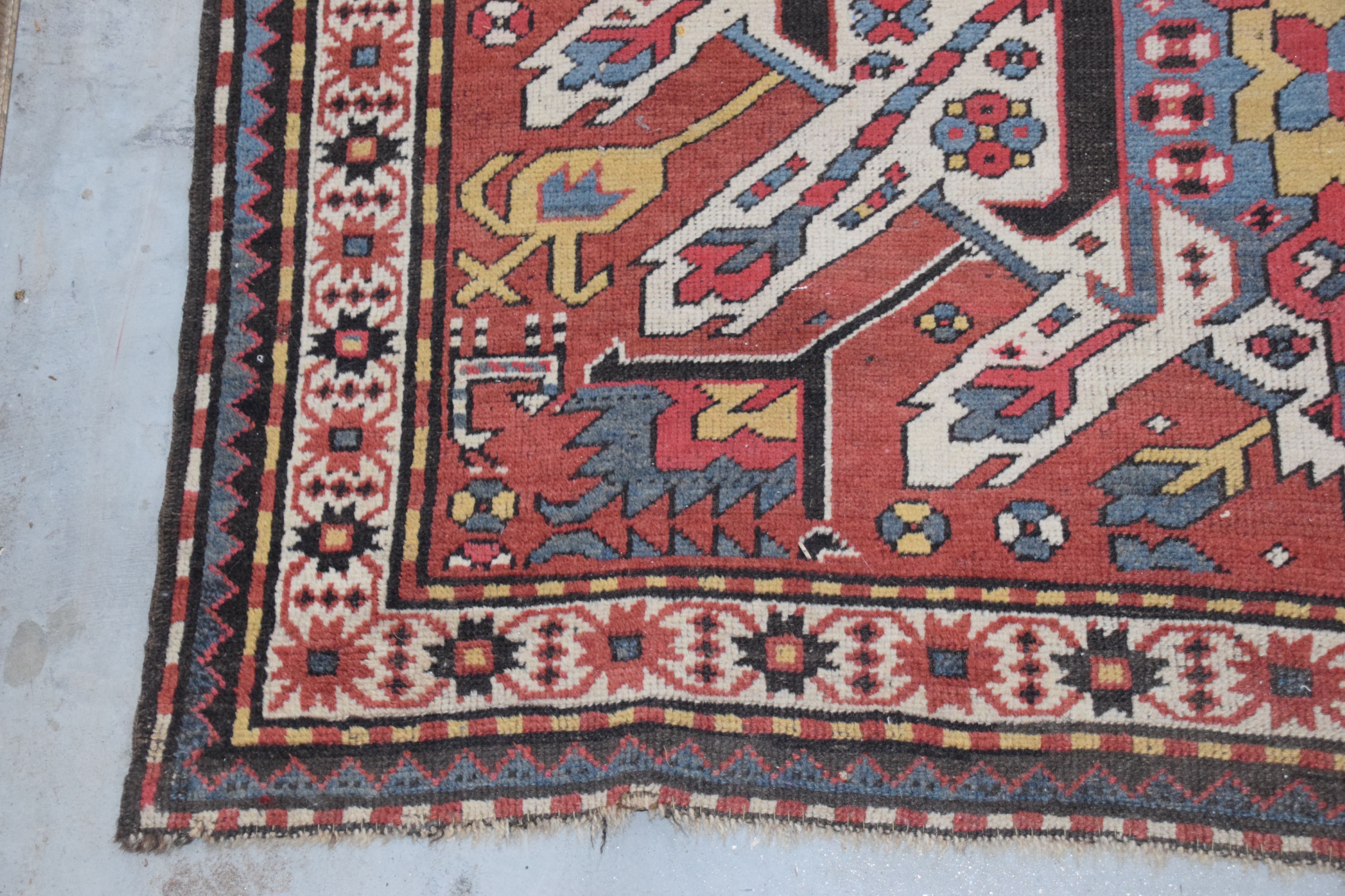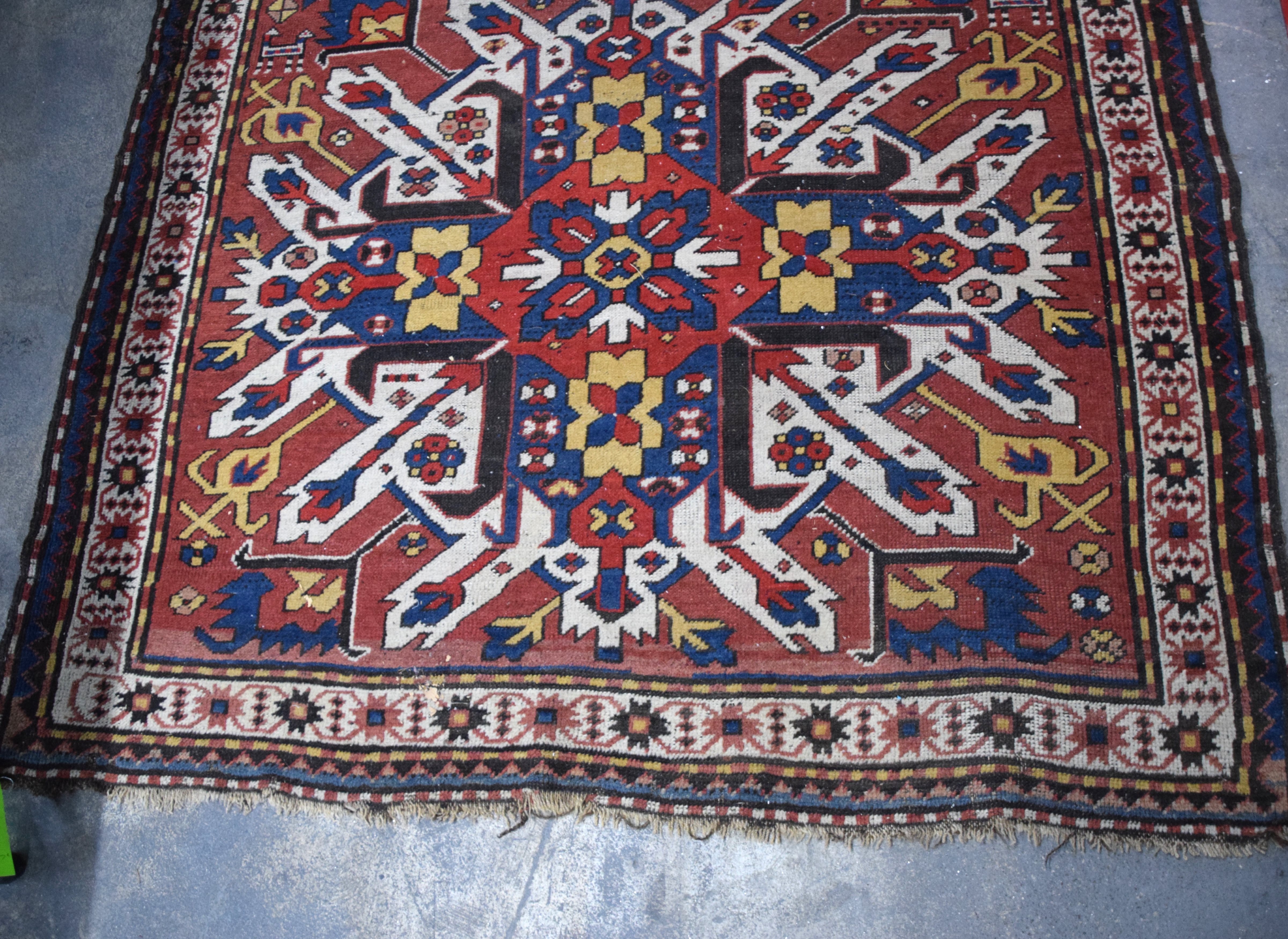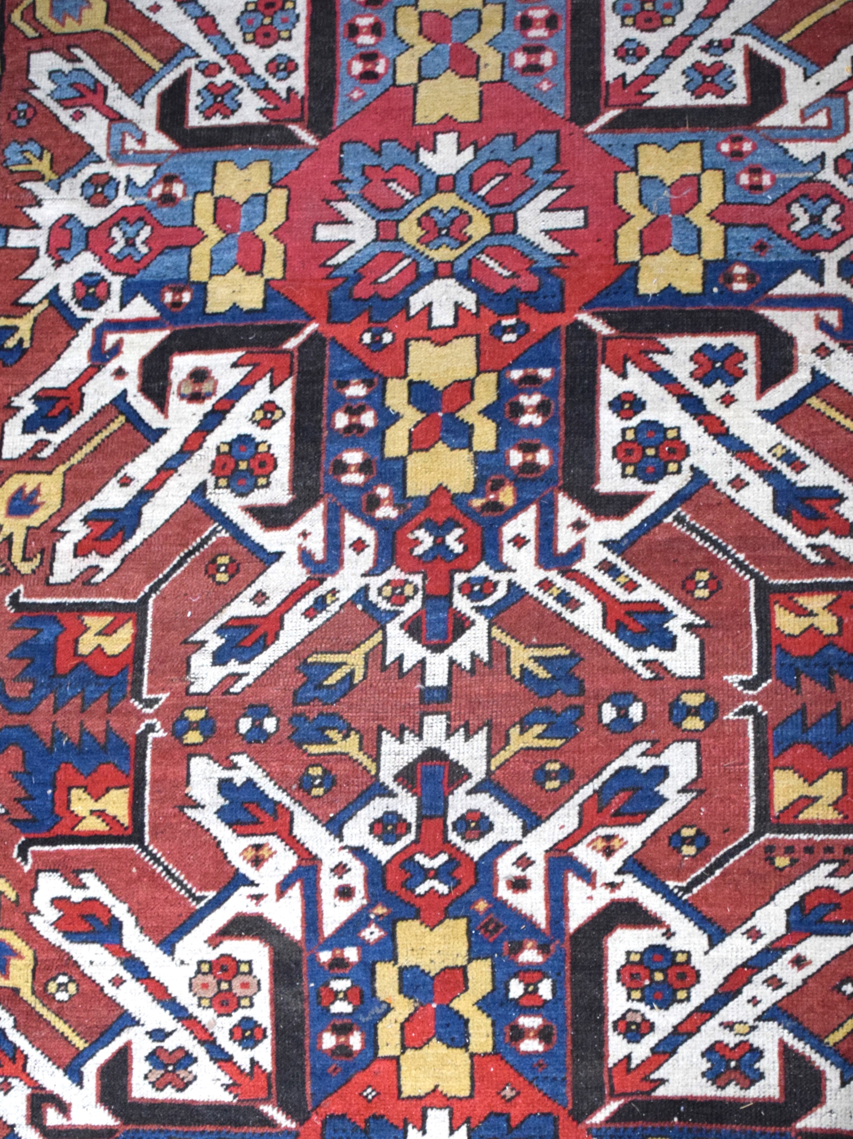Fine Kazak oriental scatter rug with all over design with red, blue and ivory field, hand-knotted. From a Weare NH estate. Dimensions: 4’6″ x 7′ 7″