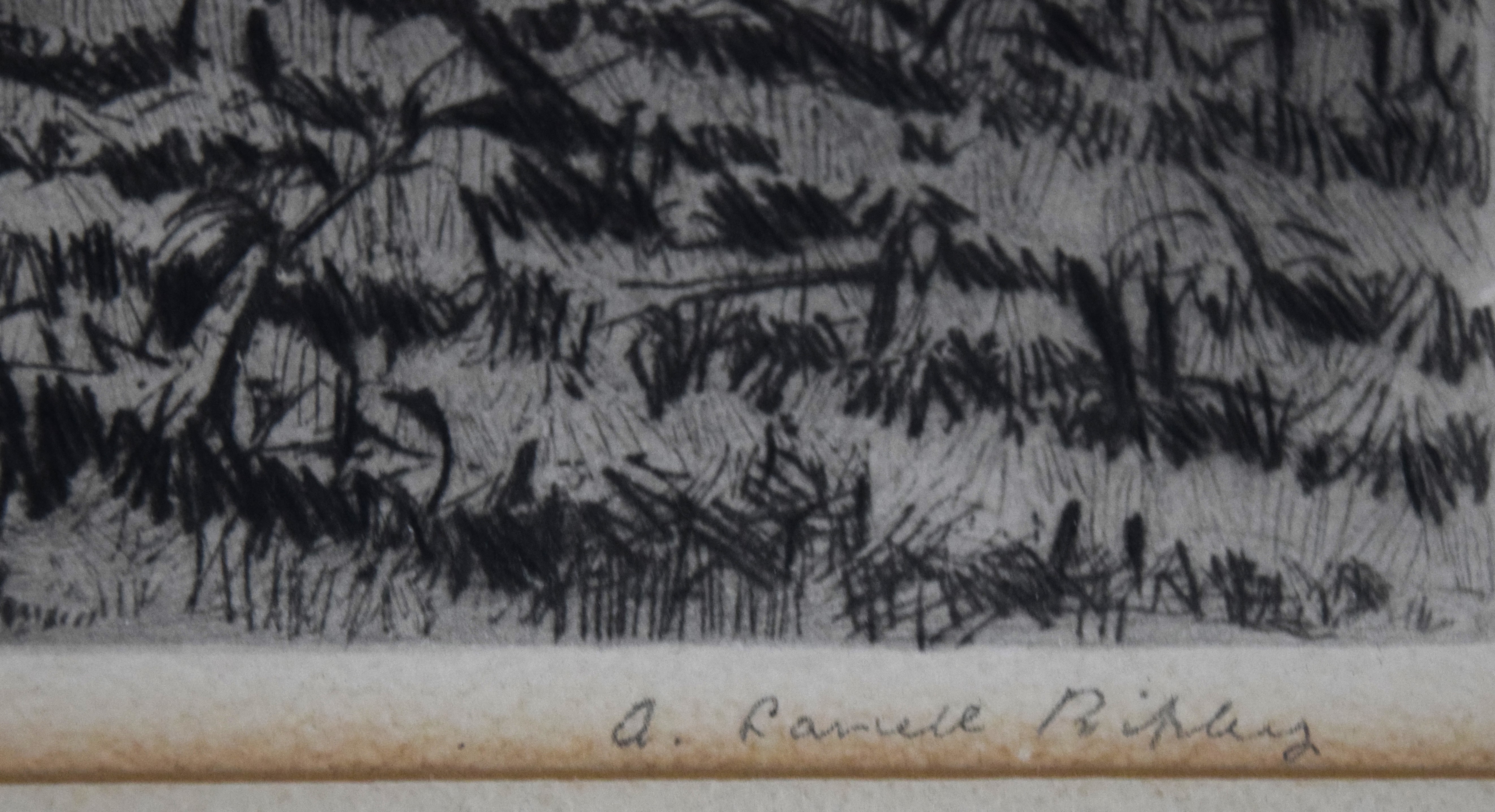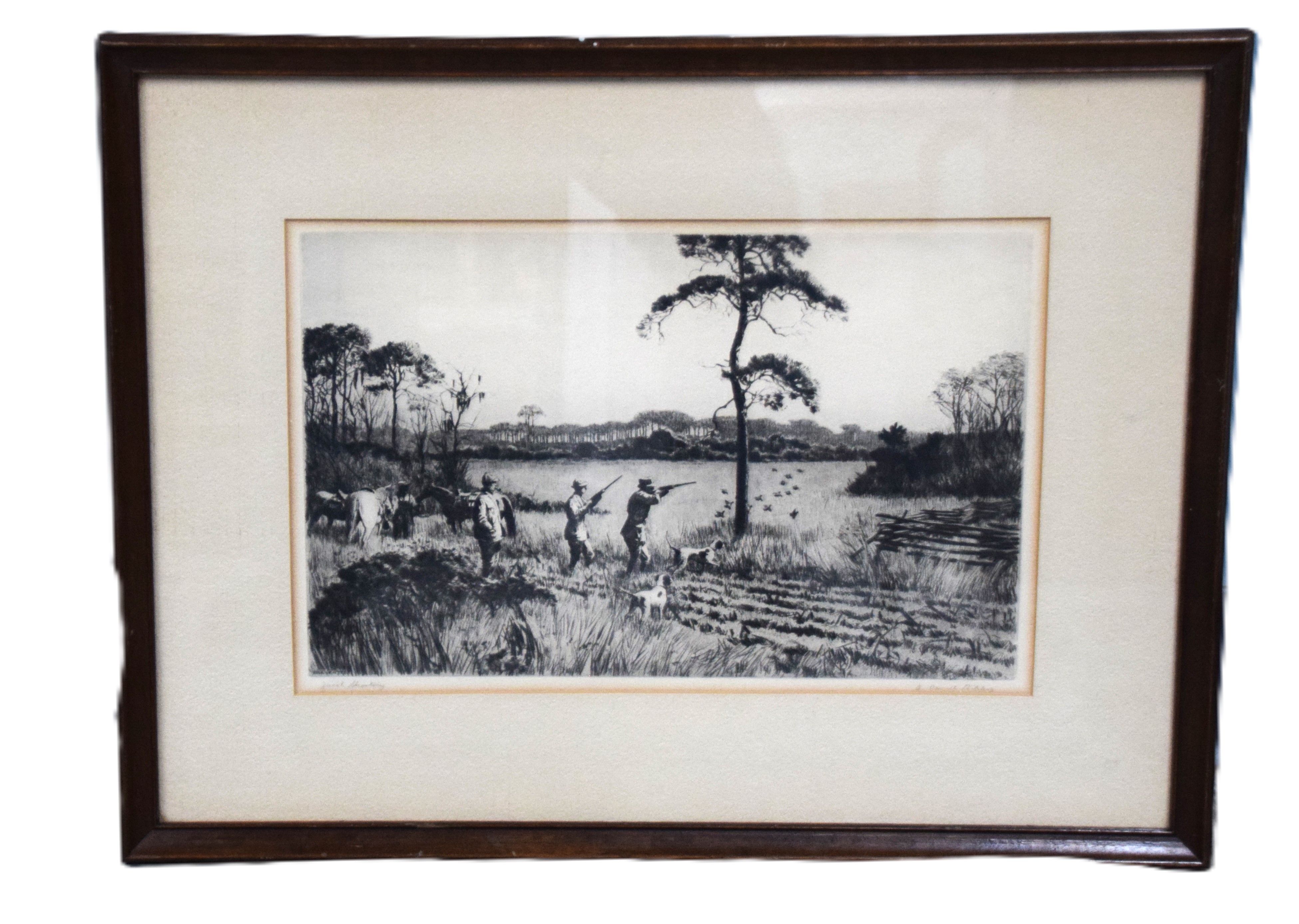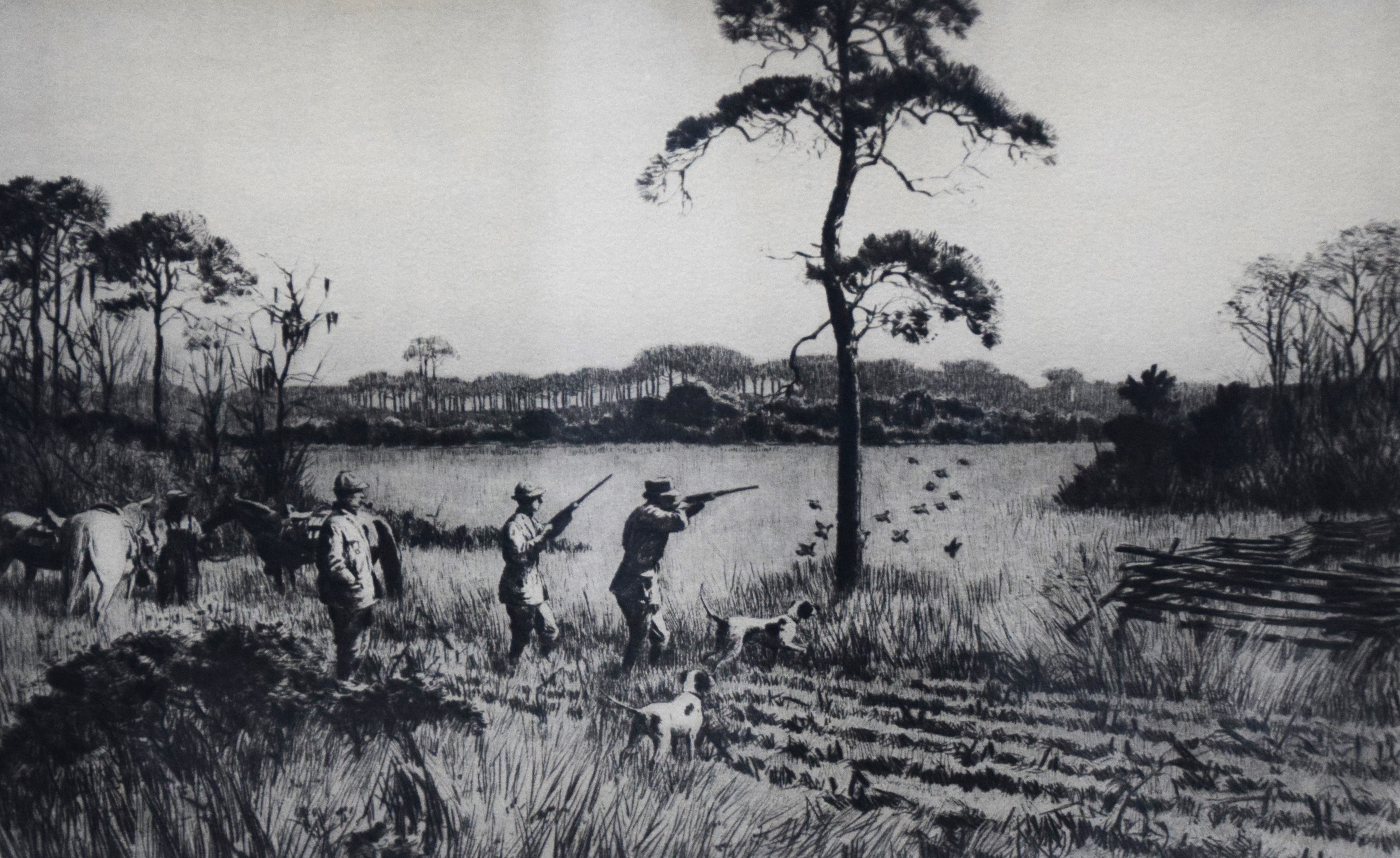 A pencil signed etching of a hunters shooting quail. Aiden Lassell Ripley (1896 – 1969) worked in Massachusetts and is known for wildlife, genre, landscape painting and etching. Dimensions: 8.5″ x 13.5″ Image size