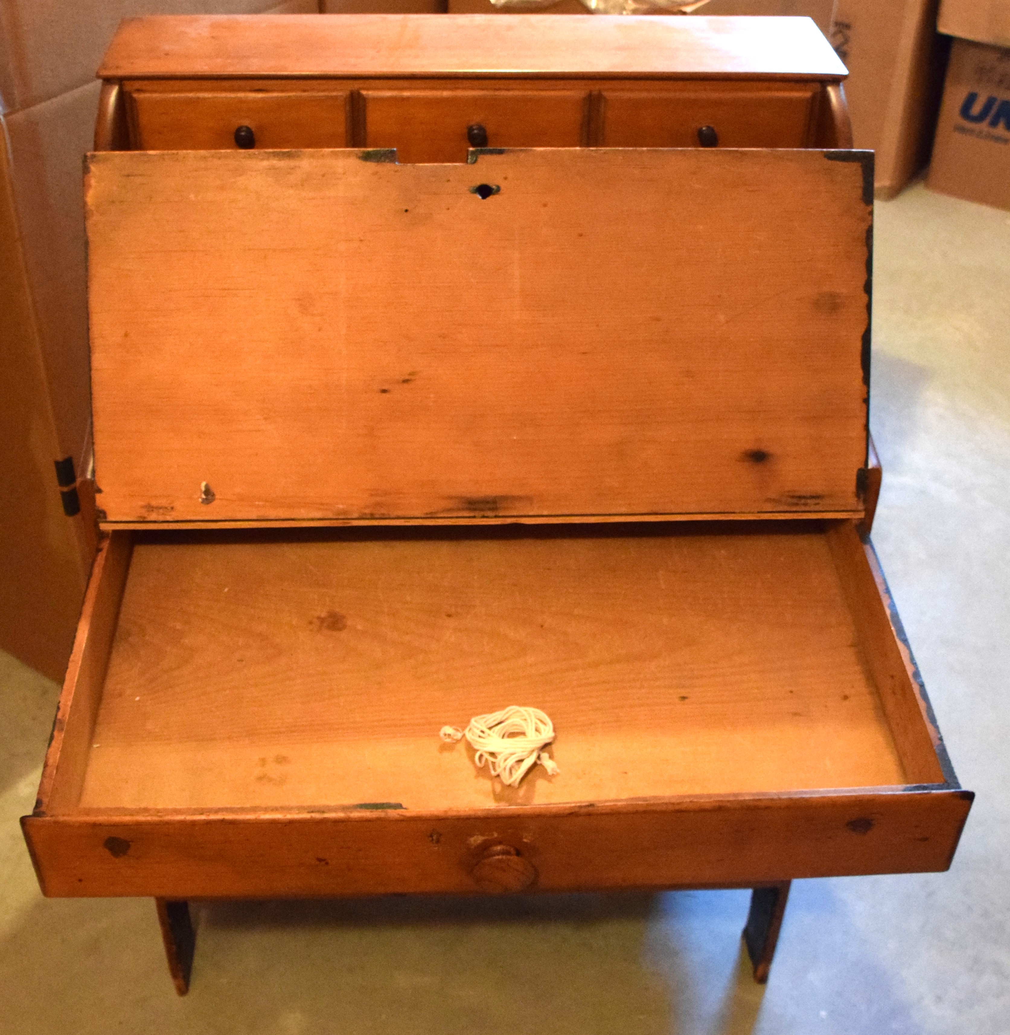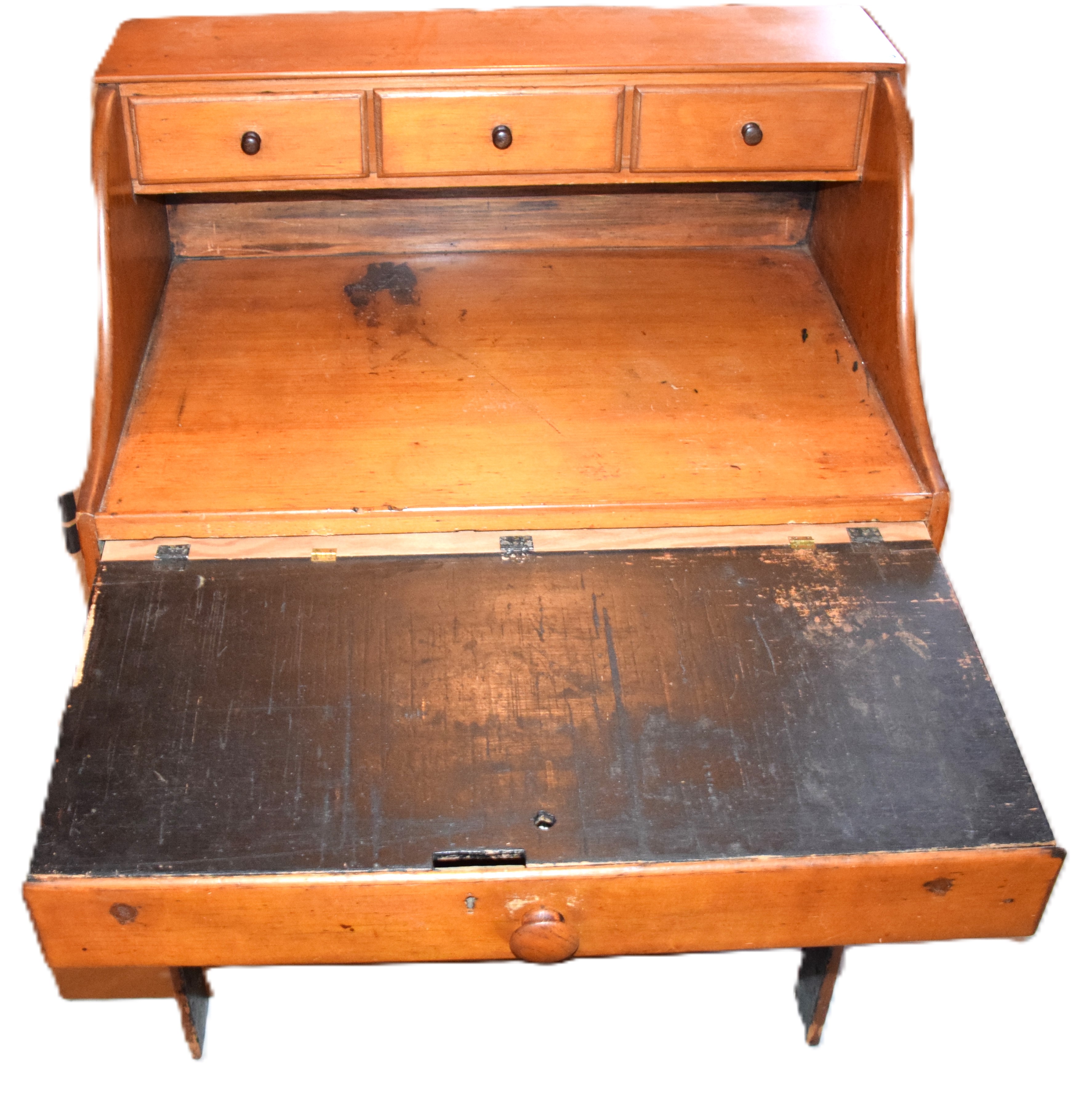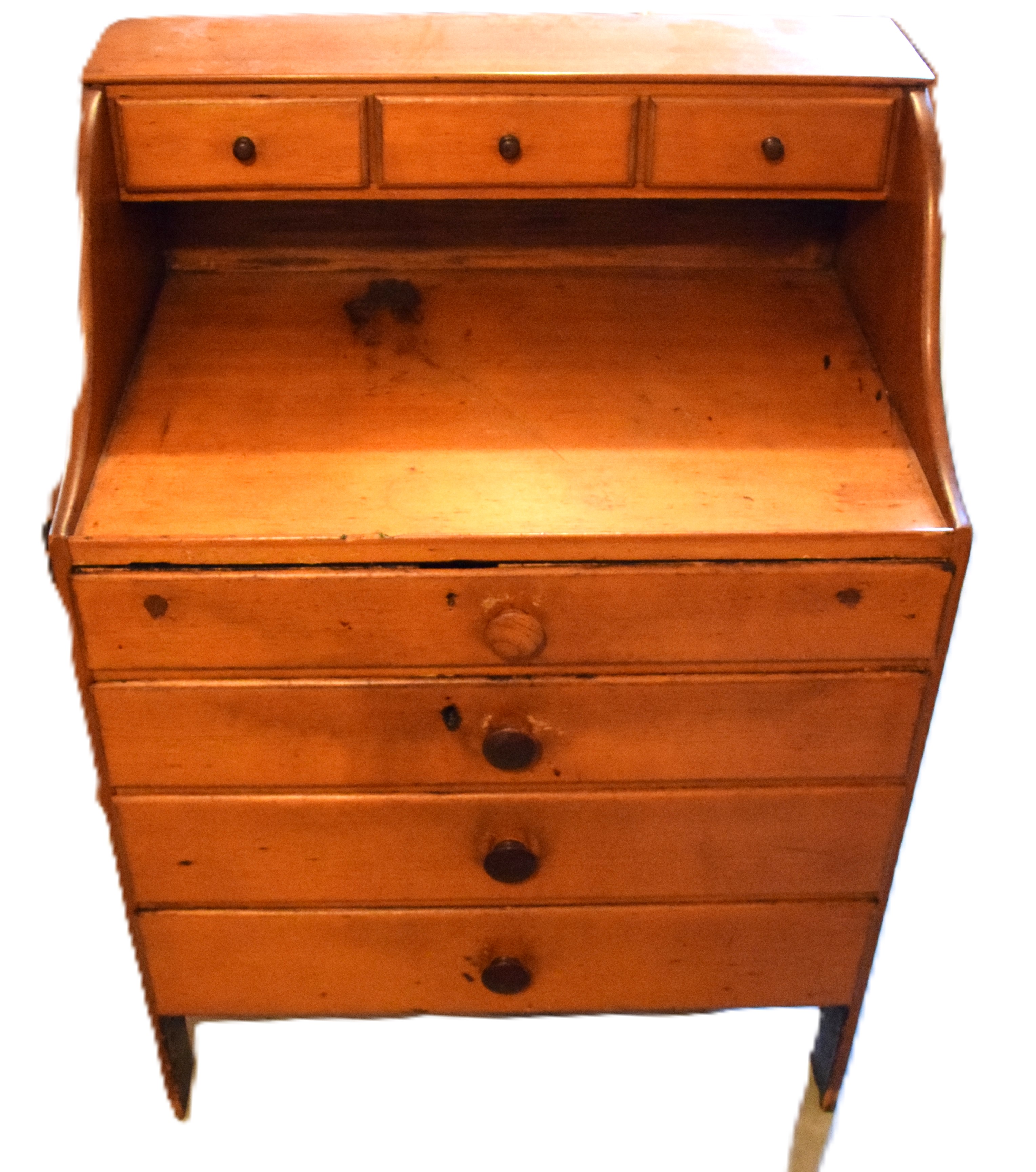 Early pine Shaker writing desk in a small size with three dovetailed constructed small drawers, open writing surface, four graduated lower case drawers, top drawer with hinged interior lid. The desk rests on a cut-out base. From a New London NH home. Provenance: The family received it many years ago from the Whitney Homestead on Canaan Street, Canaan NH and most likely from the Enfield NH Shaker Colony. Similar example in the book “Shaker Furniture” by Edward Andrew, plate 32. Dimensions: 38″ H x 27″ W x 18″ D