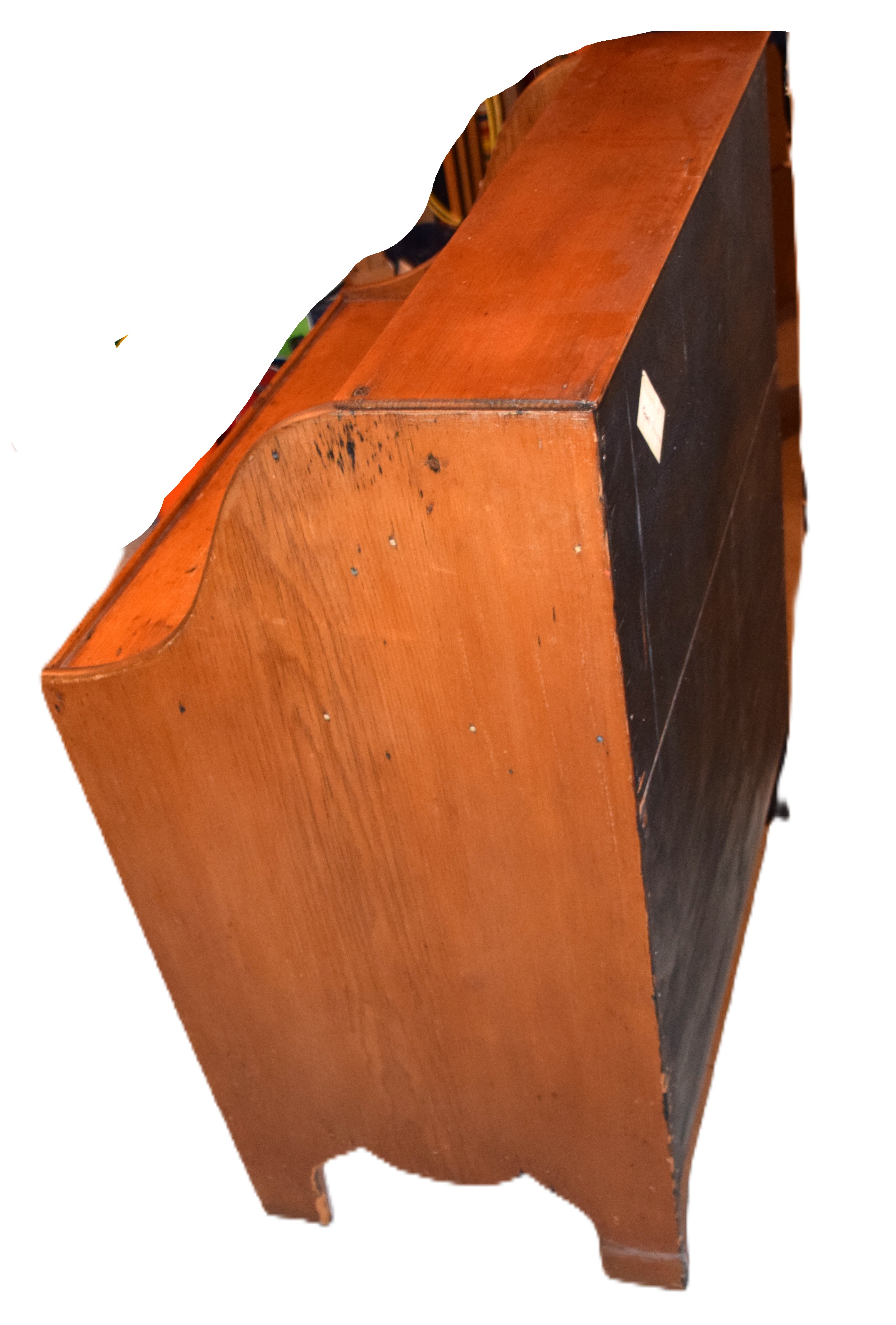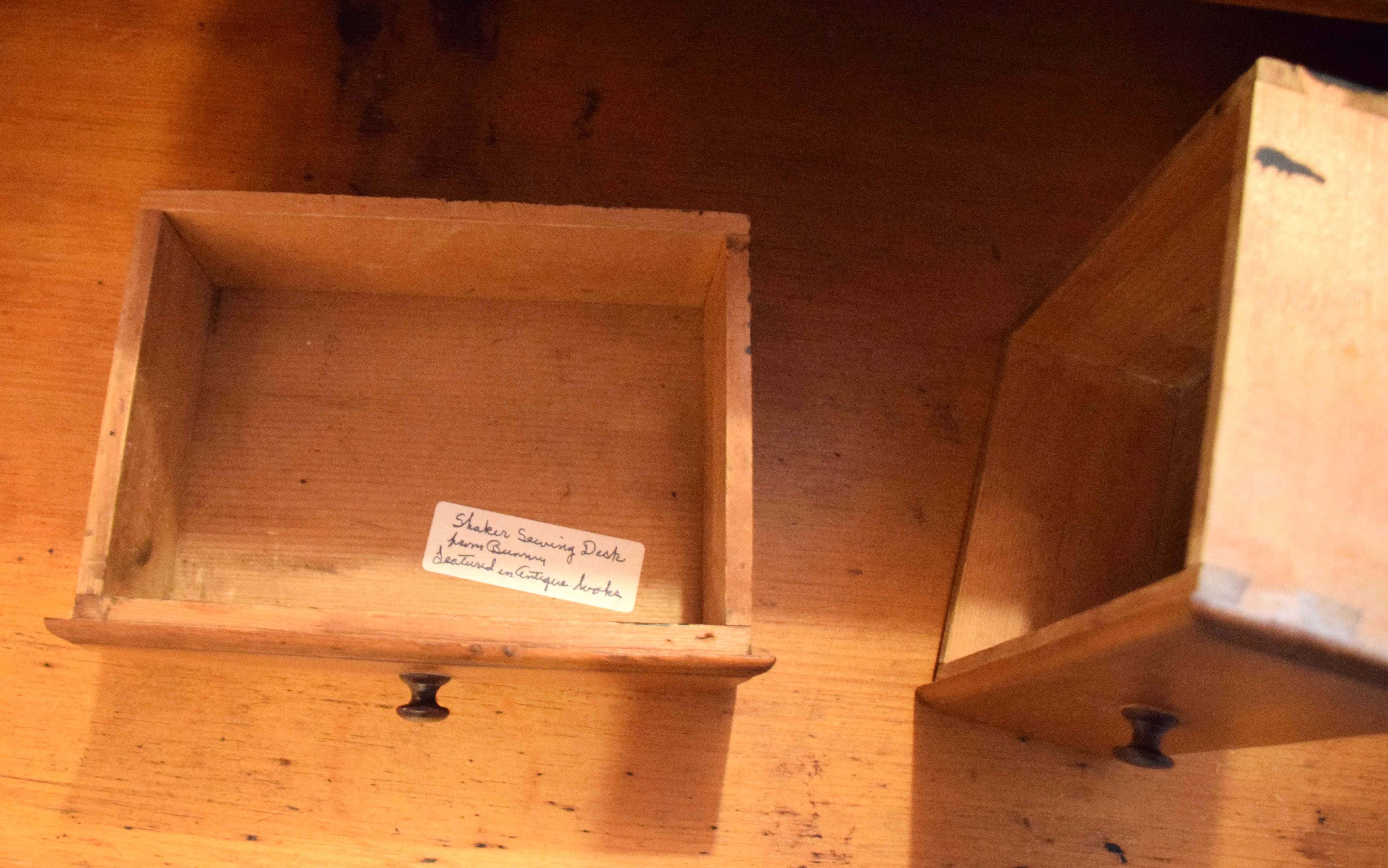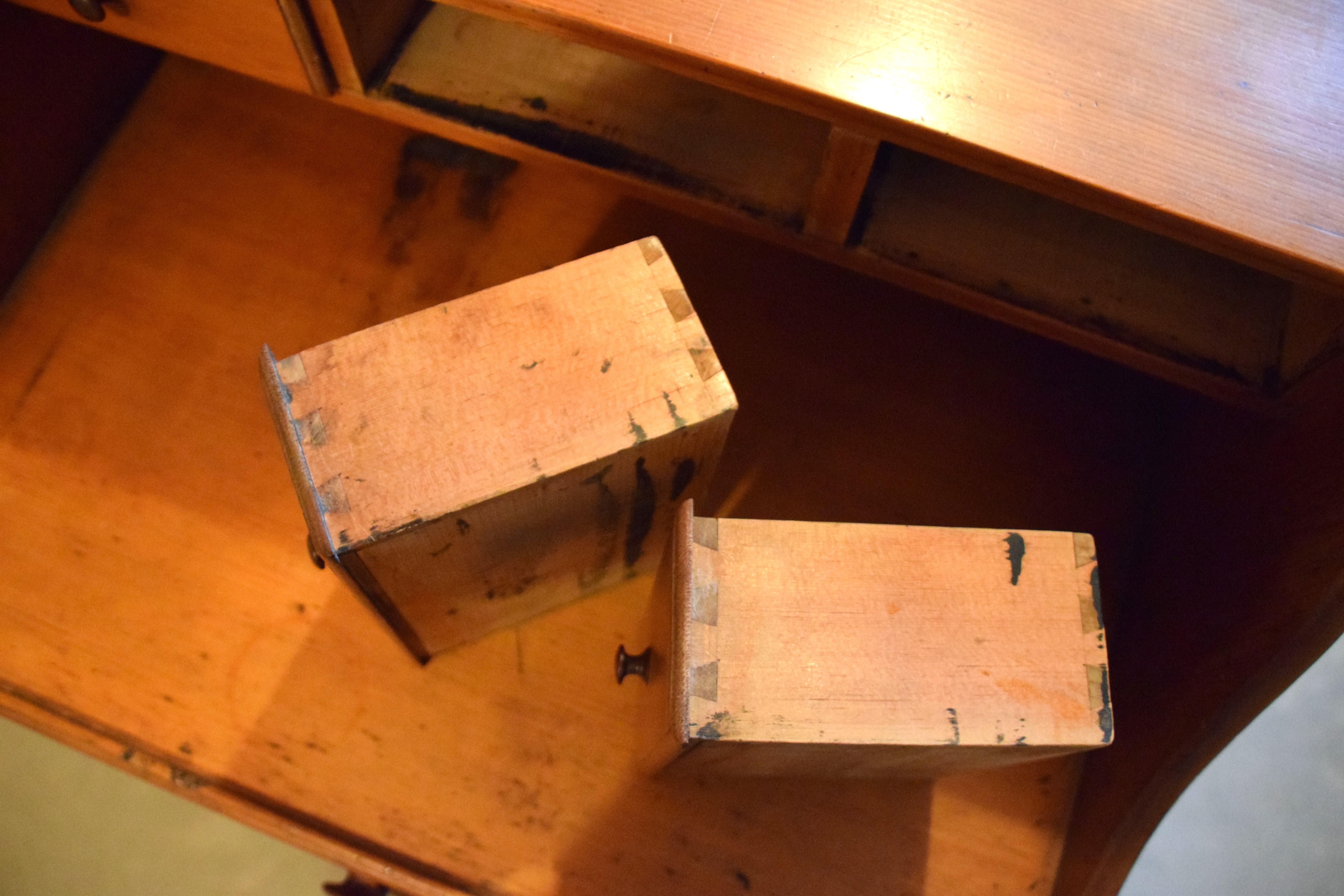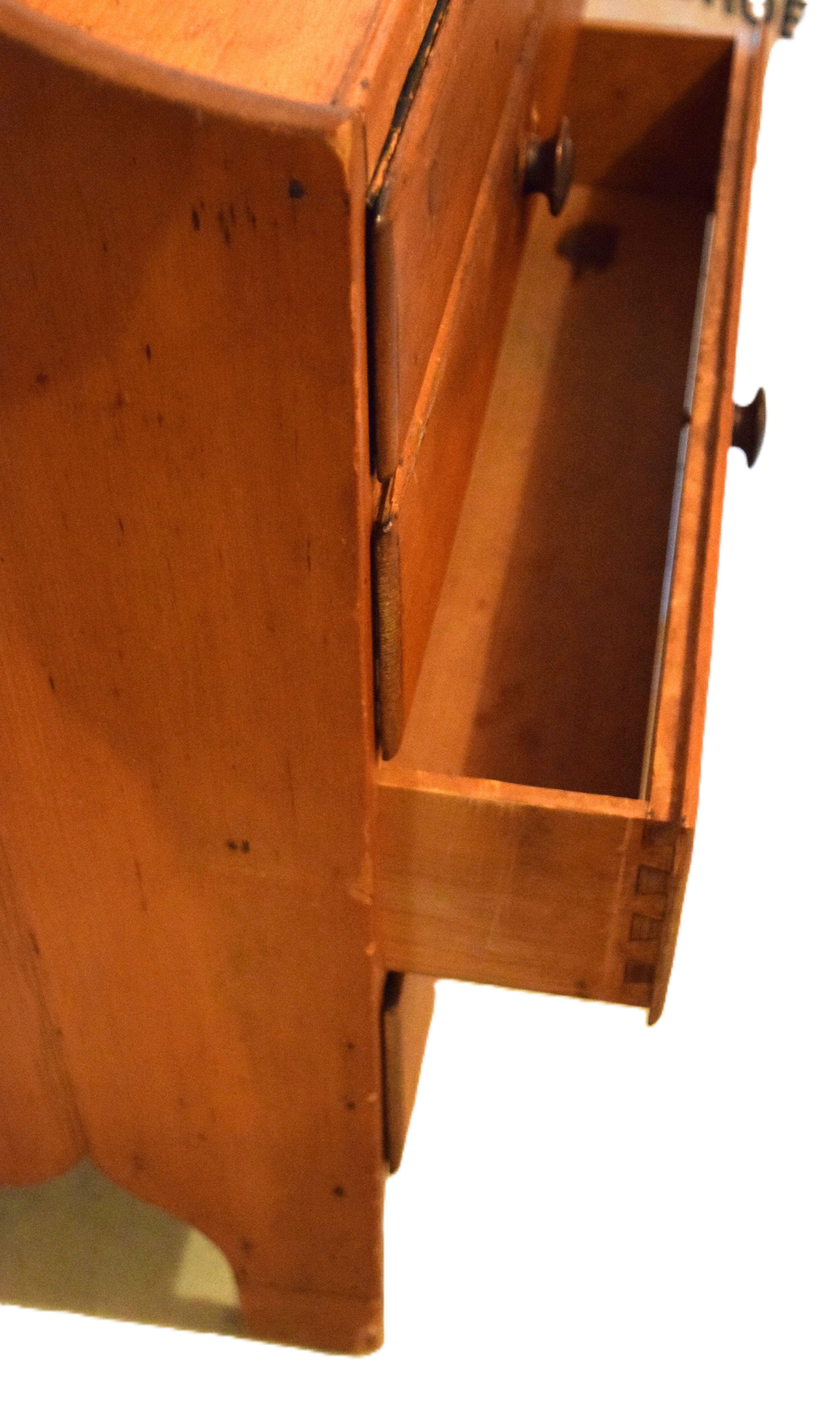 Early pine Shaker writing desk in a small size with three dovetailed constructed small drawers, open writing surface, four graduated lower case drawers, top drawer with hinged interior lid. The desk rests on a cut-out base. From a New London NH home. Provenance: The family received it many years ago from the Whitney Homestead on Canaan Street, Canaan NH and most likely from the Enfield NH Shaker Colony. Similar example in the book “Shaker Furniture” by Edward Andrew, plate 32. Dimensions: 38″ H x 27″ W x 18″ D