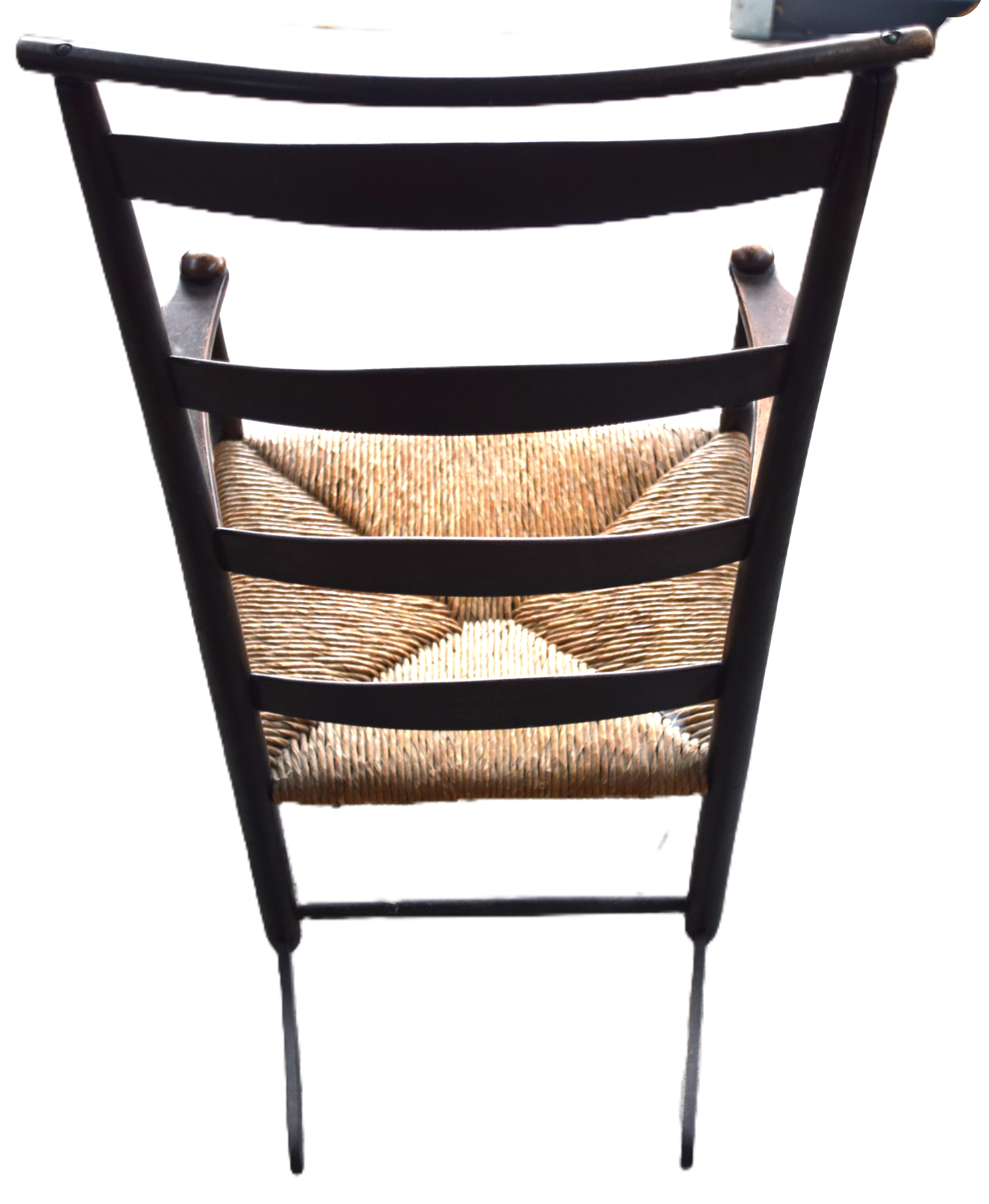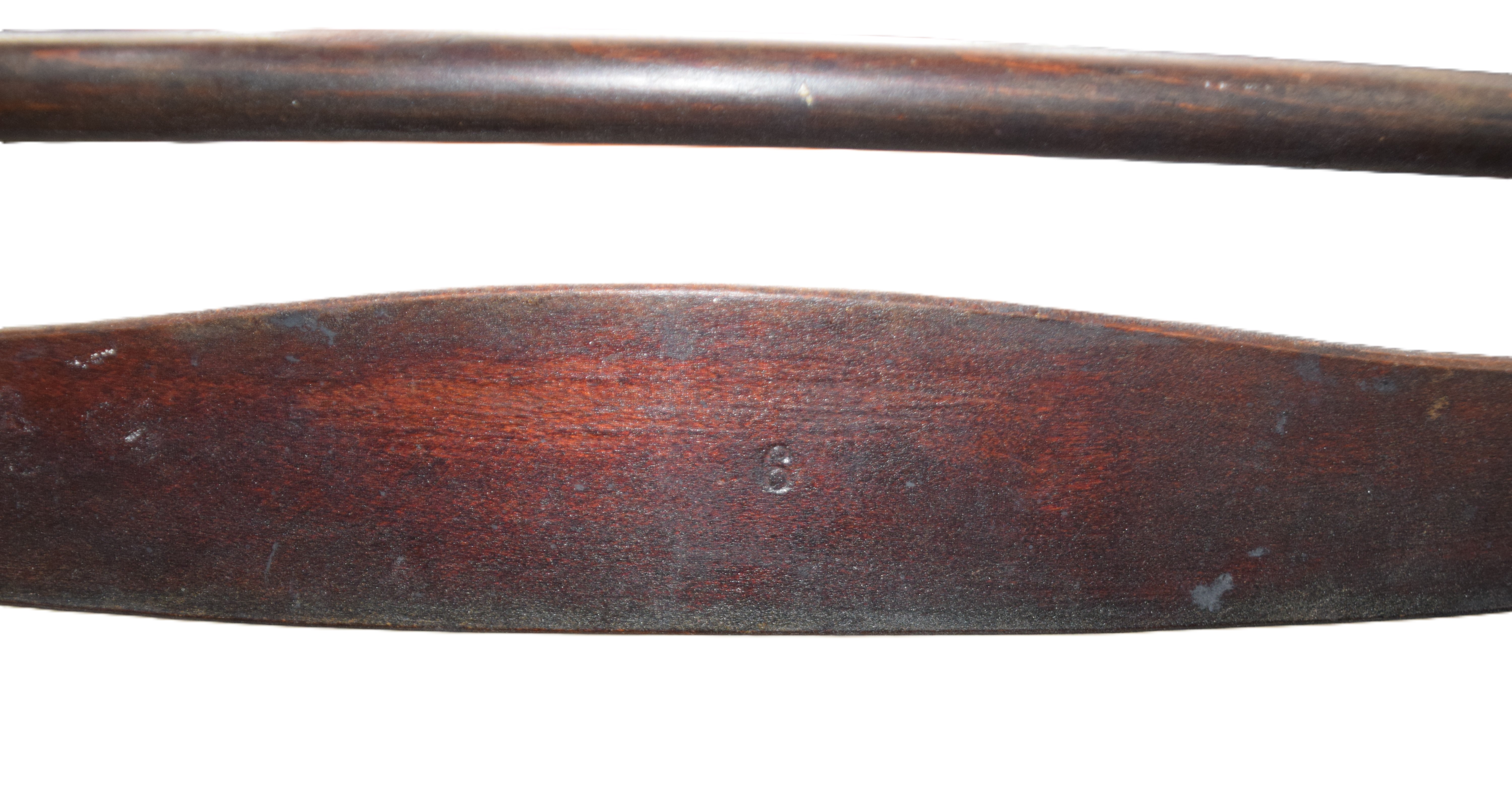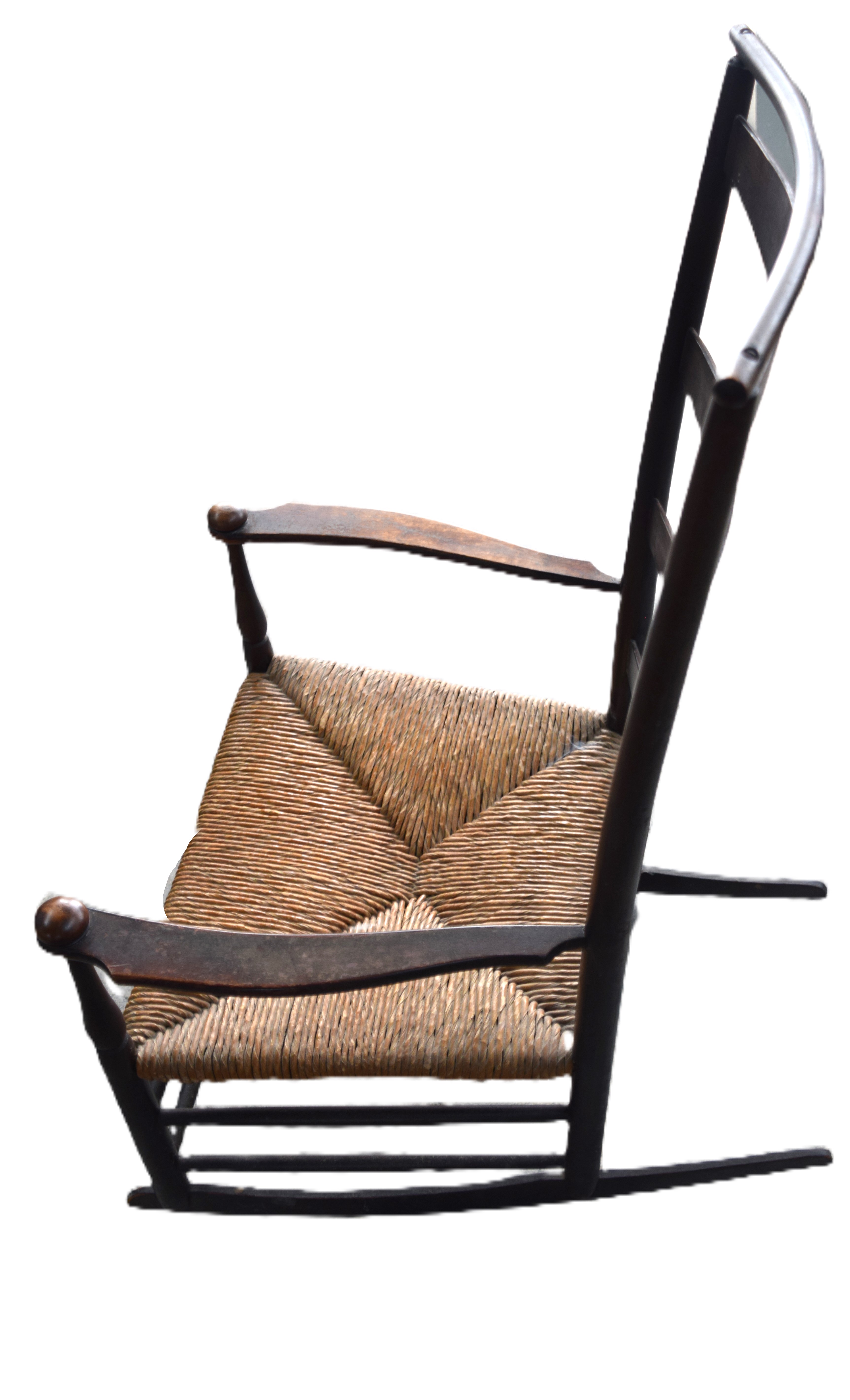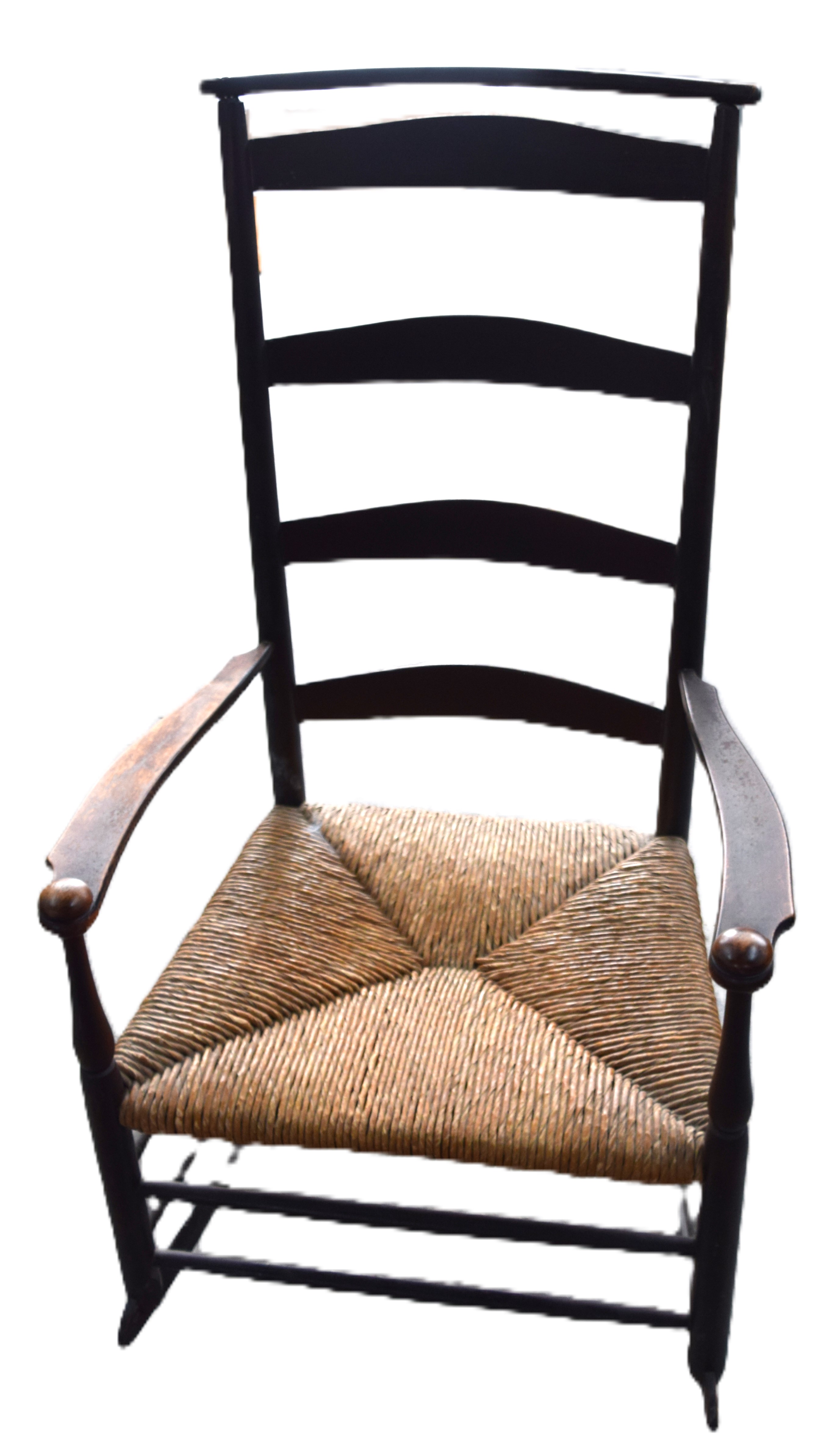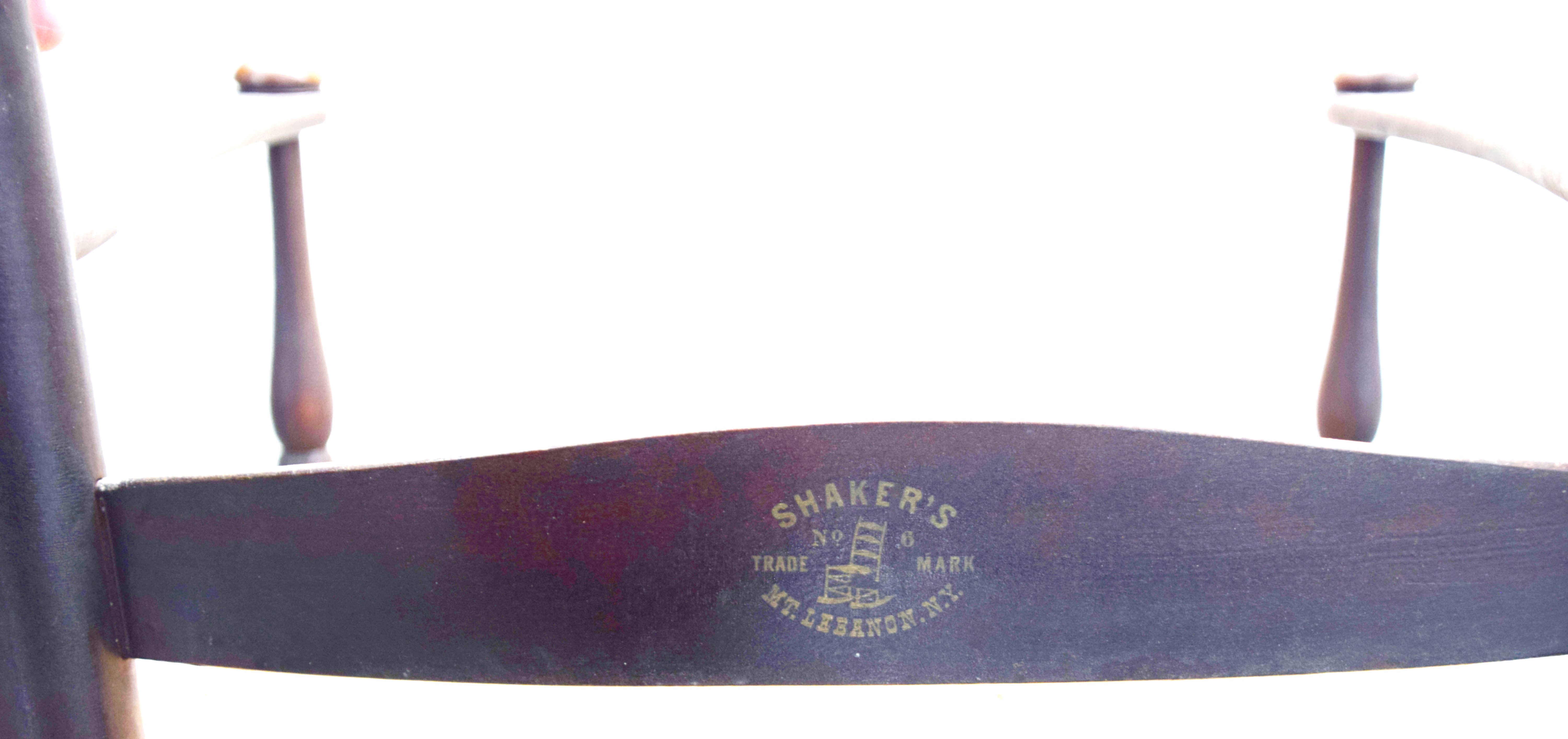 Mount Lebanon #6 Shaker arm rocker with single shawl rail, 4 ladder back splats, double rung structure base. #6 on top ladderback, Shaker stamp on 4th ladderback. Dimensions: 15″ Seat height, 41″ Overall