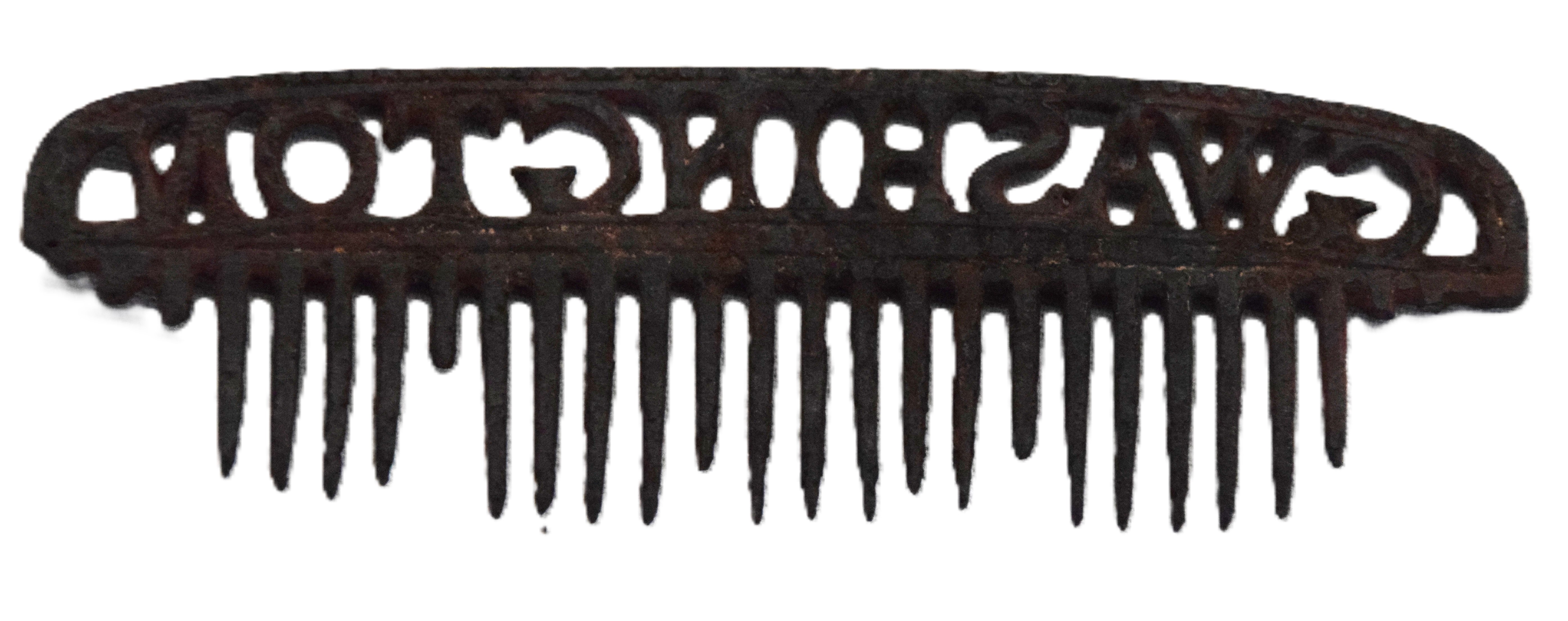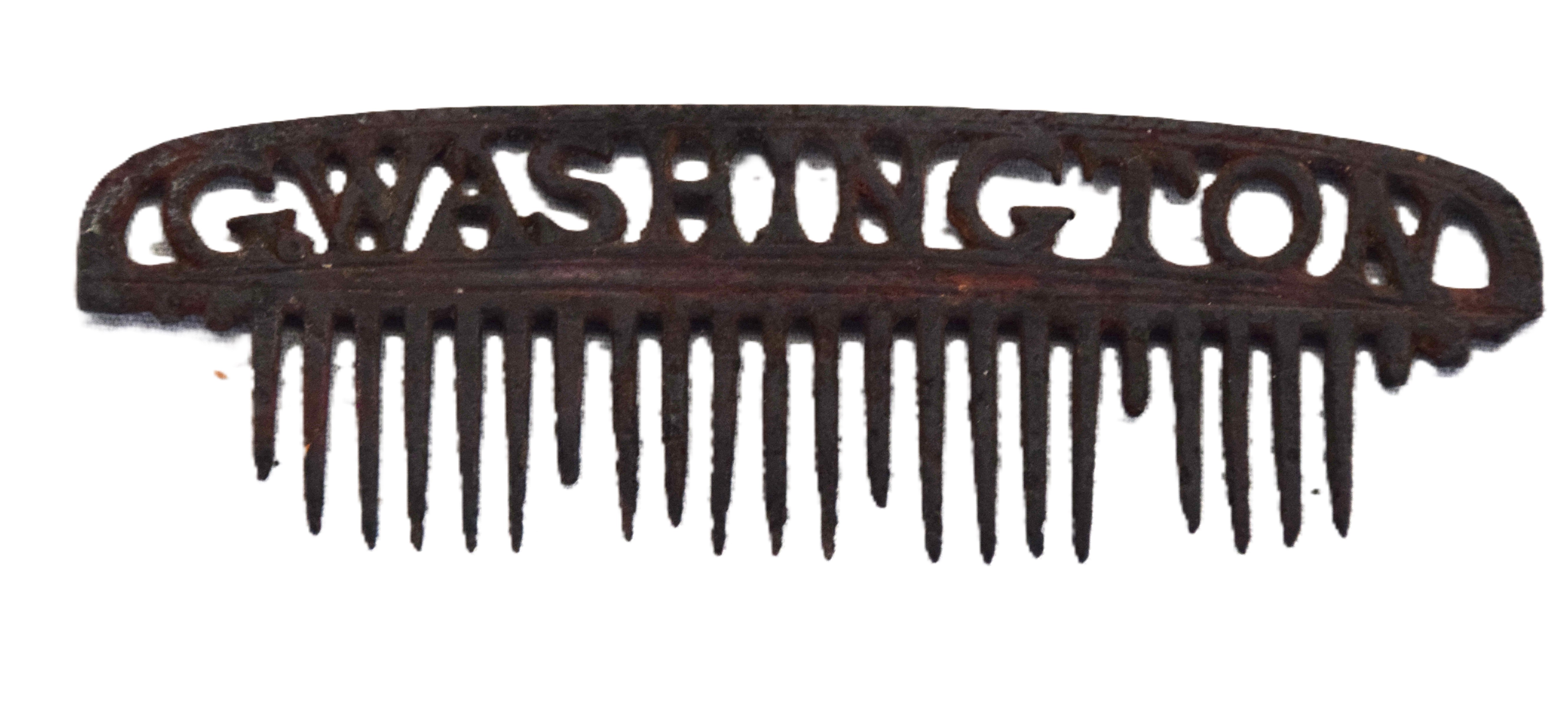 Rare example of an iron comb with hollow cut-out lettering along the handle reading ” G Washington”. Circa early 1800s.Found in 19th century house attic in New Boston, NH. Dimensions: 1.5″ H x 4.5″ L