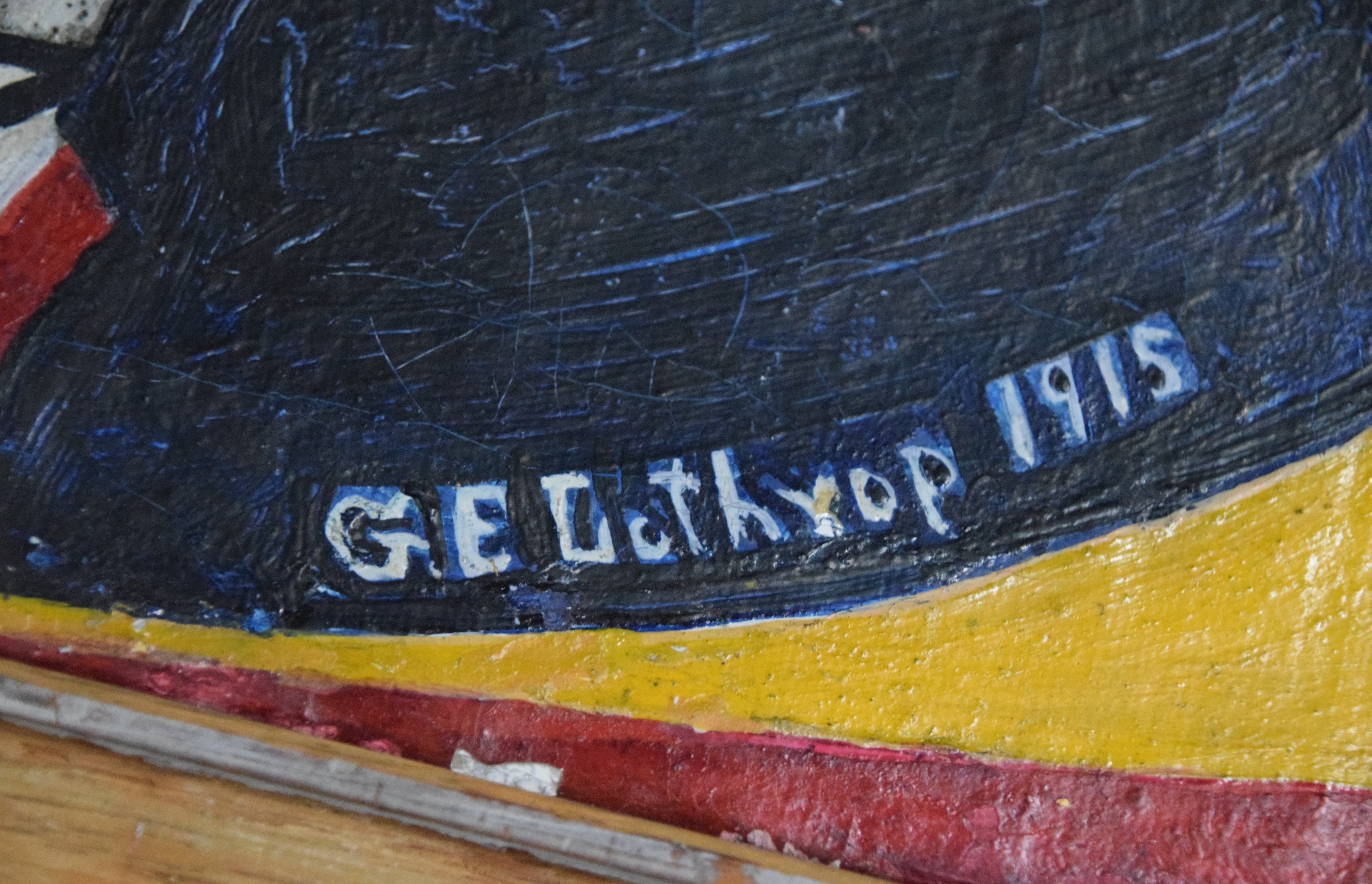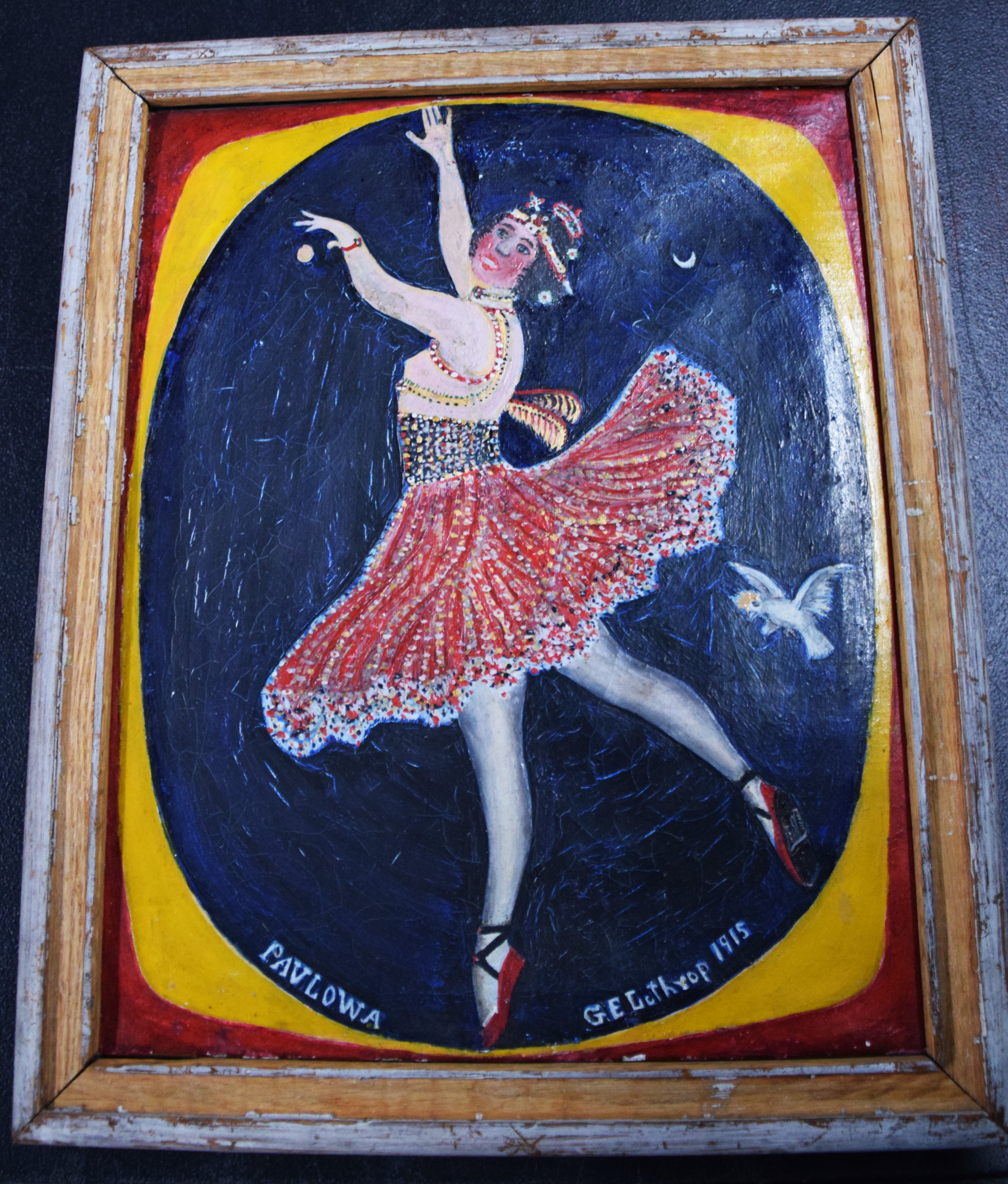 Signed and framed oil on artist board of a dancer named Pavlowa. George Edwin Lothrop (1867 – 1939) worked in Massachusetts and is known for Naive figure-genre and allegory painting. Dimensions: 14″ x 11″ Image size