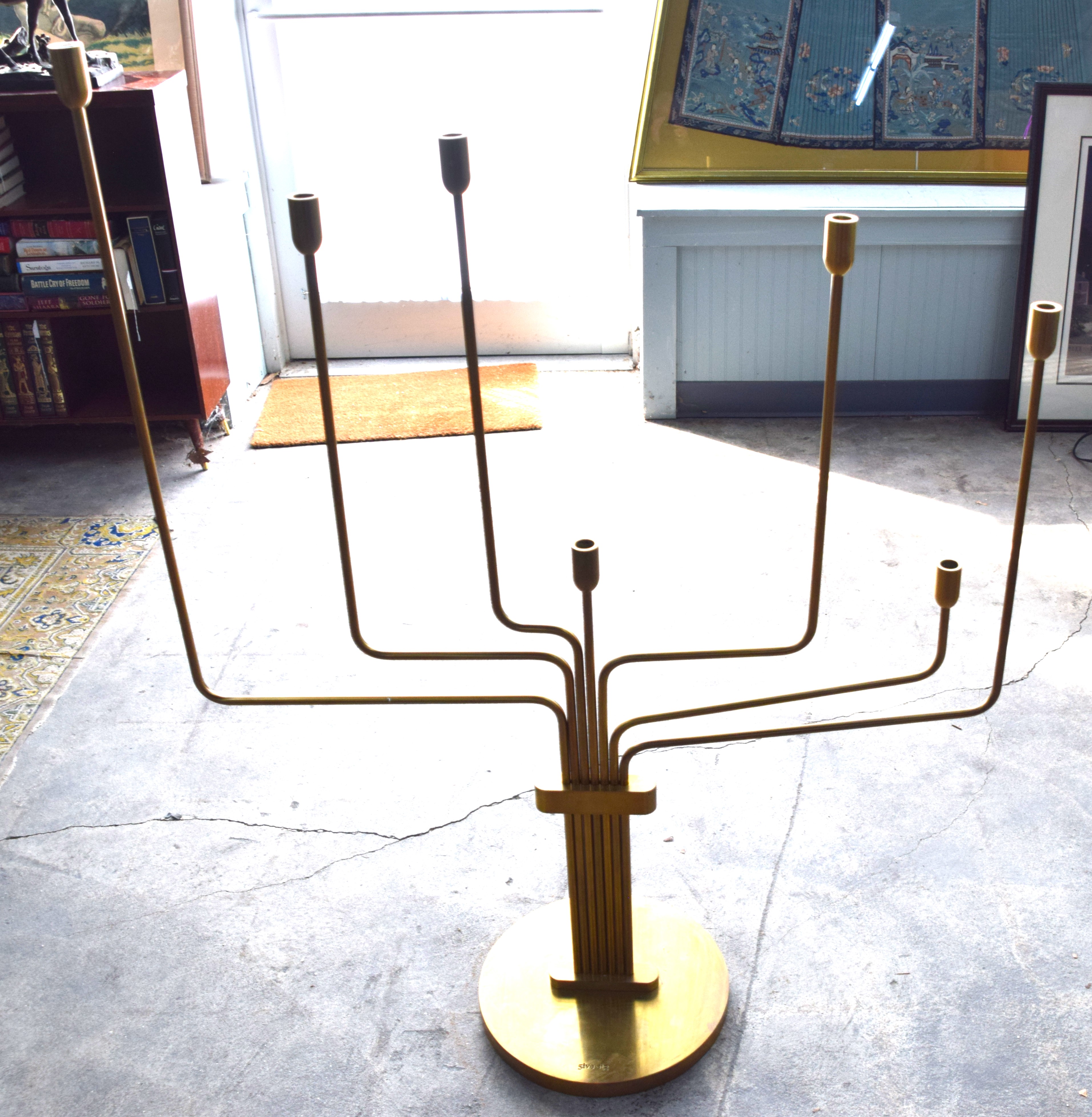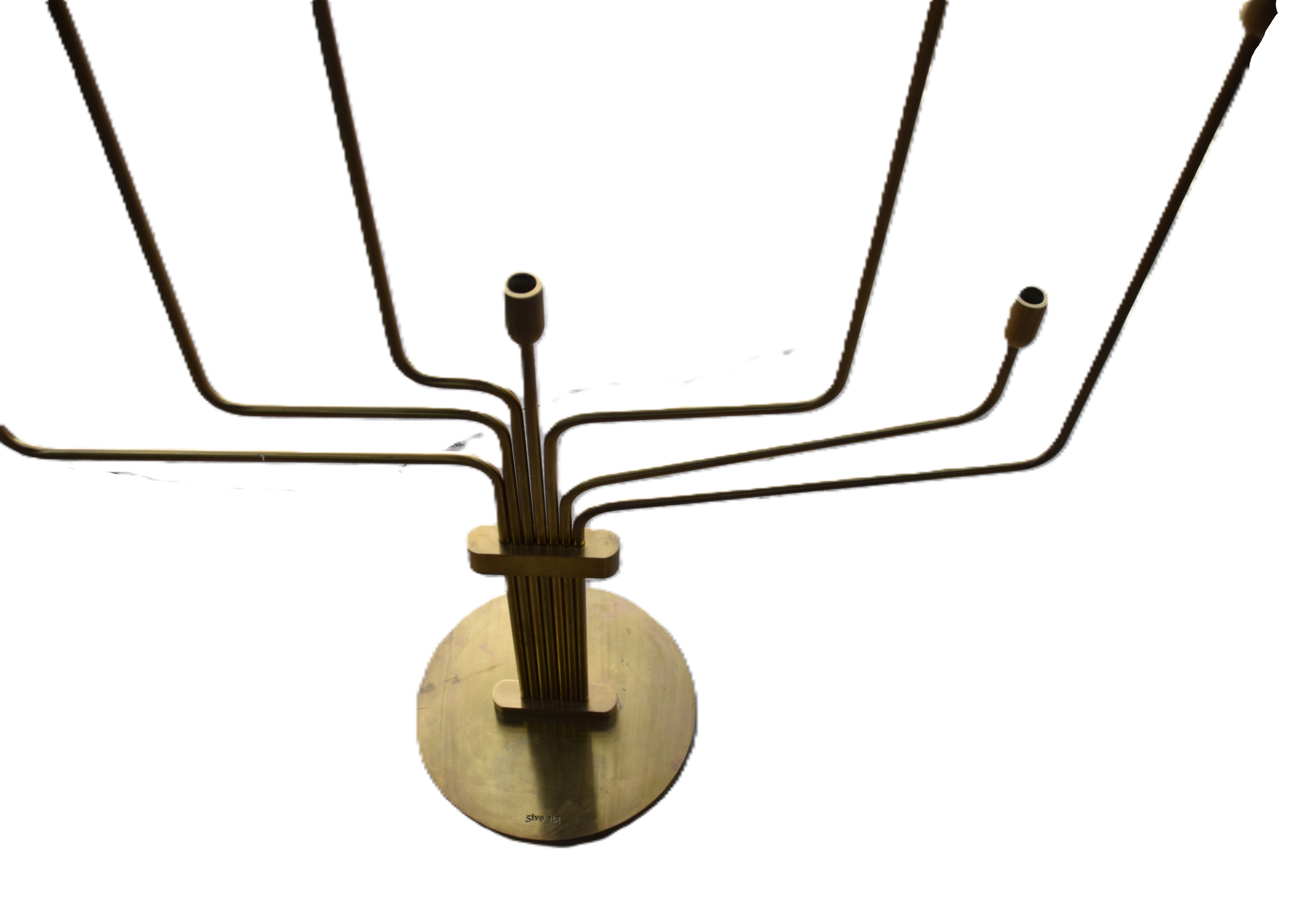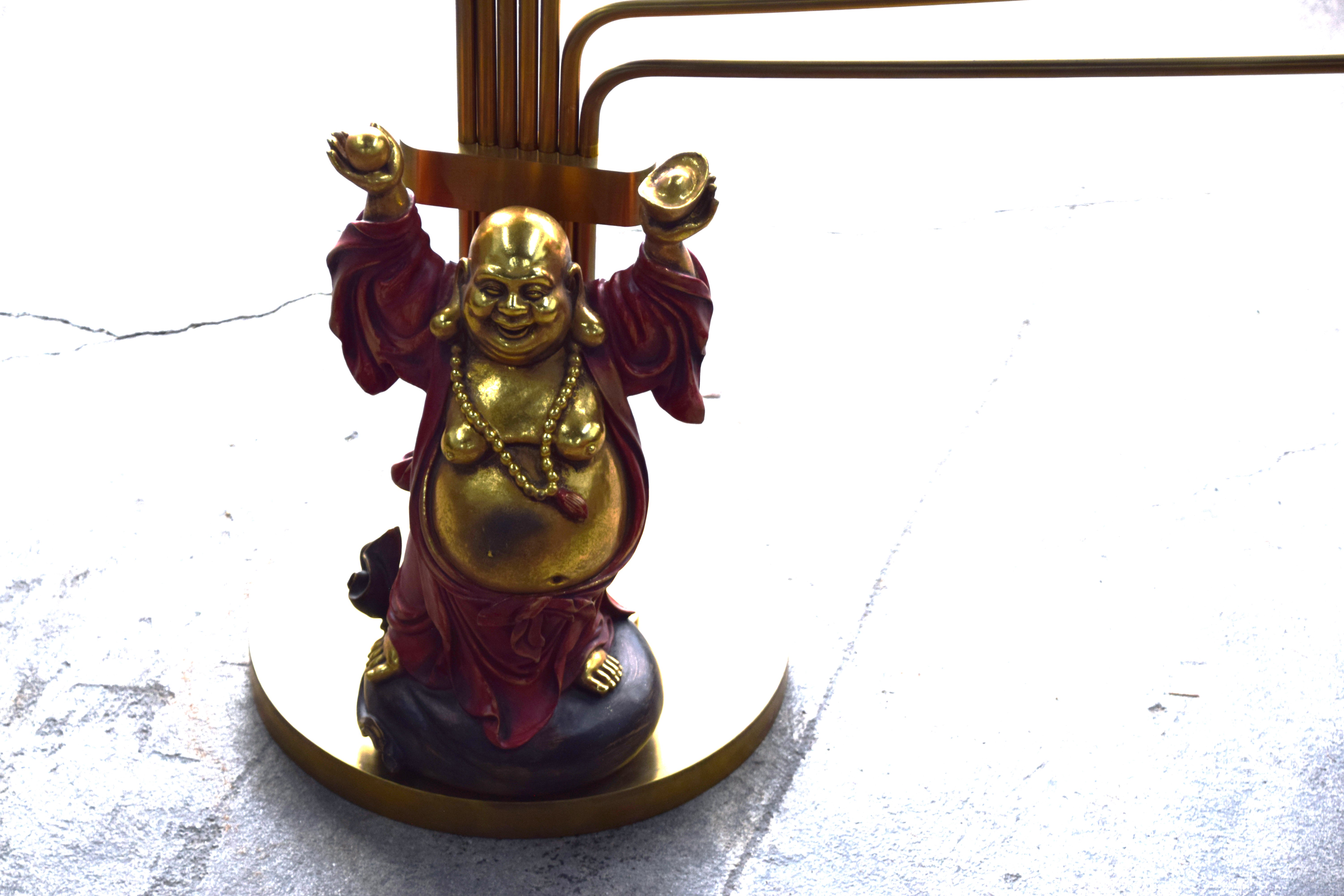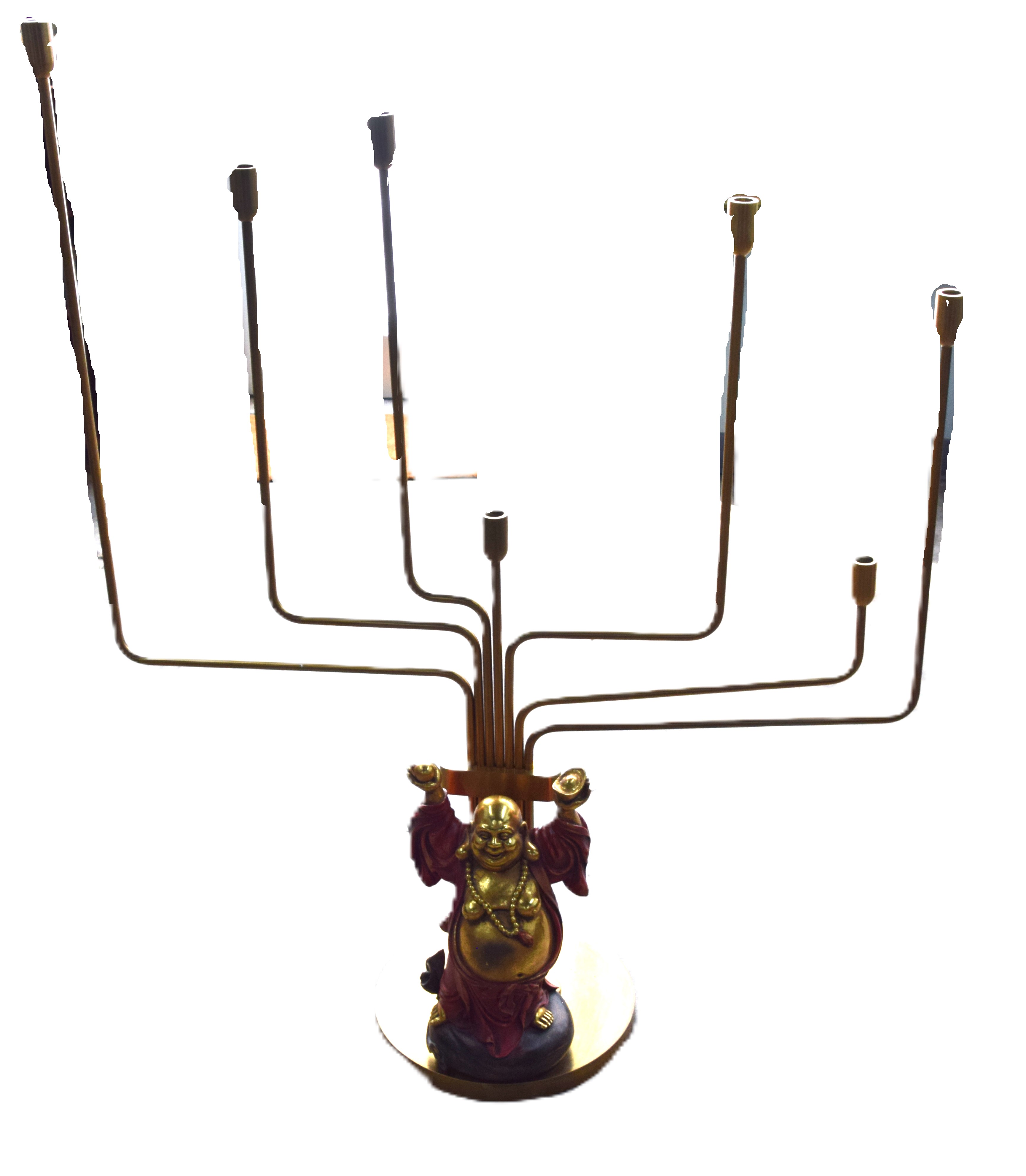 Brass 6 swing arm candelabra with a Happy Budha. Dimensions: 50″ H Candelabra, 17″ H Budha