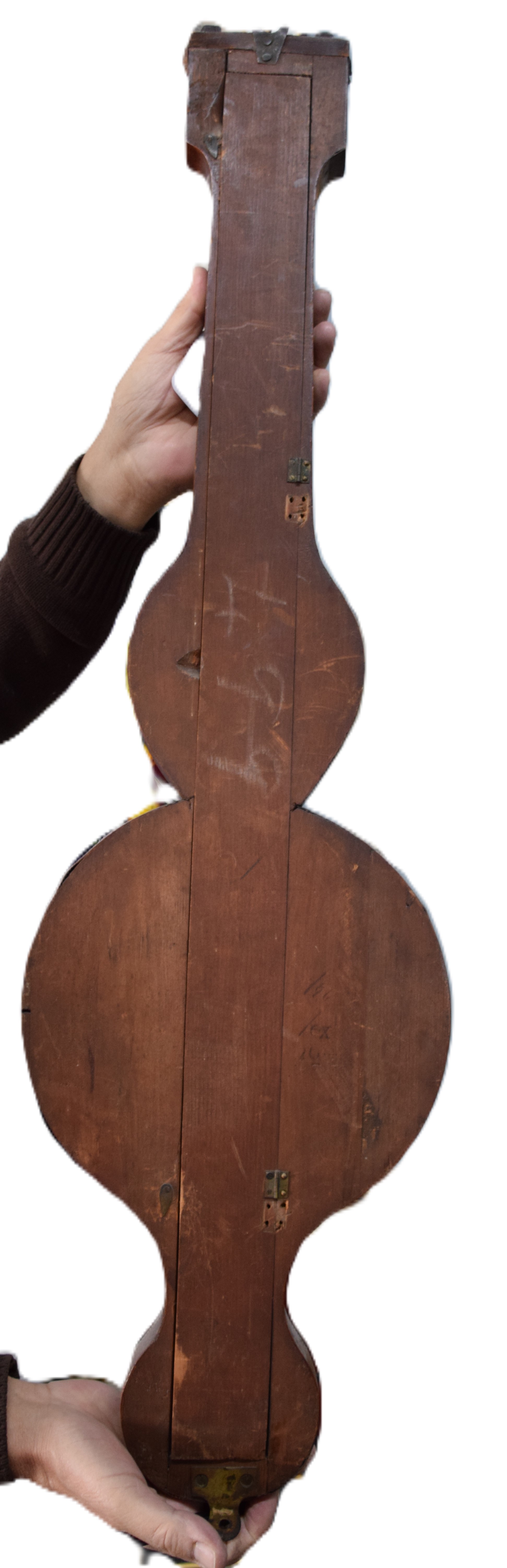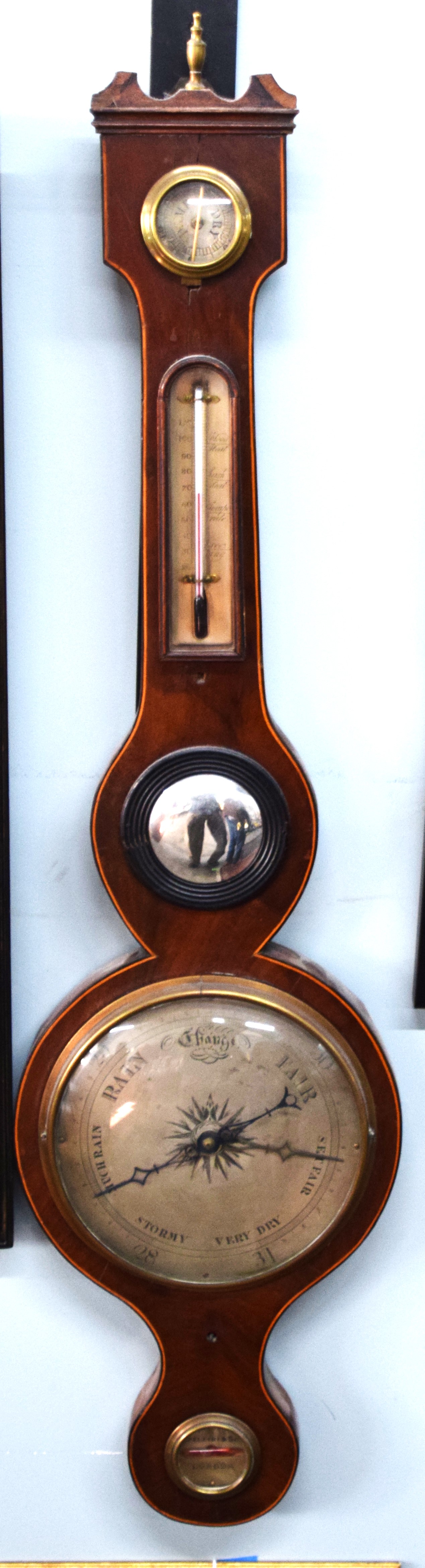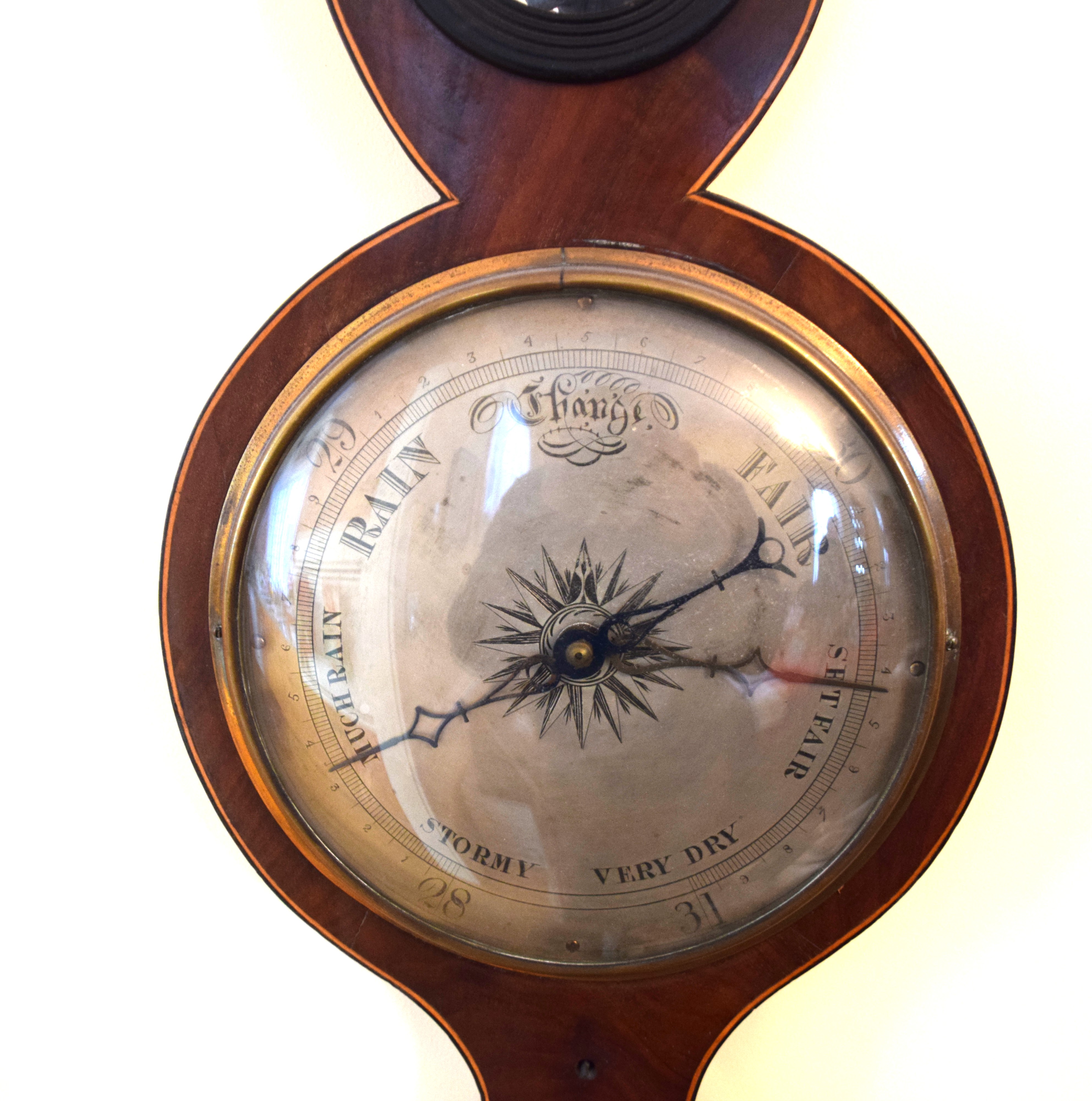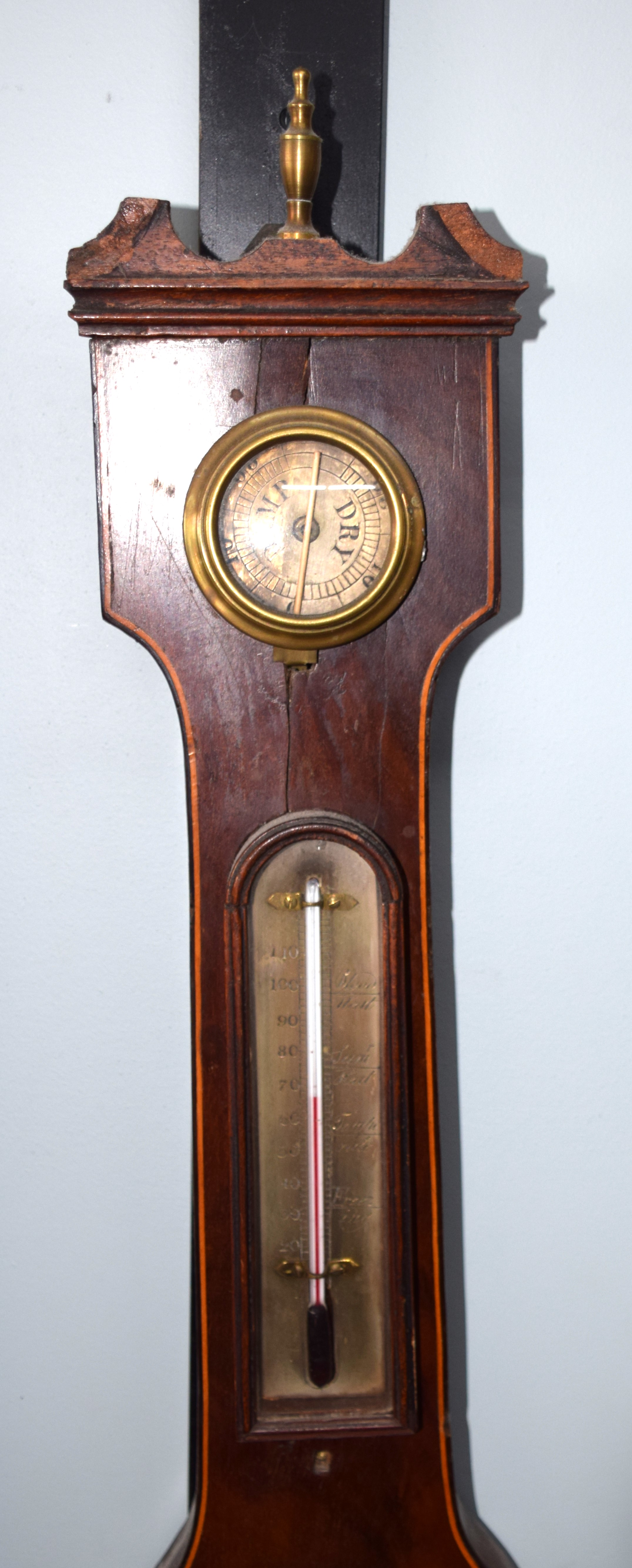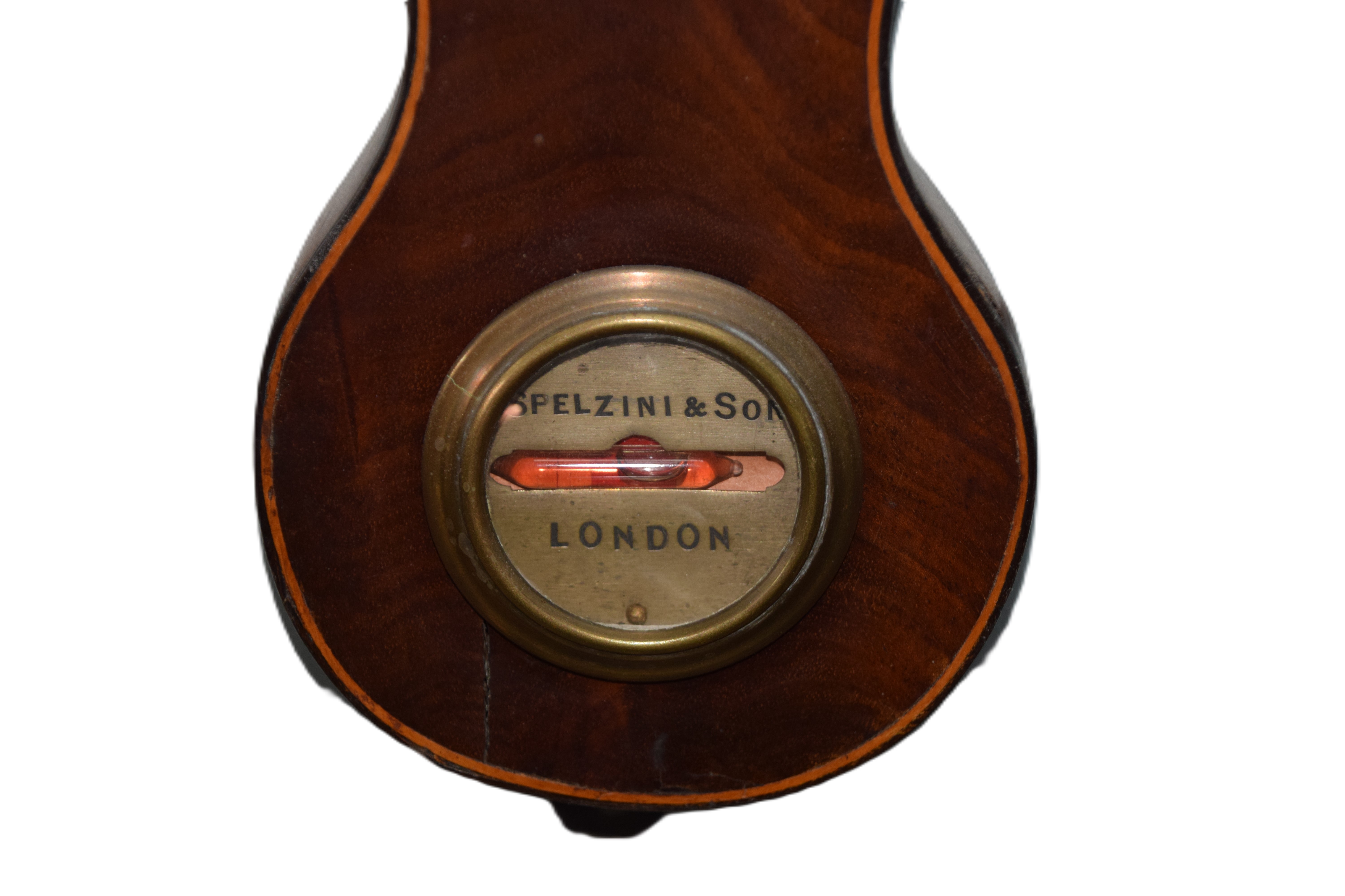 English wagon wheel barometer, mahogany with inlay. Made by Spelzini & Son, London. Dimensions: