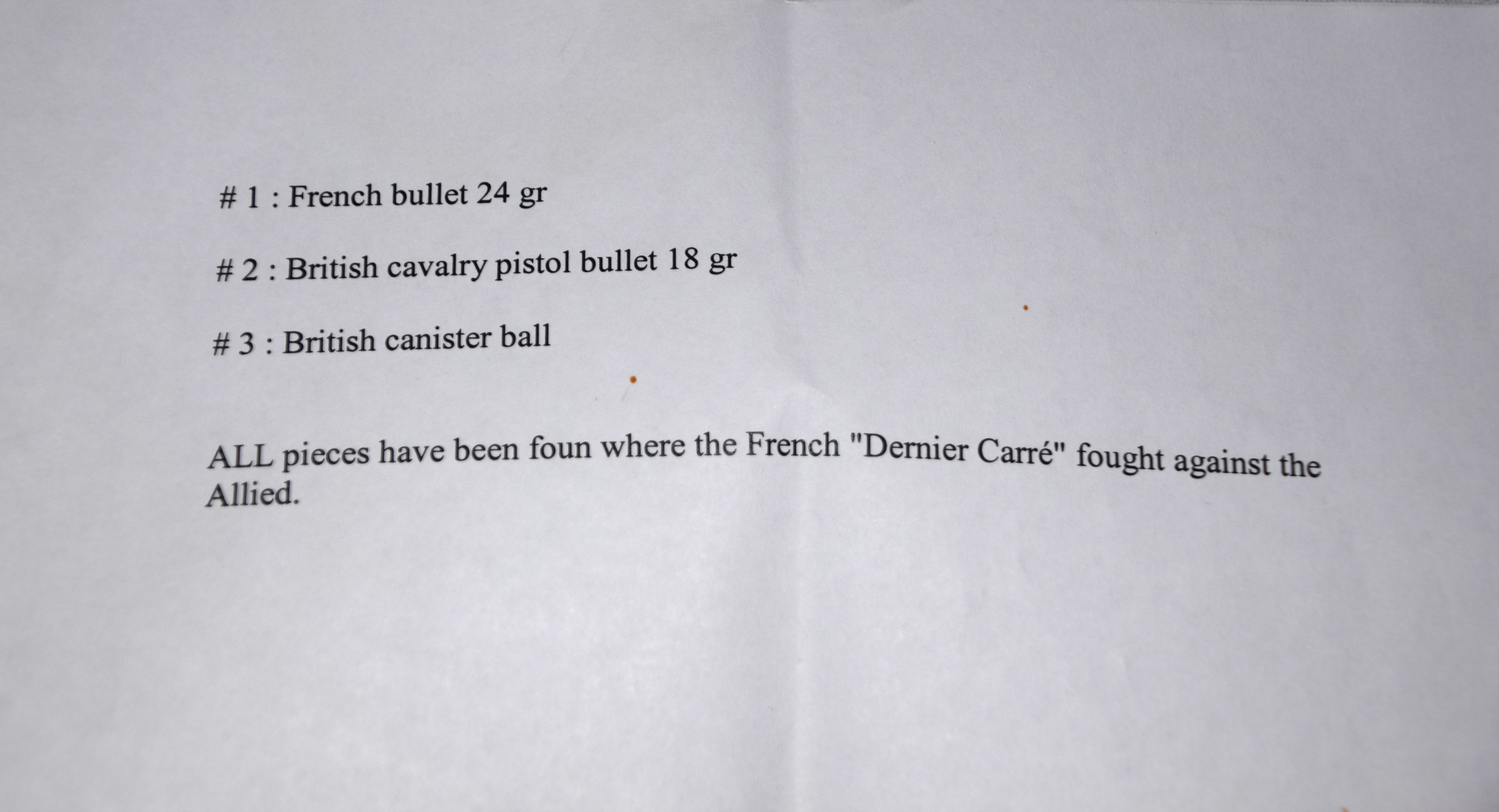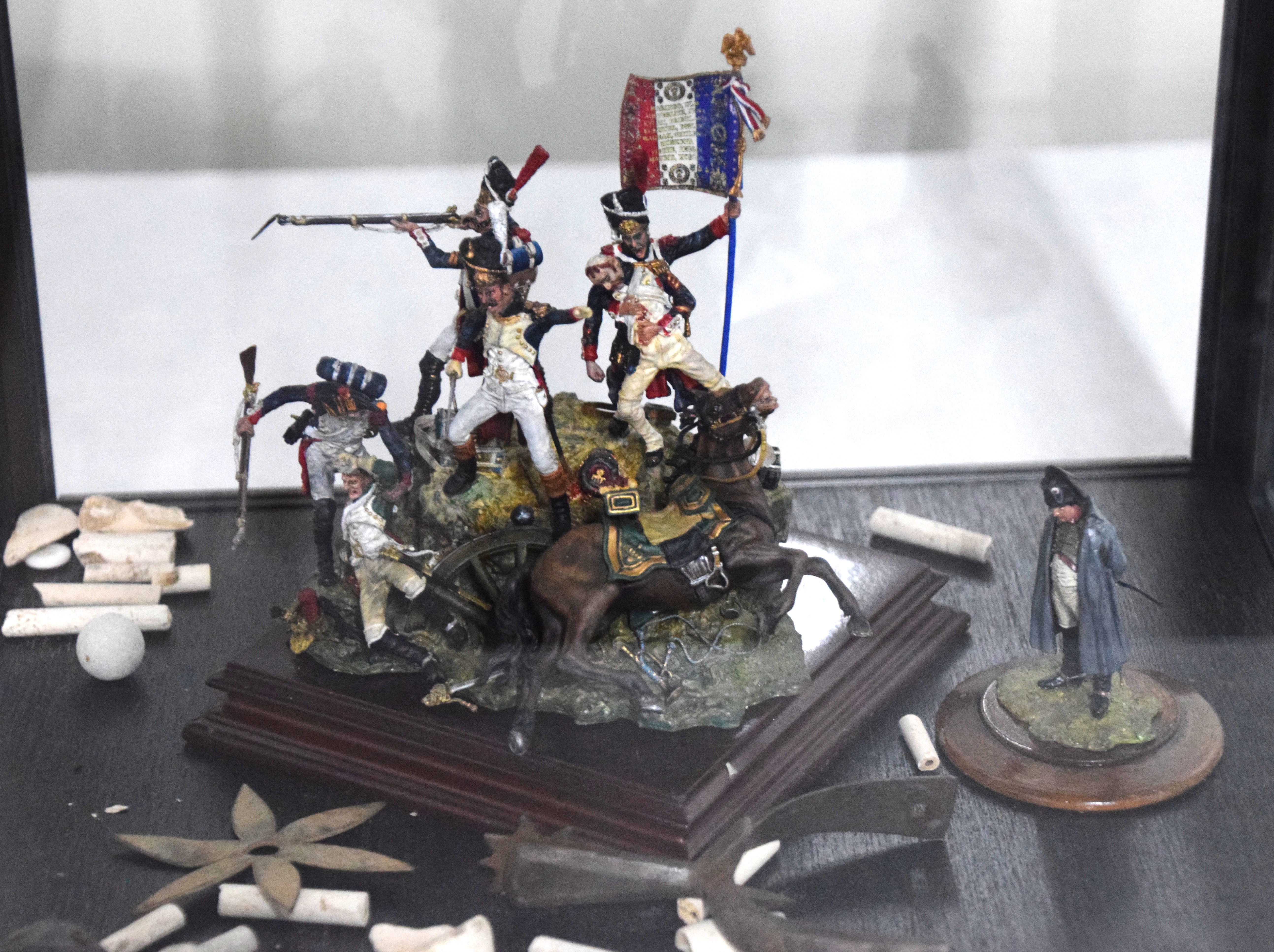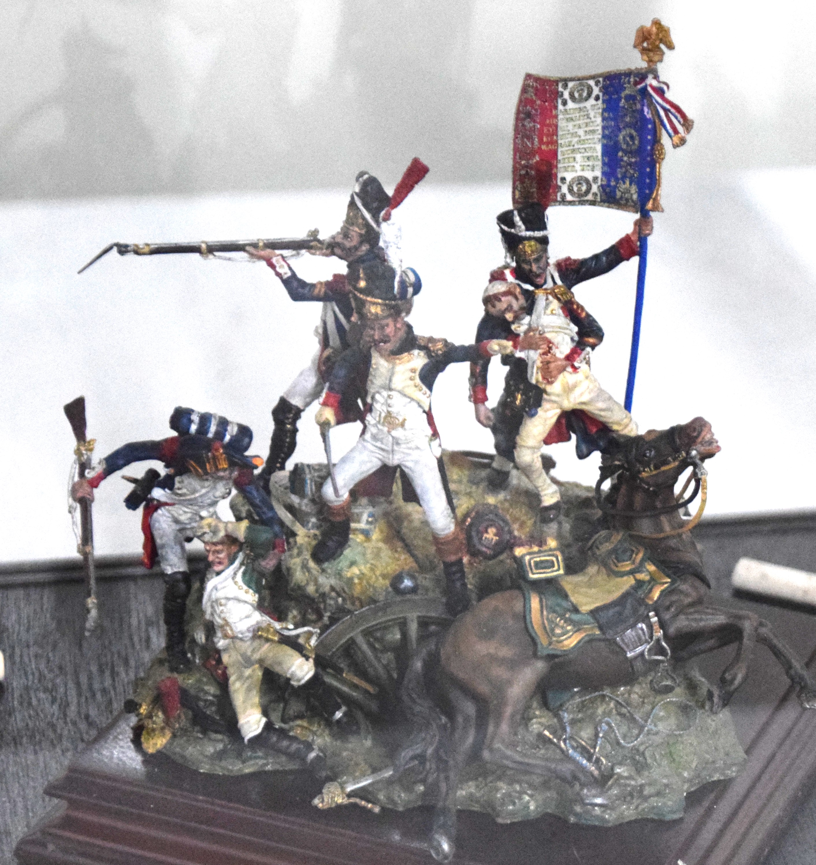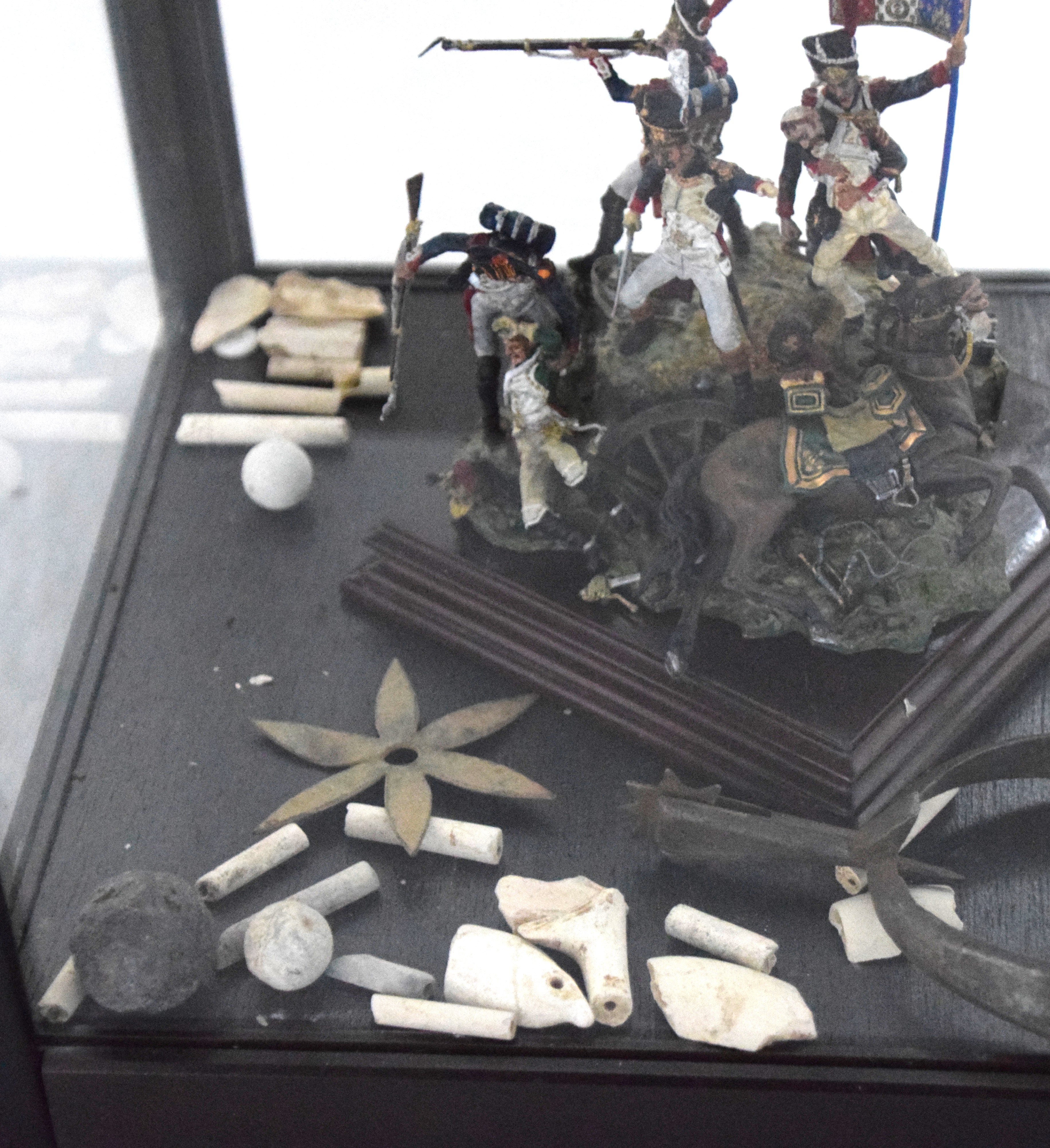 Battle scene of Napoleon soldiers along with a statue of Napoleon in a glass case titled Dernier Carre or Last Four. Also included are fragments from a battlefield to include French 24gr ball, British carbine 18gr ball, and a British cannister ball. Dimensions: 13″ Cube glass case