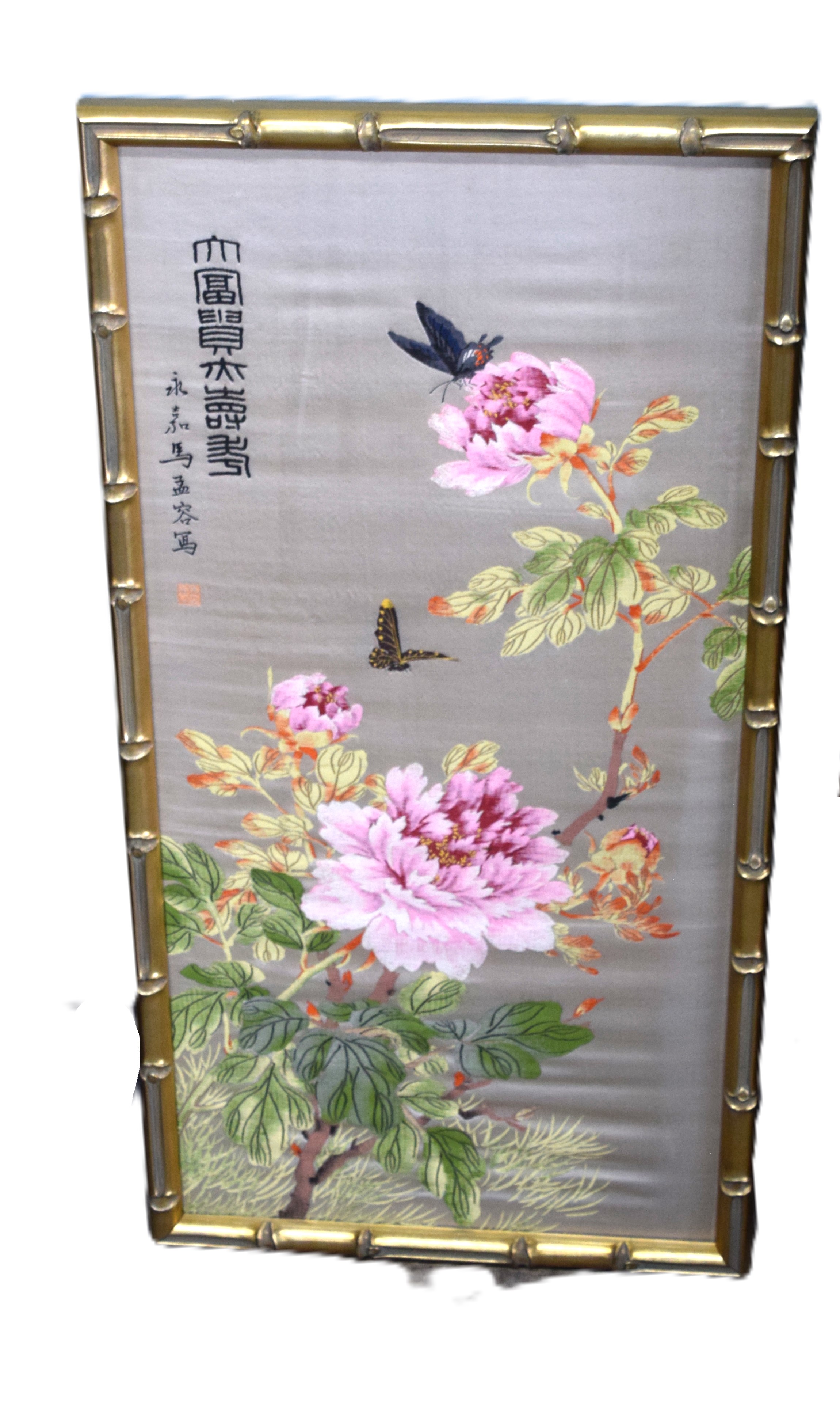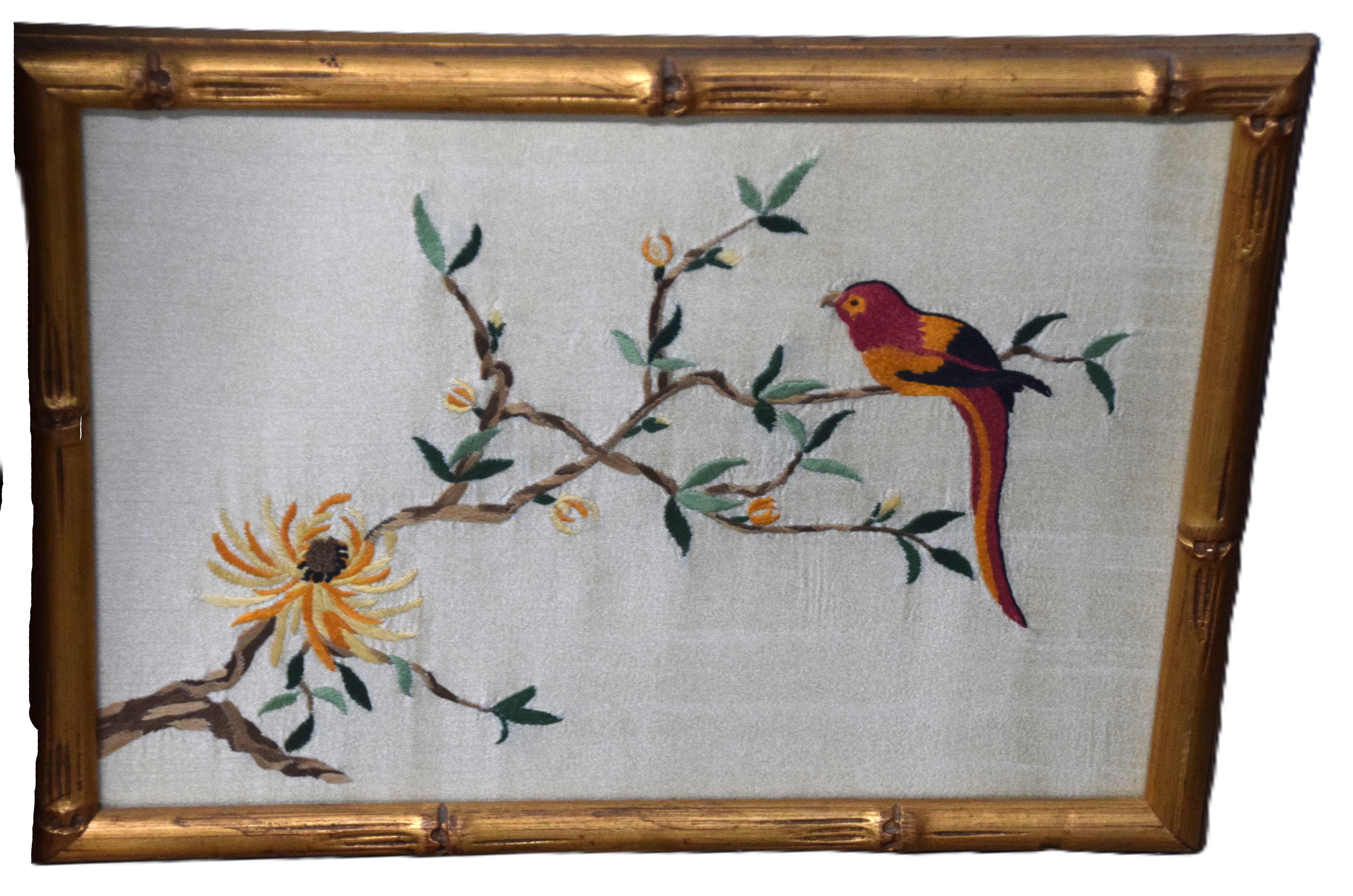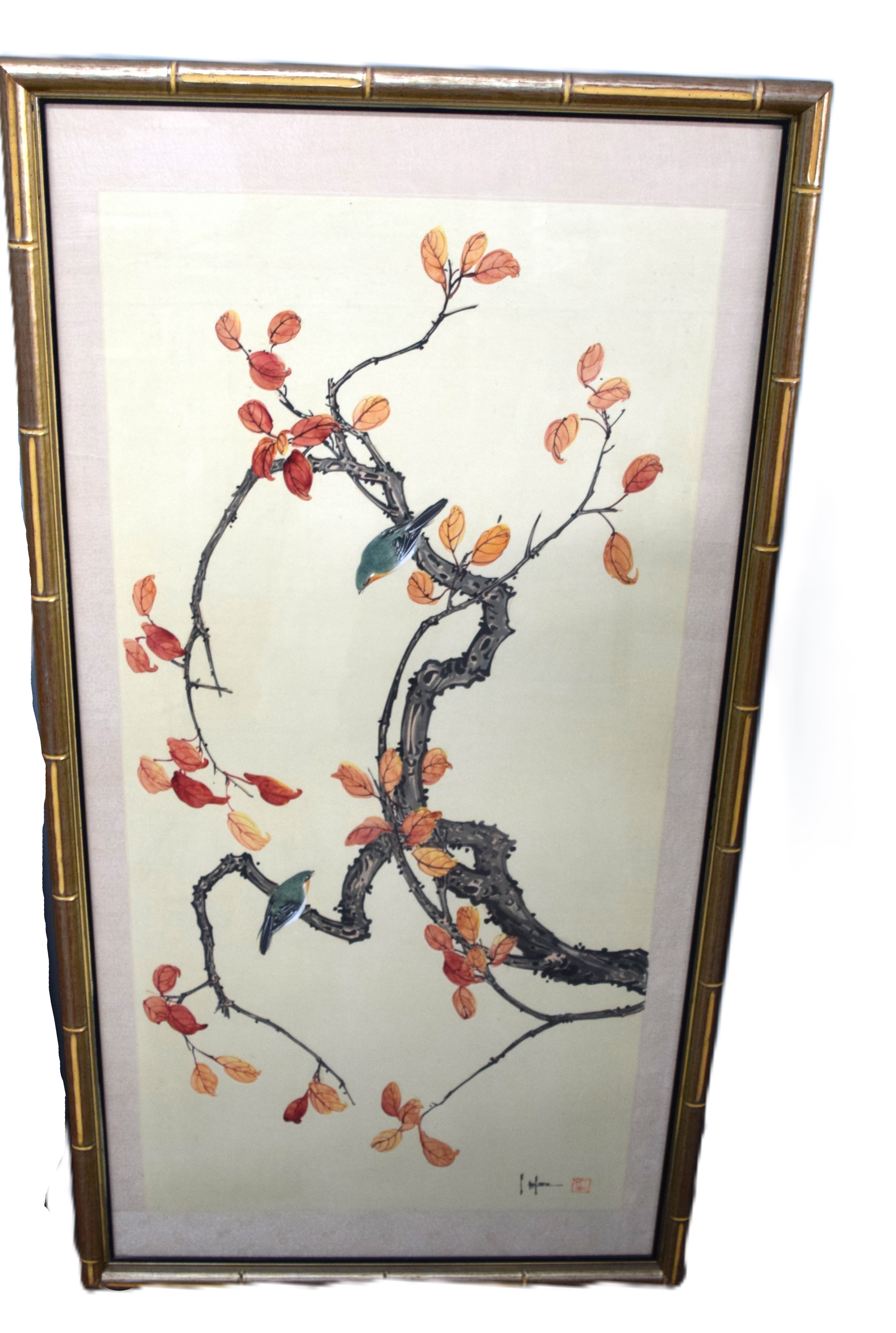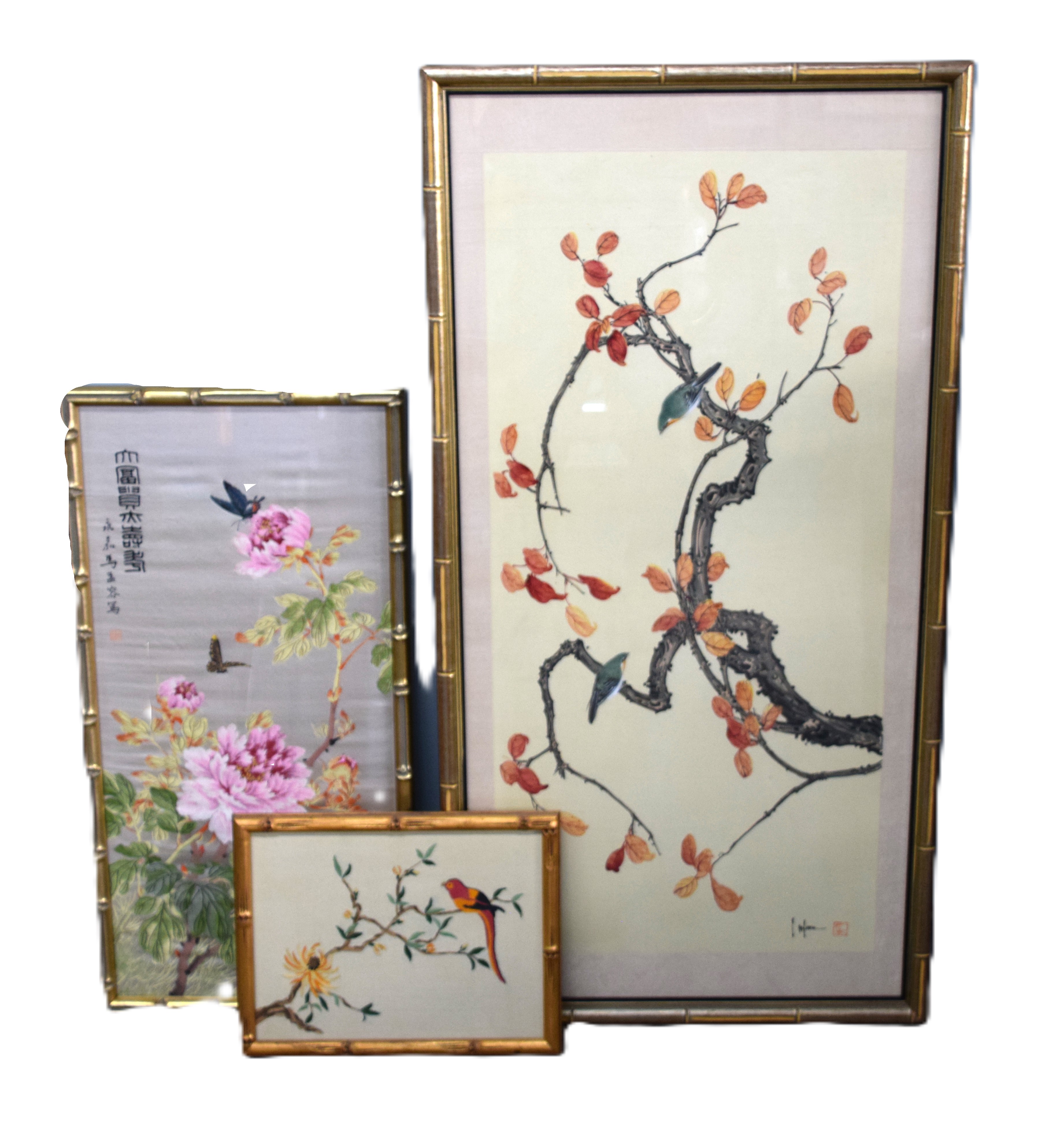 Three oriental artworks, one watercolor, two prints with birds and trees. Dimensions: 12″ x 16″ and 48″ x 23″
