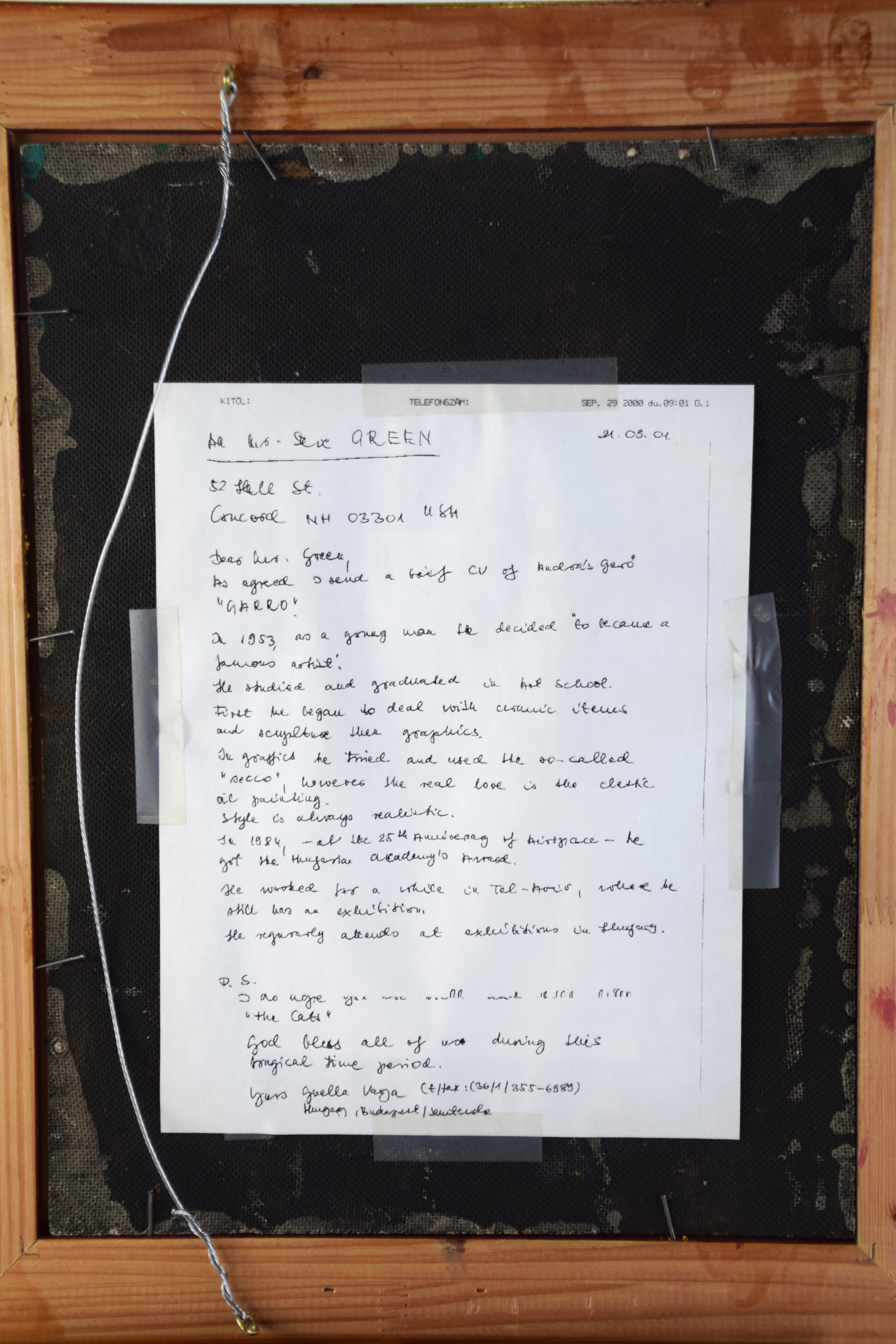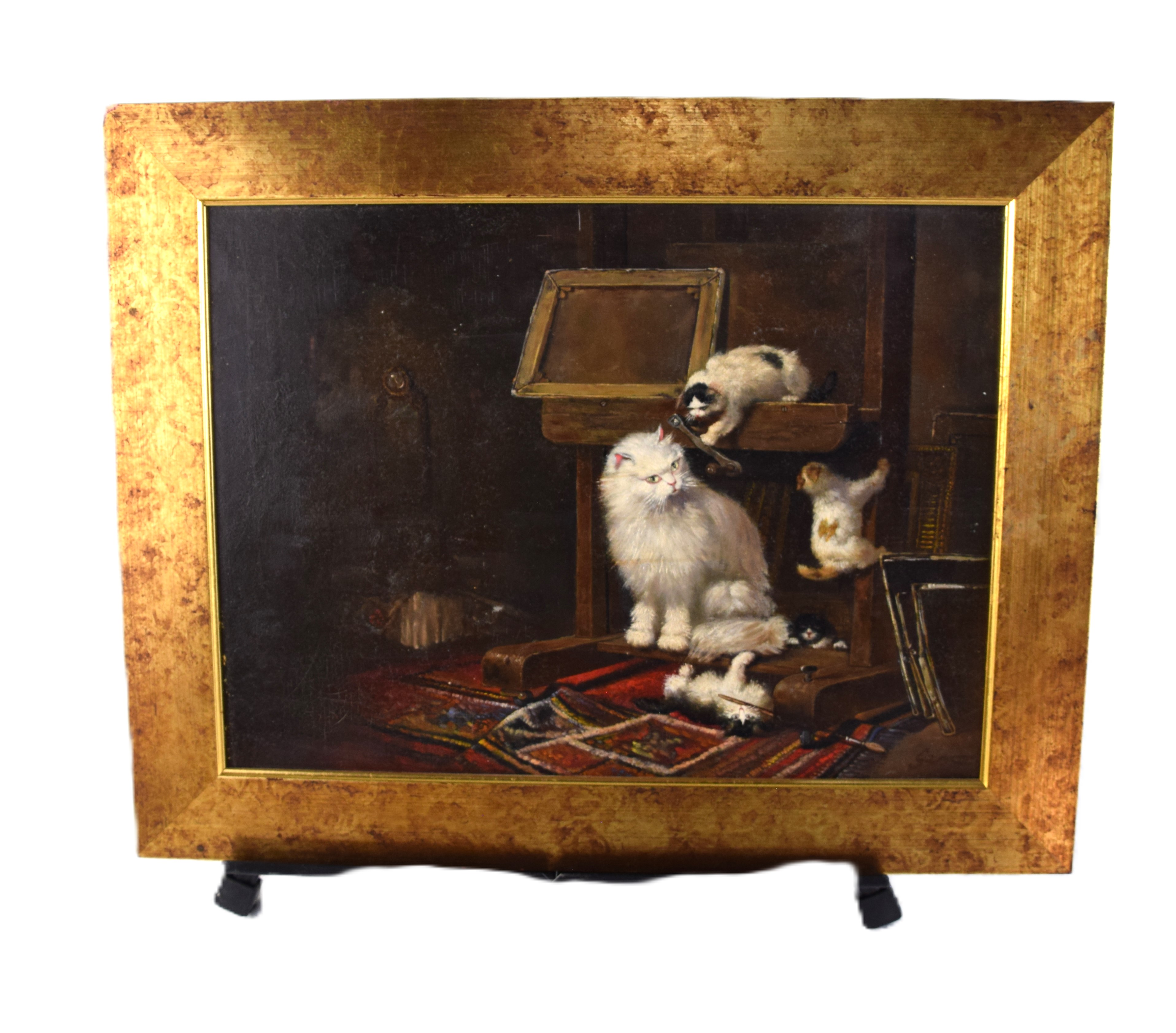 A framed oil on canvas painting of four cats by Hungarian artist Garro. Dimensions: 16″ x 12″