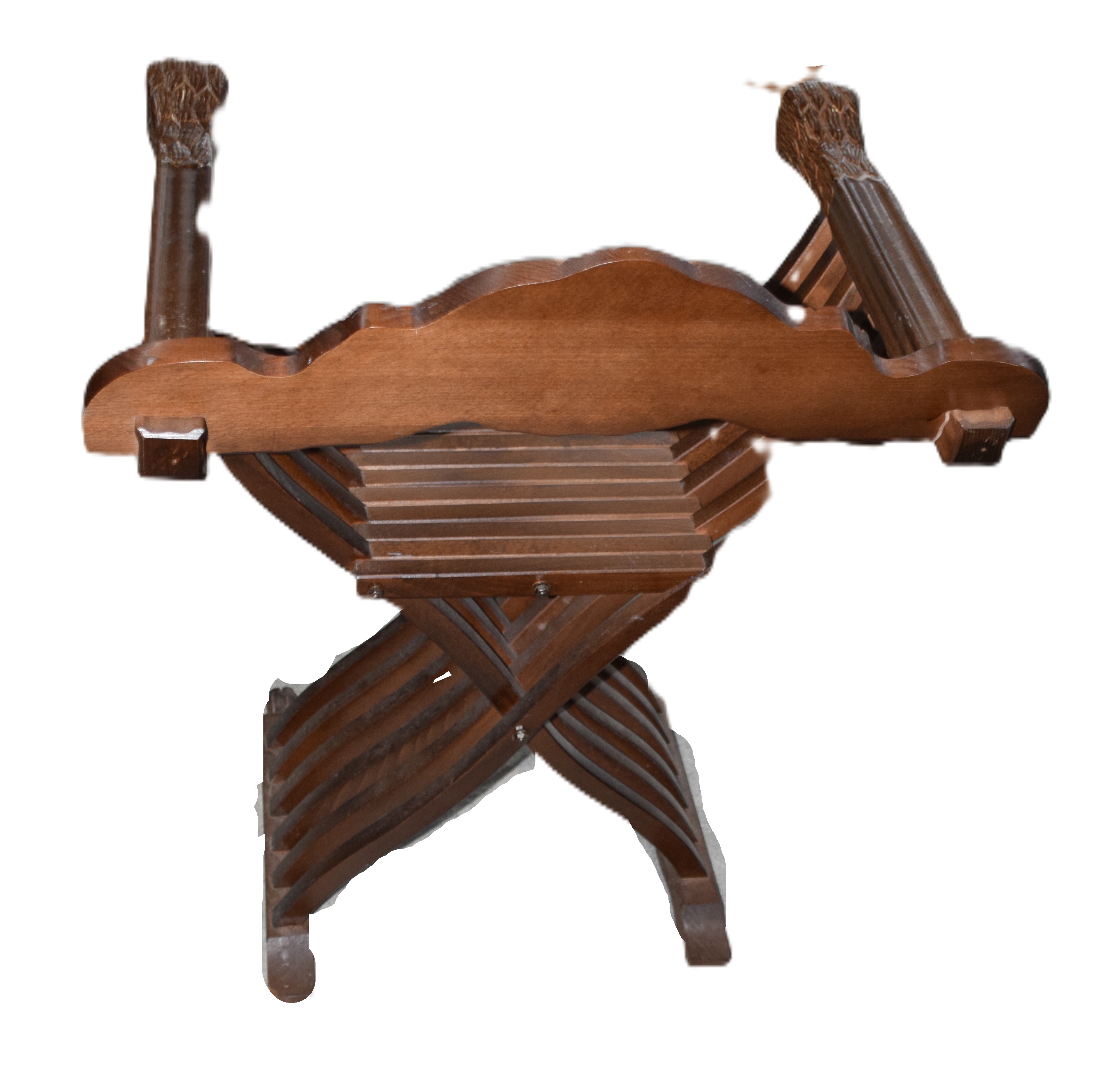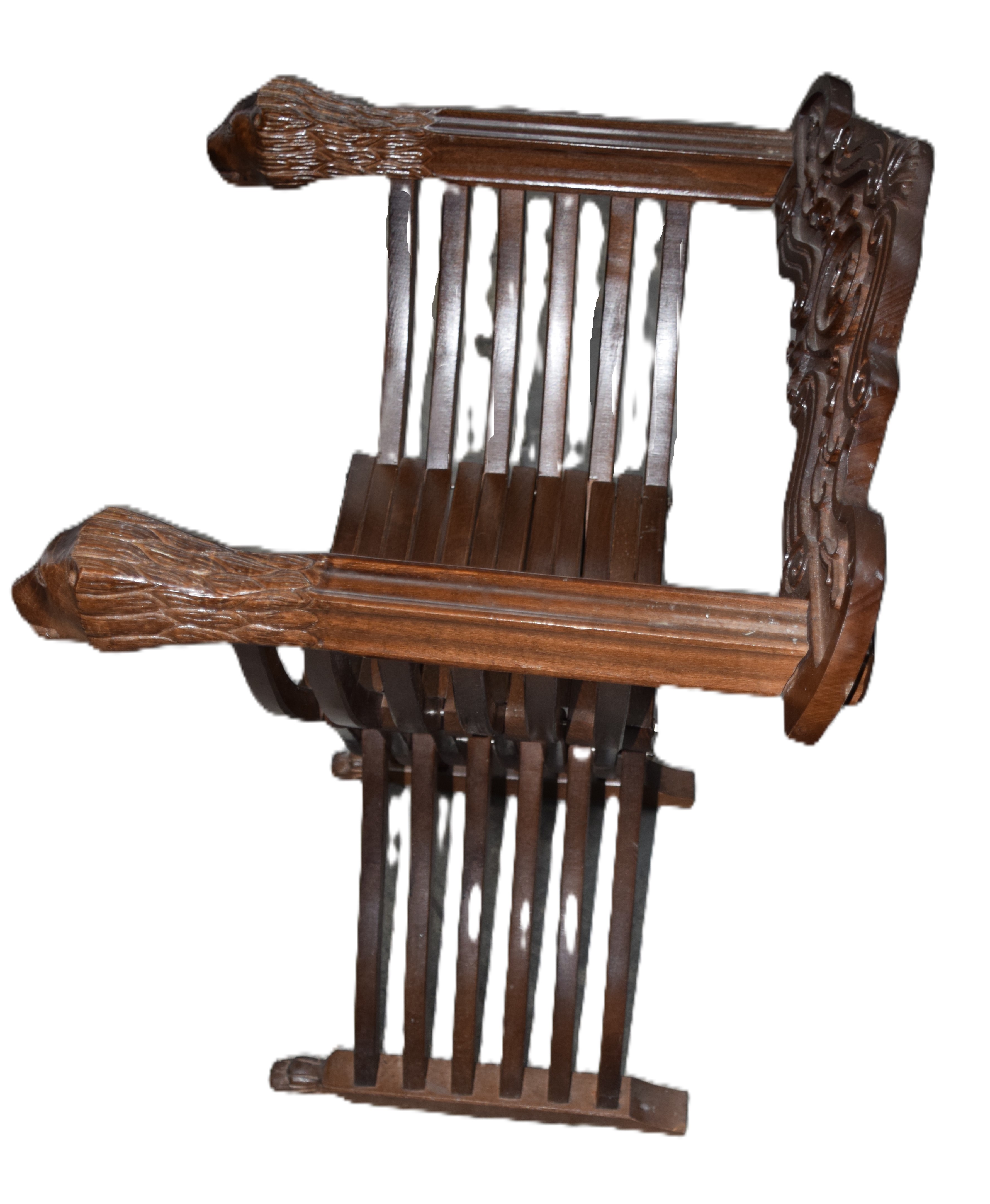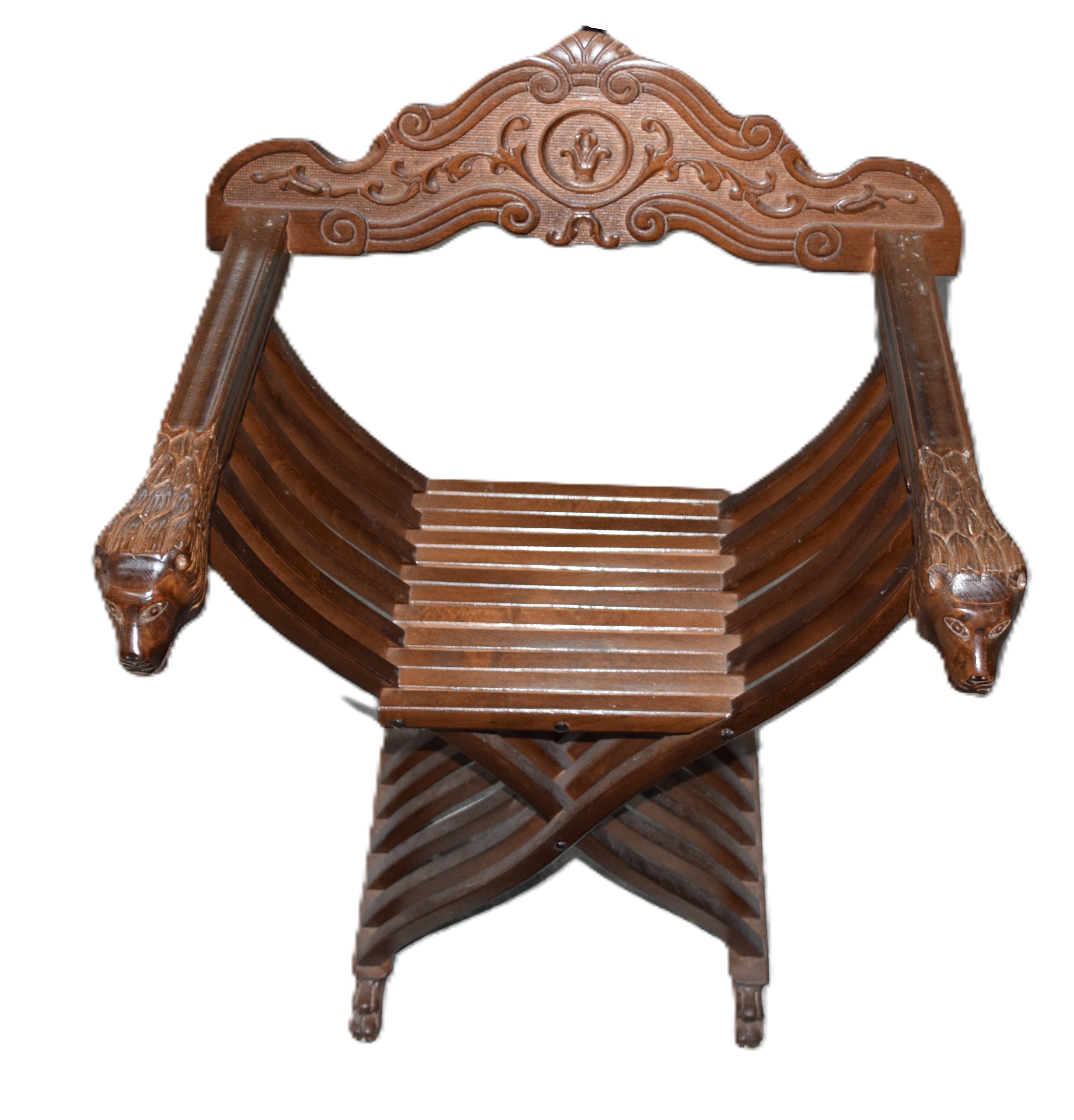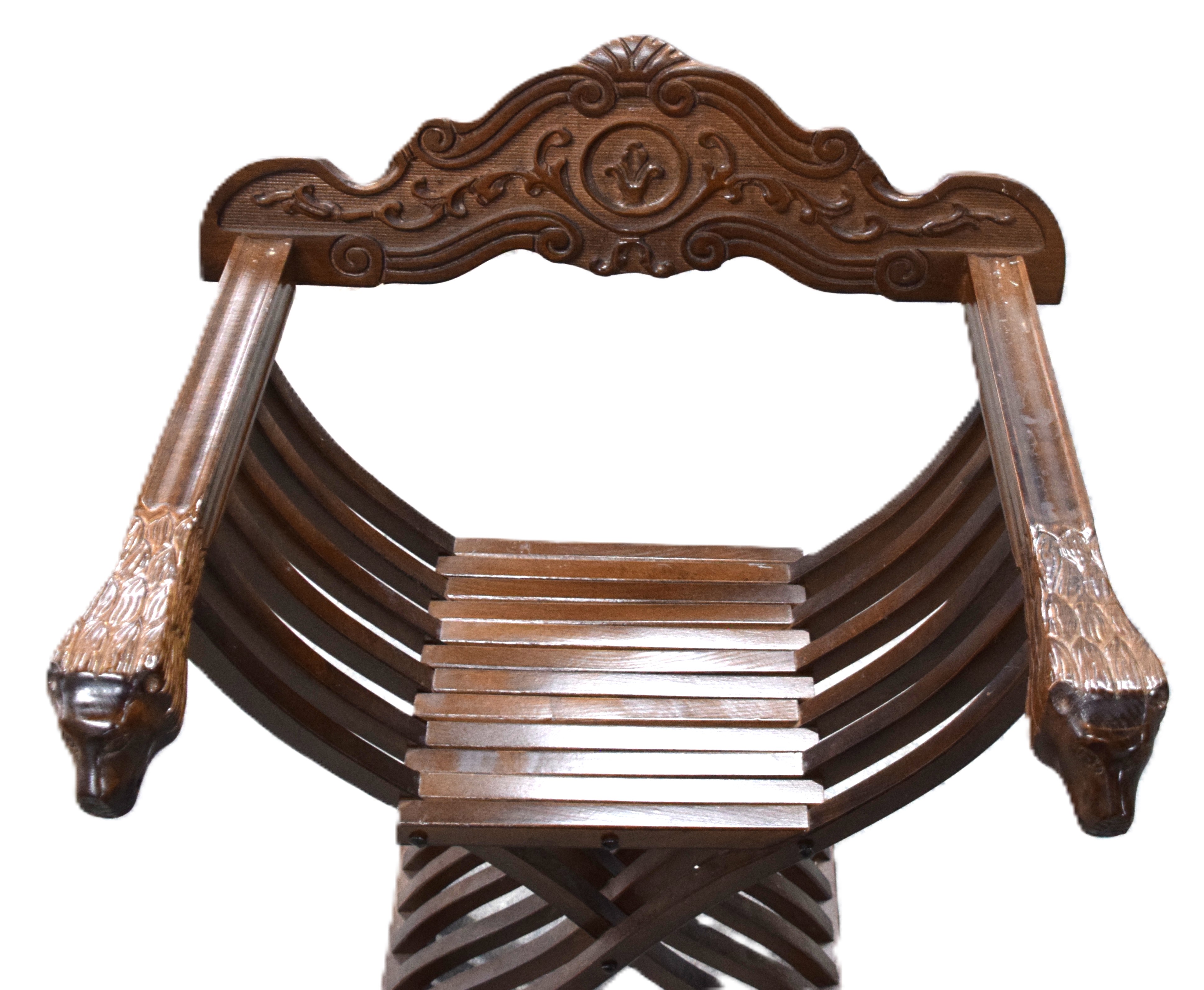 20th Century design hall chair with carved crest and animal head arms. Dimensions: 19″ Seat height, 34″ Overall