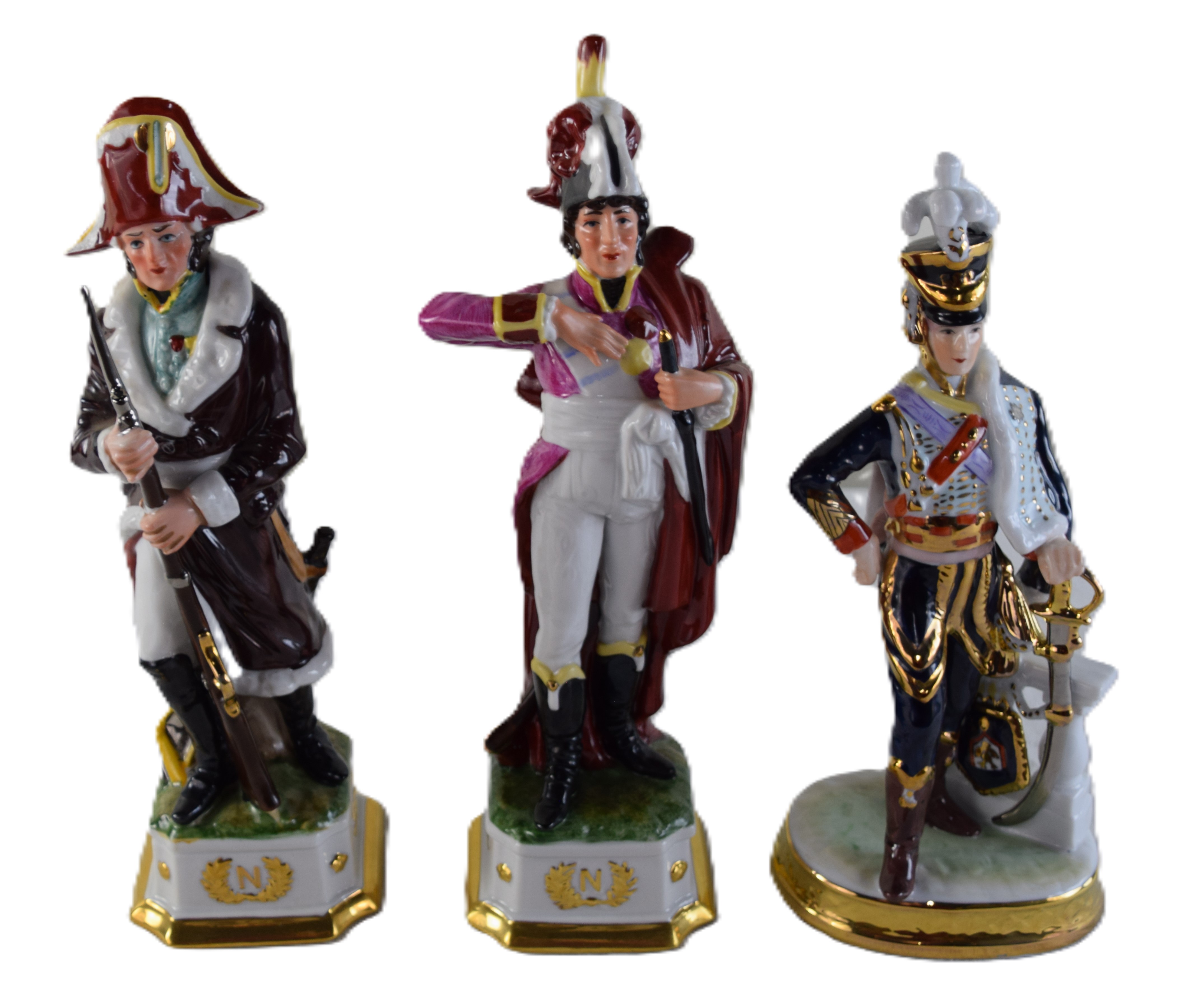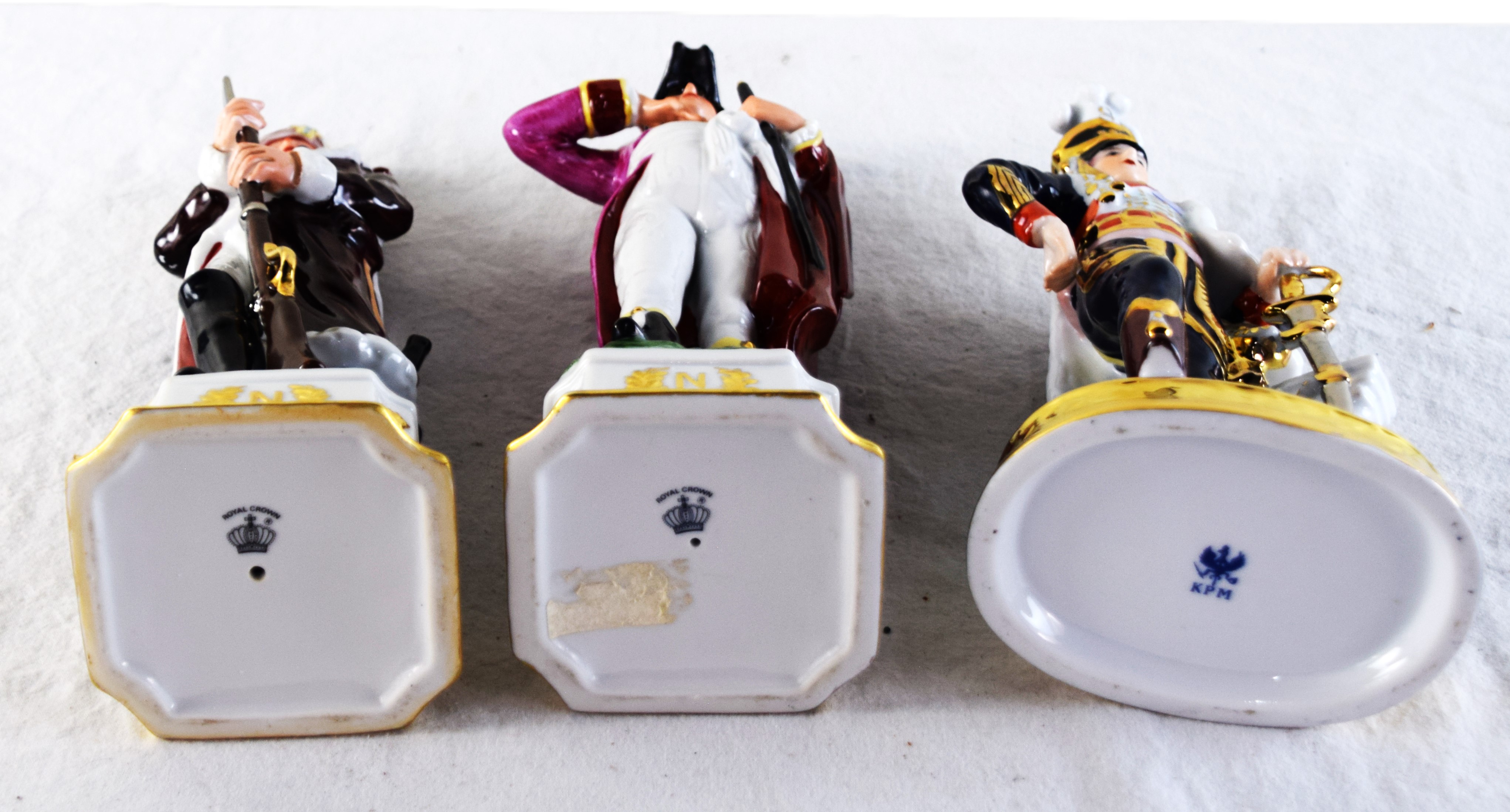 Three Napoleon soldiers-two Royal Crown marked (12″) and one KPM marked (11″), all in great color. Dimensions: