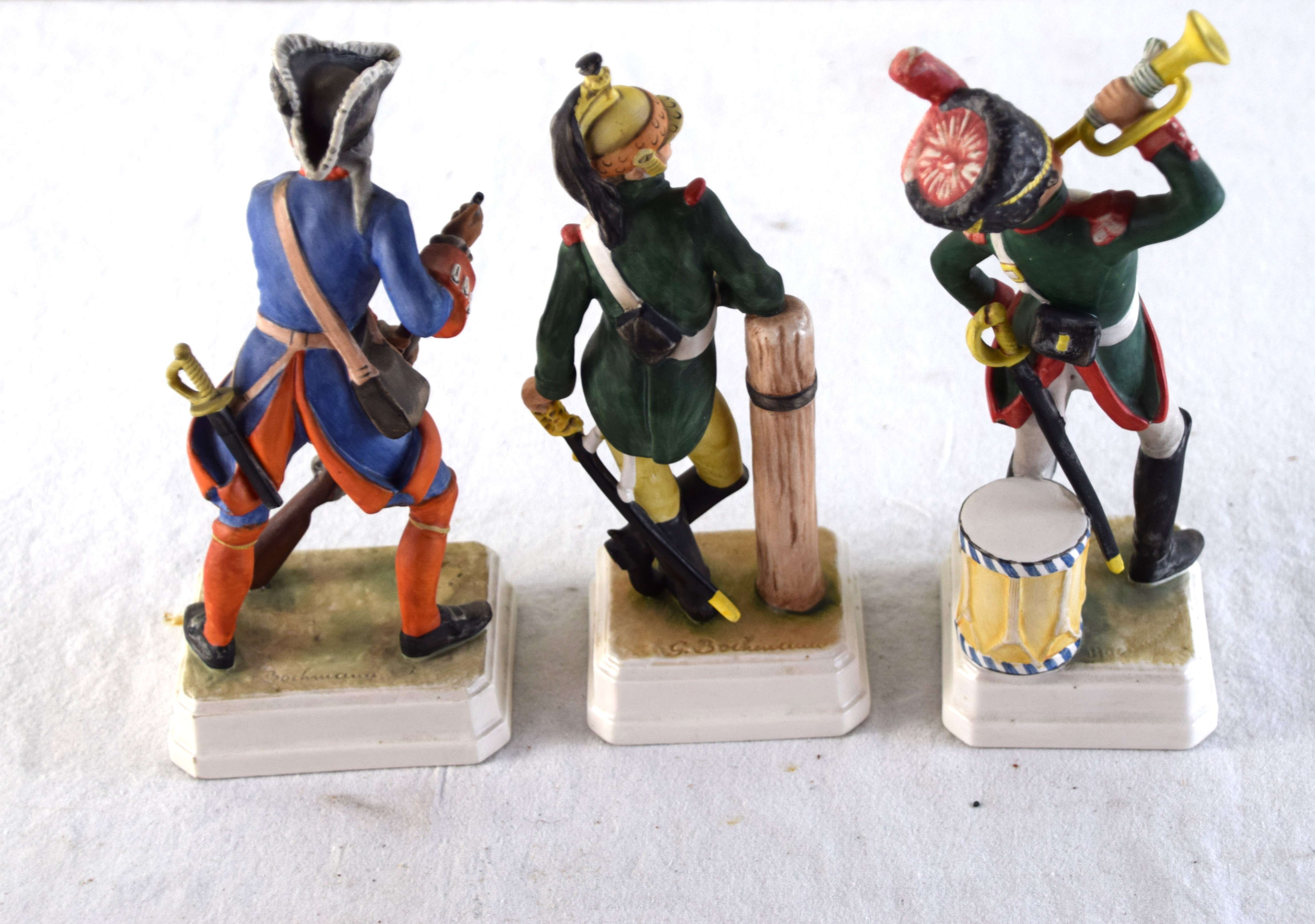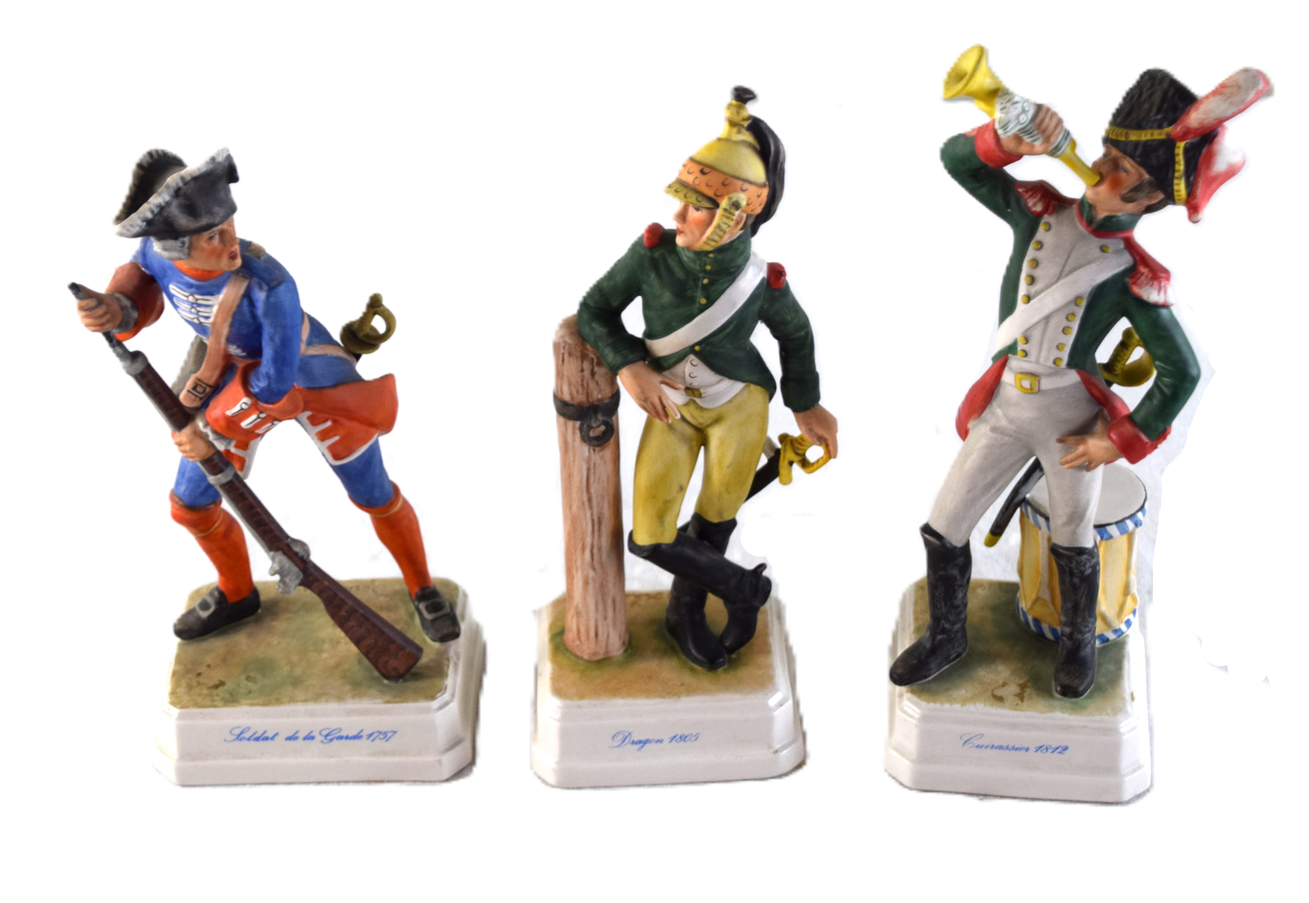 Three French soldiers by W. Goebel, Germany to include Soldat de la Garde 1757, Dragon 1805, and a Cuirassier 1812. Dimensions: 8.5″ H
