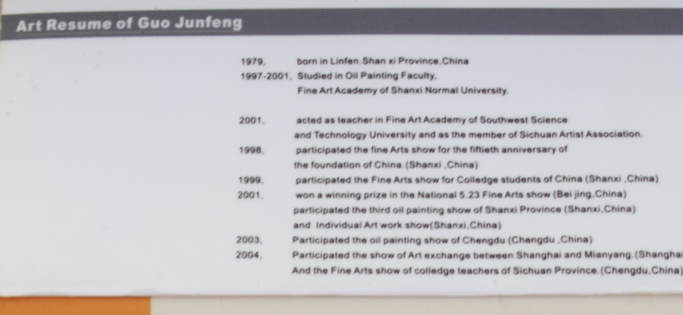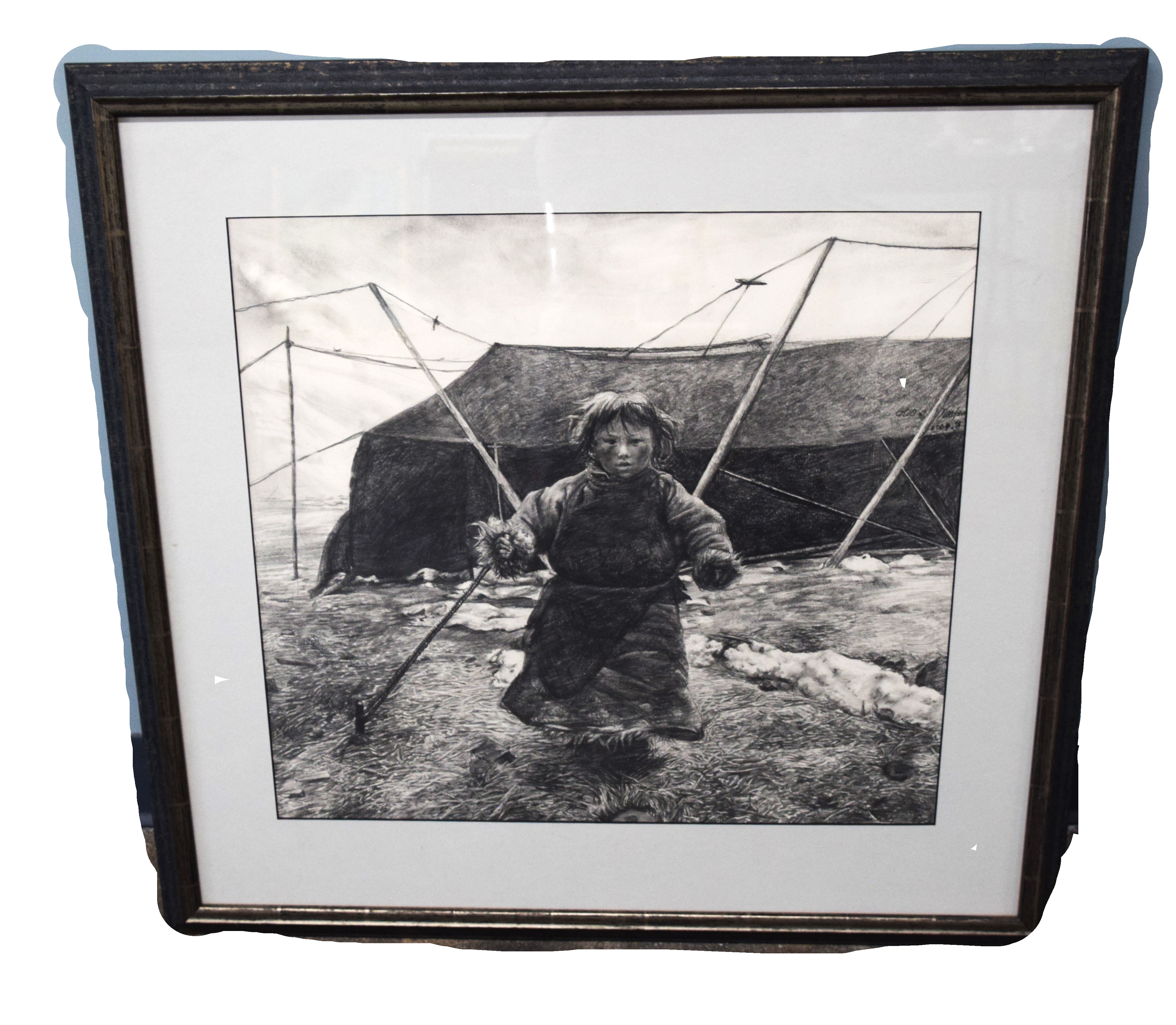 A framed Charcoal painting of Chinese girl by artist Guo Junfeng. Dimensions: 19″ x 20″