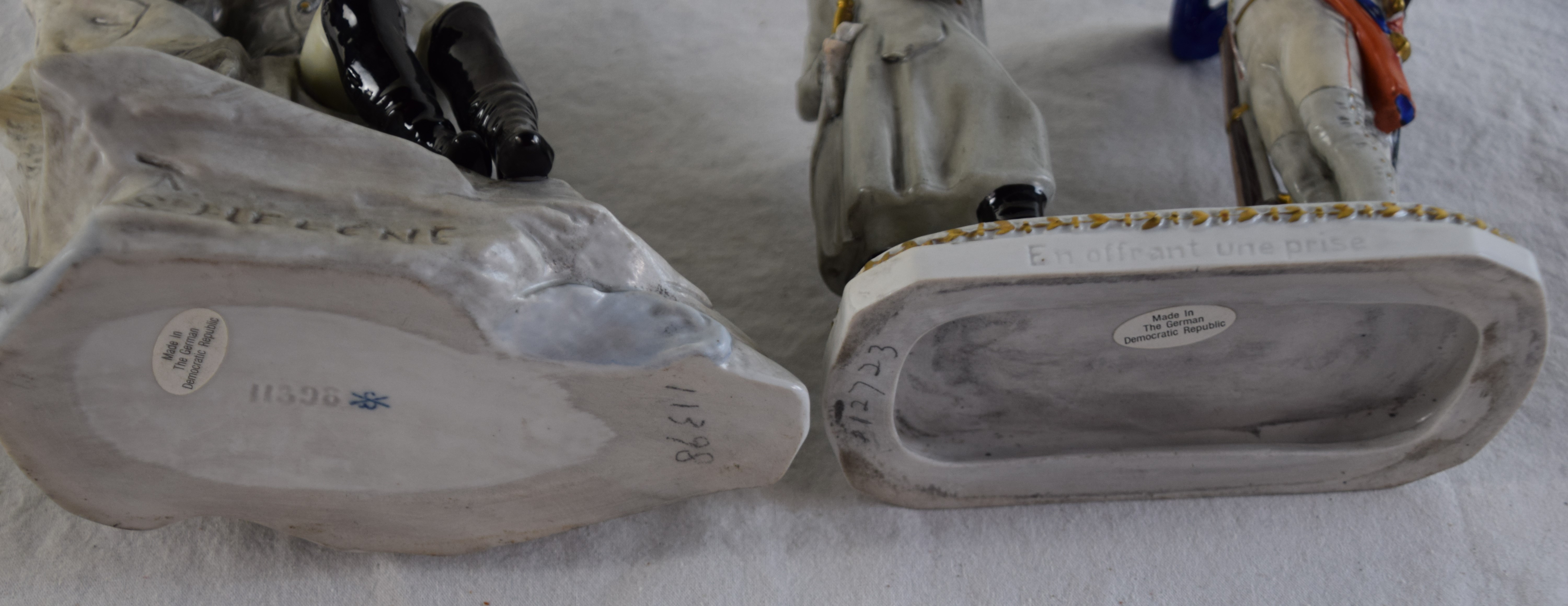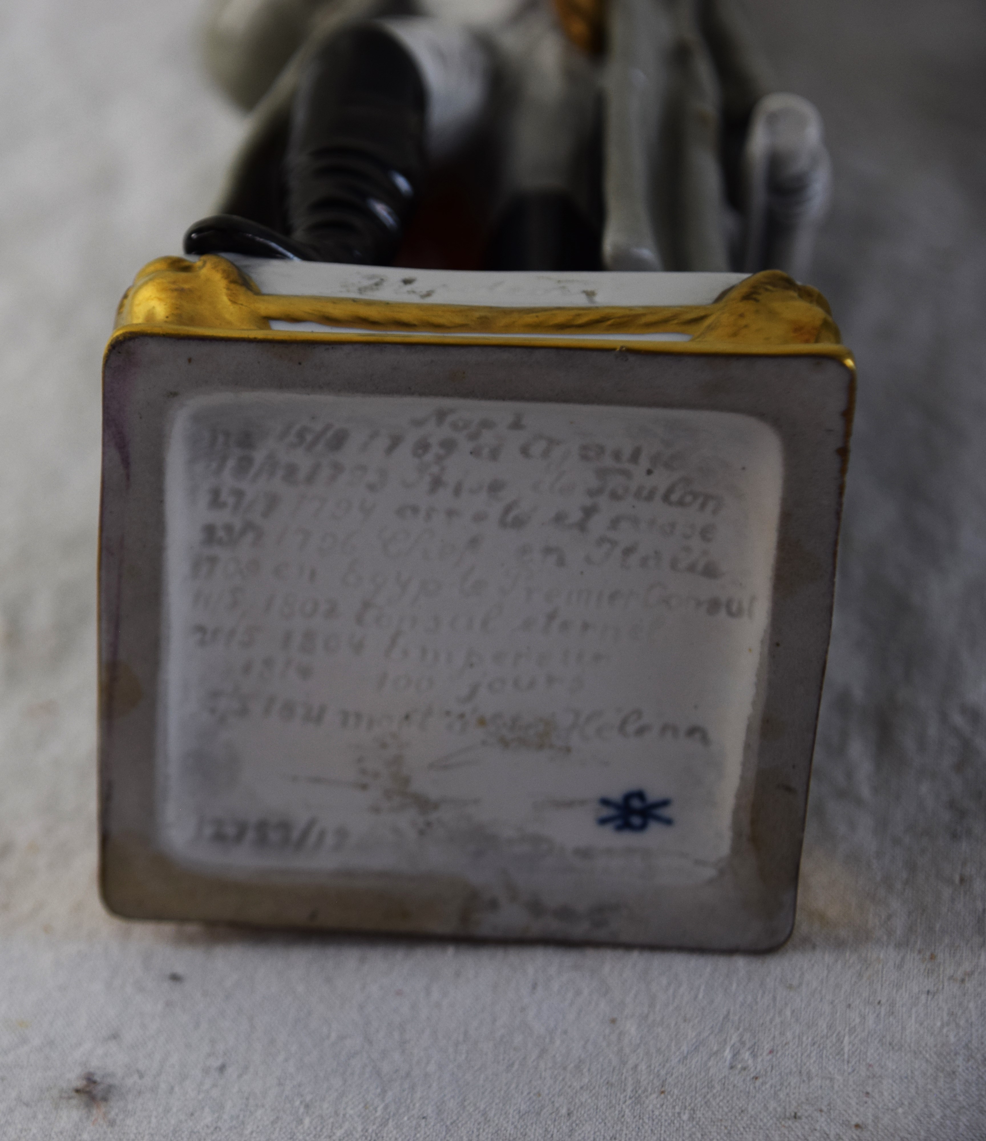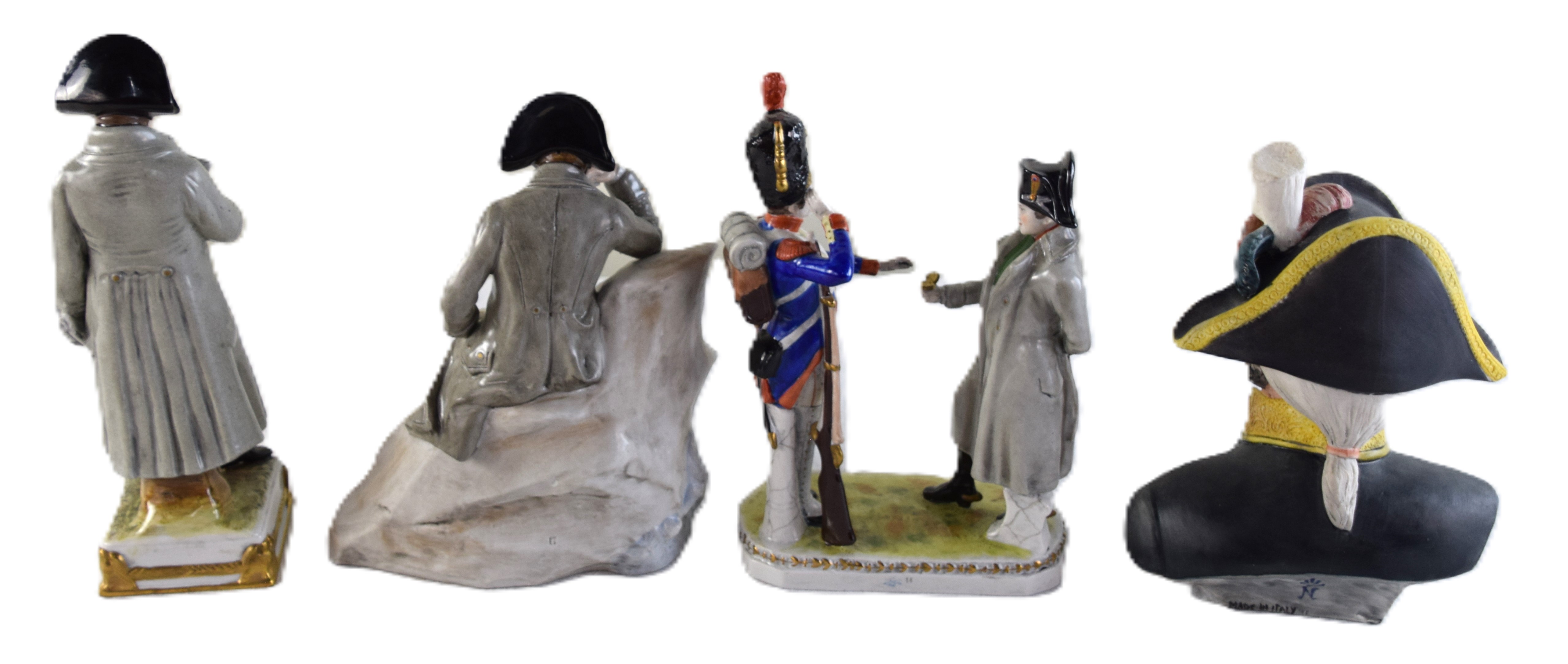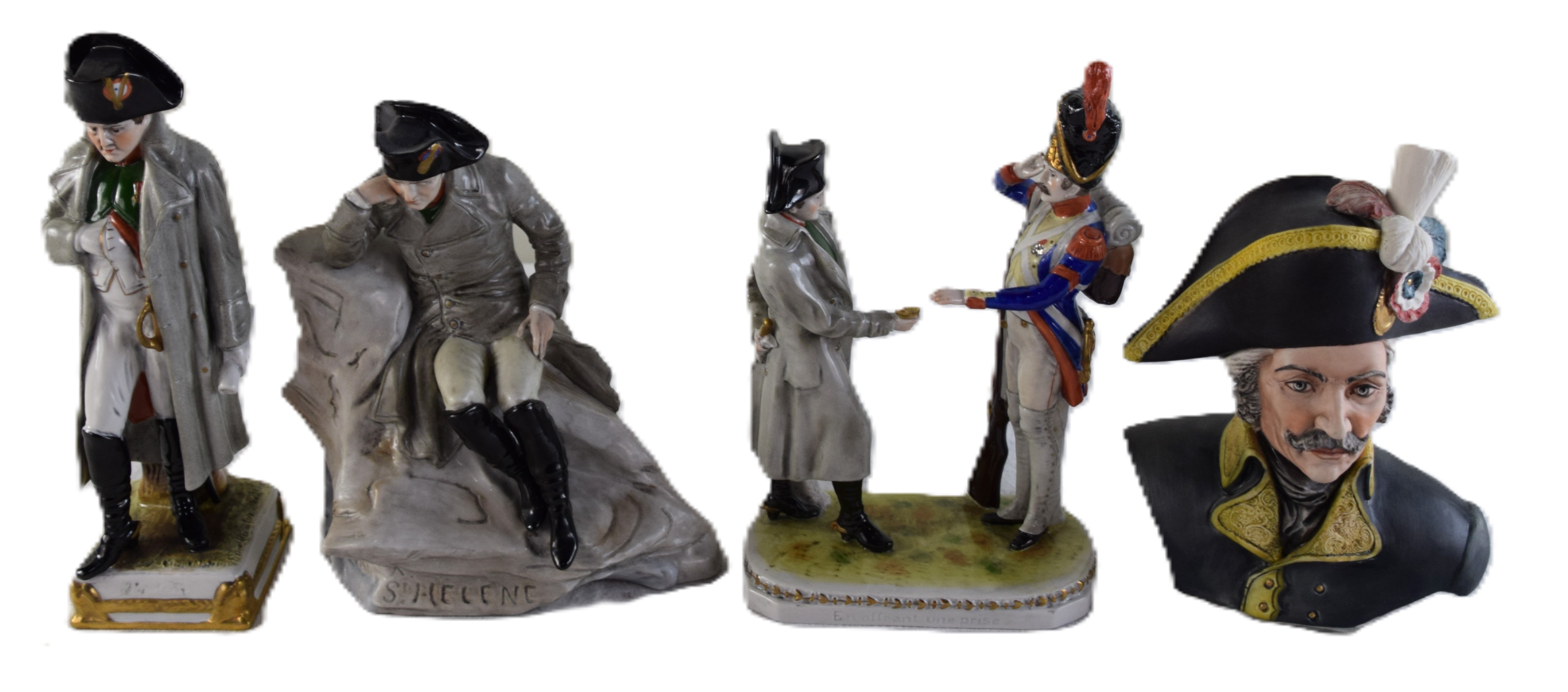 Four porcelain figurines of Napoleon including Napoleon at St. Helen, Napoleon awarding a soldier for valor, Napoleon in a traditional pose, a French nobleman (Italian maker). Dimensions: 8″-9,5″