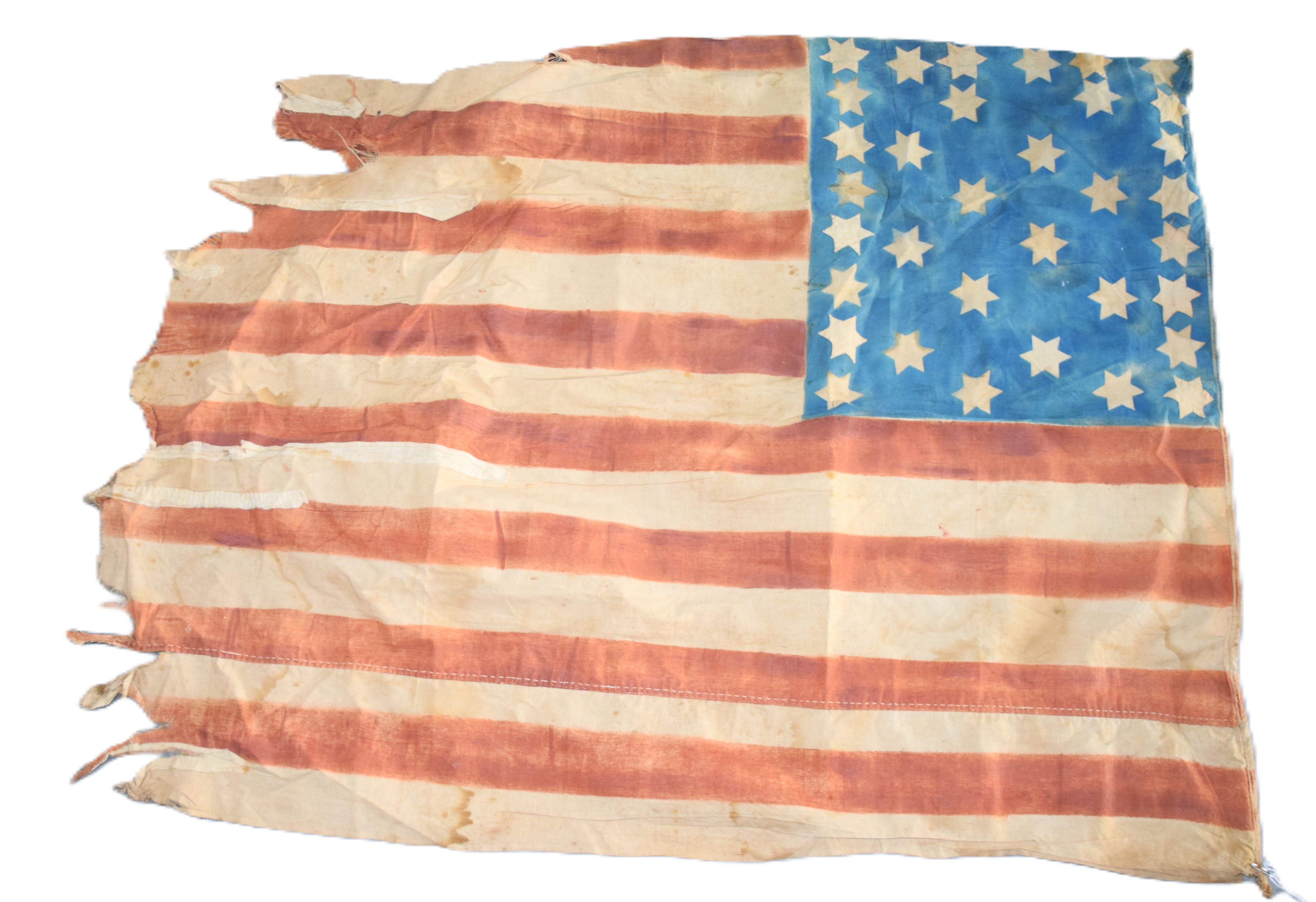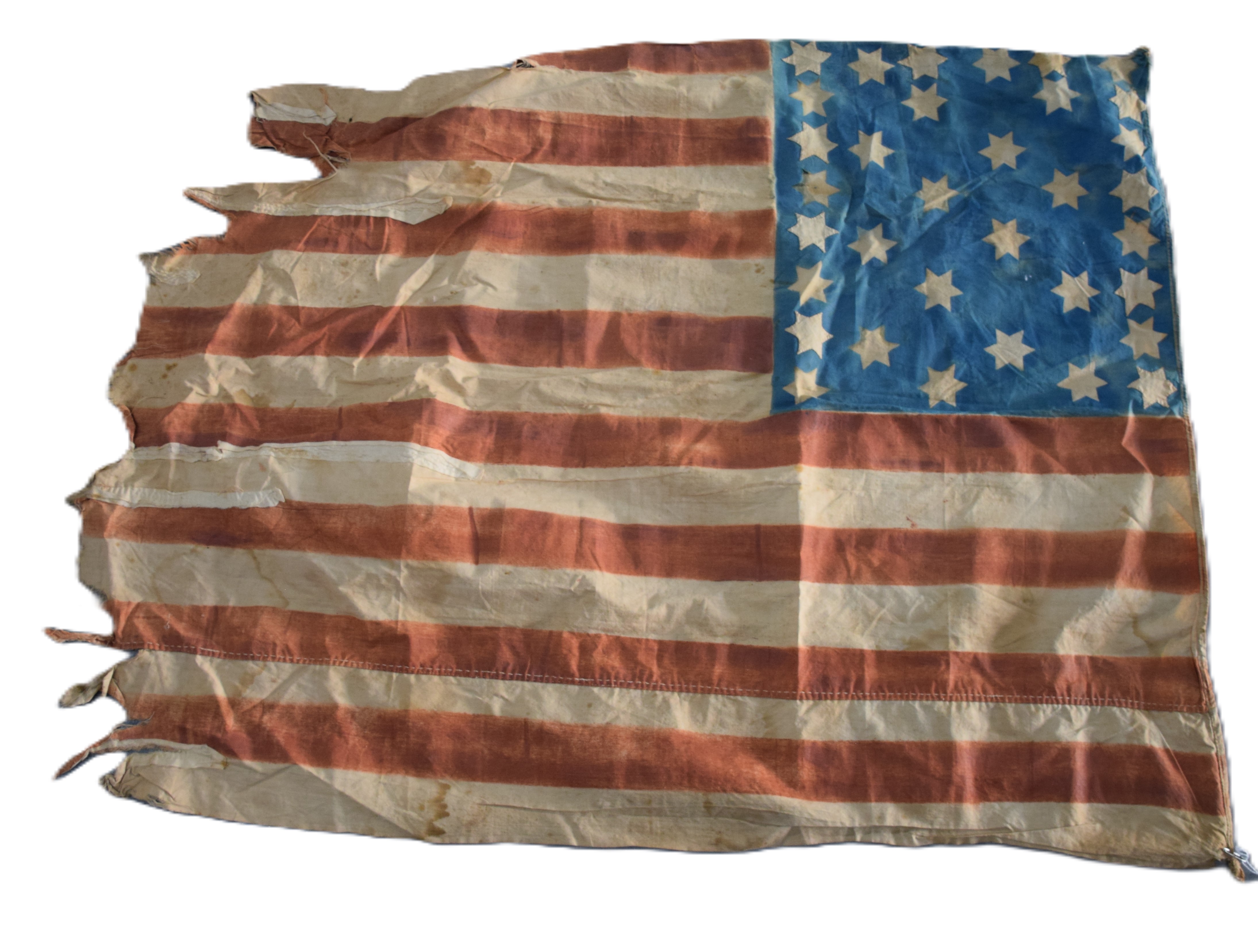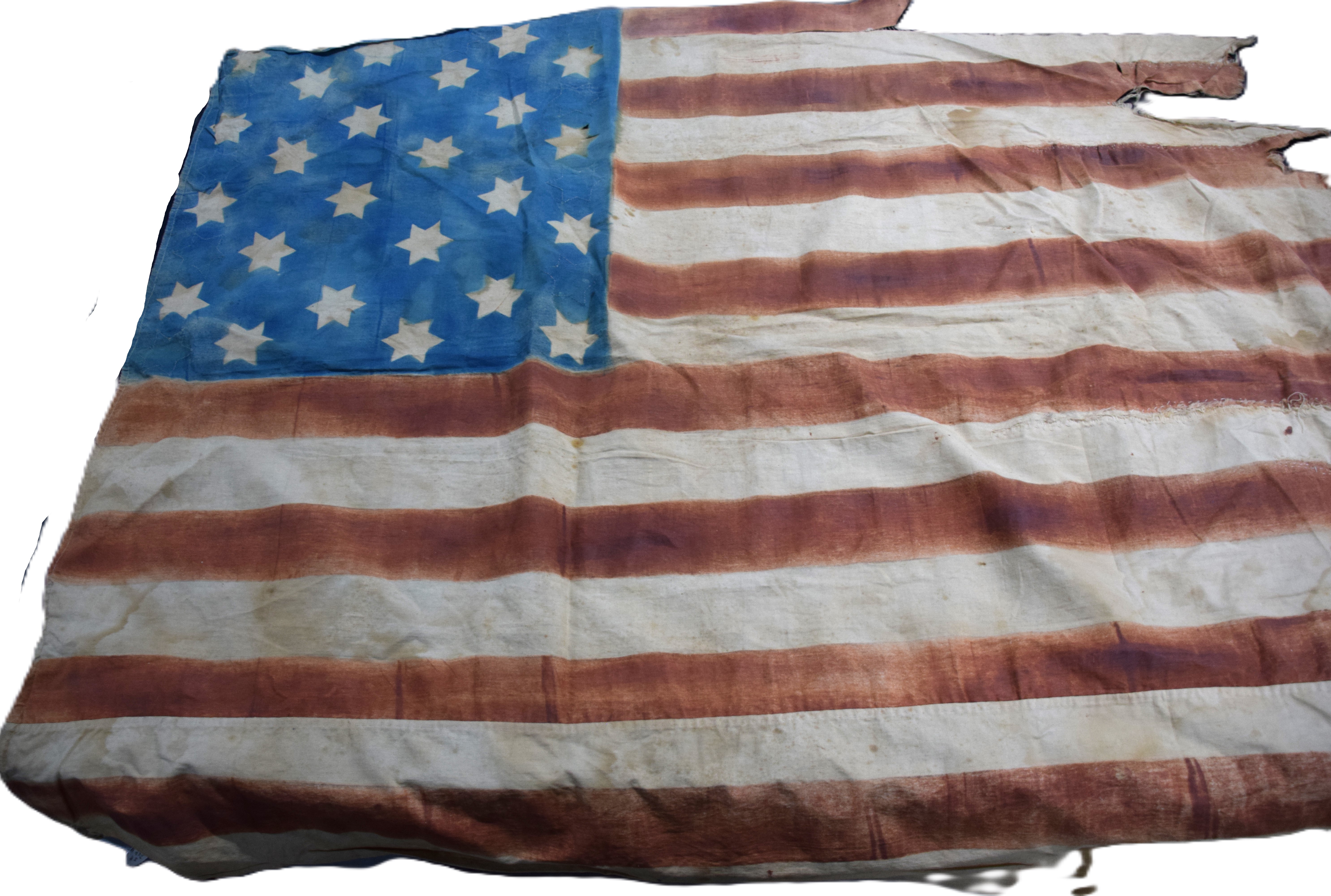 34 Star flag was flown when Kansas was admitted to the Union and between 1861-1863. On the other side is old Glory-the 24 stars representing the states in the Union in 1861. This handmade version of the flag which flew in New Boston at the beginning of the Civil War. Dimensions: 32″ H x 42″L