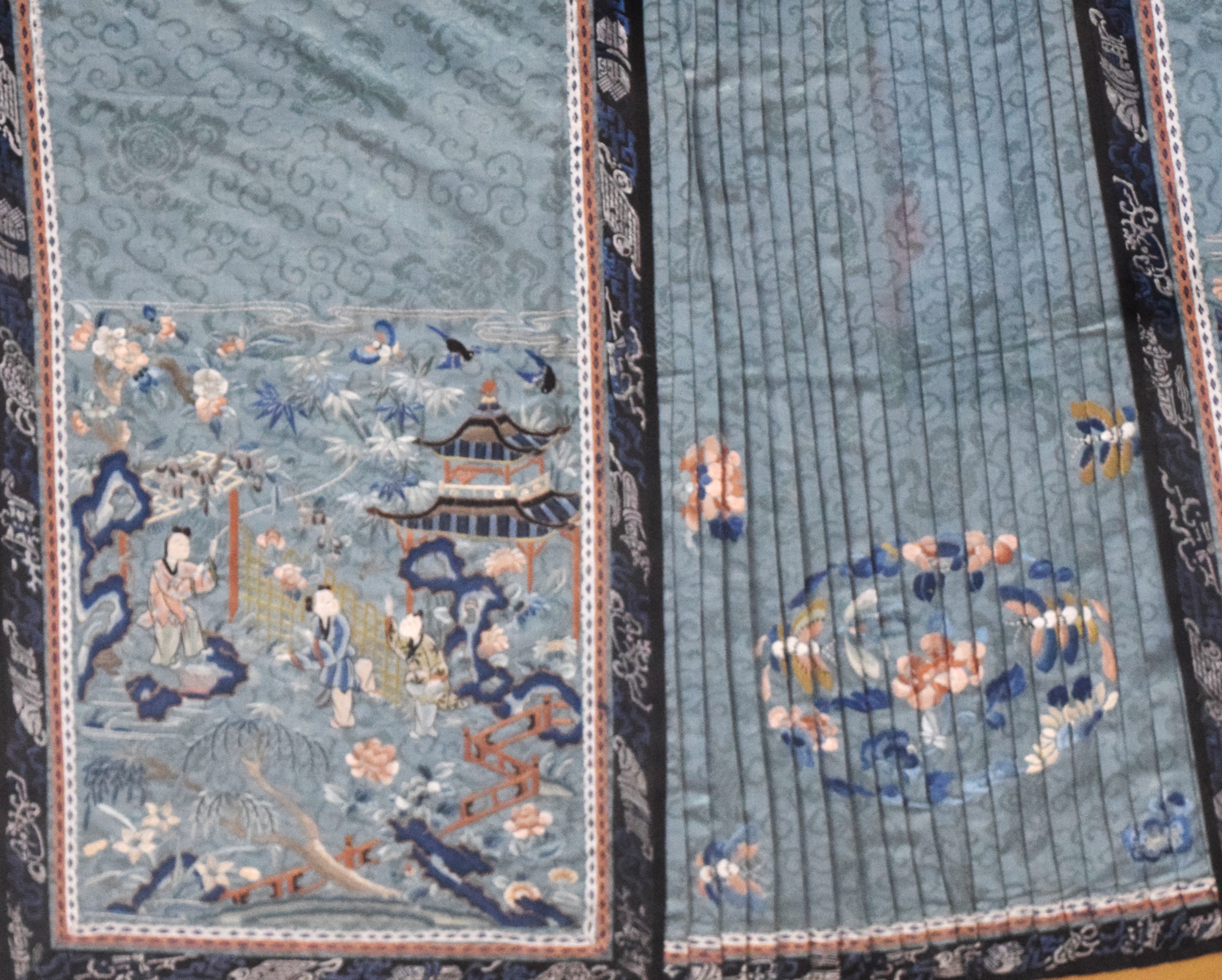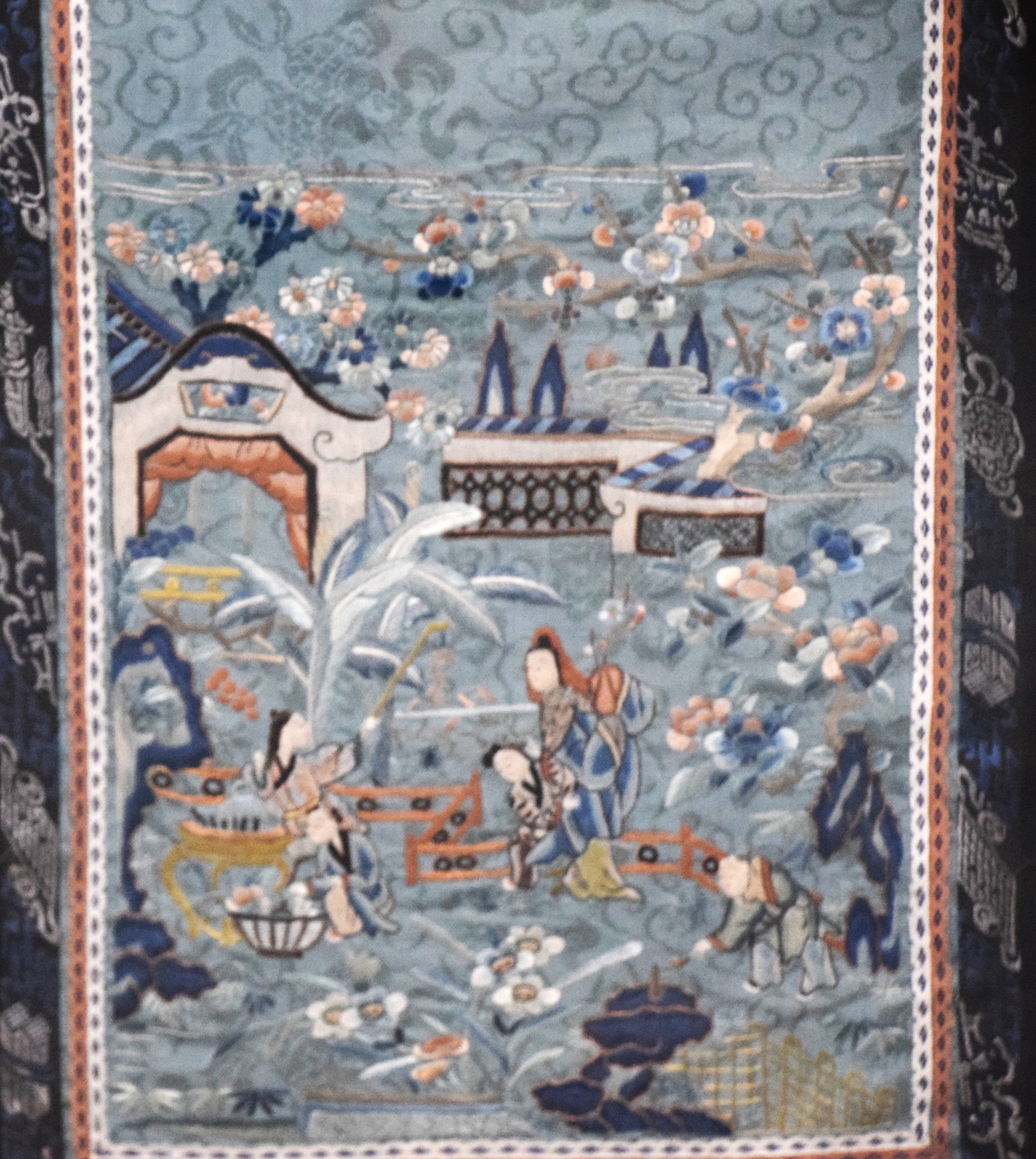 A framed Japanese warrior skirt with intricate designs on a green field. Dimensions: 38″ x 60″