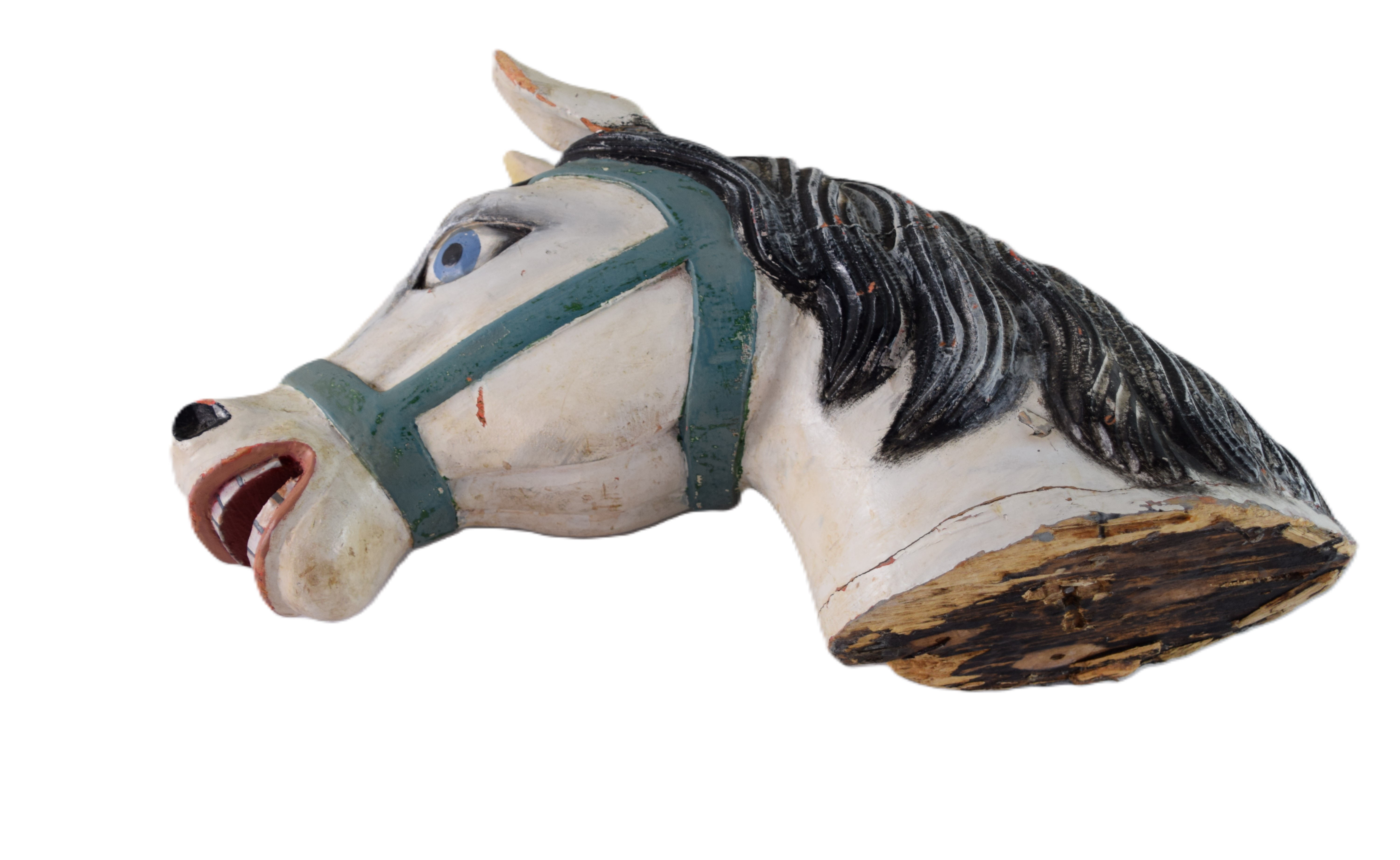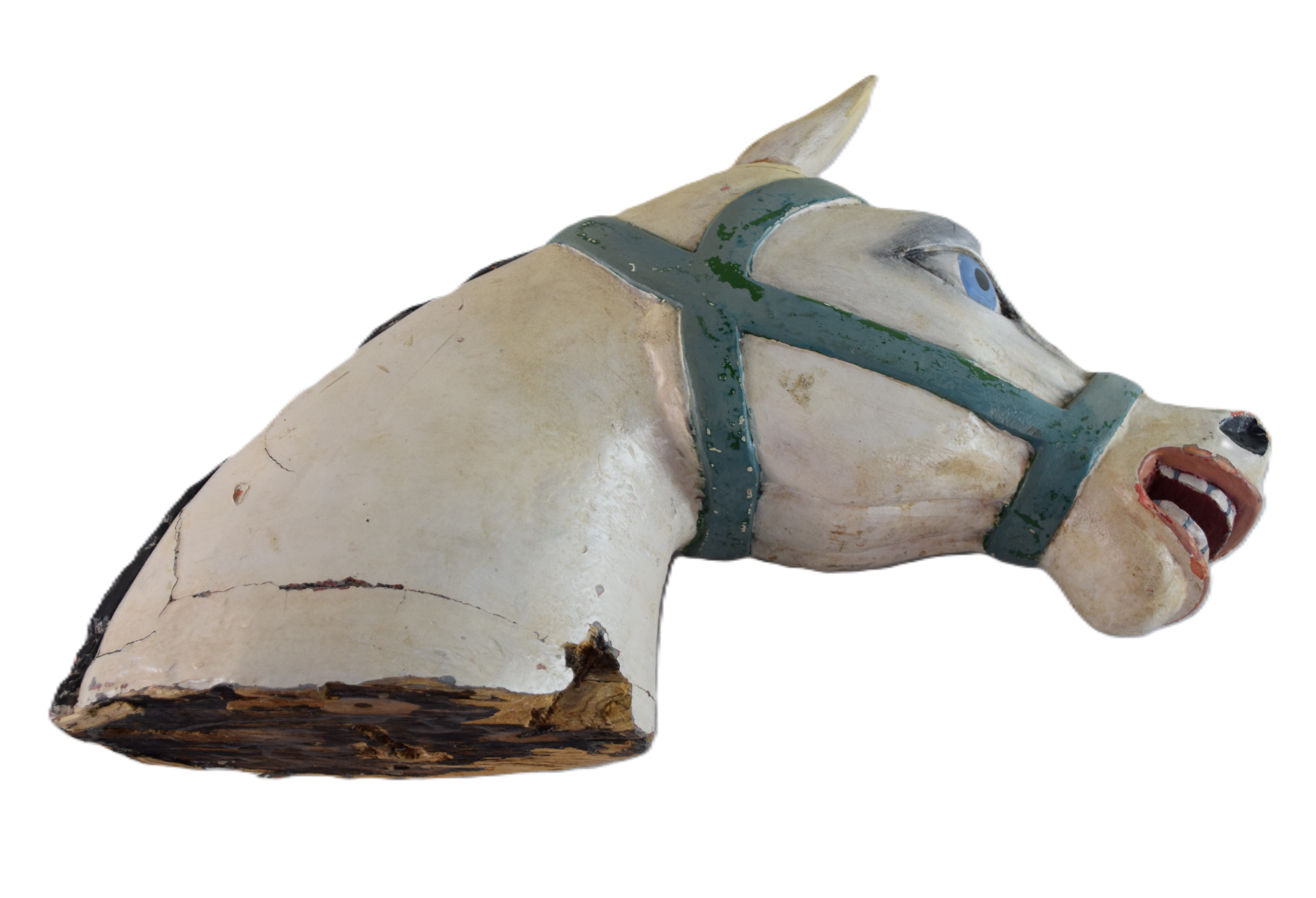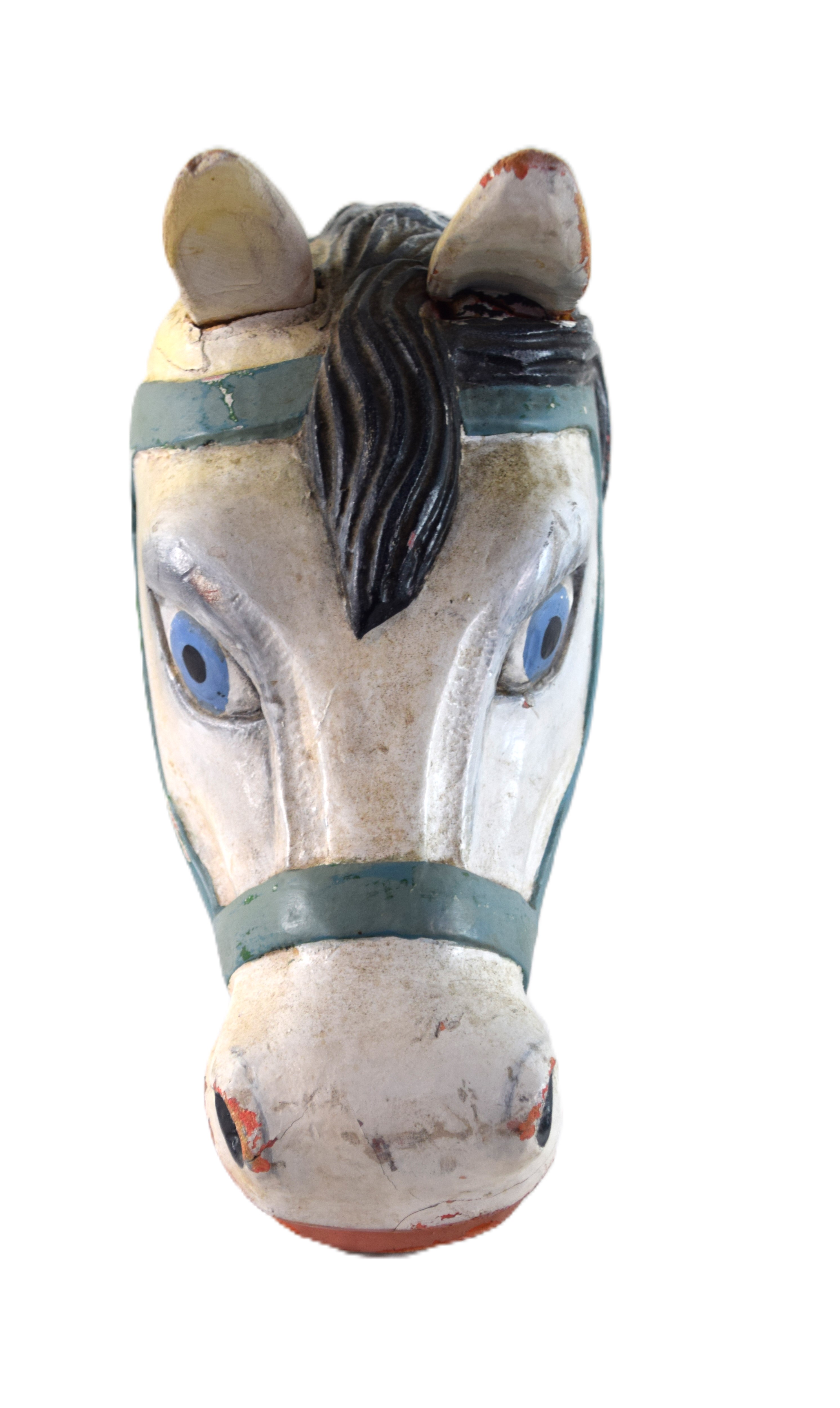 Carousel Horse Head, white with blue eyes. Dimensions: 20″ L