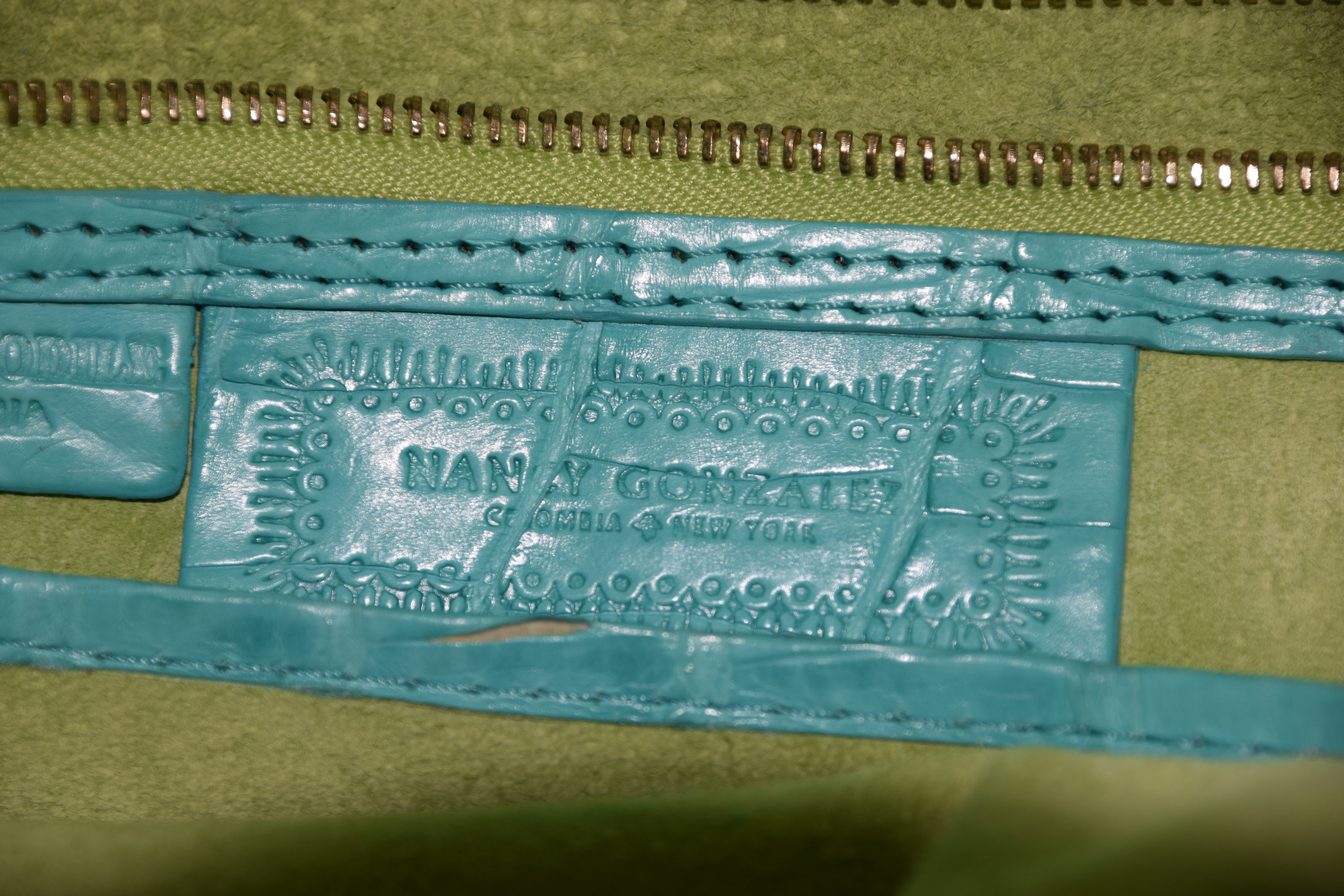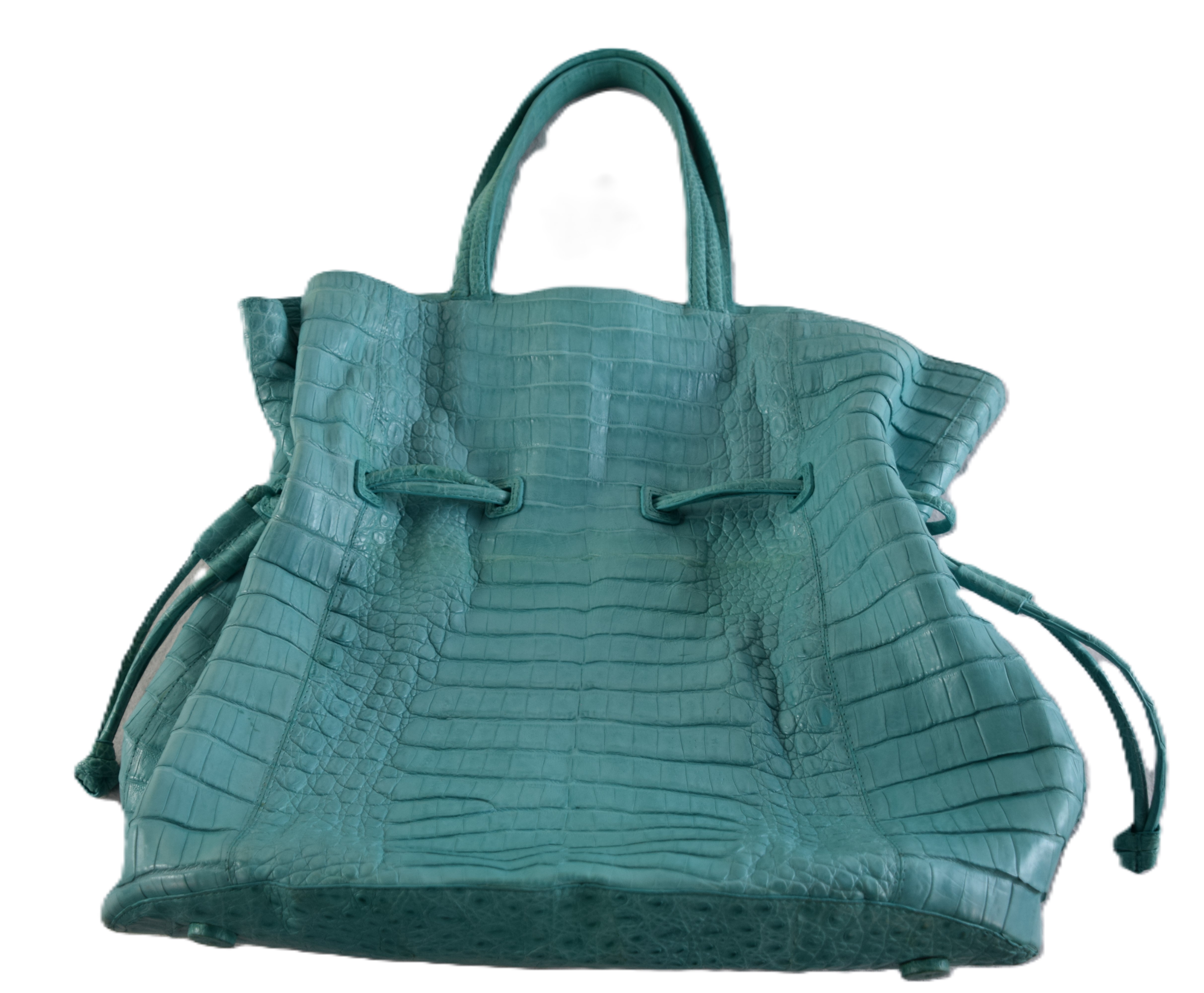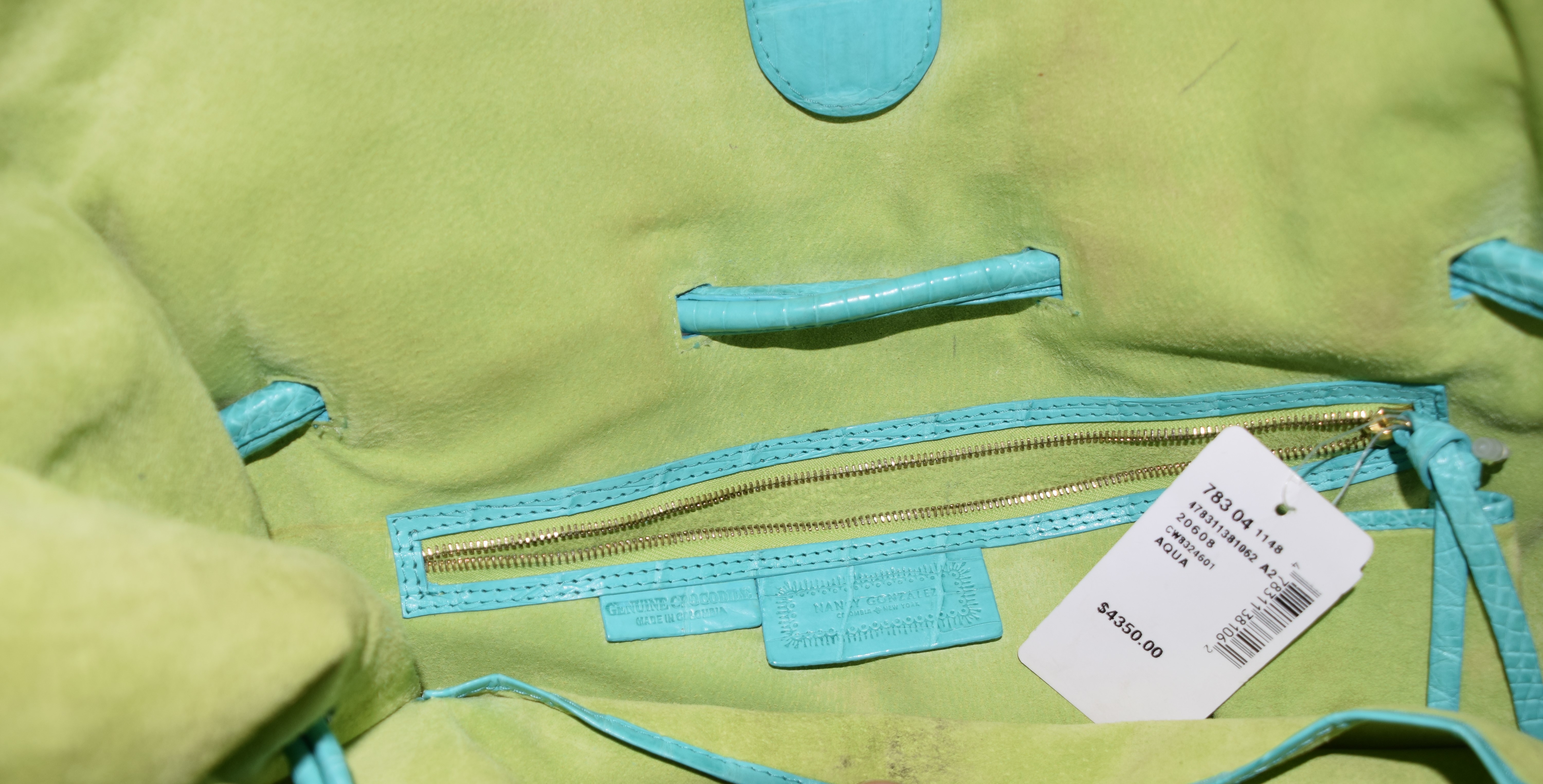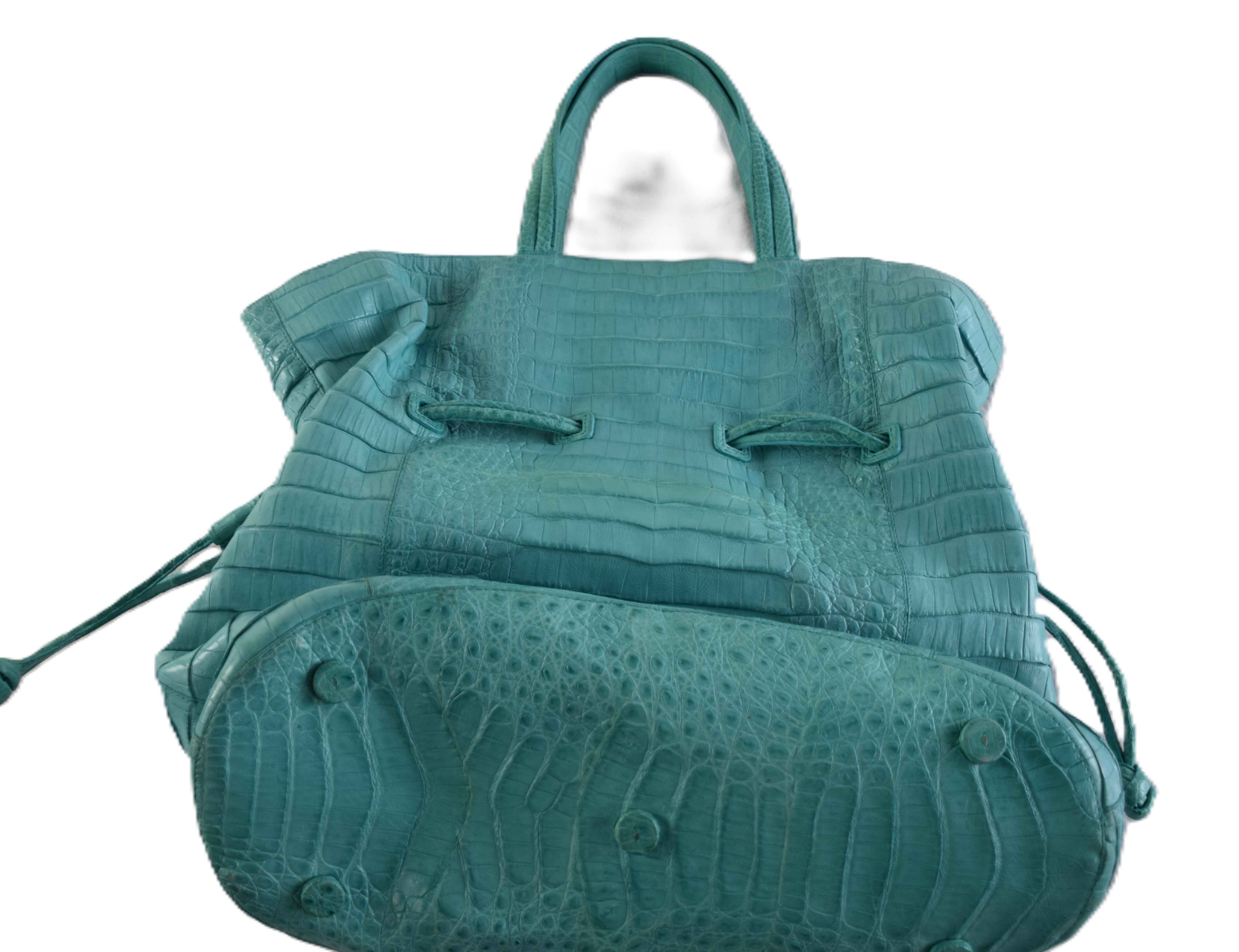 Nancy Gonzalez Crocodile aqua large handbag. Retail price tag attached to bag at $4,350. Provenance: Estate of Maria Caruso of Nashua, NH. Dimensions: 14″ 14″ excluding handles