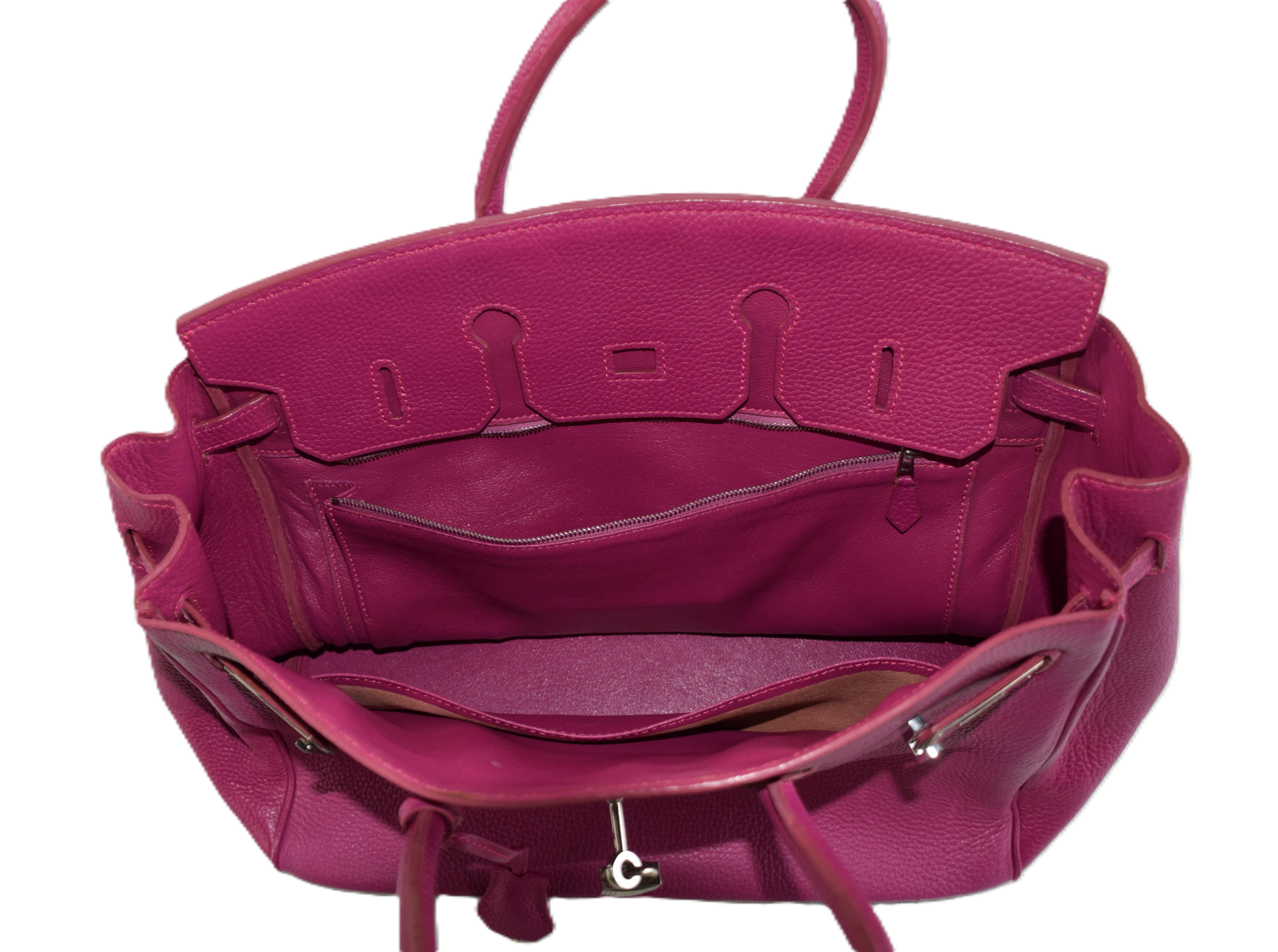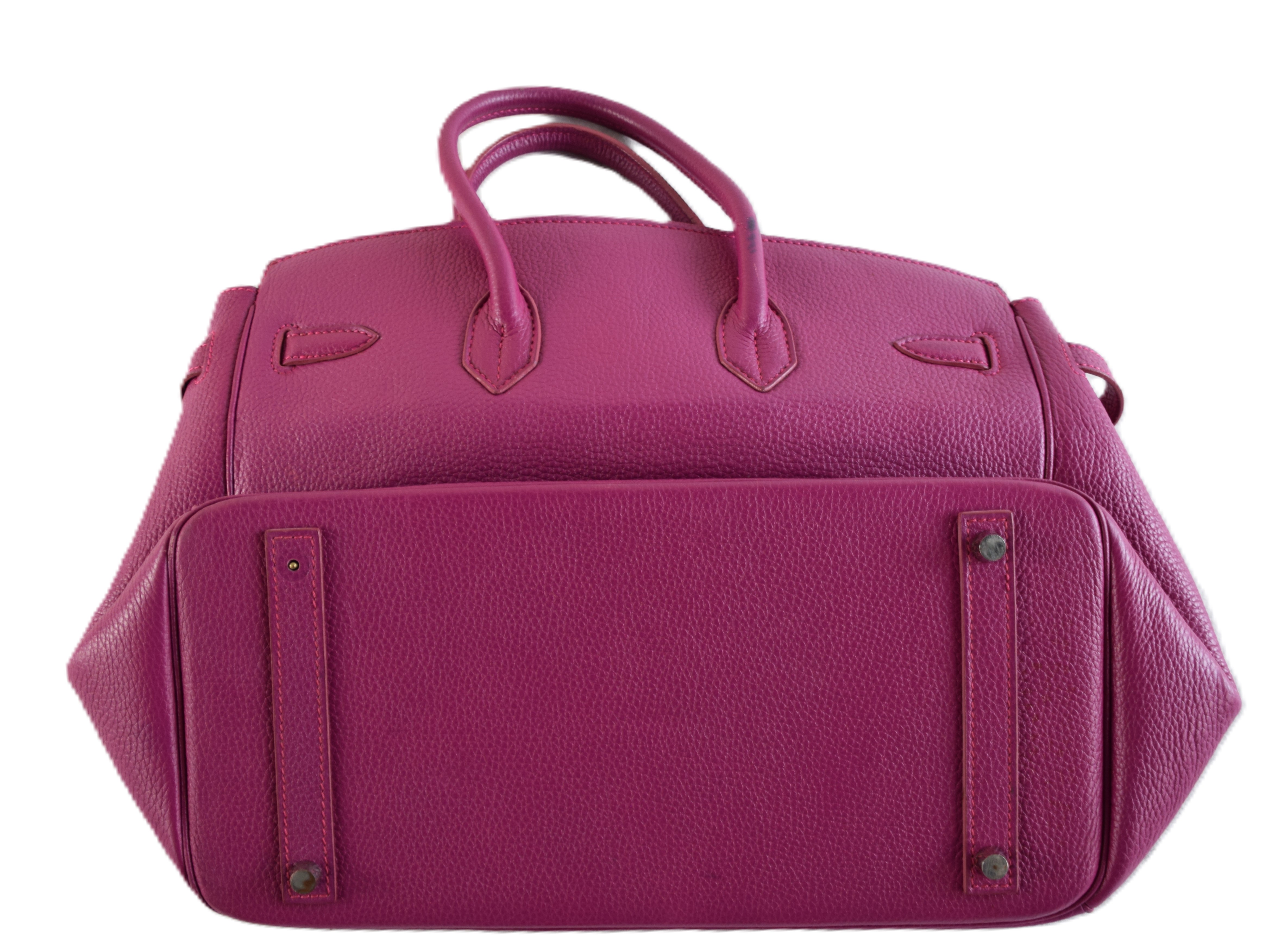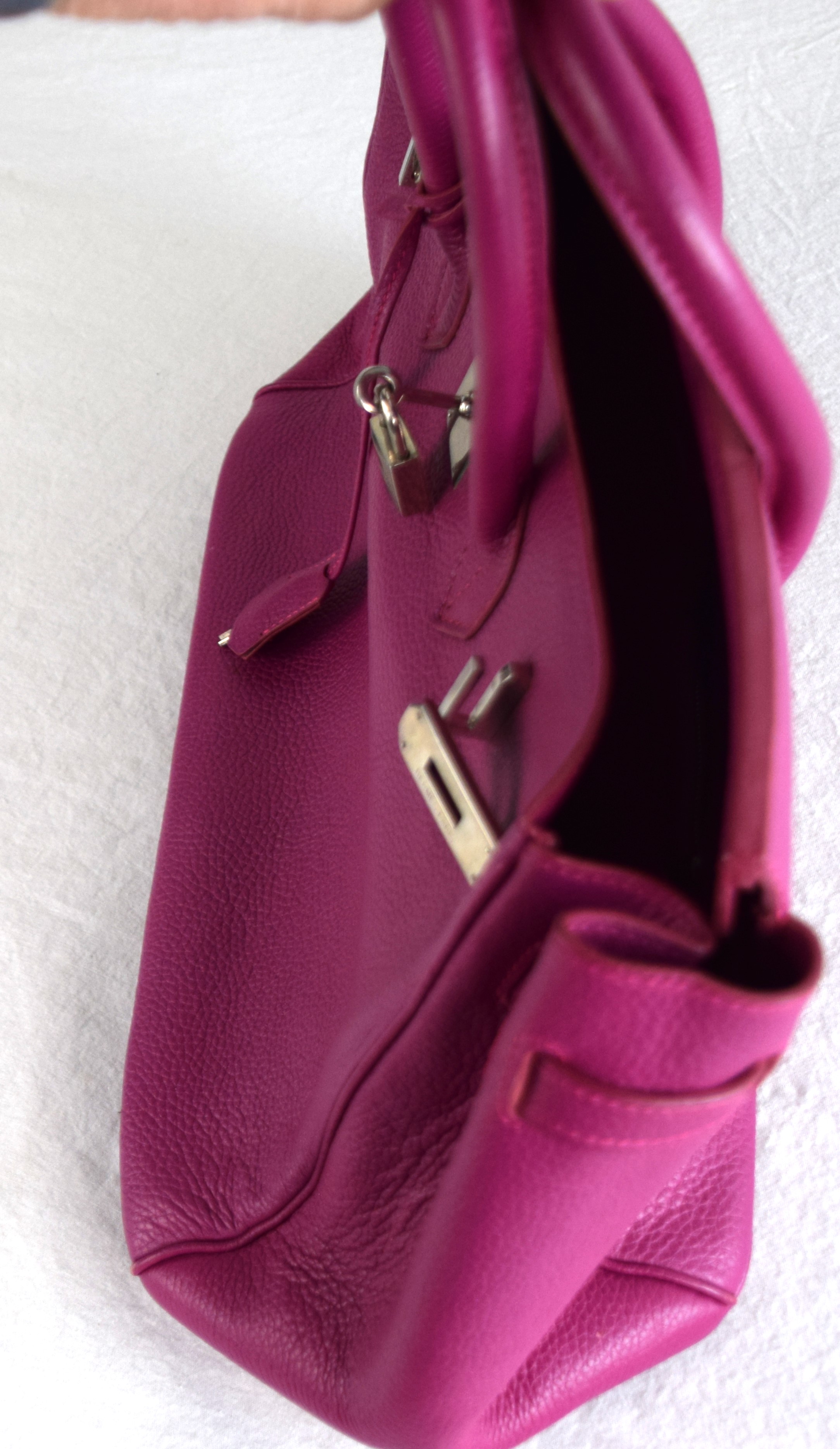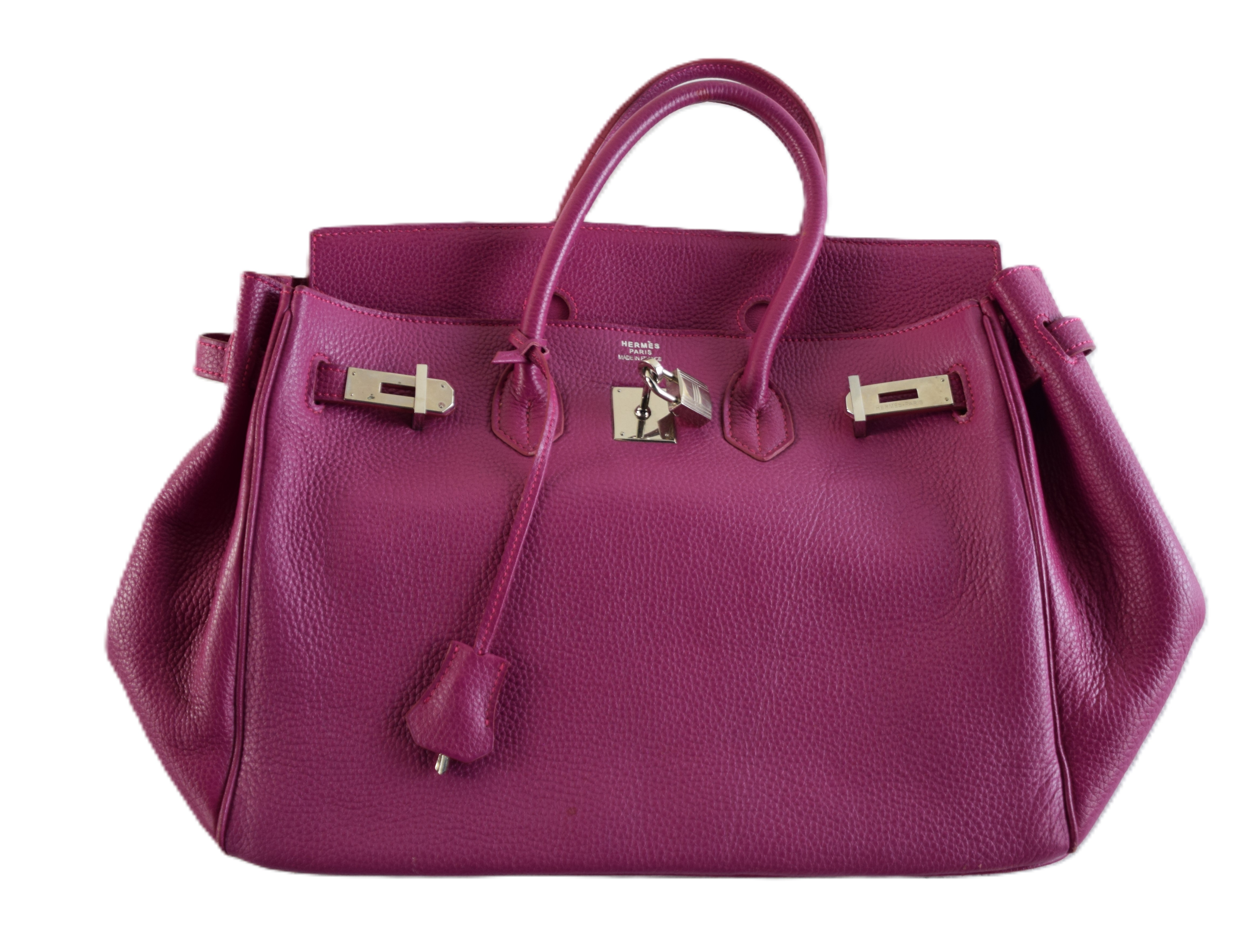 Hermes Birkin 25 plum handbag with lock and key. Because of concerns from bidders, we had a Hermes expert examine the bag and found it to be a copy, missing heat stamps and hand sewn stitching. If you desire the bag, please contact us after the auction.