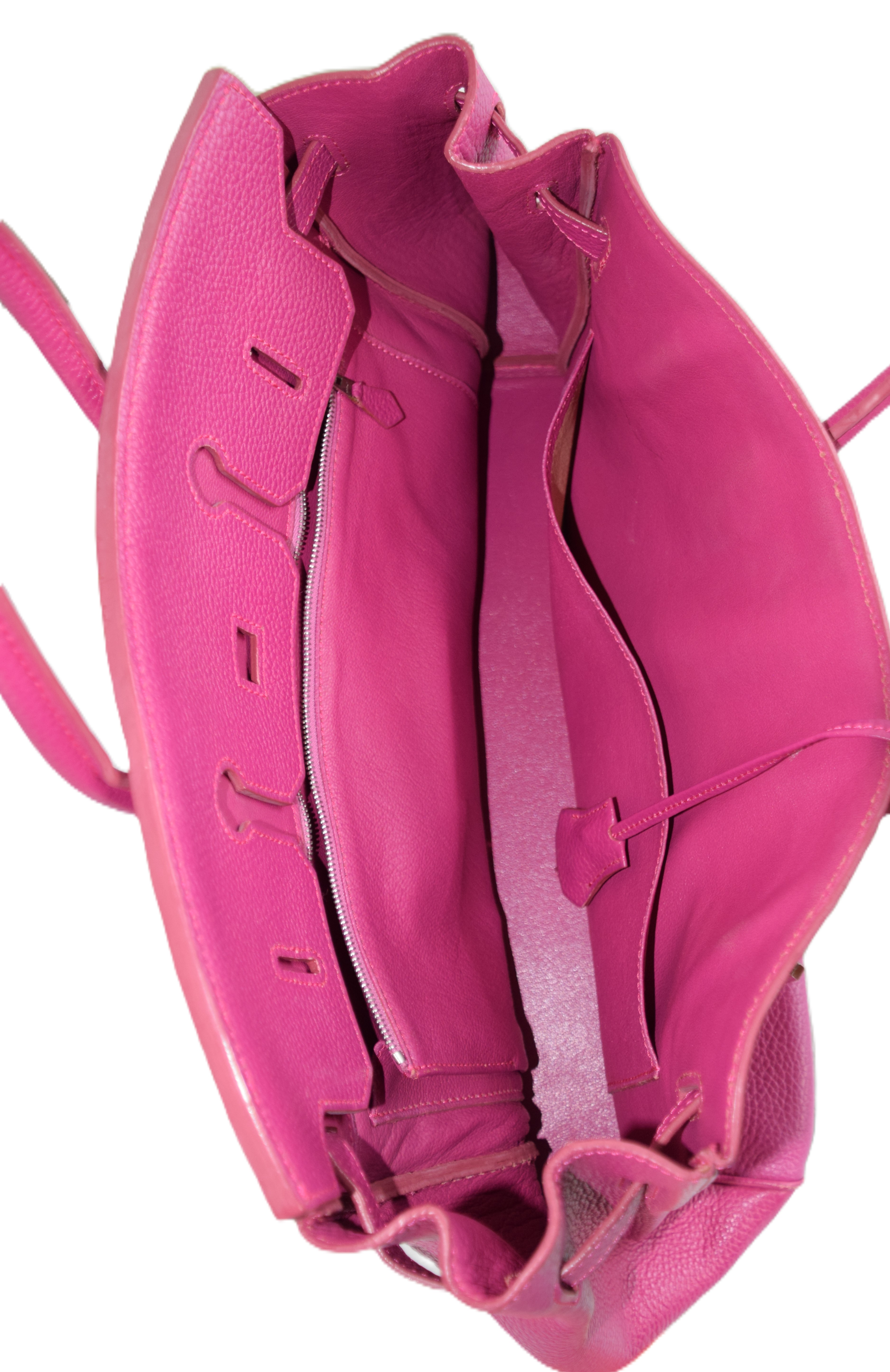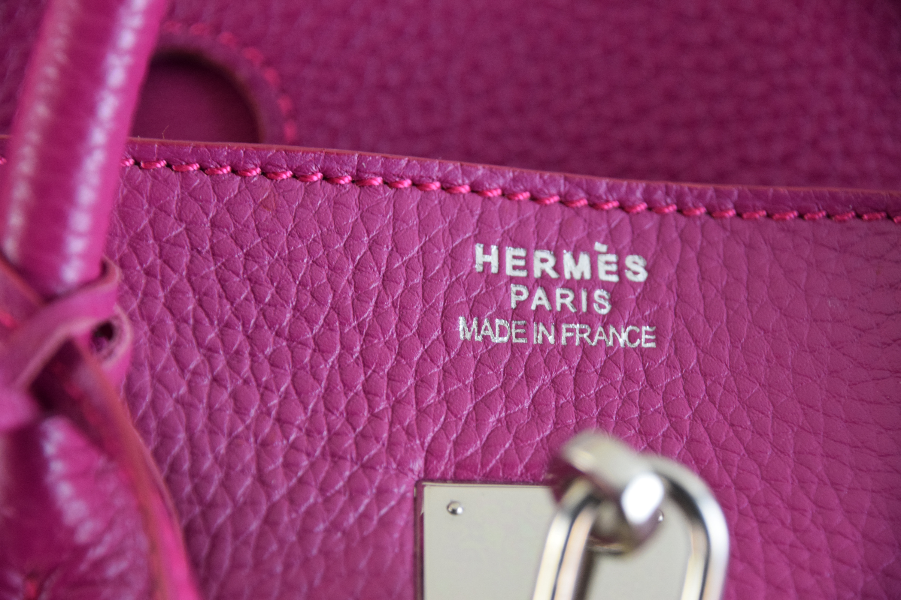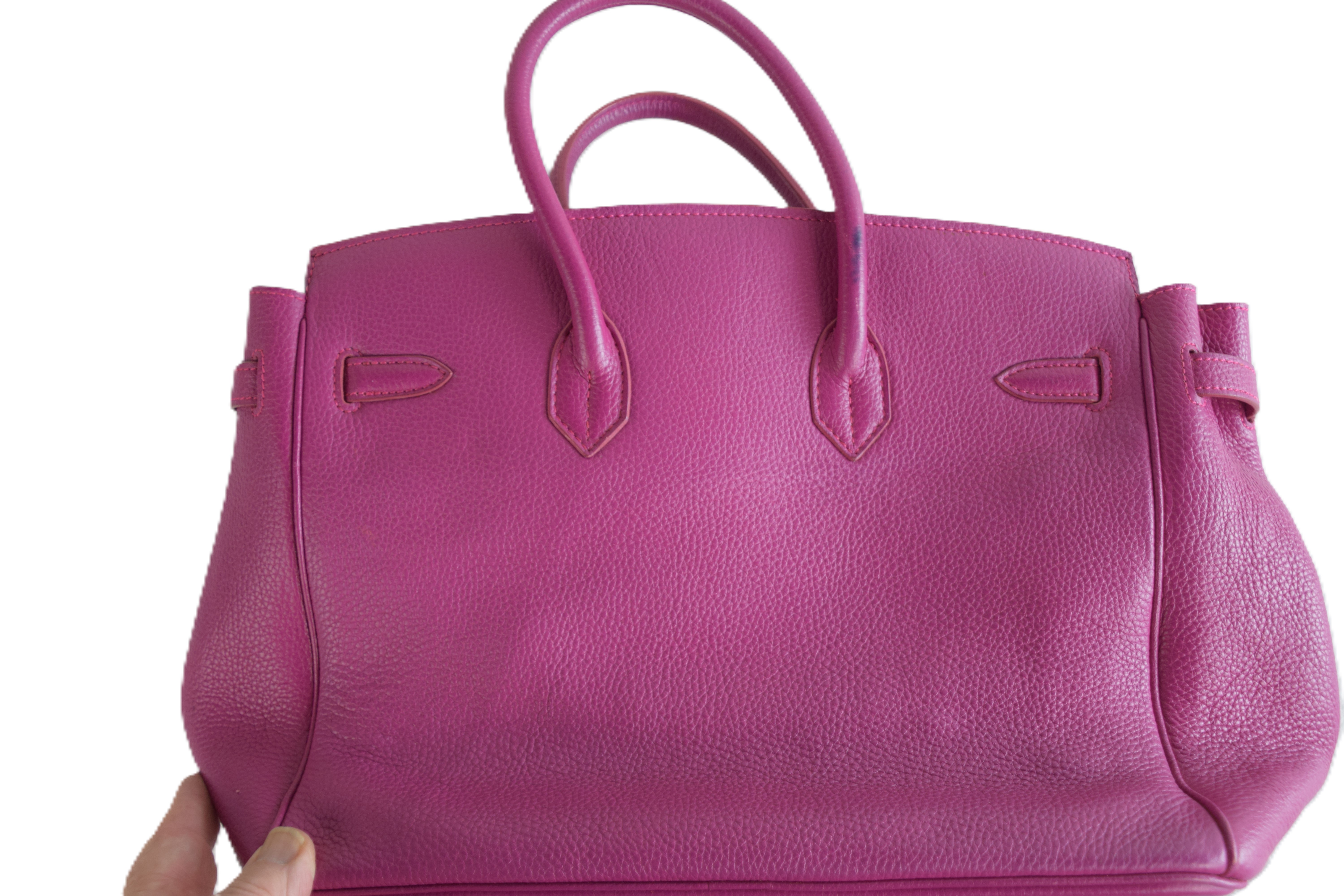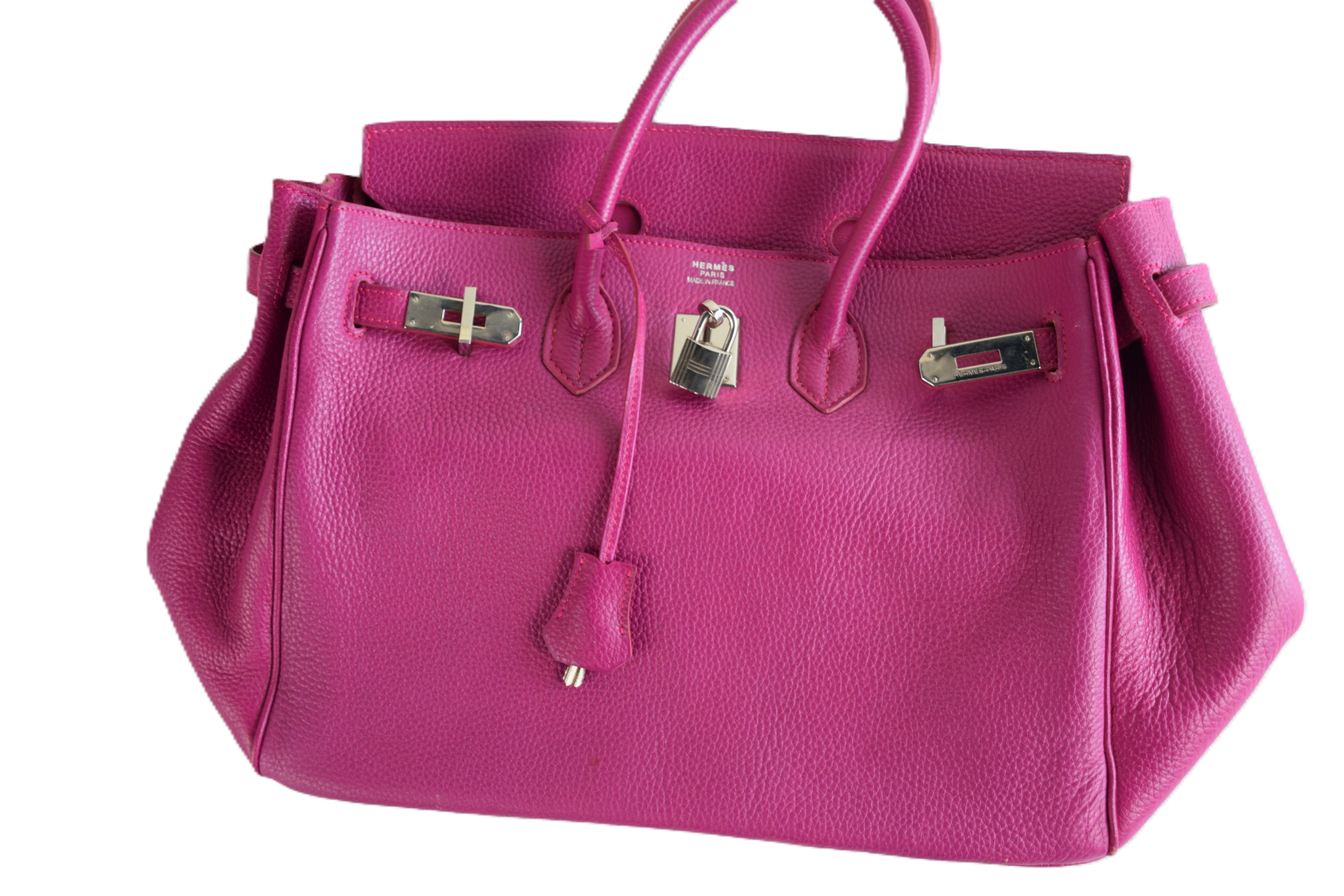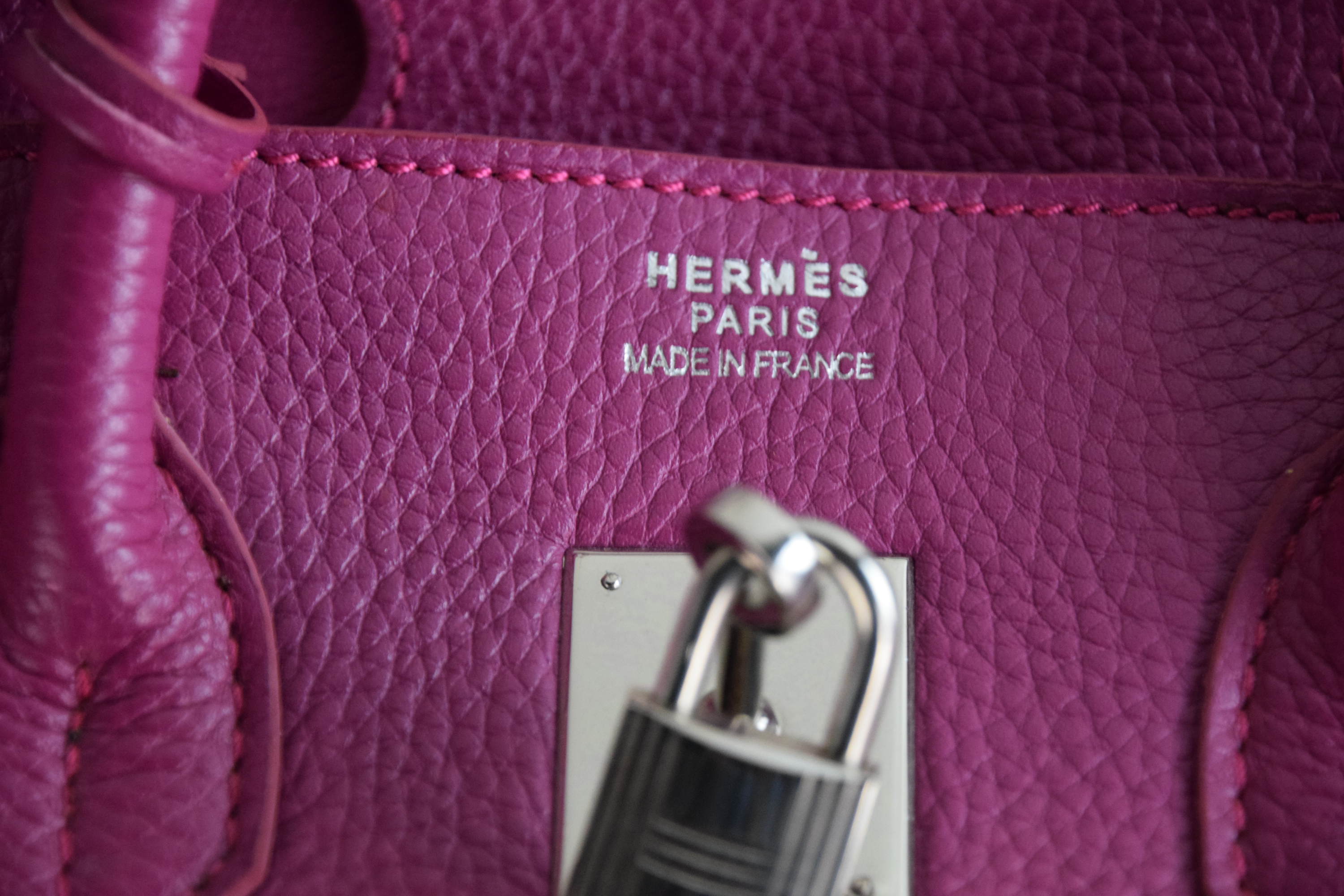 Hermes Birkin 25 plum handbag with lock and key. Because of concerns from bidders, we had a Hermes expert examine the bag and found it to be a copy, missing heat stamps and hand sewn stitching. If you desire the bag, please contact us after the auction.