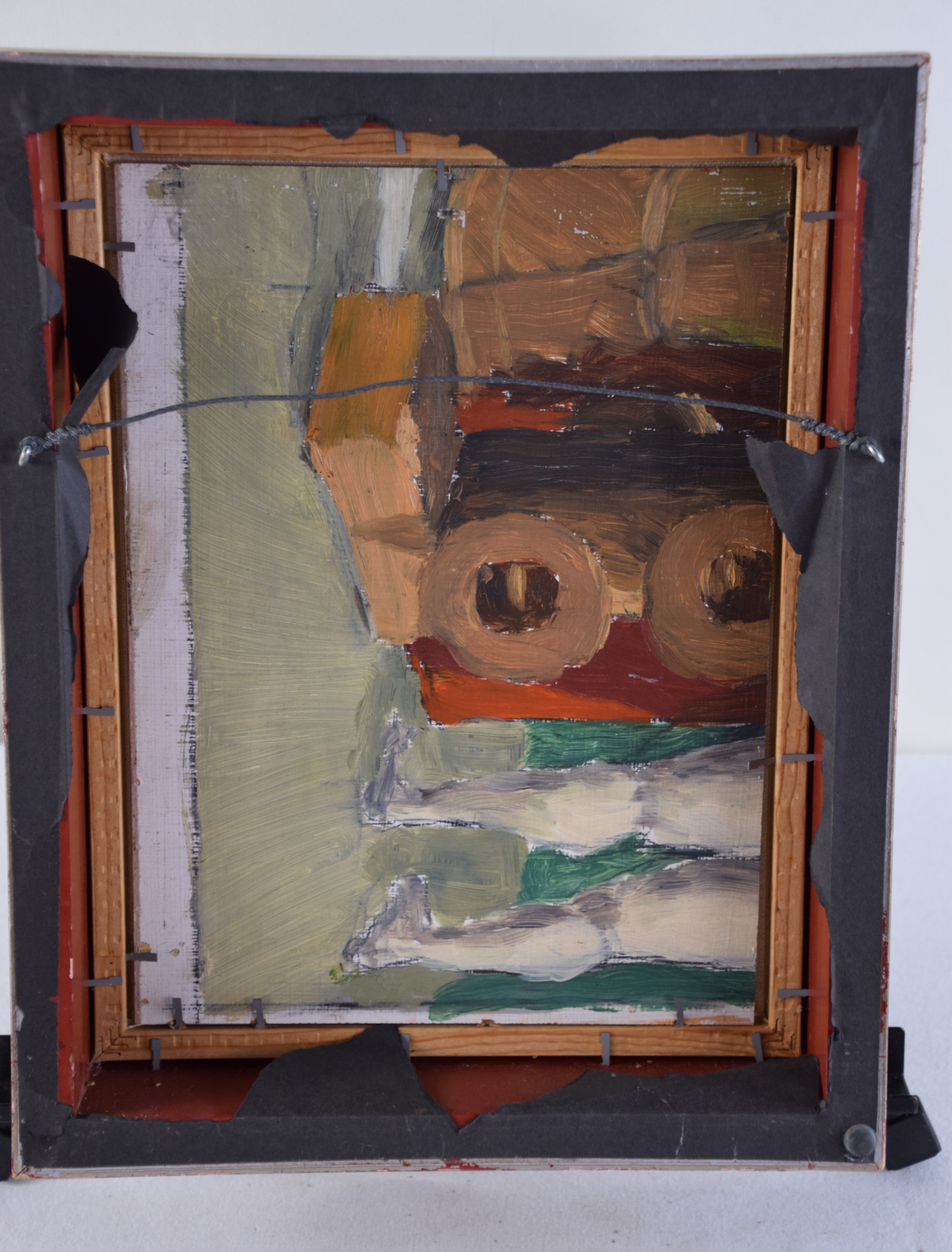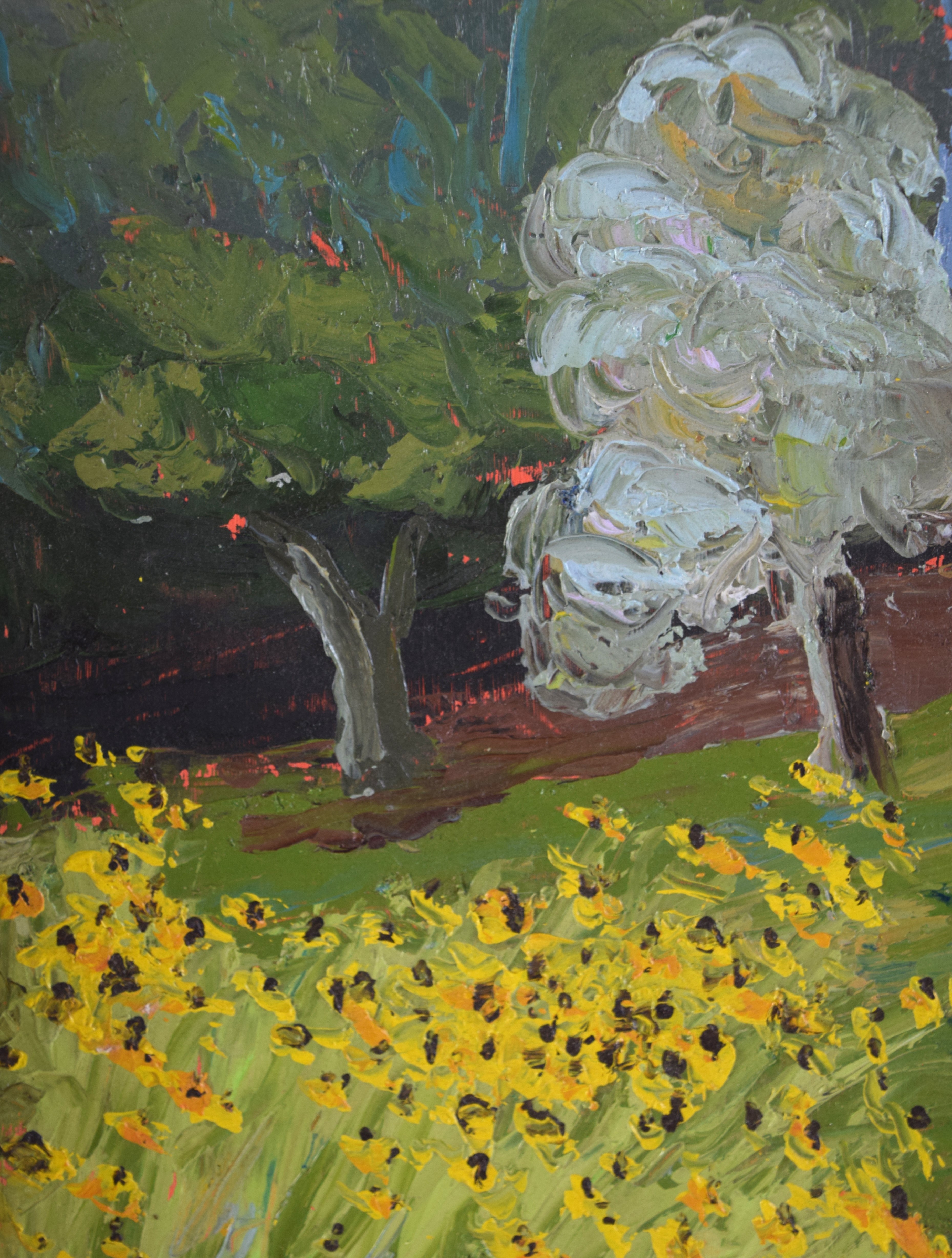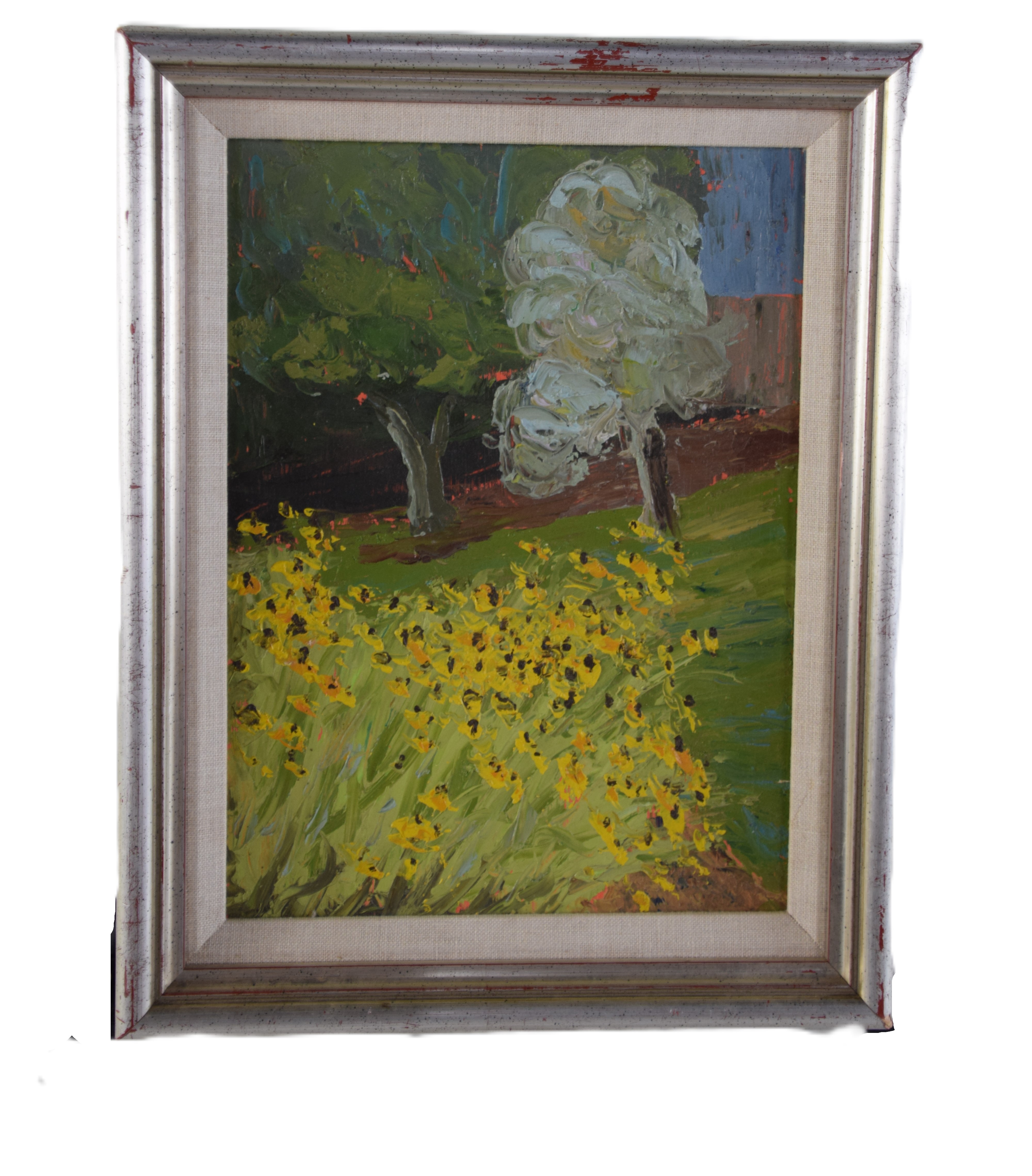 Framed impressionist landscape, oil on board with sunflowers and trees. There is an abstract painting on back. Dimensions: 11.5″ x 9″