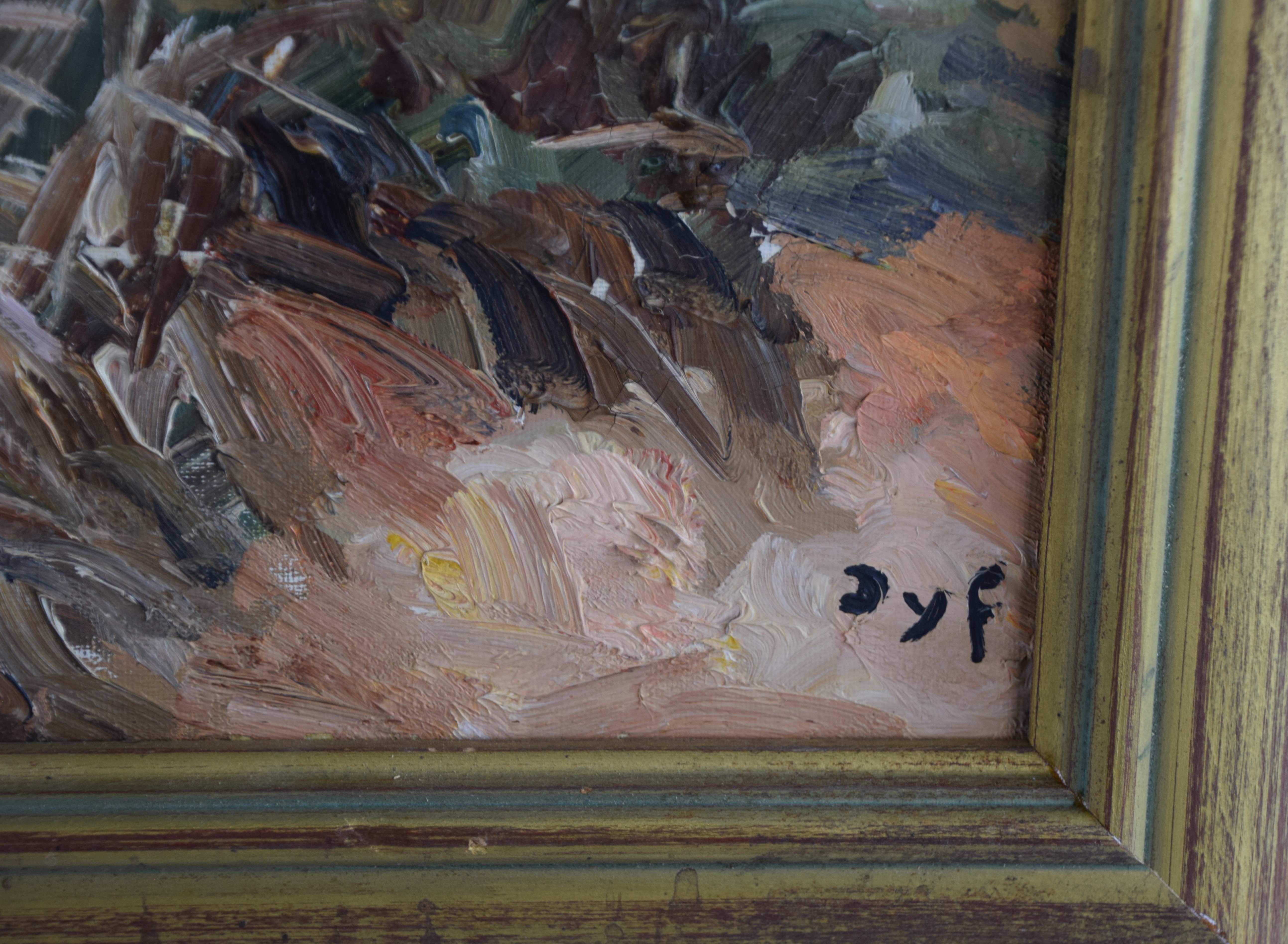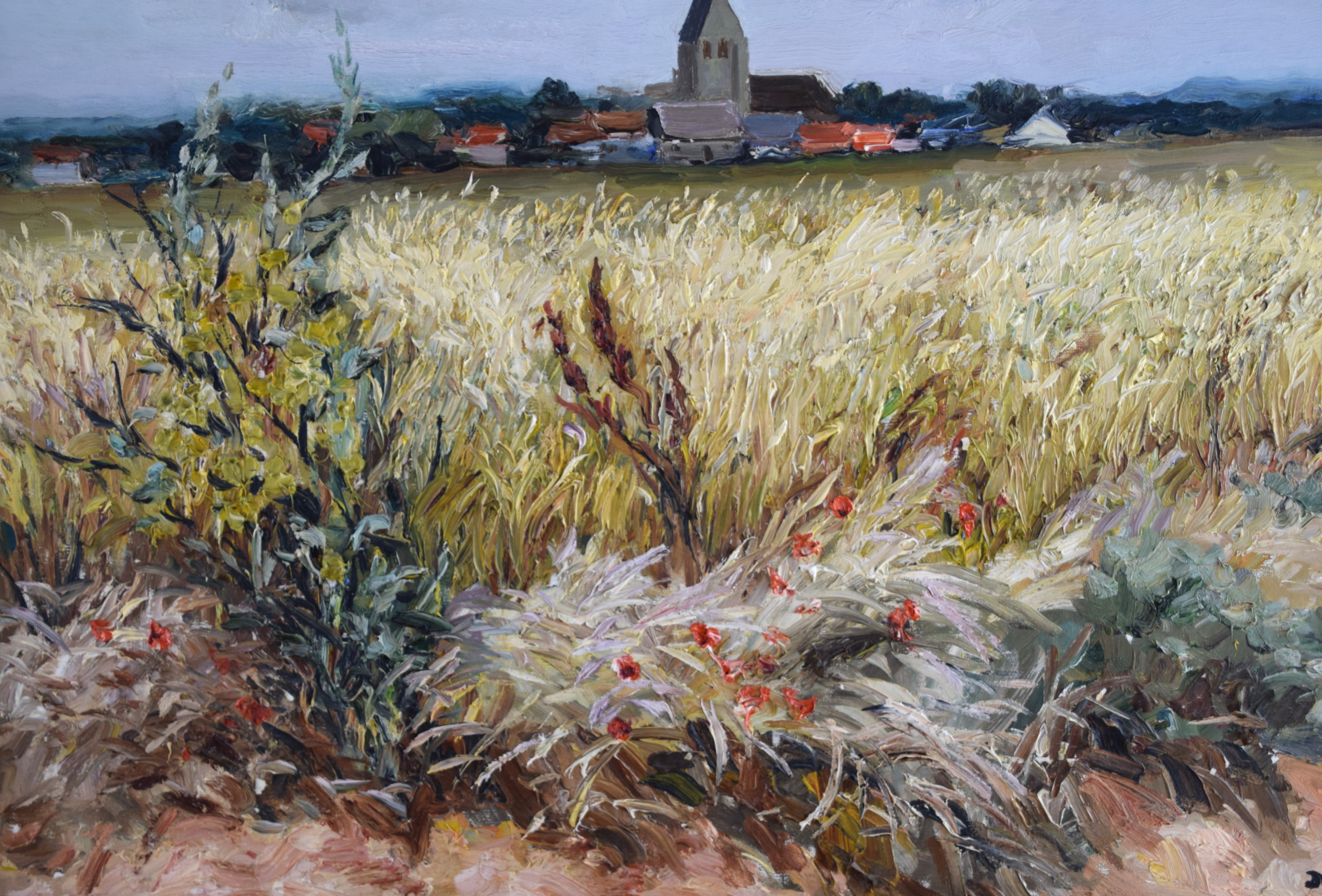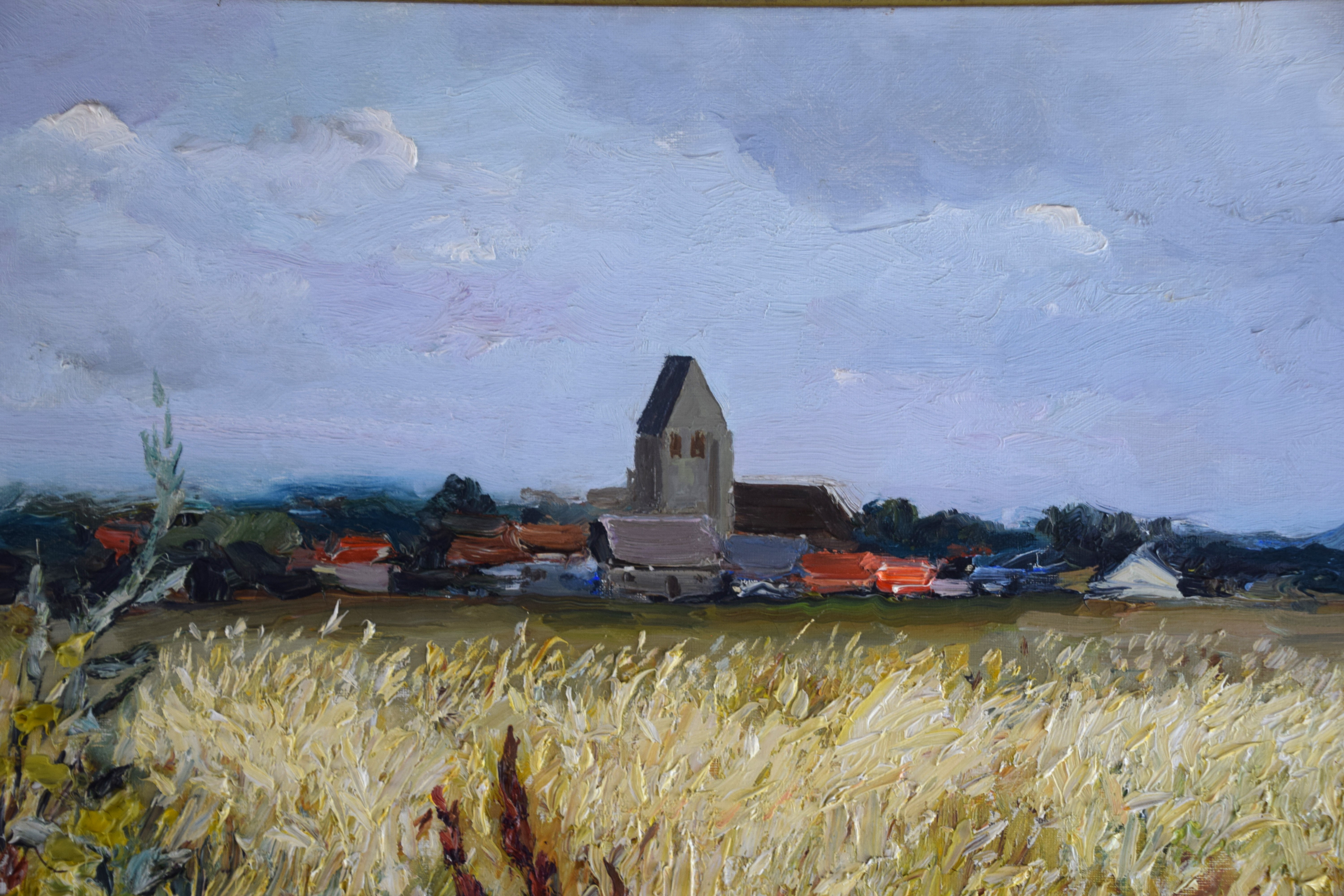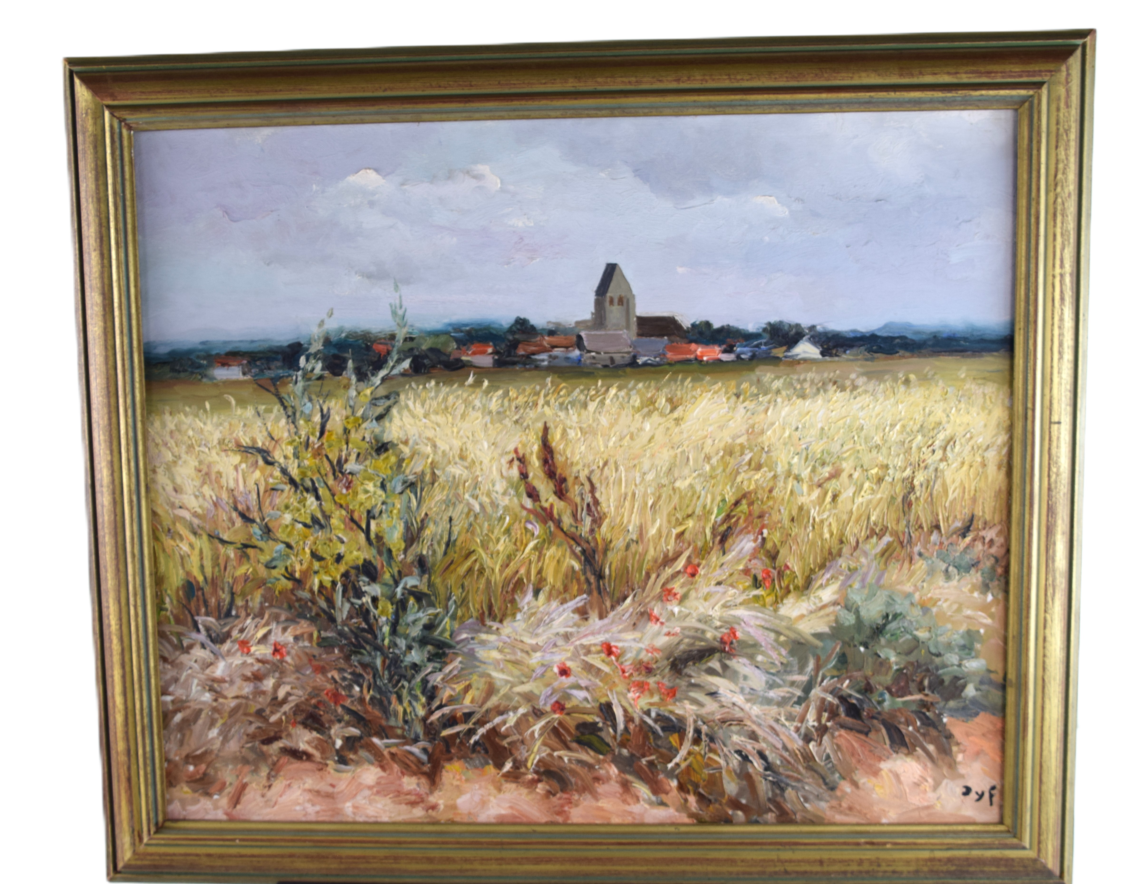 Framed oil on canvas landscape of a French town and fields by Marcel Dyf. Signed lower left. Marcel Dyf (1899 – 1985) worked in France and is known for landscapes, floral still life and seascape painting. Provenance: Deaccessioned by Mount Holyoke College Art Museum in 2024. Dimensions: 22″ x 28″ Image size, 28″ x 34″ Overall