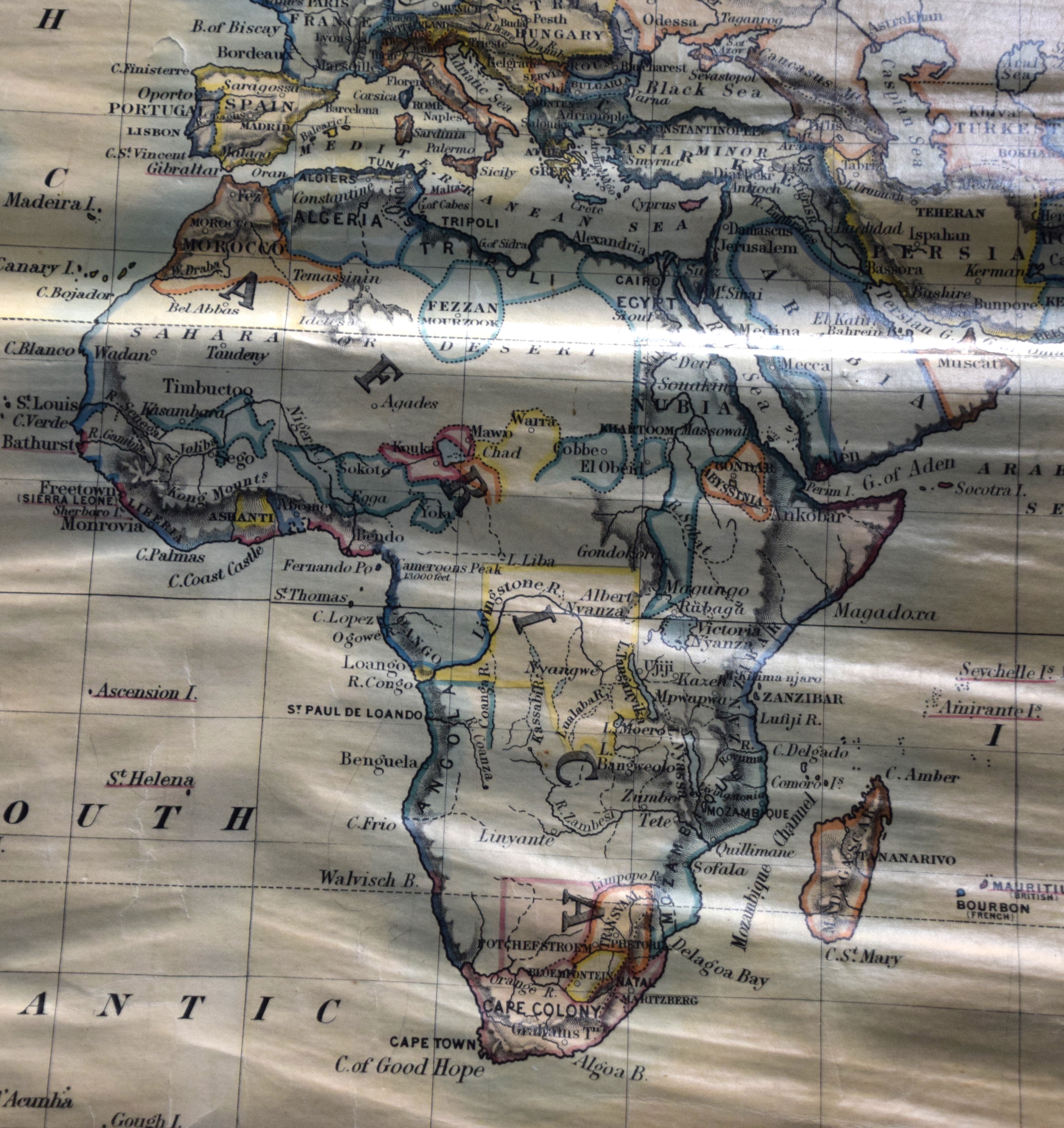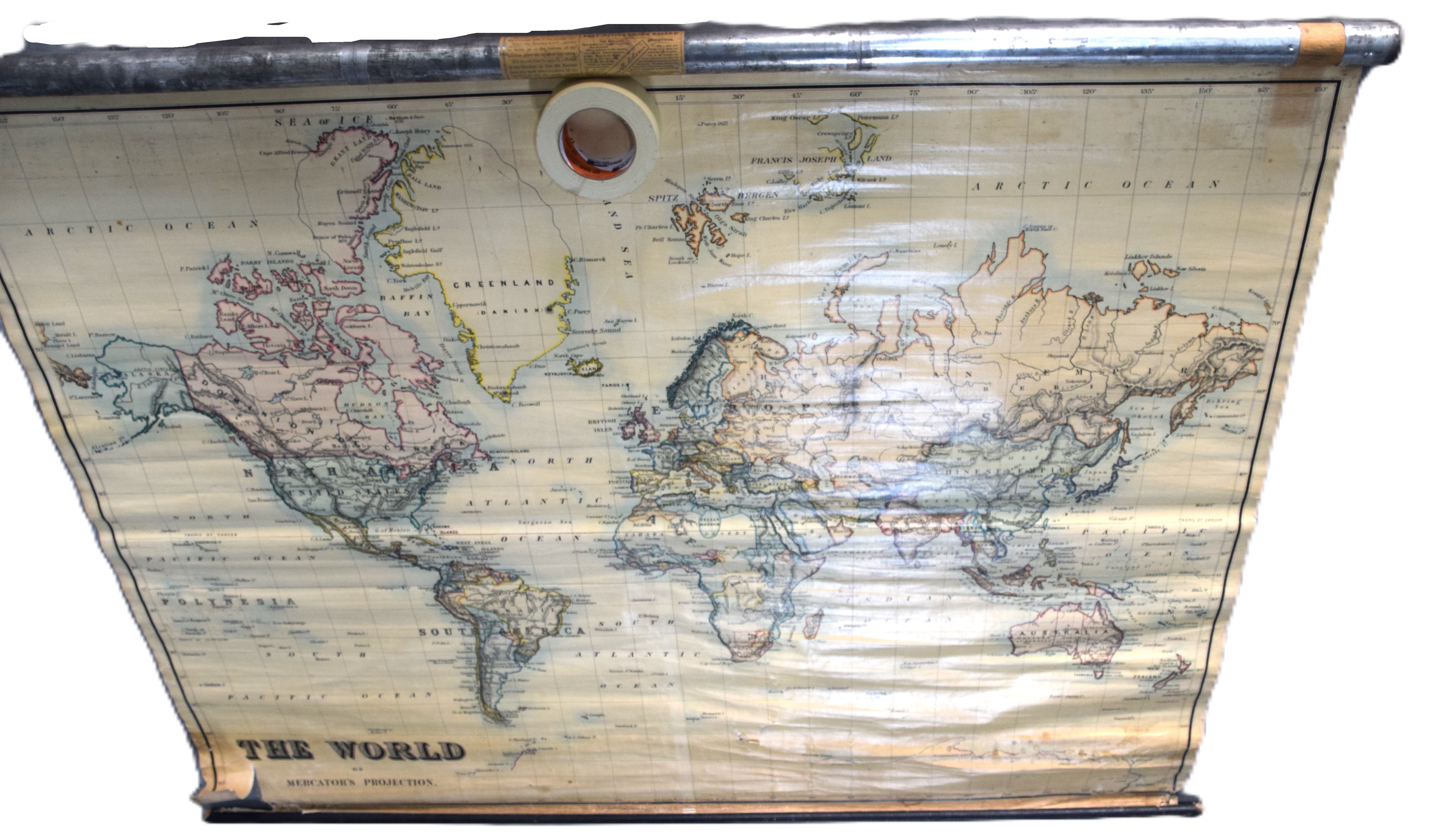 1885 wall map of the world on a tin roller, made in London. Africa has interesting boundaries. Dimensions: 50″ x 60″