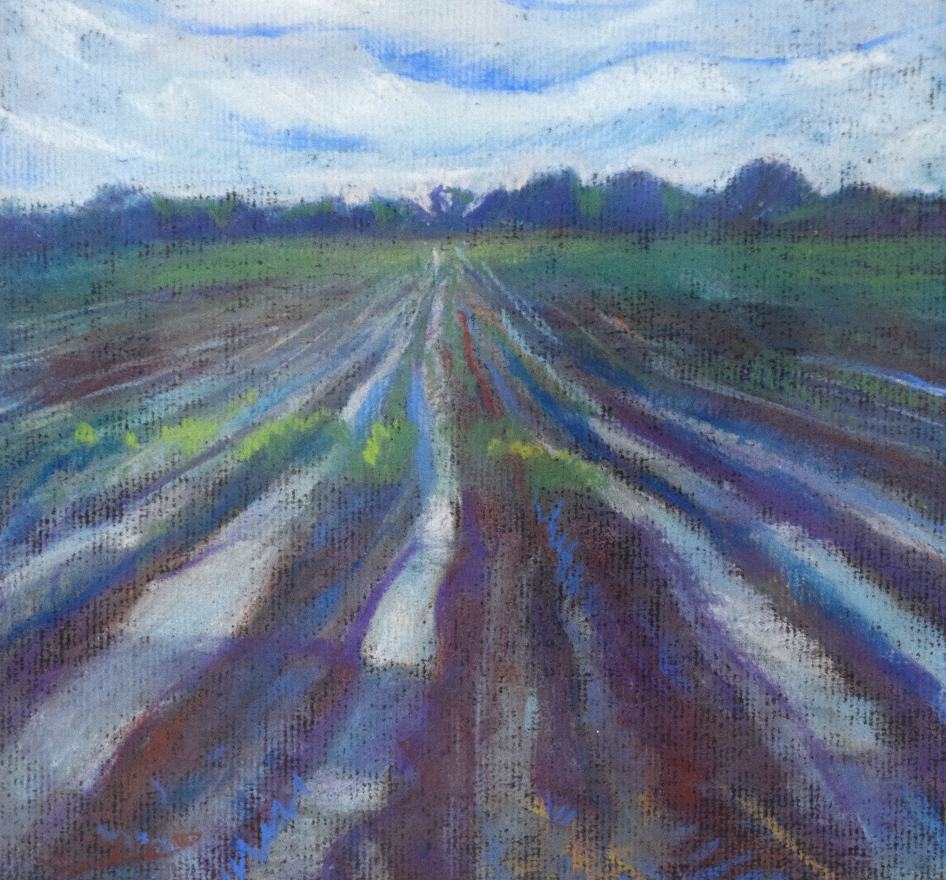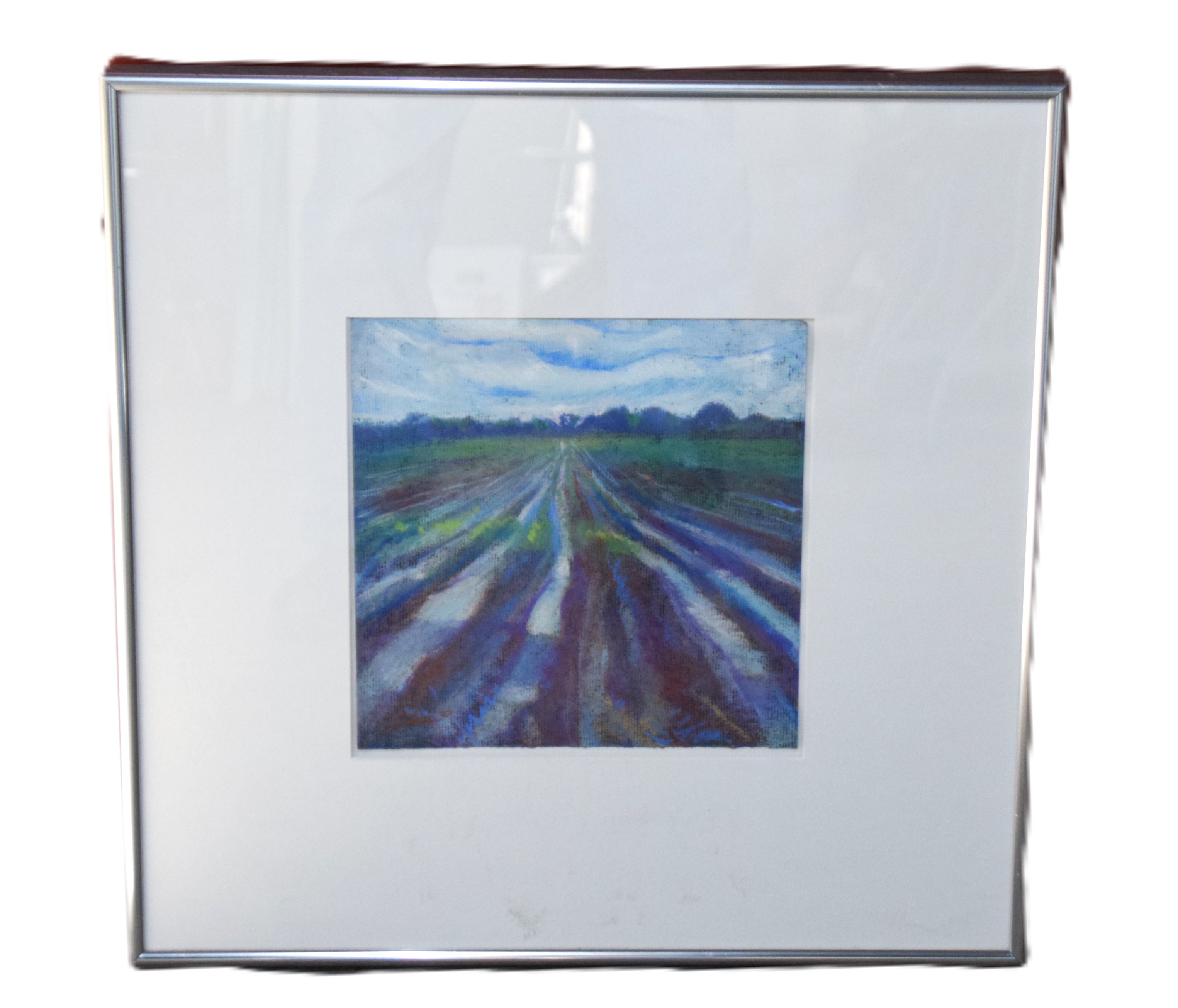 Framed impressionist landscape with a plowed field, trees and skyline. Dimensions: 9″ x 9″ Image, 18.5″ x 18.5″ Overall