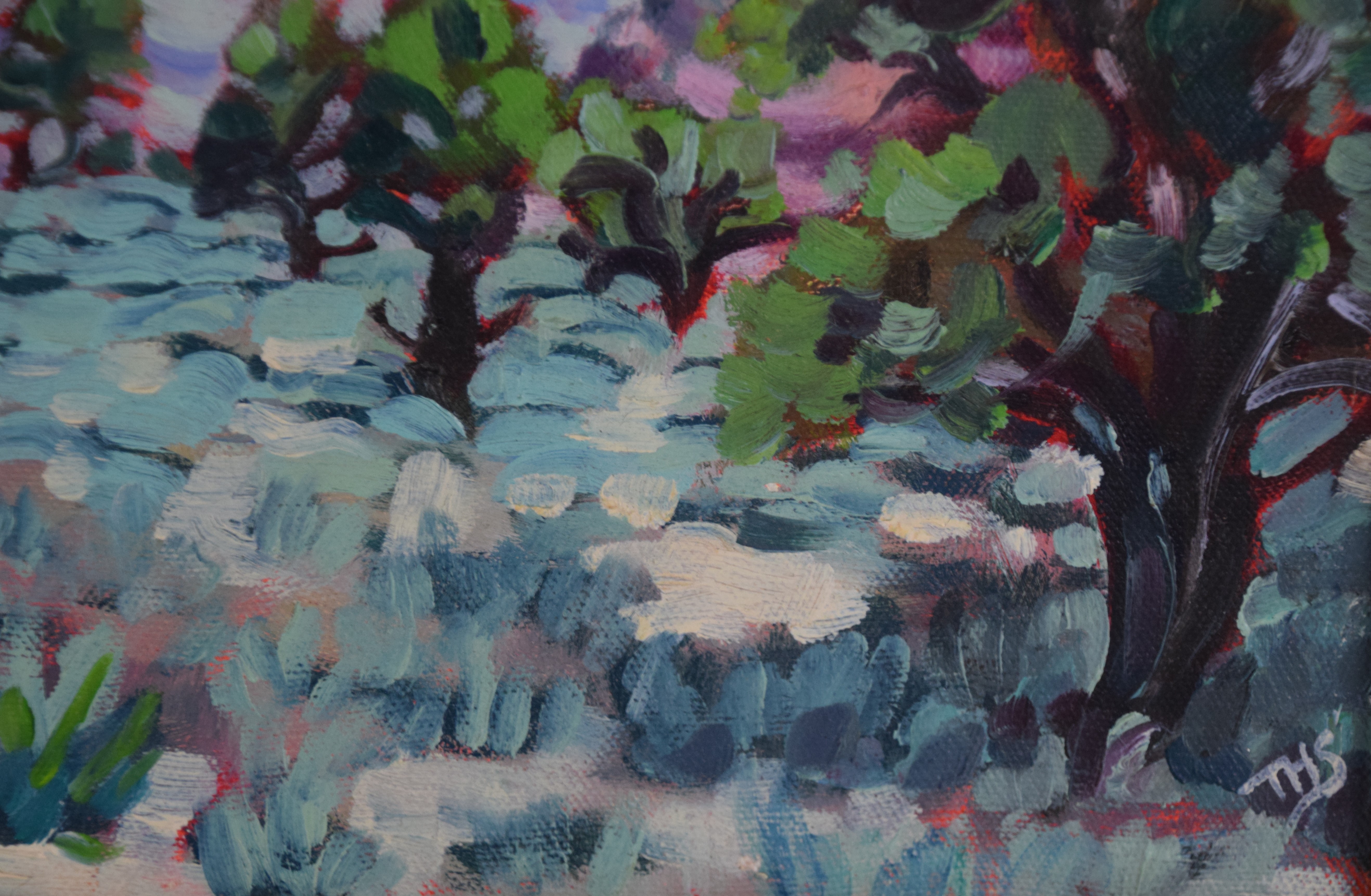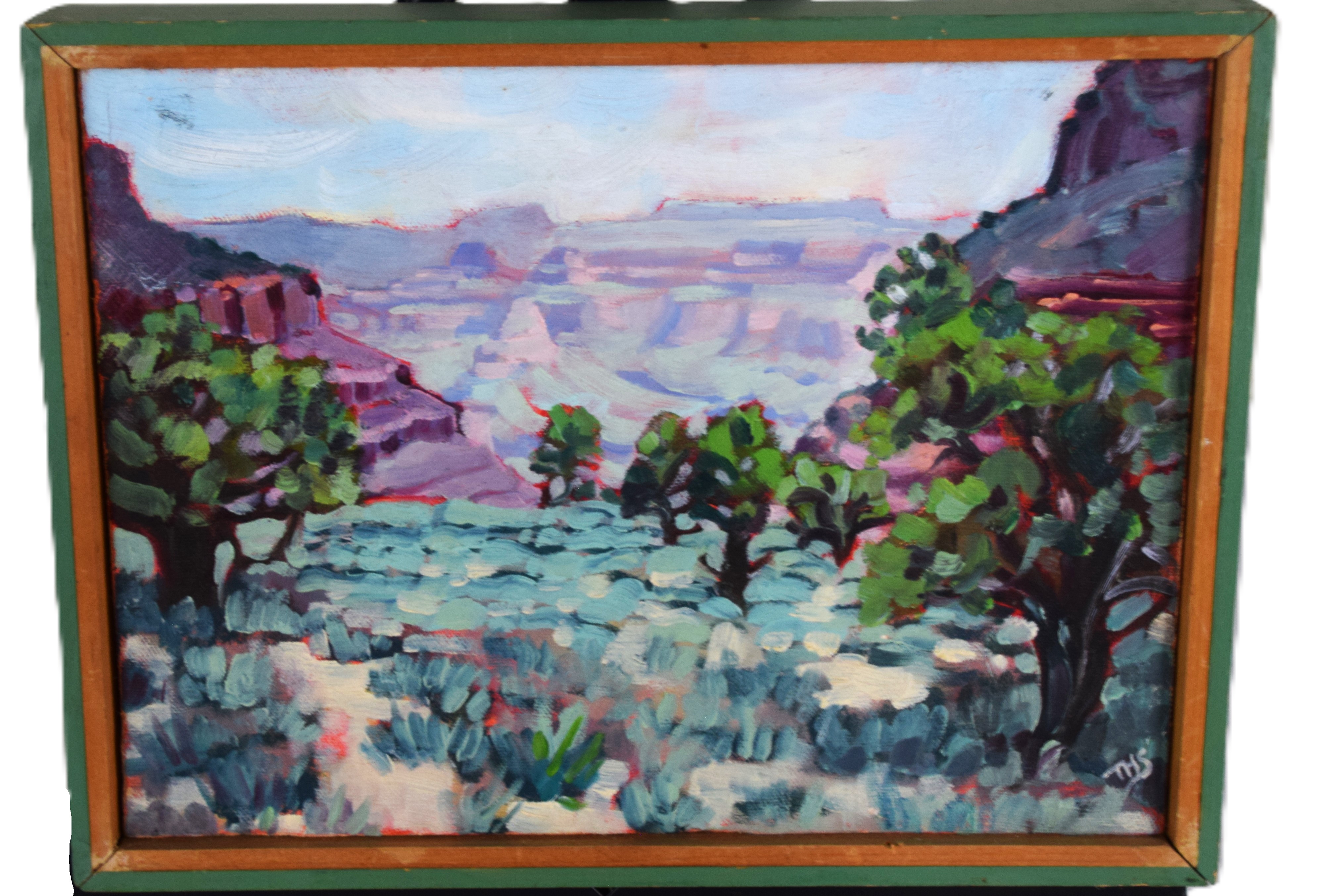 Framed impressionist landscape, oil on canvas, entitled “Canyon Views II” and signed lower right THS. Dimensions: 10″ x 13″ Overall