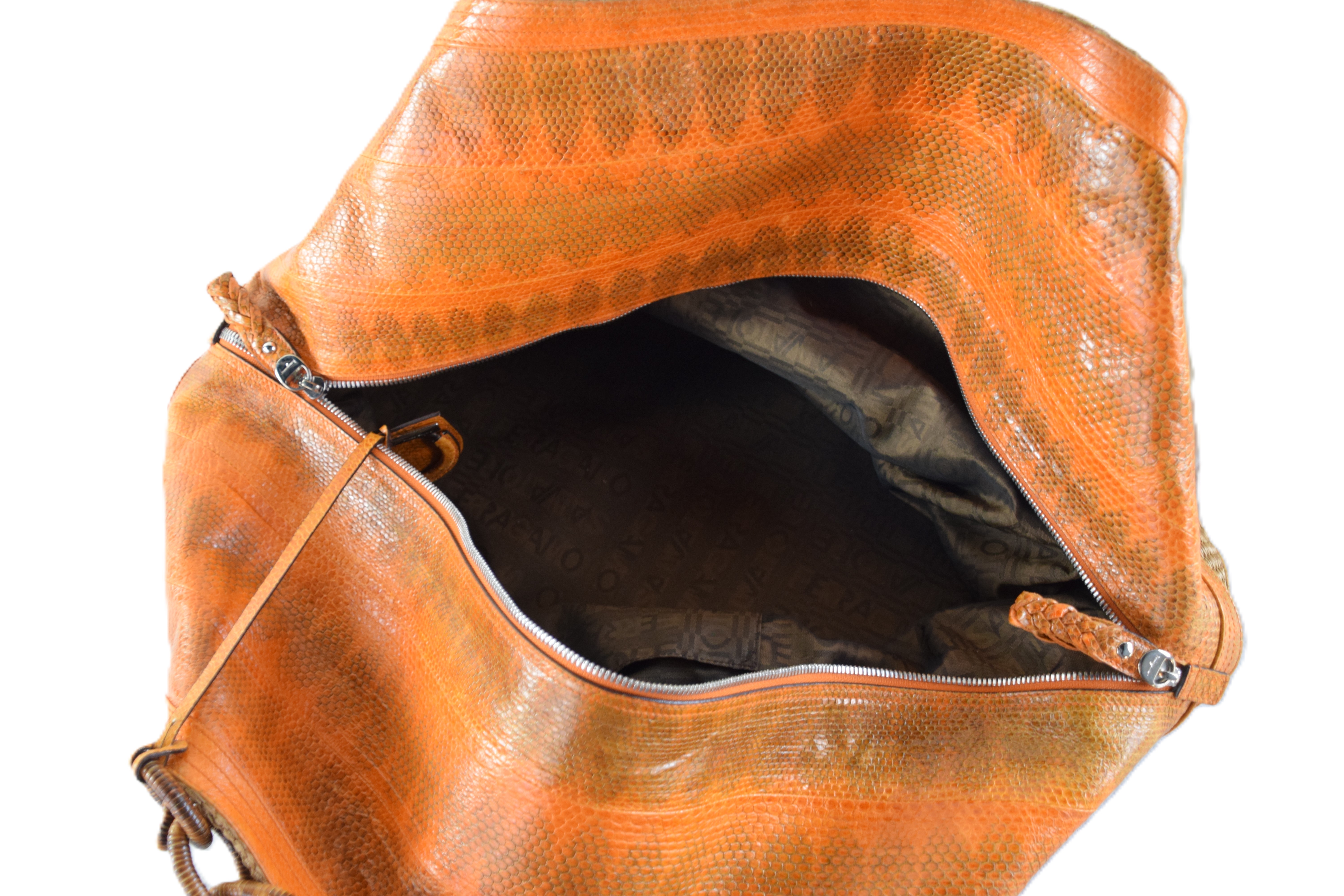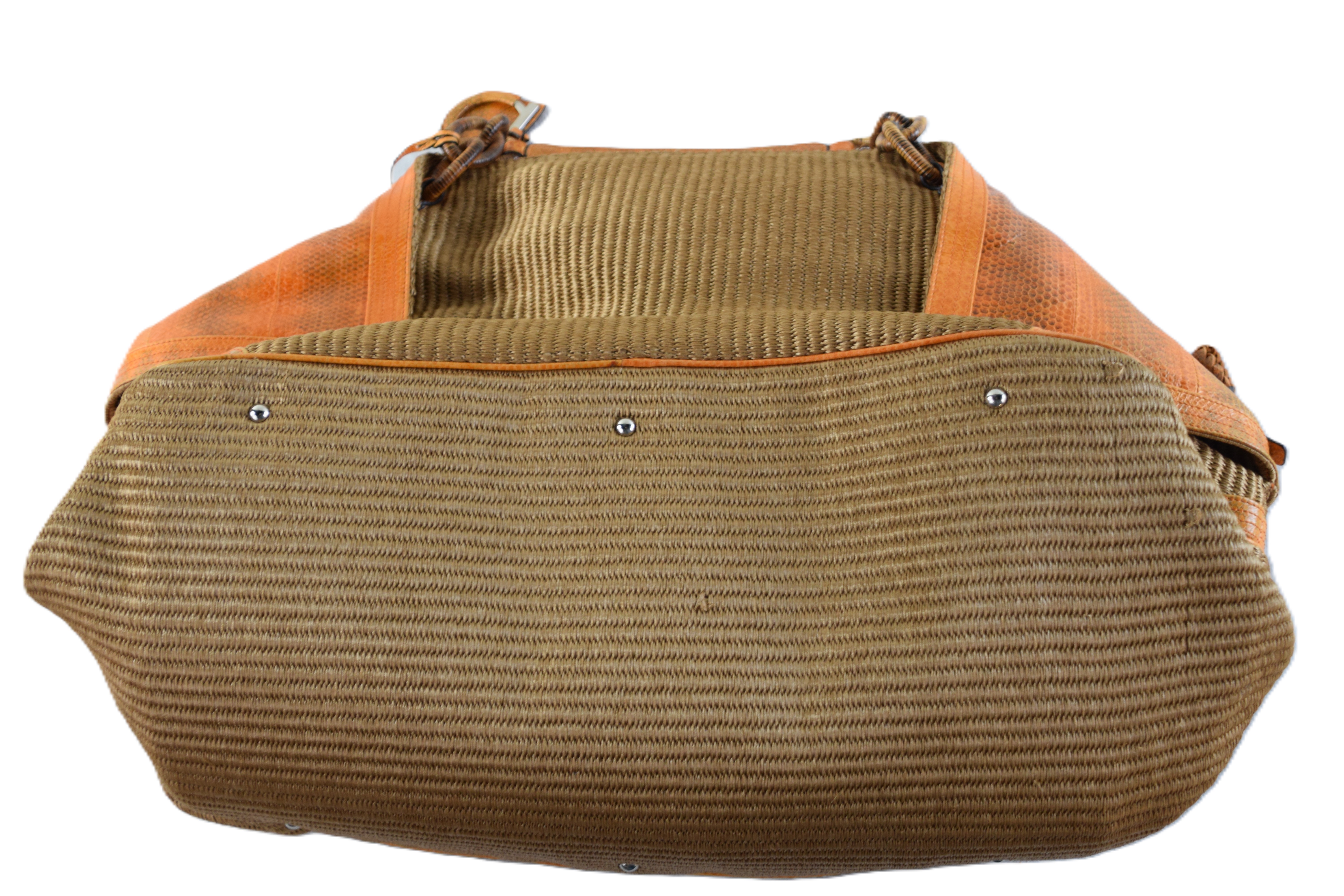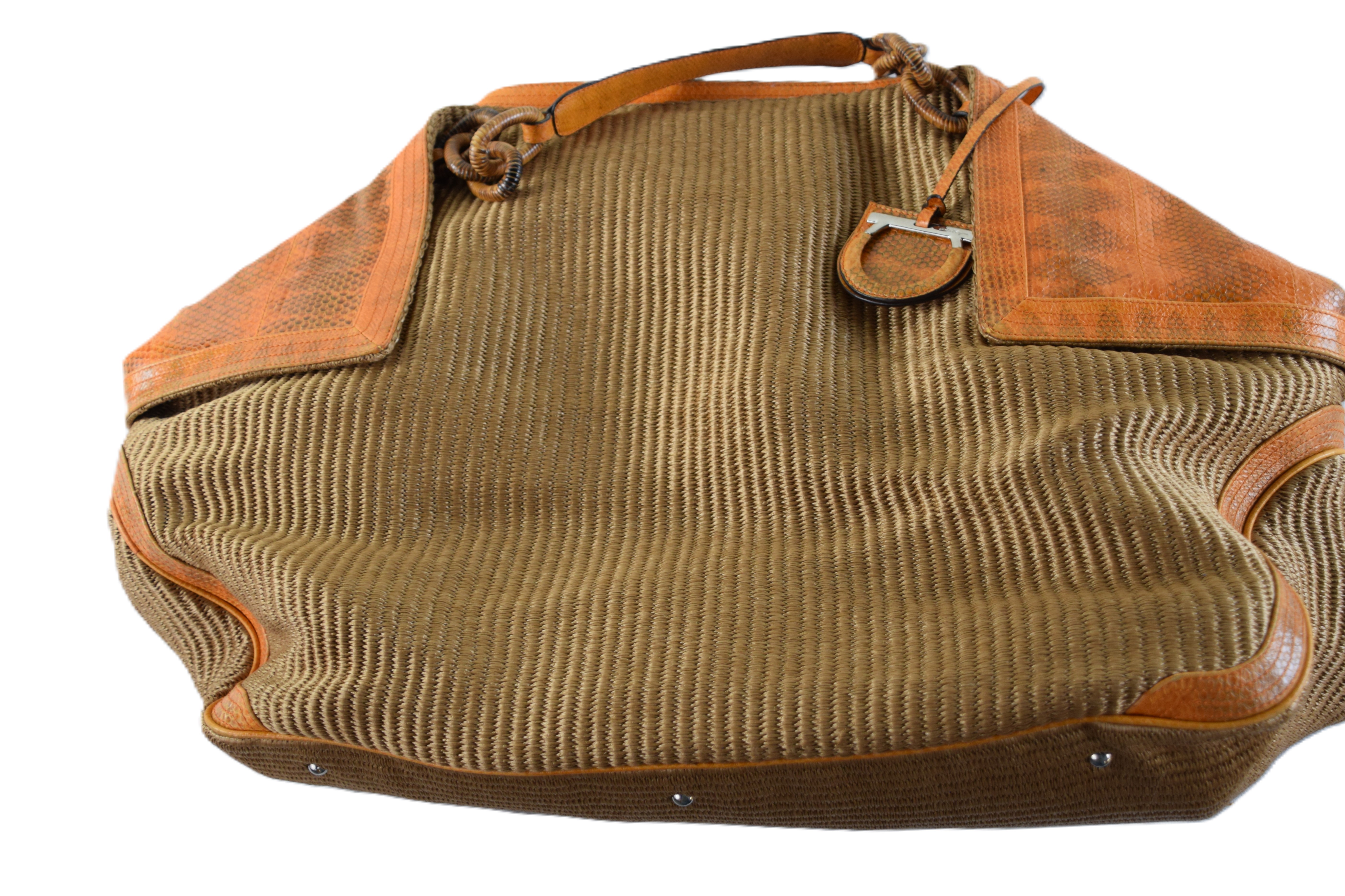 Salvador Ferragamo shoulder bag made with snakeskin and a weave material. Dimensions: 13″ x 20″ Bag excluding handles