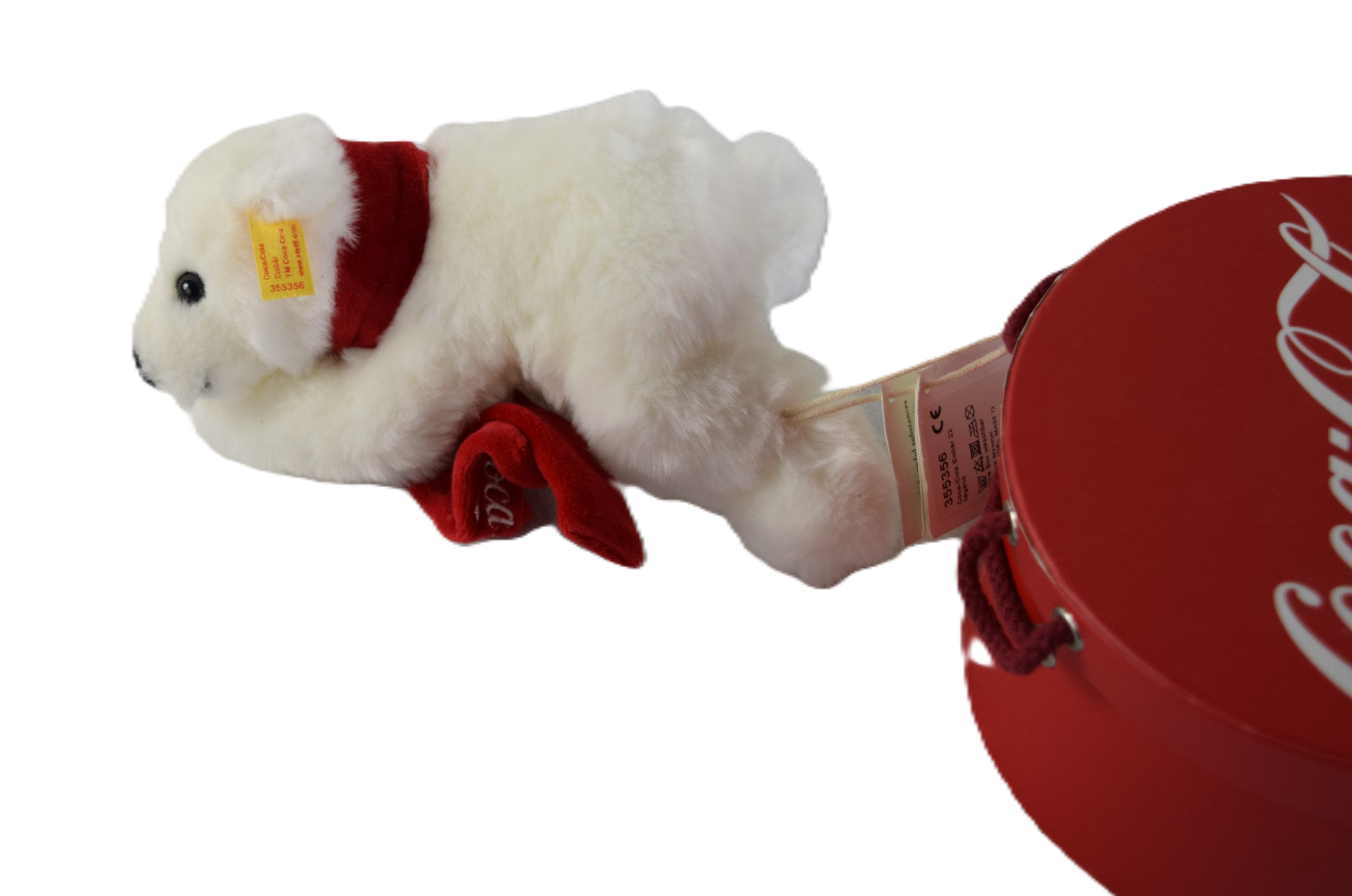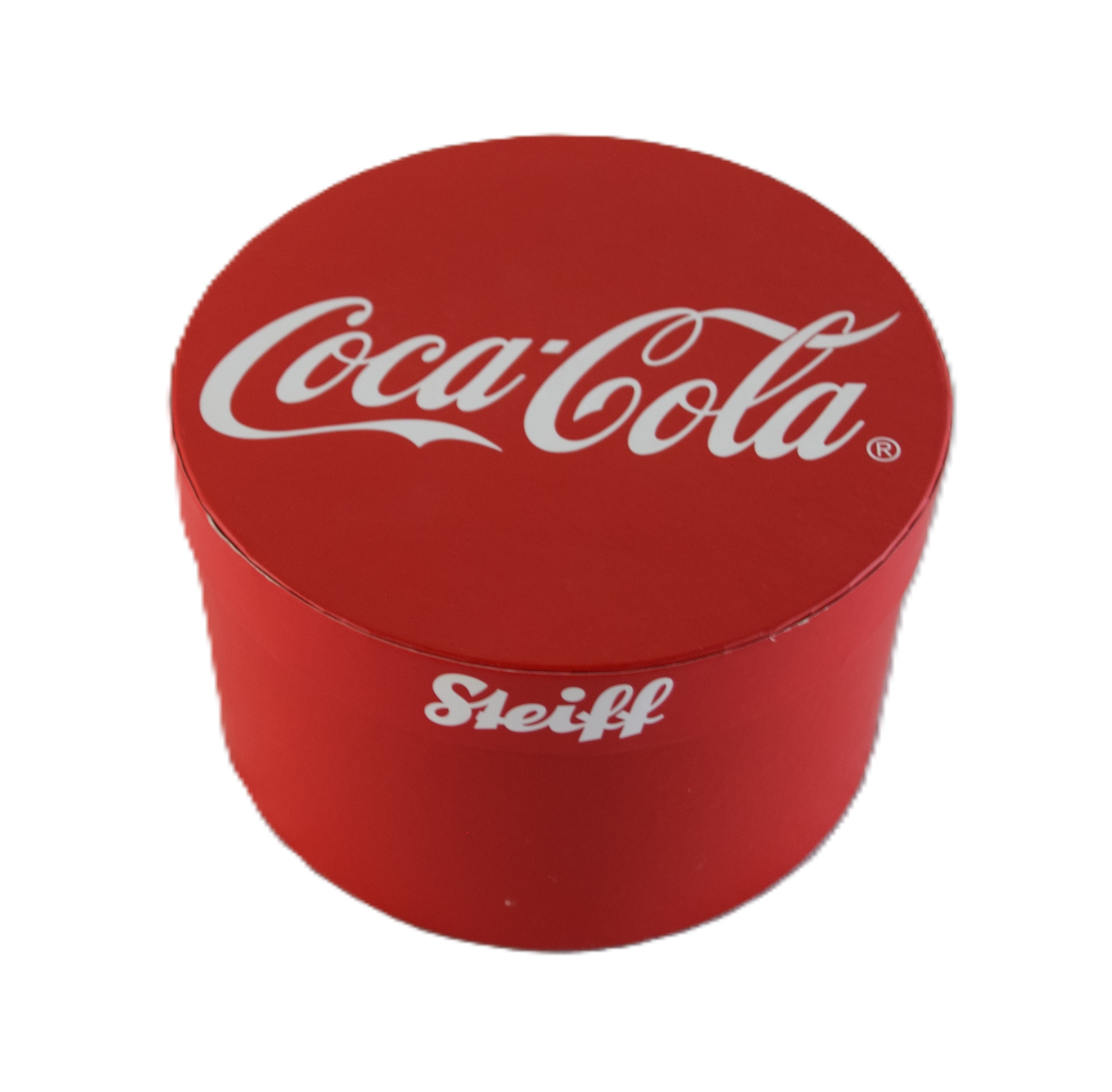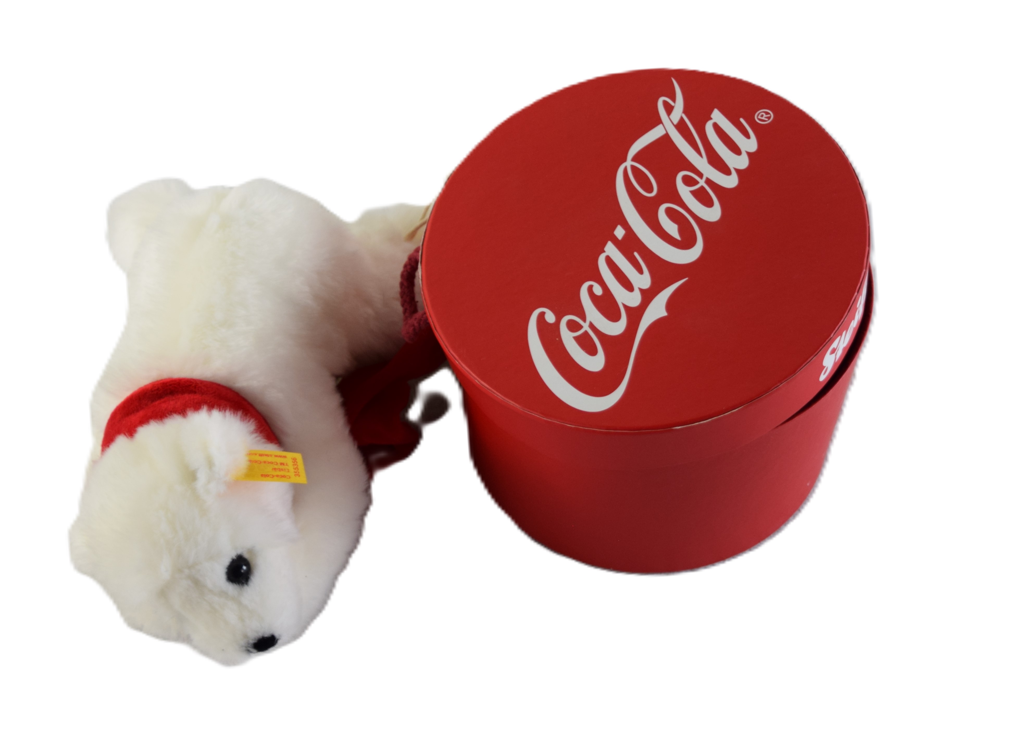 Coca Cola Steiff polar bear with coca cola ribbon in a round Coca Cola box. Dimensions: 4″ H Box