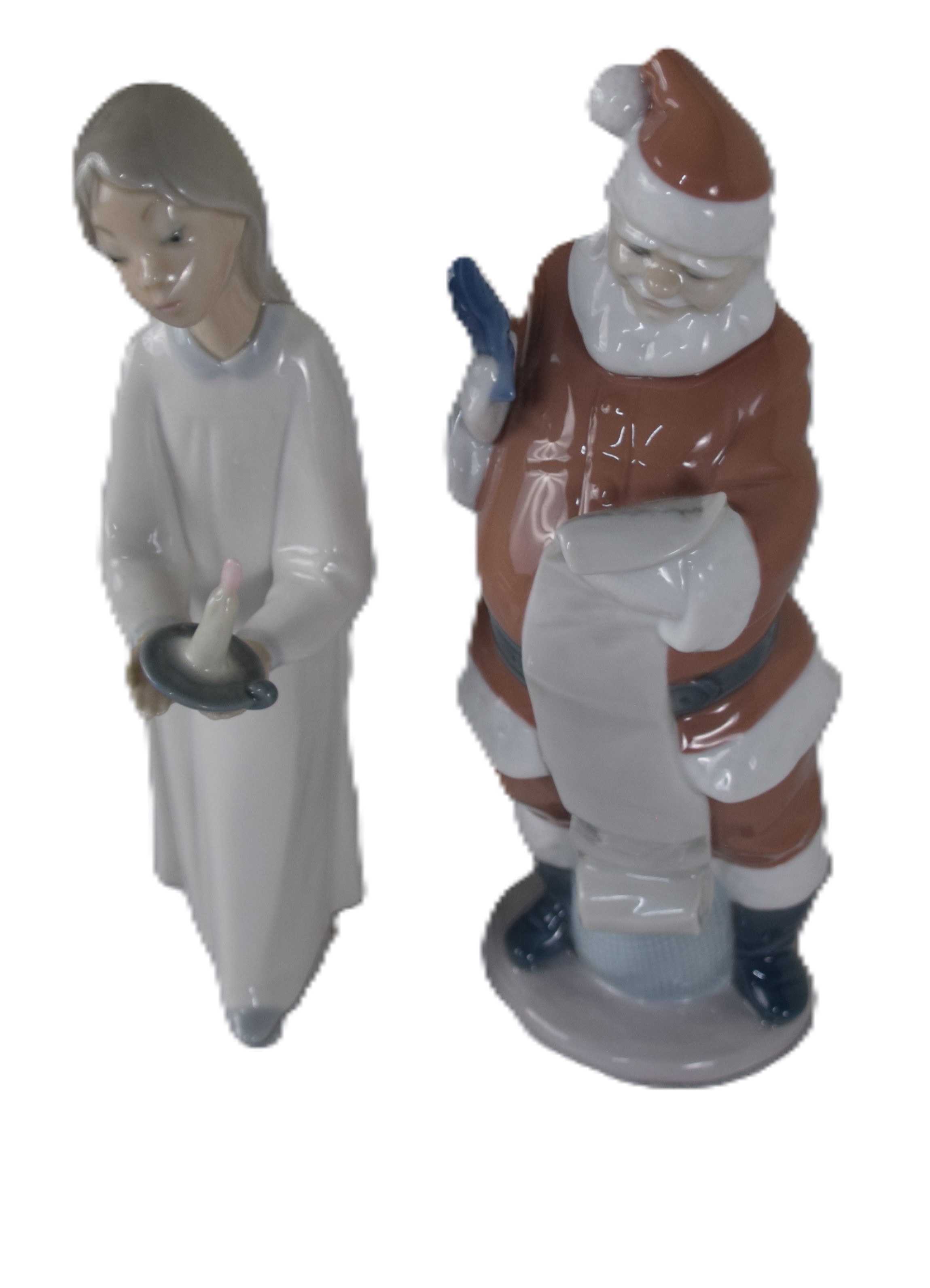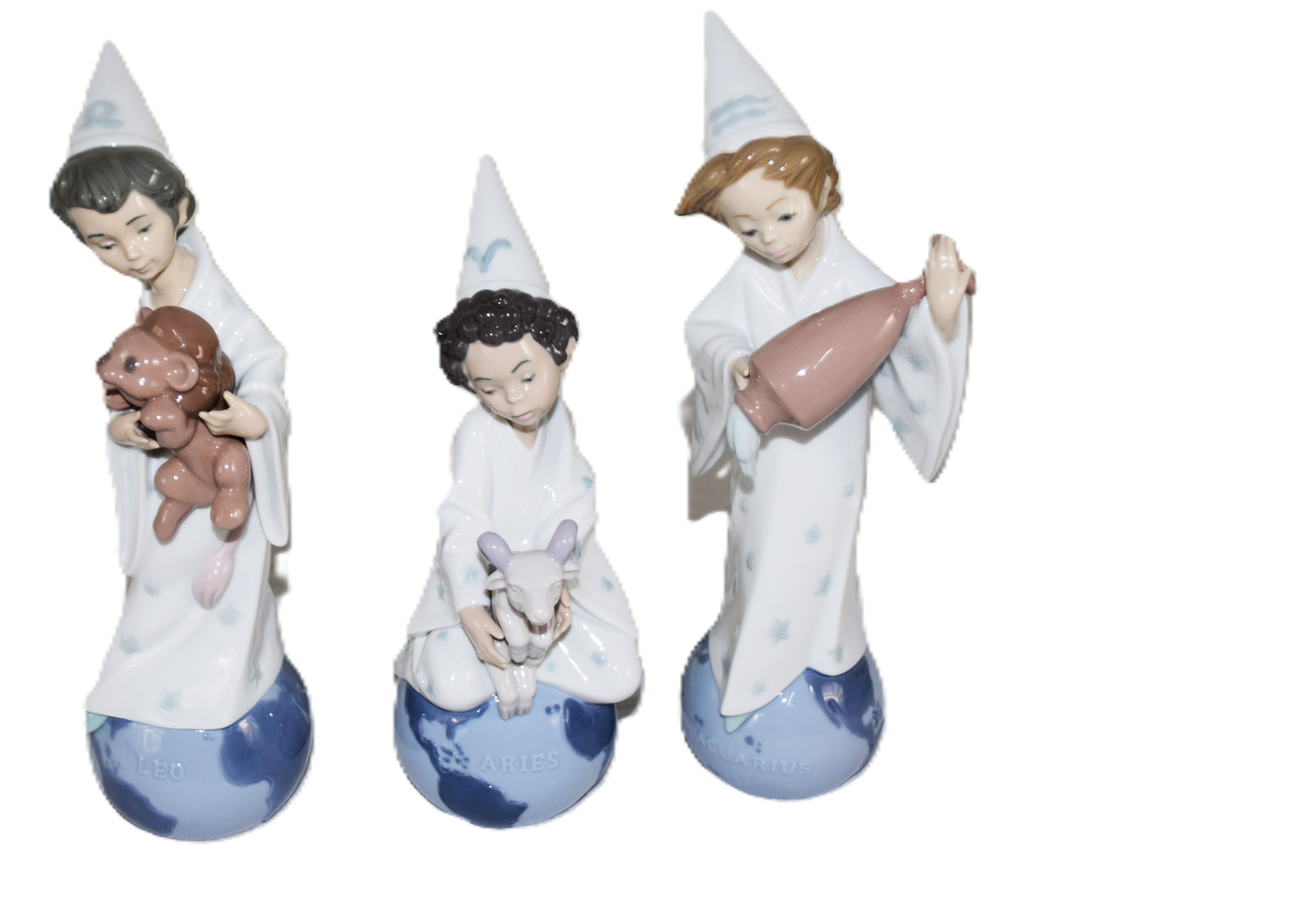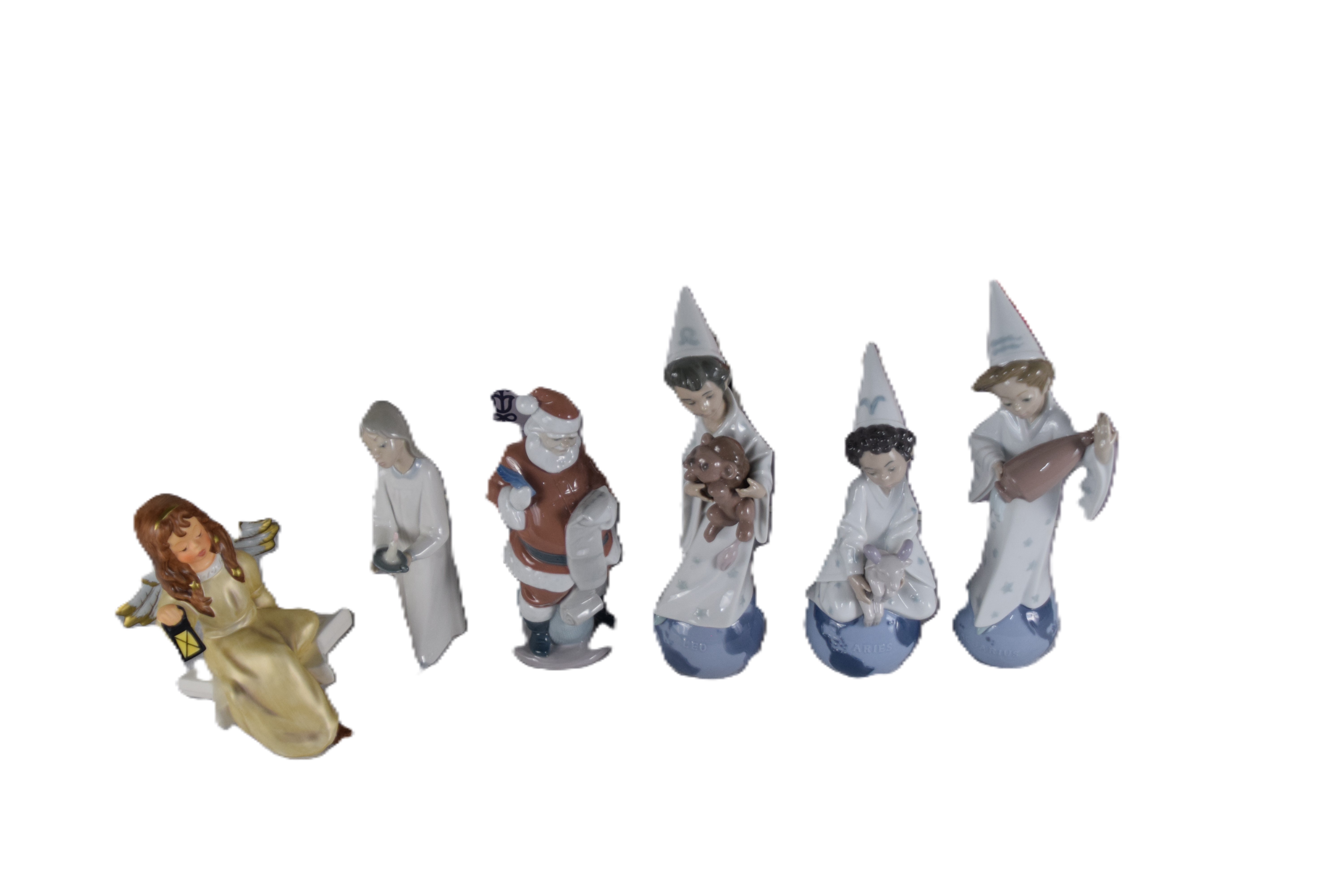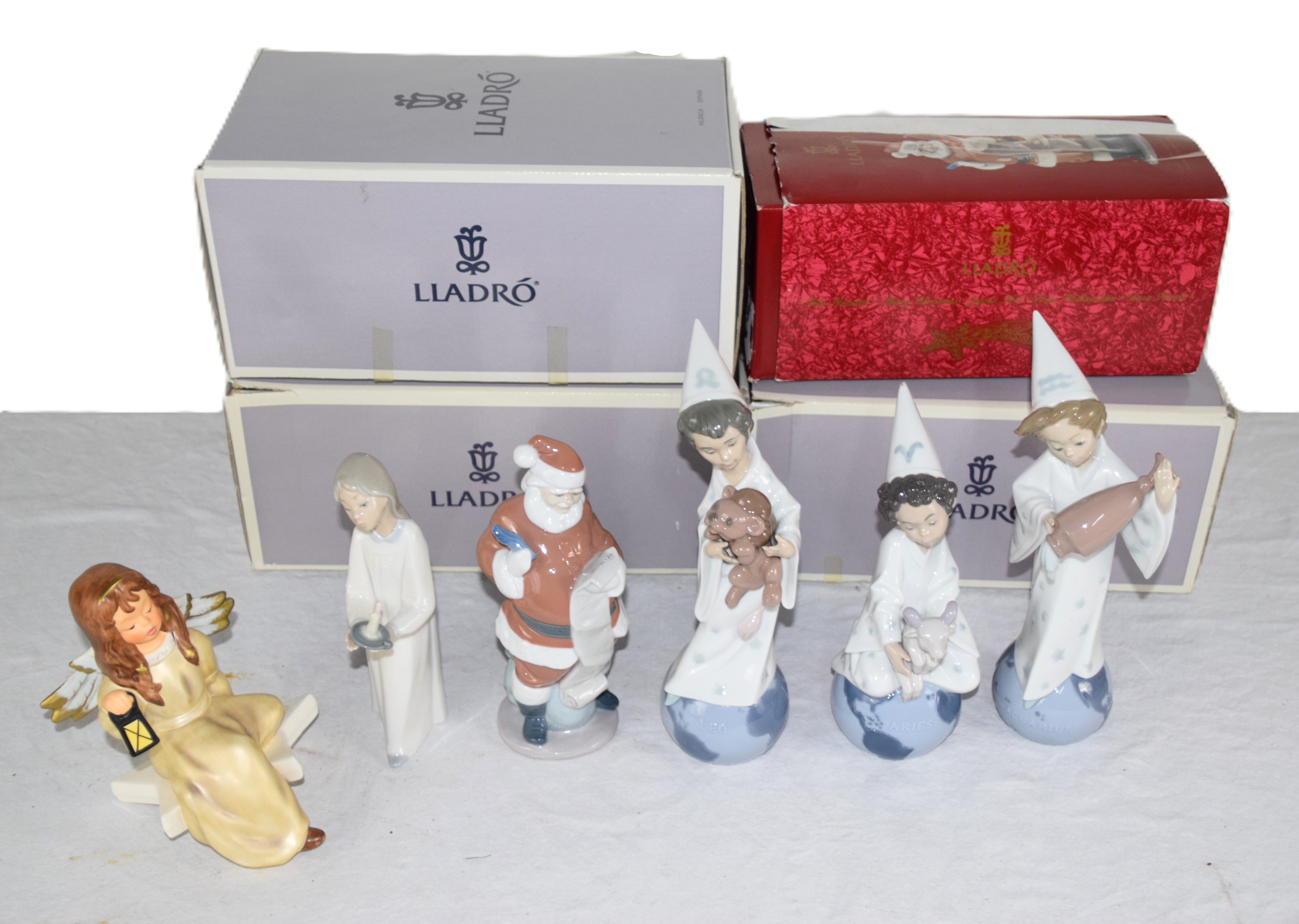 Five Lladro figures to include boy with cap and Lion toy (Leo), Girl with toy ram (Aries) and a girl with a water jug (Aquarius) all with original boxes, a Lladro Santa Claus with original box, a Lladro women holding a candle, and an angel on a star by Goebel. Dimensions: 8″ – 10″