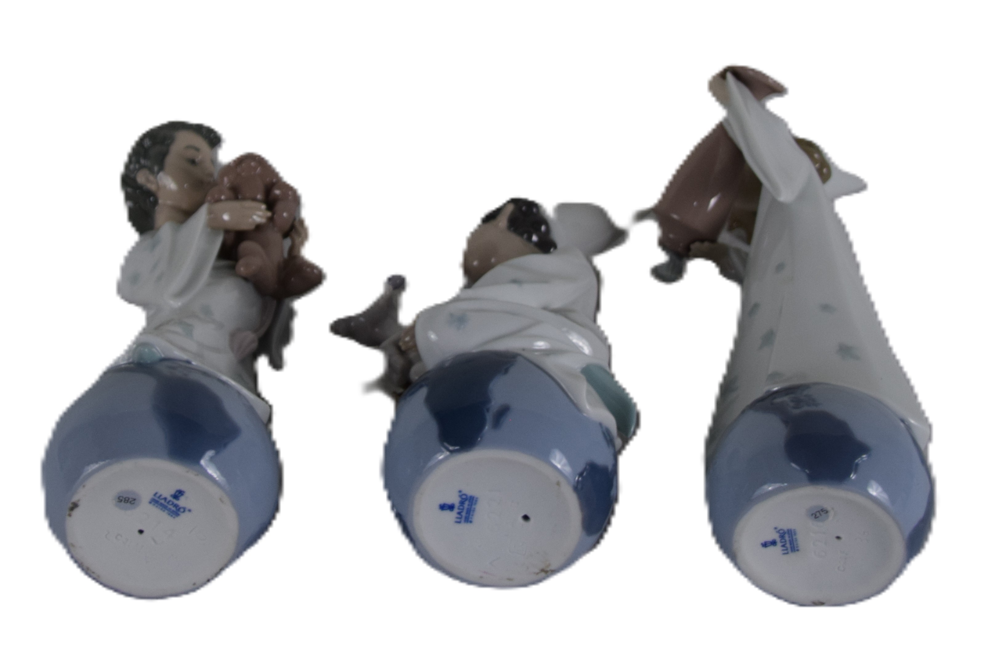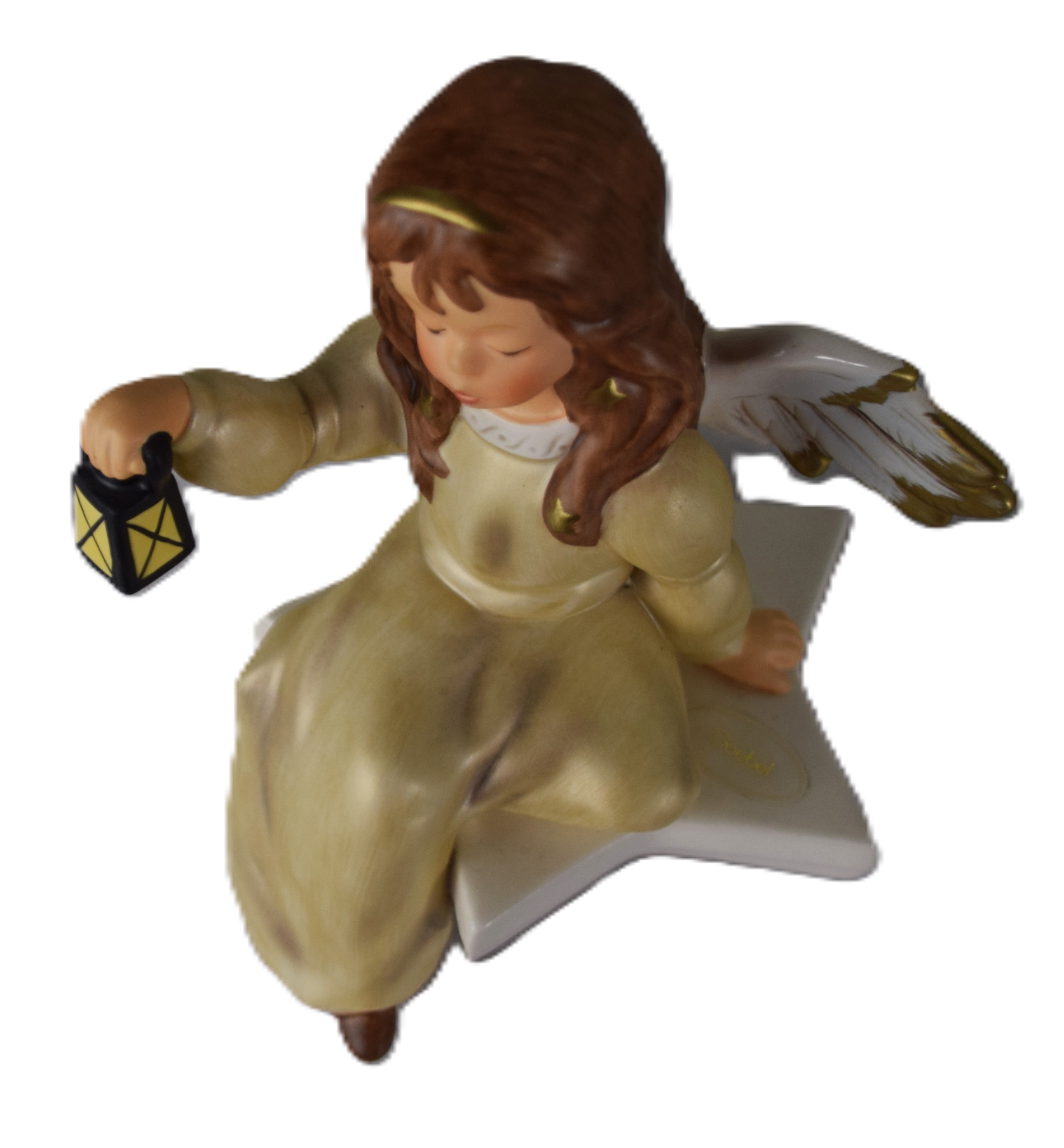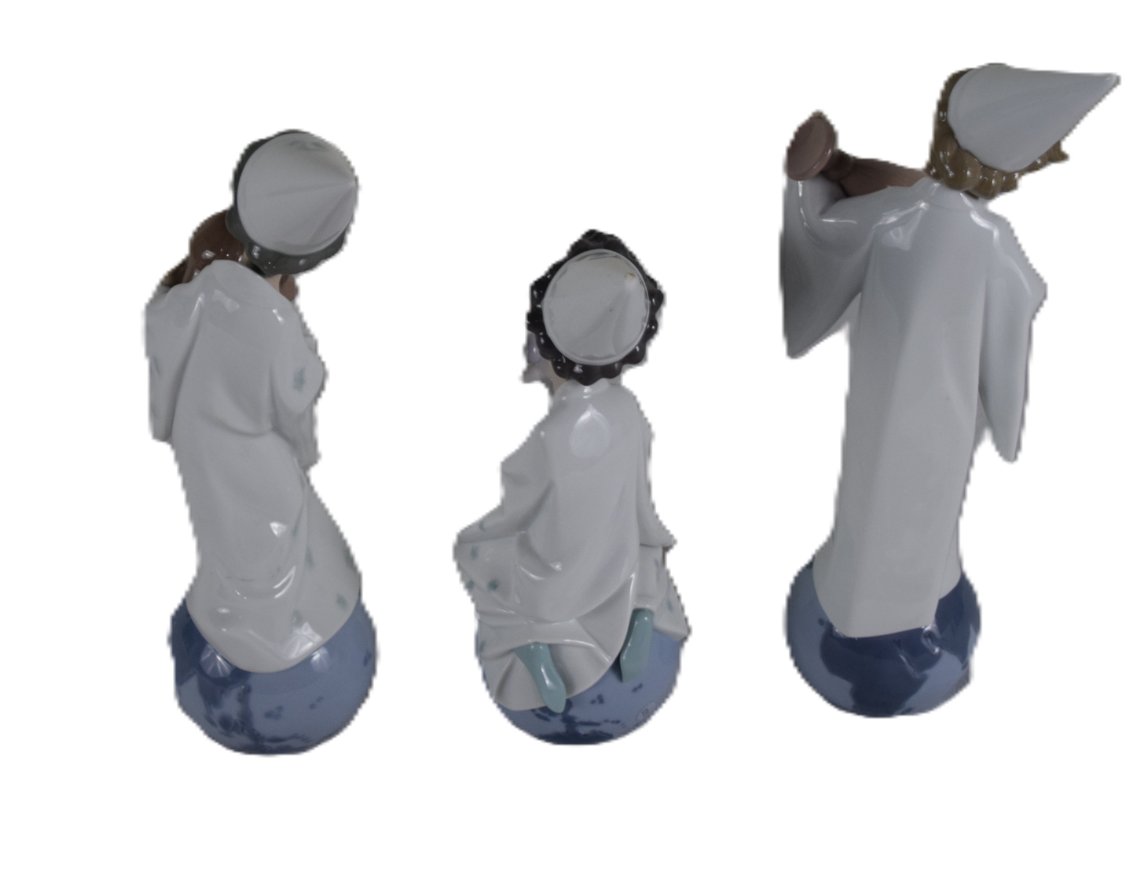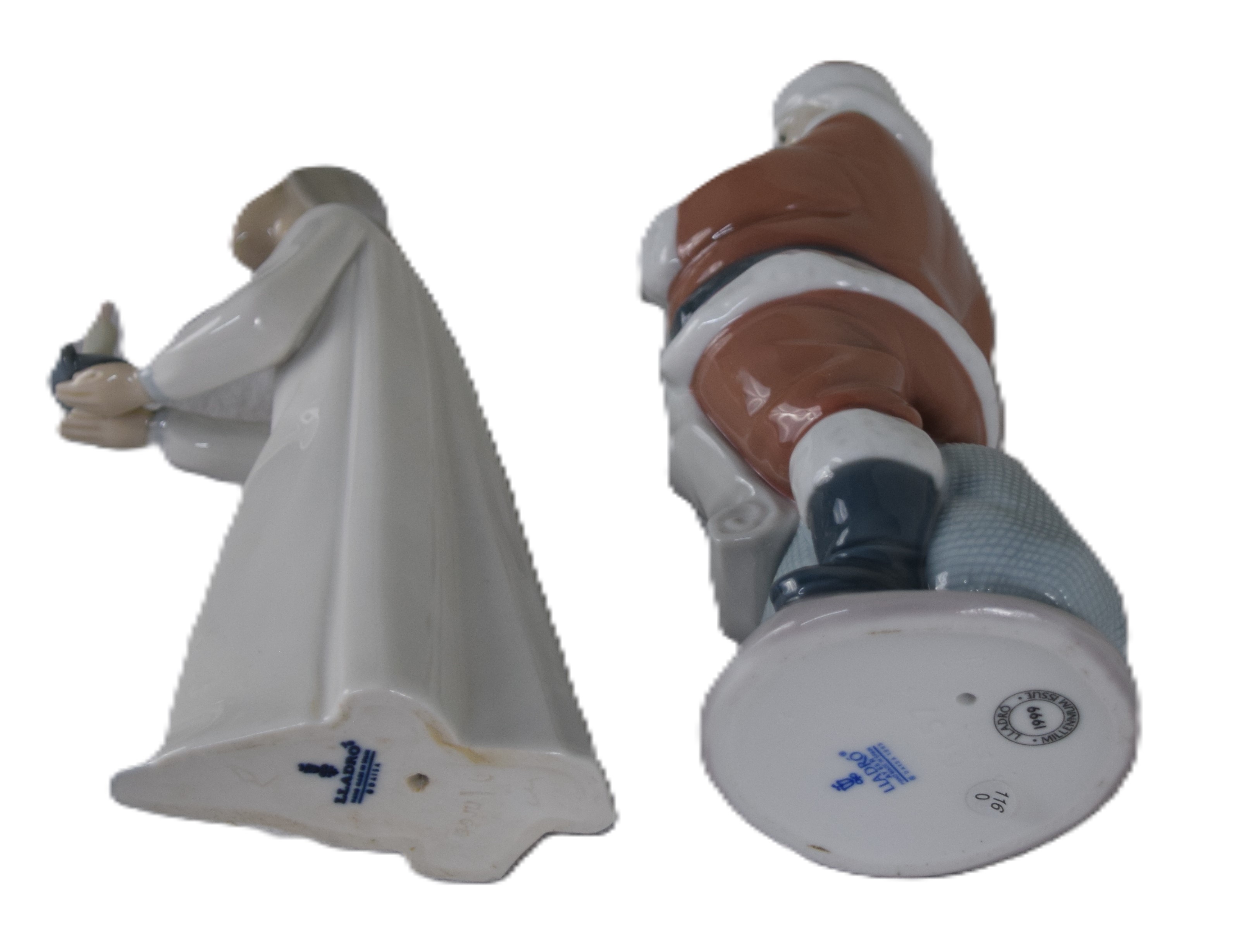 Five Lladro figures to include boy with cap and Lion toy (Leo), Girl with toy ram (Aries) and a girl with a water jug (Aquarius) all with original boxes, a Lladro Santa Claus with original box, a Lladro women holding a candle, and an angel on a star by Goebel. Dimensions: 8″ – 10″