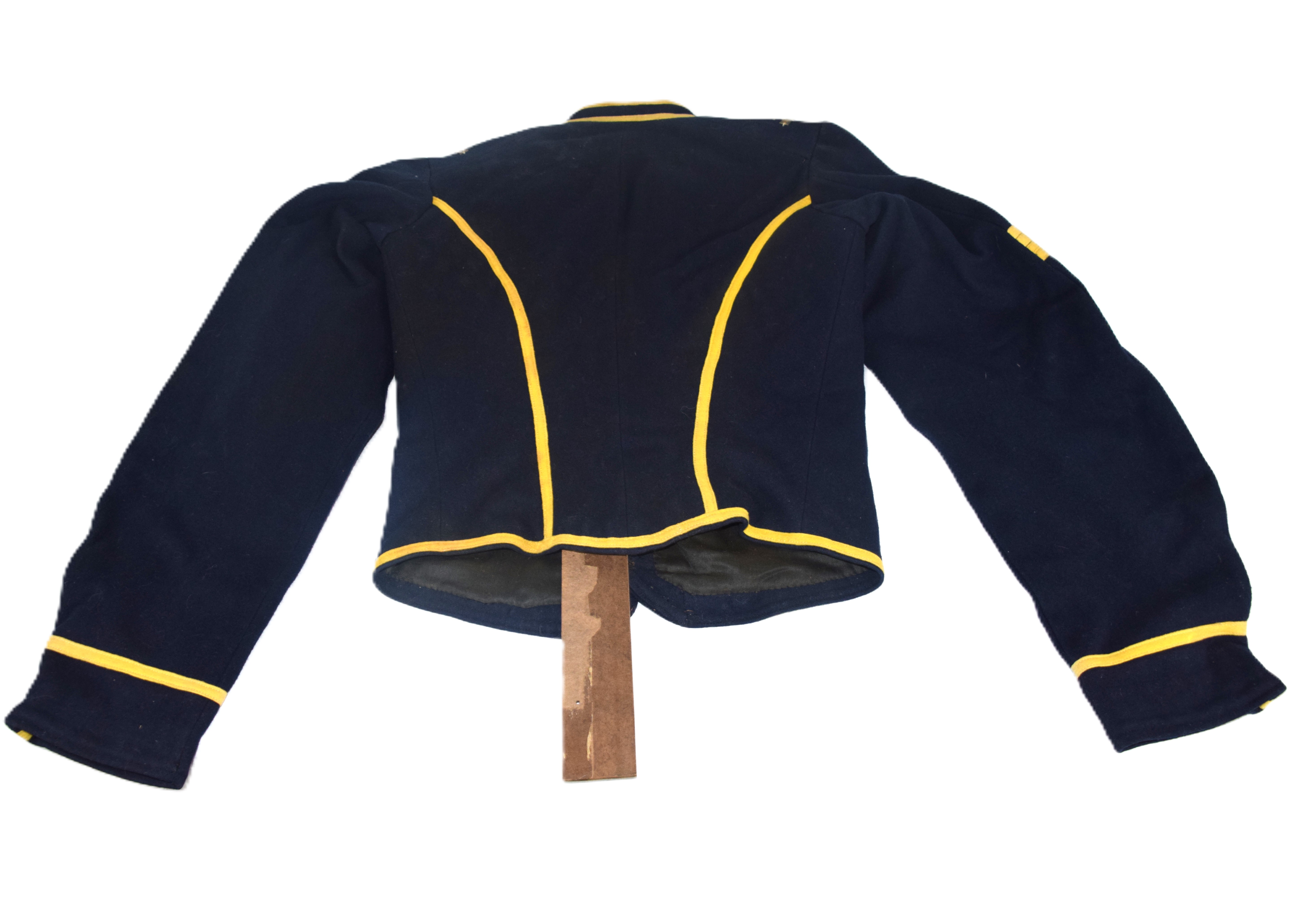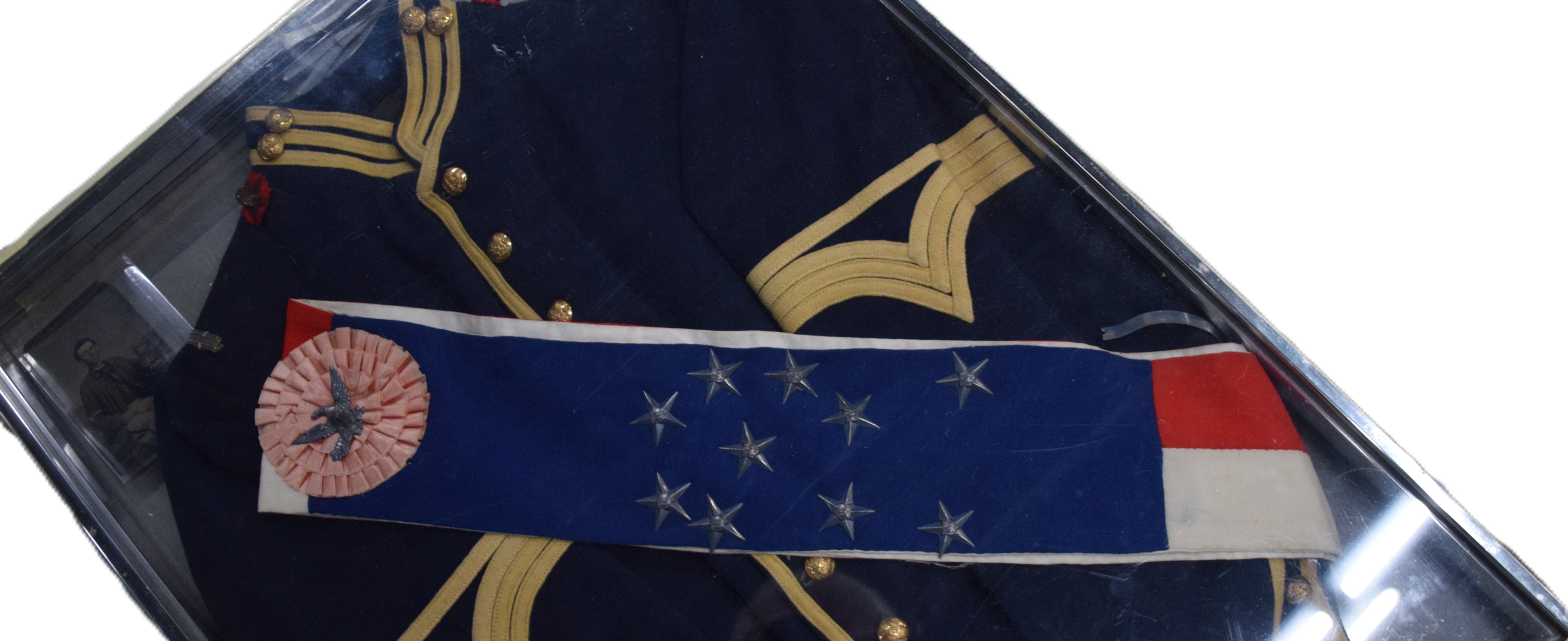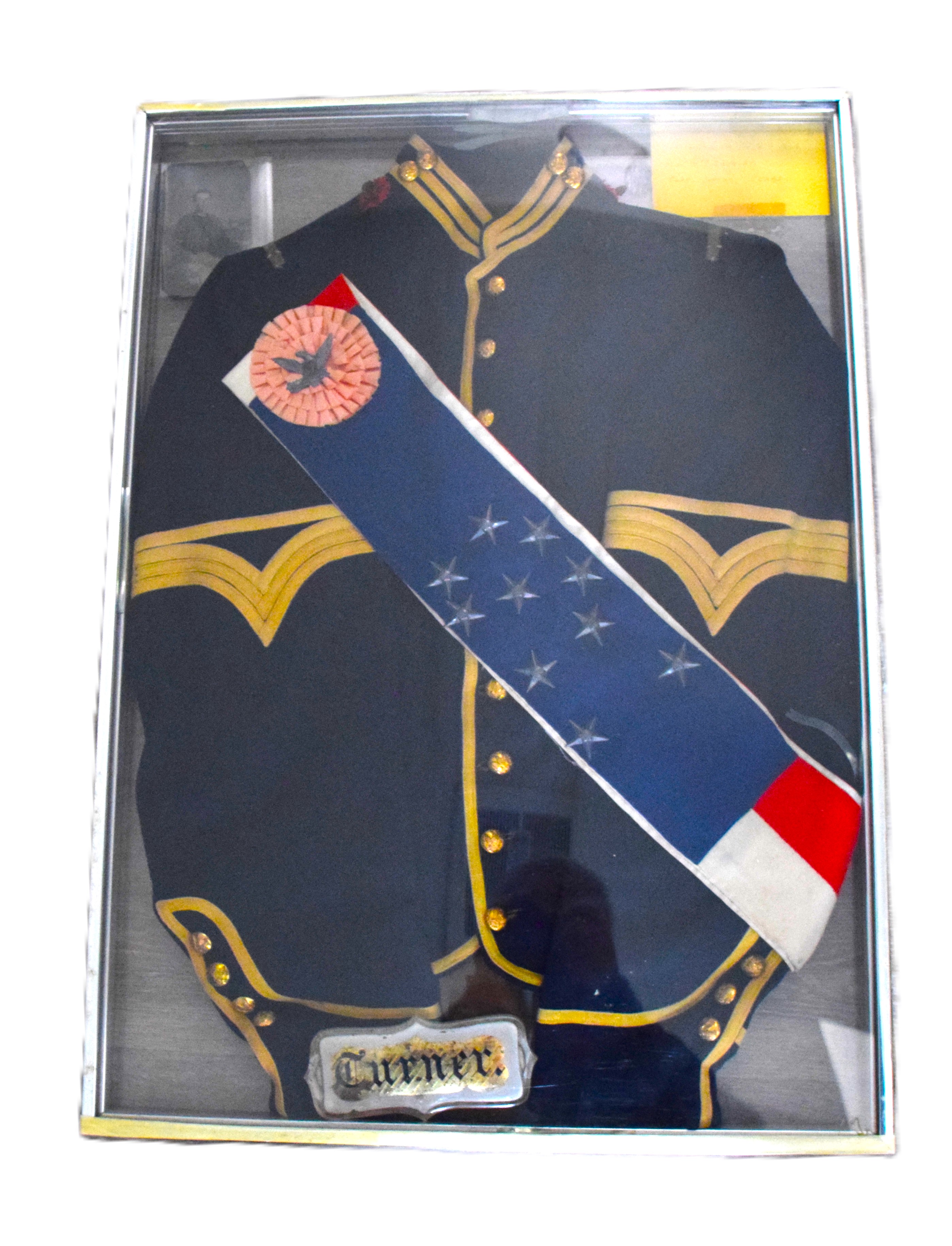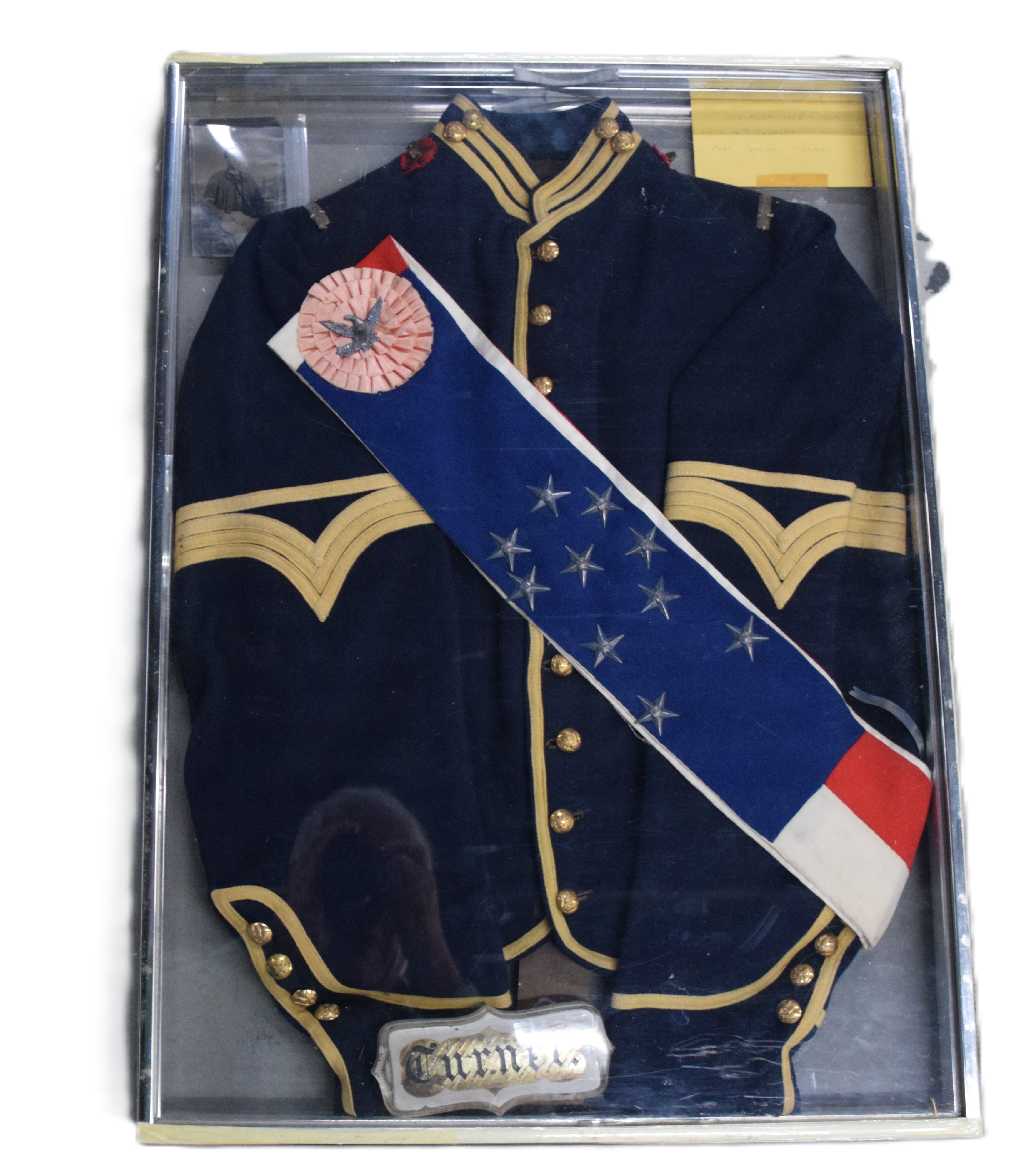Charles H. Turner of Massachusetts enlisted in the 4th US Calvary on his 18th birthday, July 18, 1866 wearing this uniform jacket. The 10 year sash with ten stars was worn later in a GAR parade. Charles first enlisted in the 32nd Mass Volunteers in July 1862 but was discharged in Feb 18, 1863 after the Battle of Fredericksburg. He later performed 90 day service during 1864-5 period. He served at Fort Concho, Texas from 1866-72 with the 4th Cavalry who fought with the Comanche and Kiowa tribes. Several letters by relatives and friends to him while serving at Fort Concho as well as his bible and photos included in the collection.