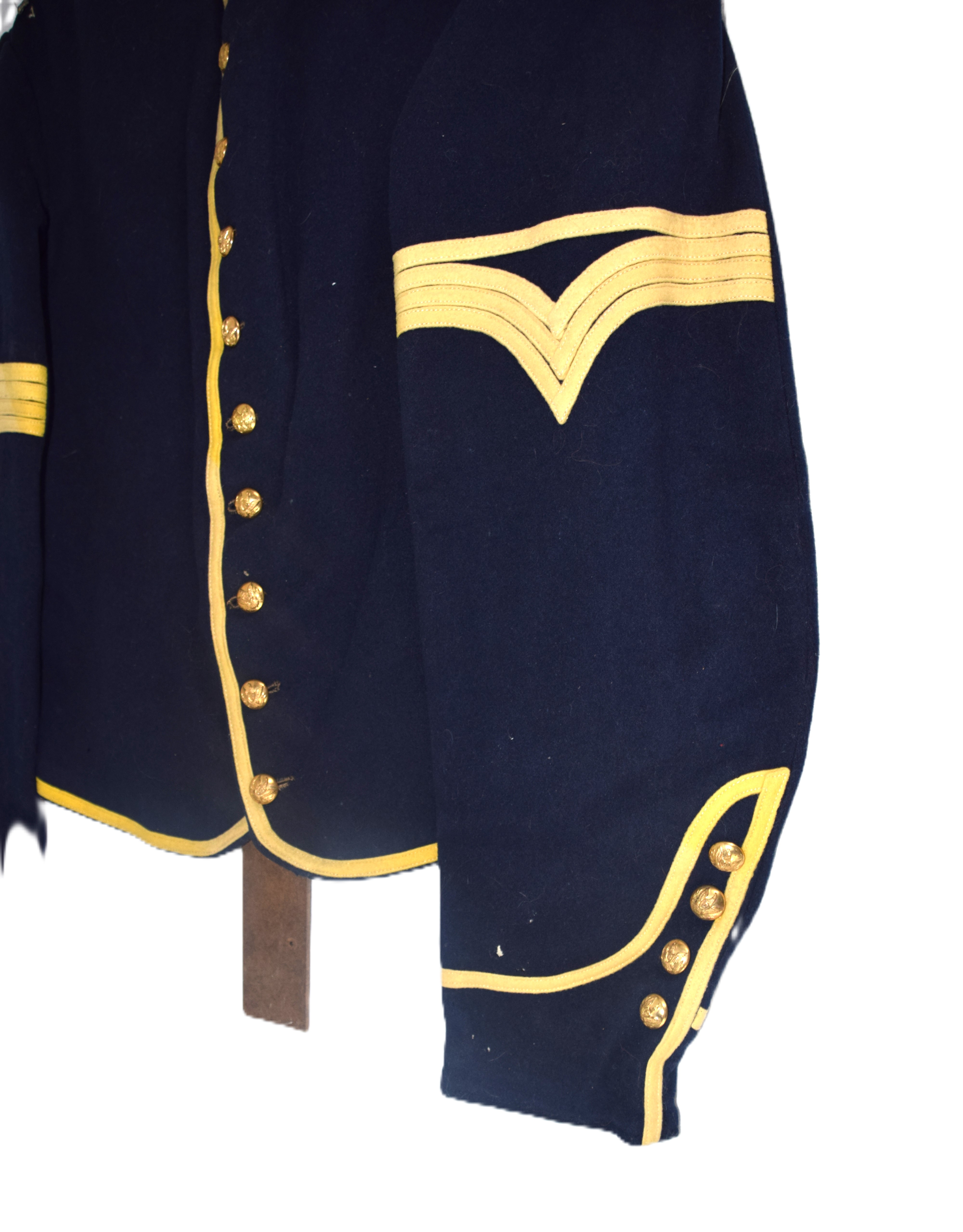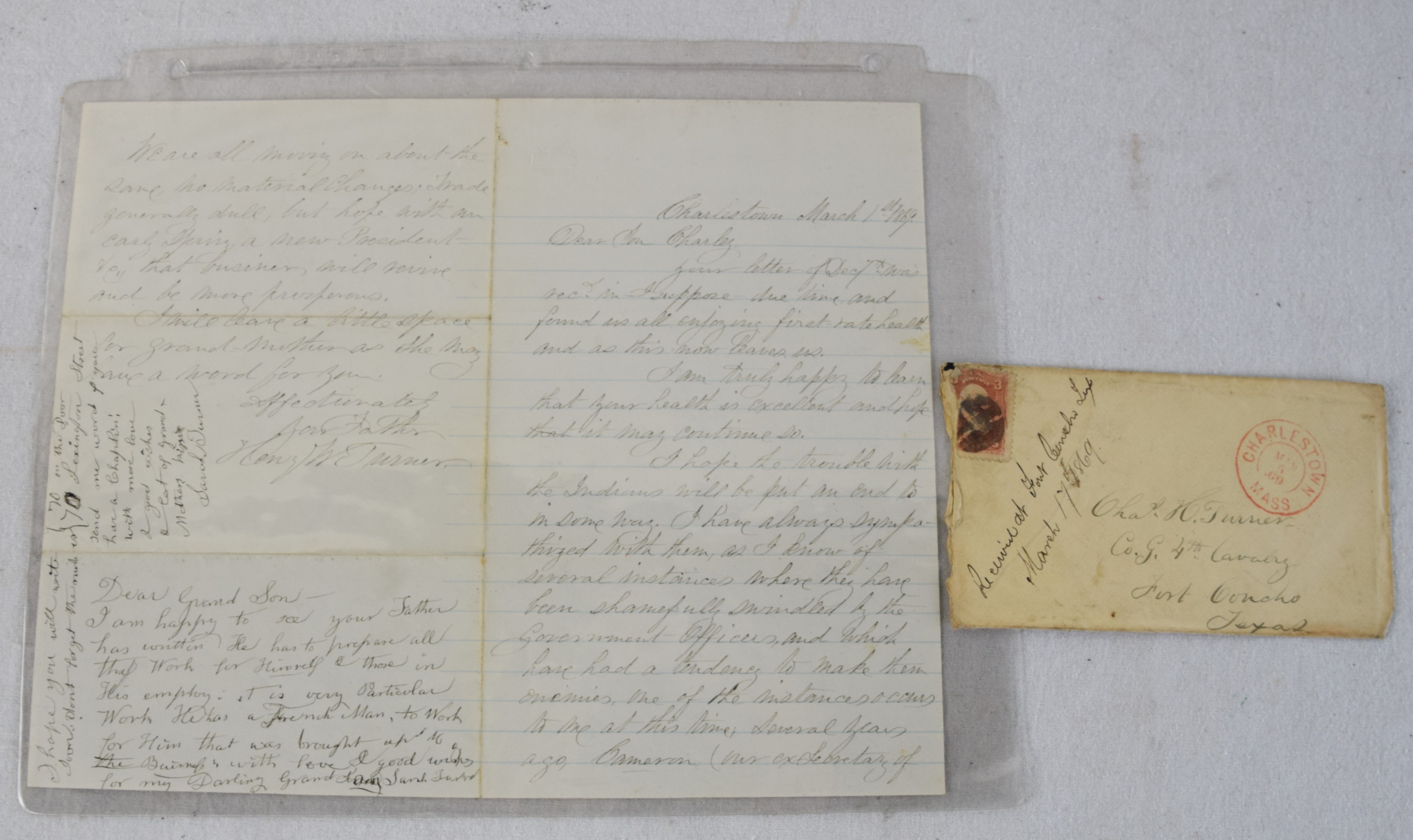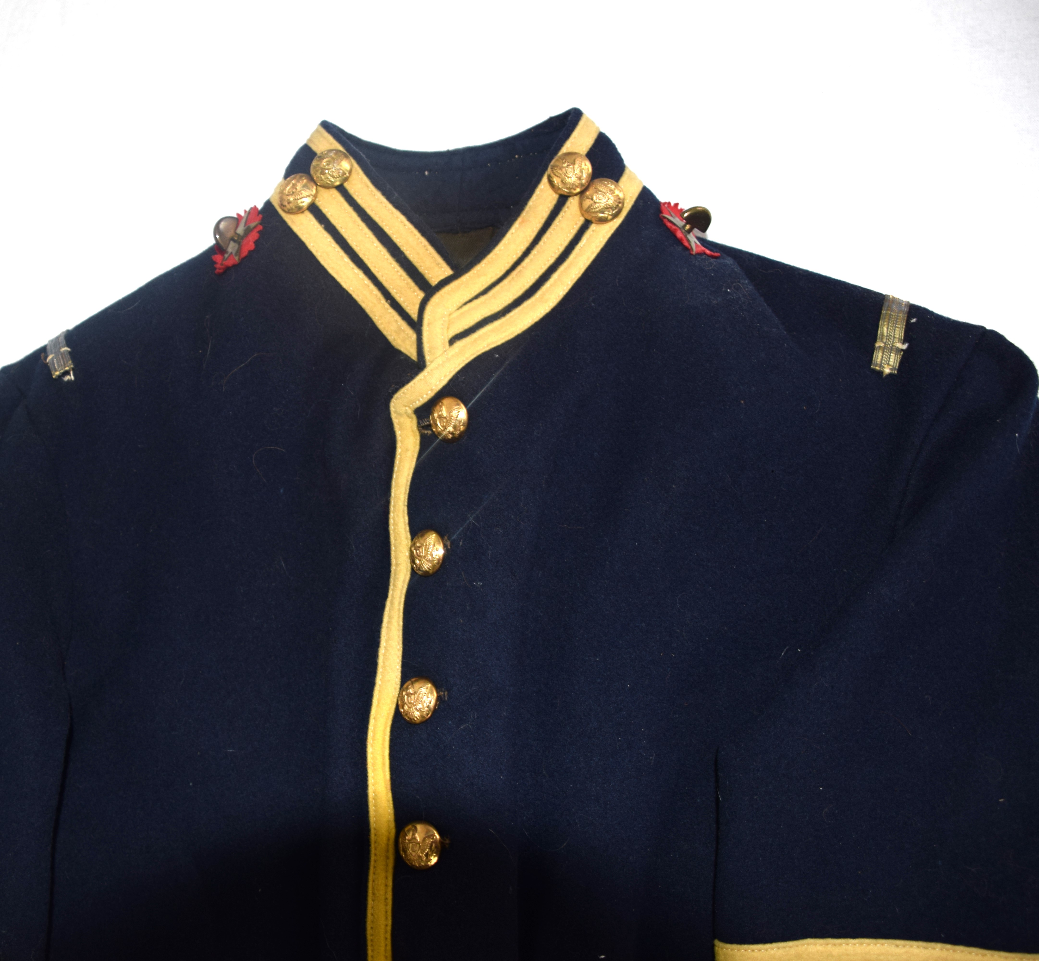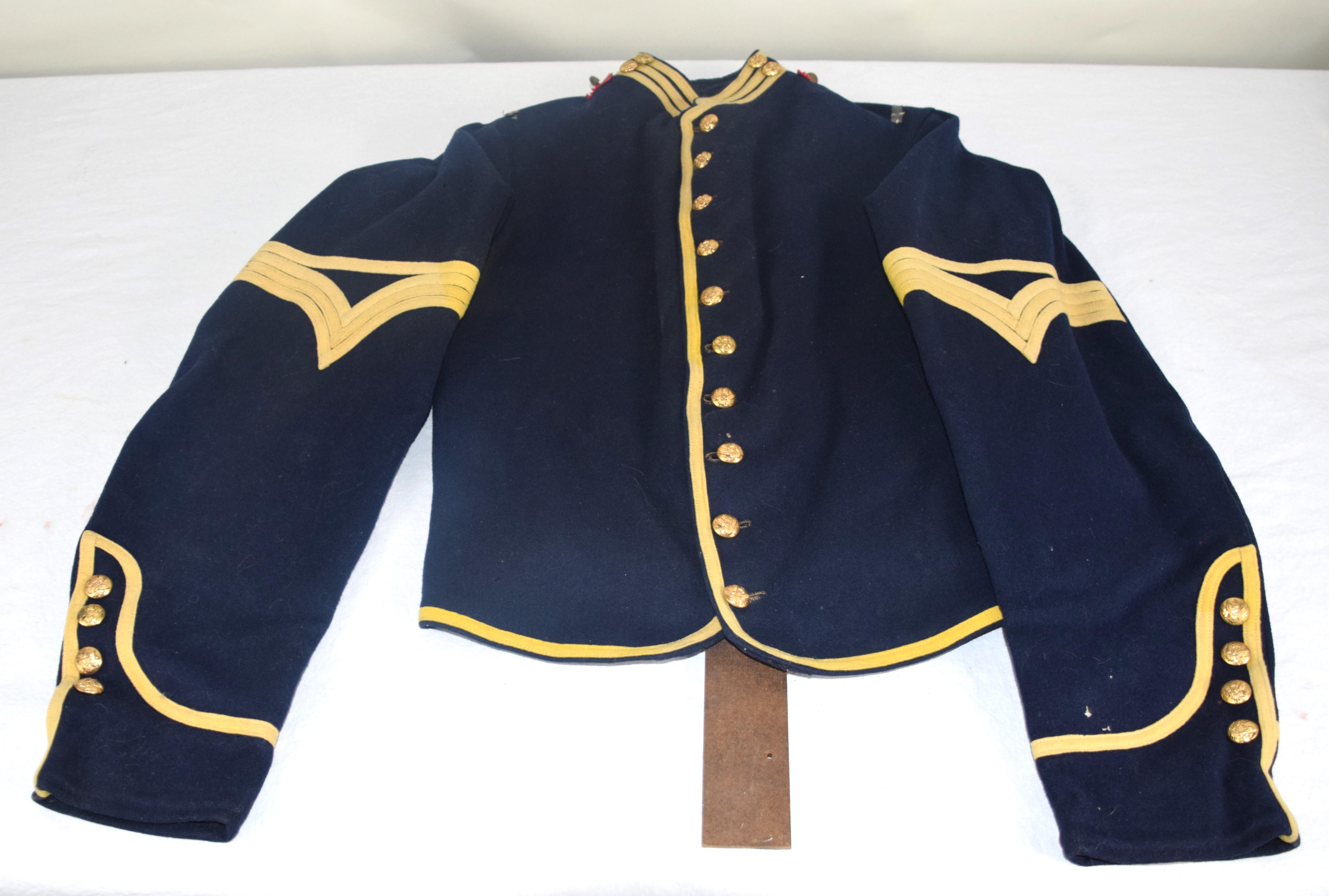 Charles H. Turner of Massachusetts enlisted in the 4th US Calvary on his 18th birthday, July 18, 1866 wearing this uniform jacket. The 10 year sash with ten stars was worn later in a GAR parade. Charles first enlisted in the 32nd Mass Volunteers in July 1862 but was discharged in Feb 18, 1863 after the Battle of Fredericksburg. He later performed 90 day service during 1864-5 period. He served at Fort Concho, Texas from 1866-72 with the 4th Cavalry who fought with the Comanche and Kiowa tribes. Several letters by relatives and friends to him while serving at Fort Concho as well as his bible and photos included in the collection.