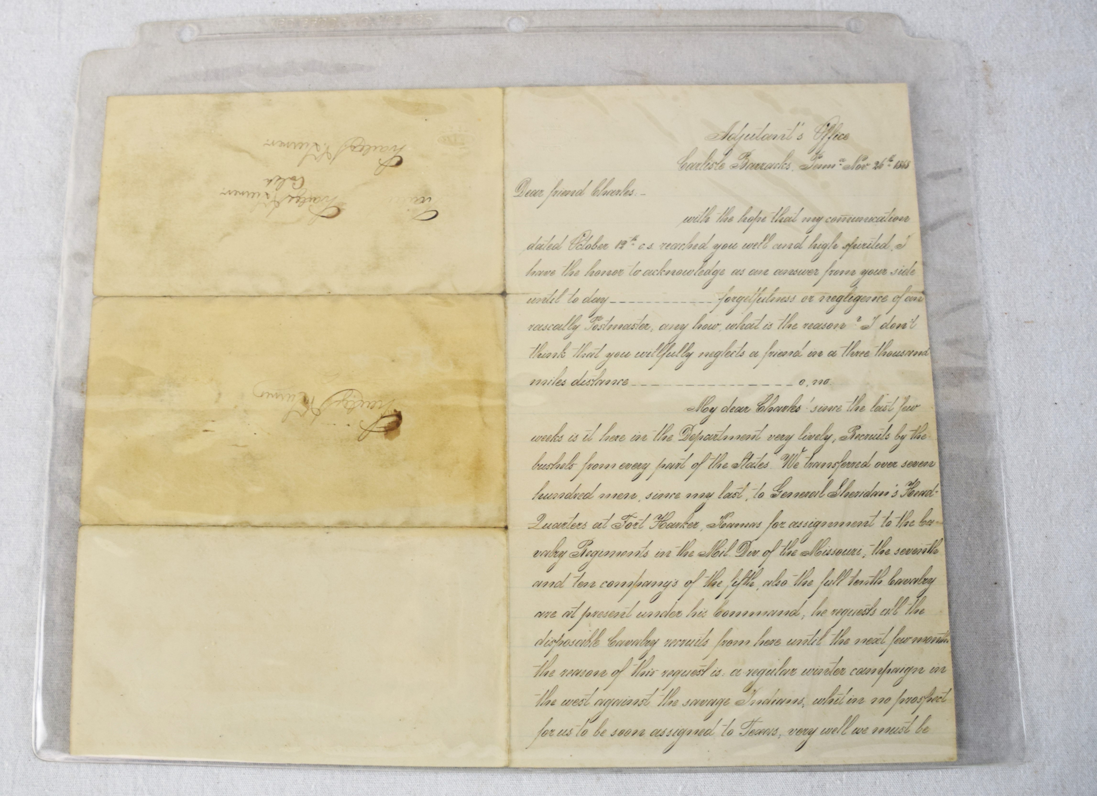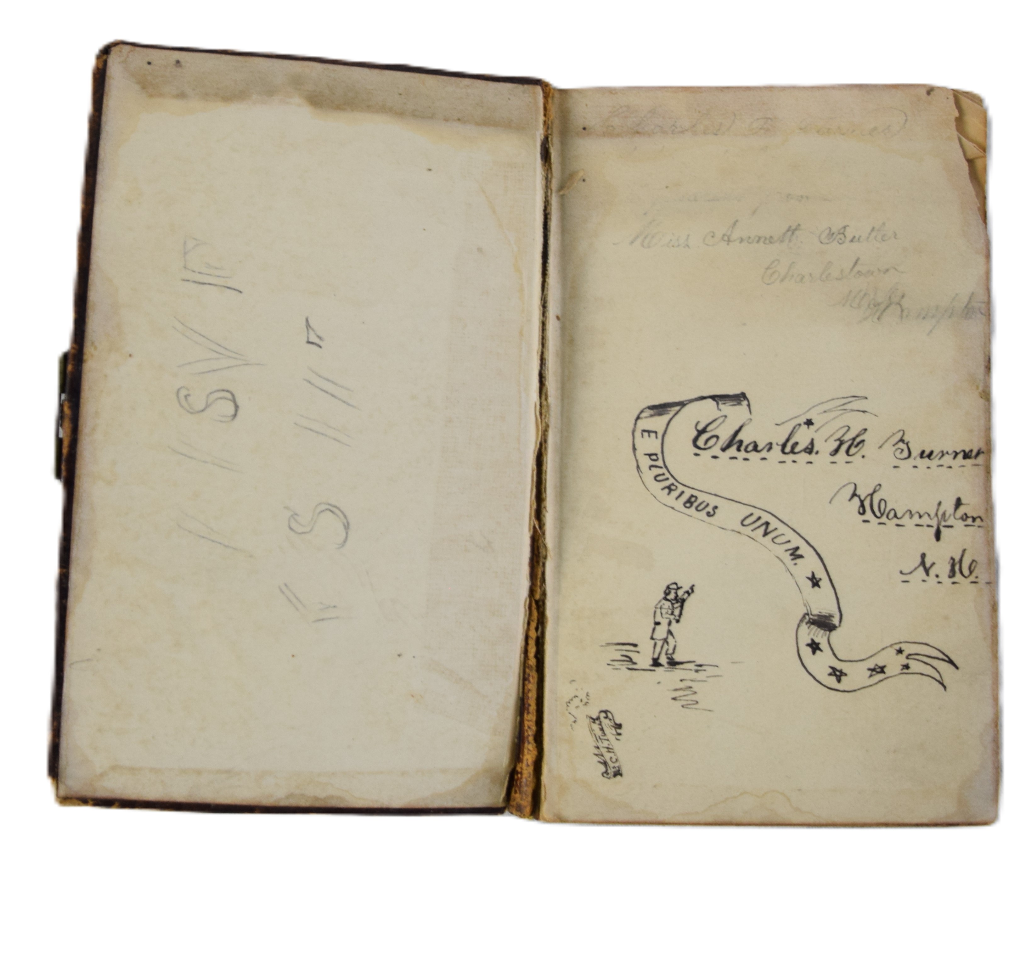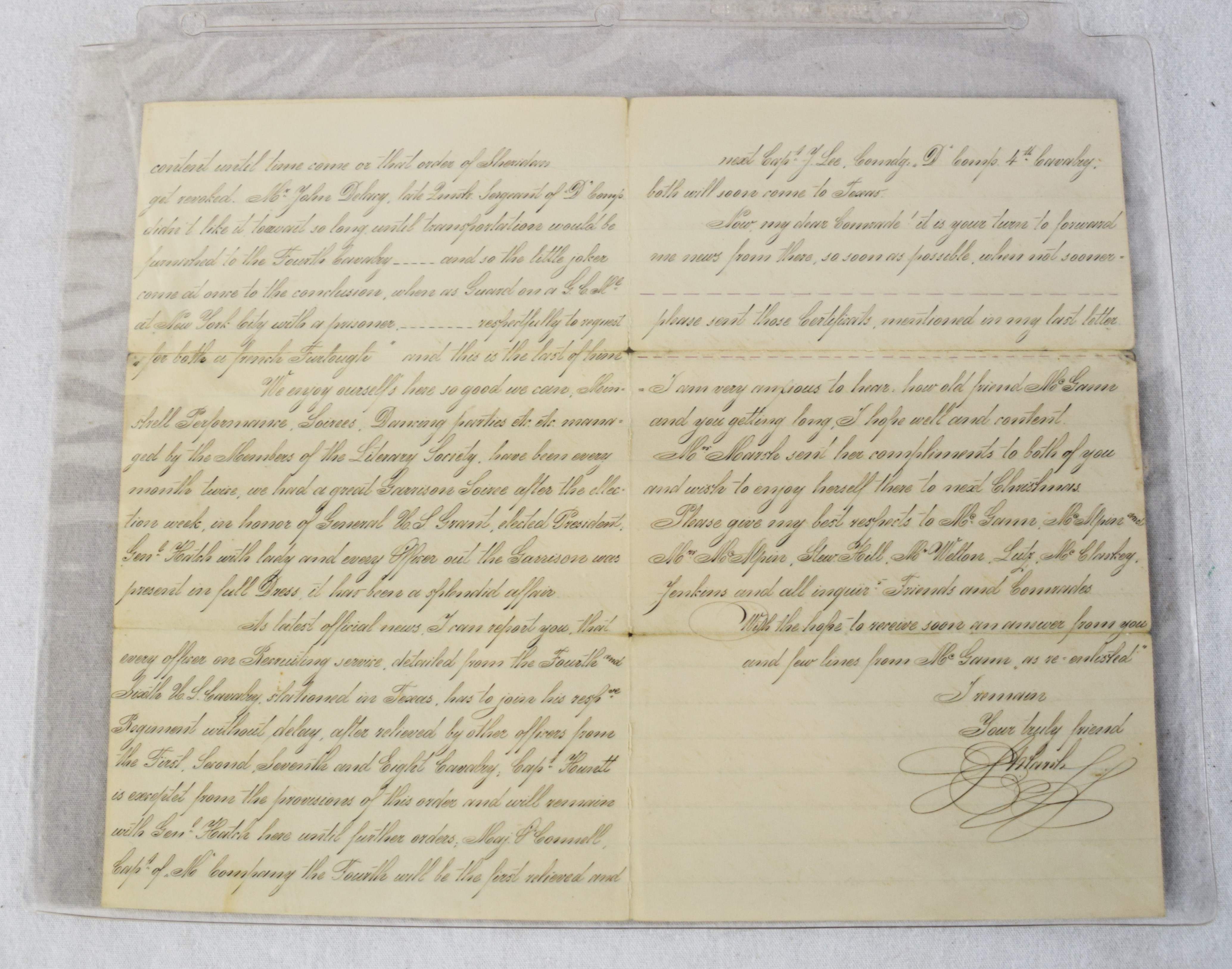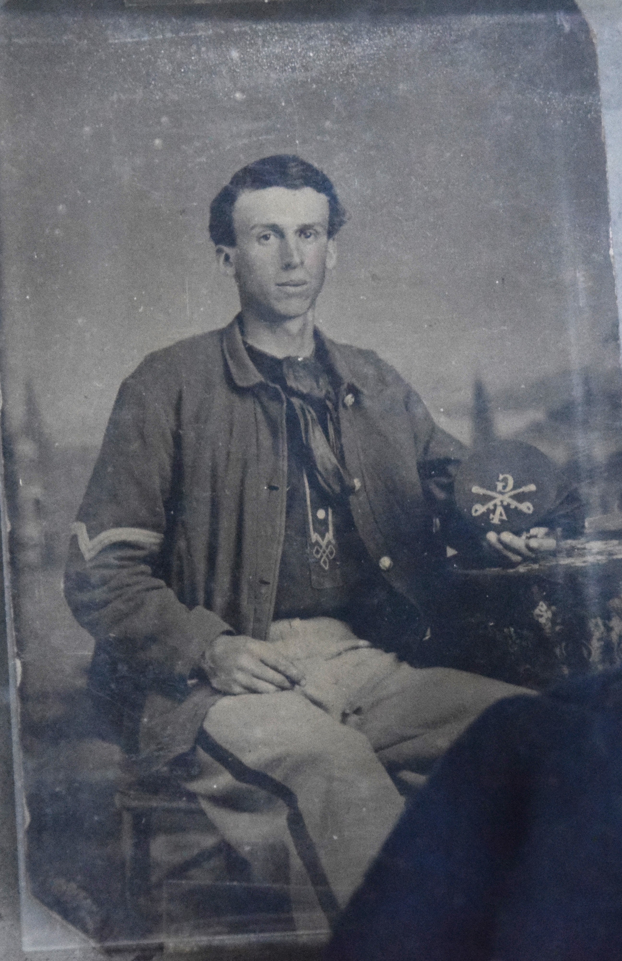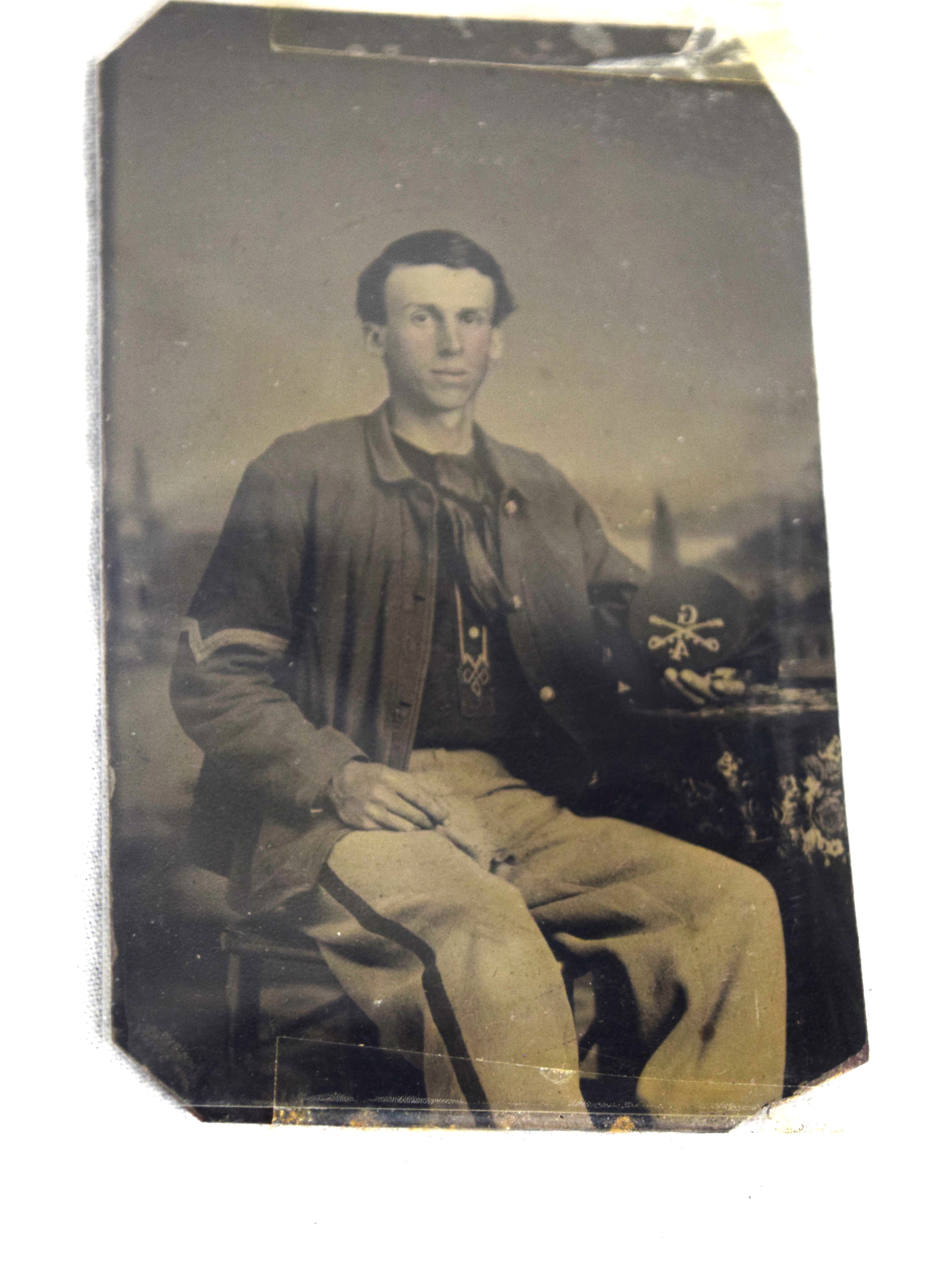 Charles H. Turner of Massachusetts enlisted in the 4th US Calvary on his 18th birthday, July 18, 1866 wearing this uniform jacket. The 10 year sash with ten stars was worn later in a GAR parade. Charles first enlisted in the 32nd Mass Volunteers in July 1862 but was discharged in Feb 18, 1863 after the Battle of Fredericksburg. He later performed 90 day service during 1864-5 period. He served at Fort Concho, Texas from 1866-72 with the 4th Cavalry who fought with the Comanche and Kiowa tribes. Several letters by relatives and friends to him while serving at Fort Concho as well as his bible and photos included in the collection.