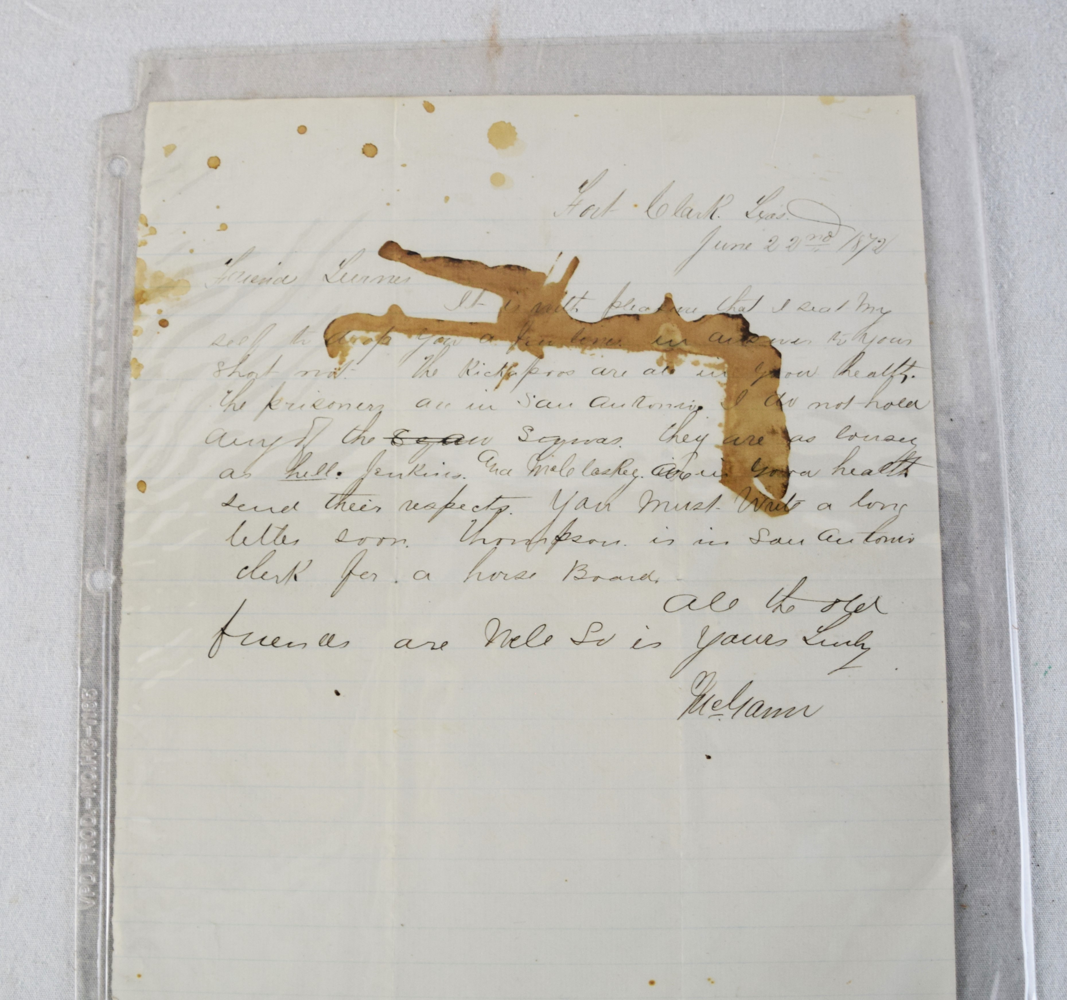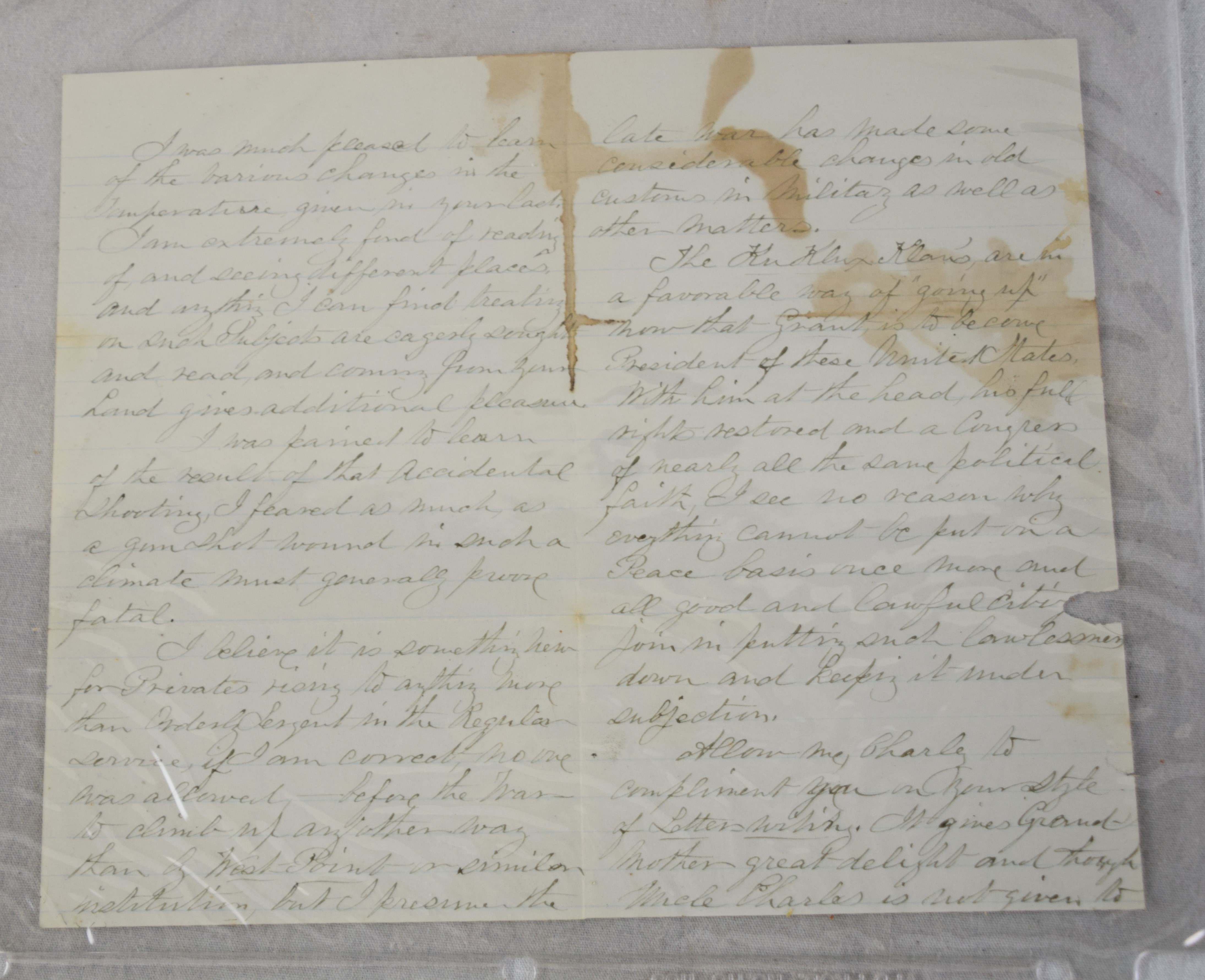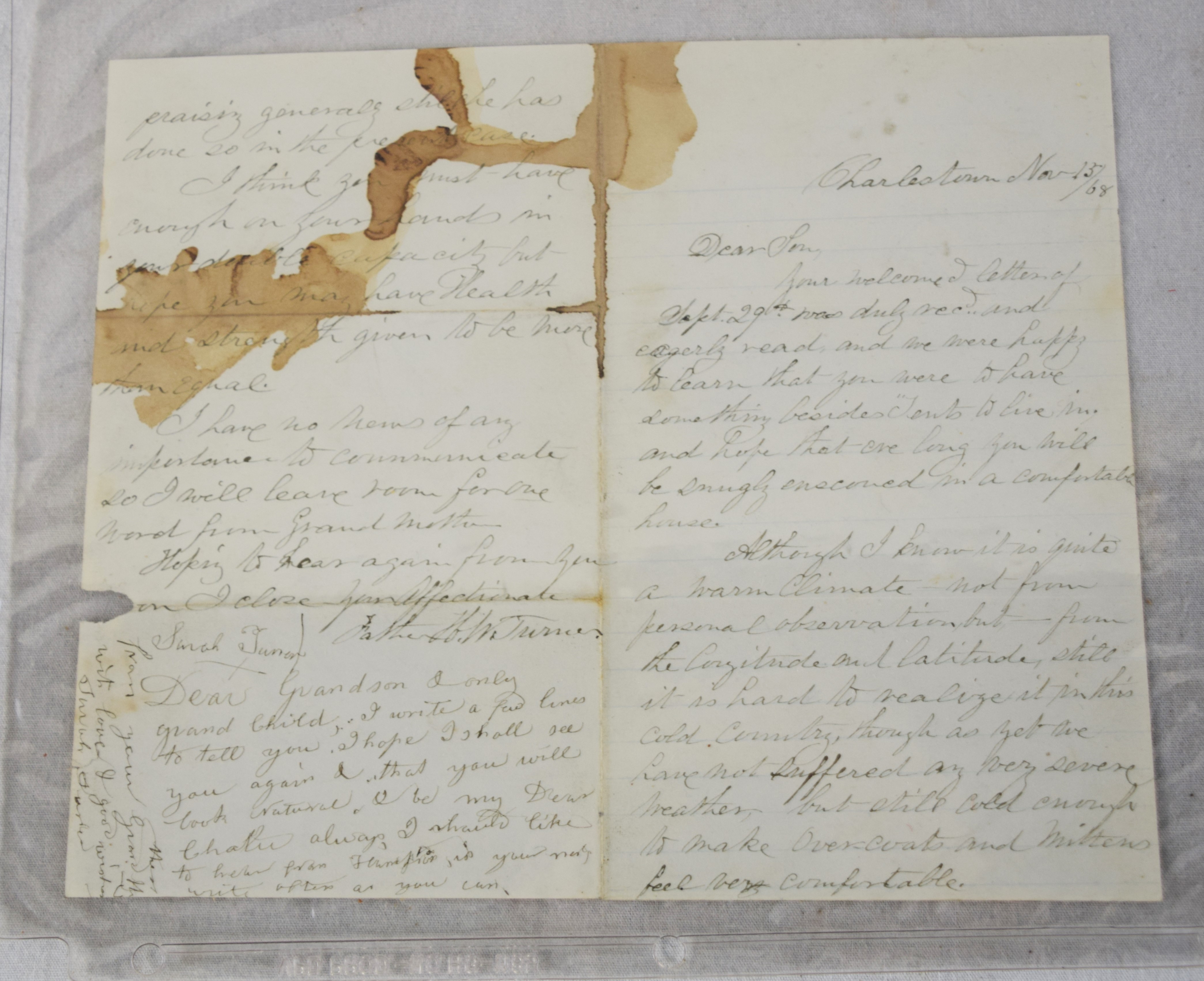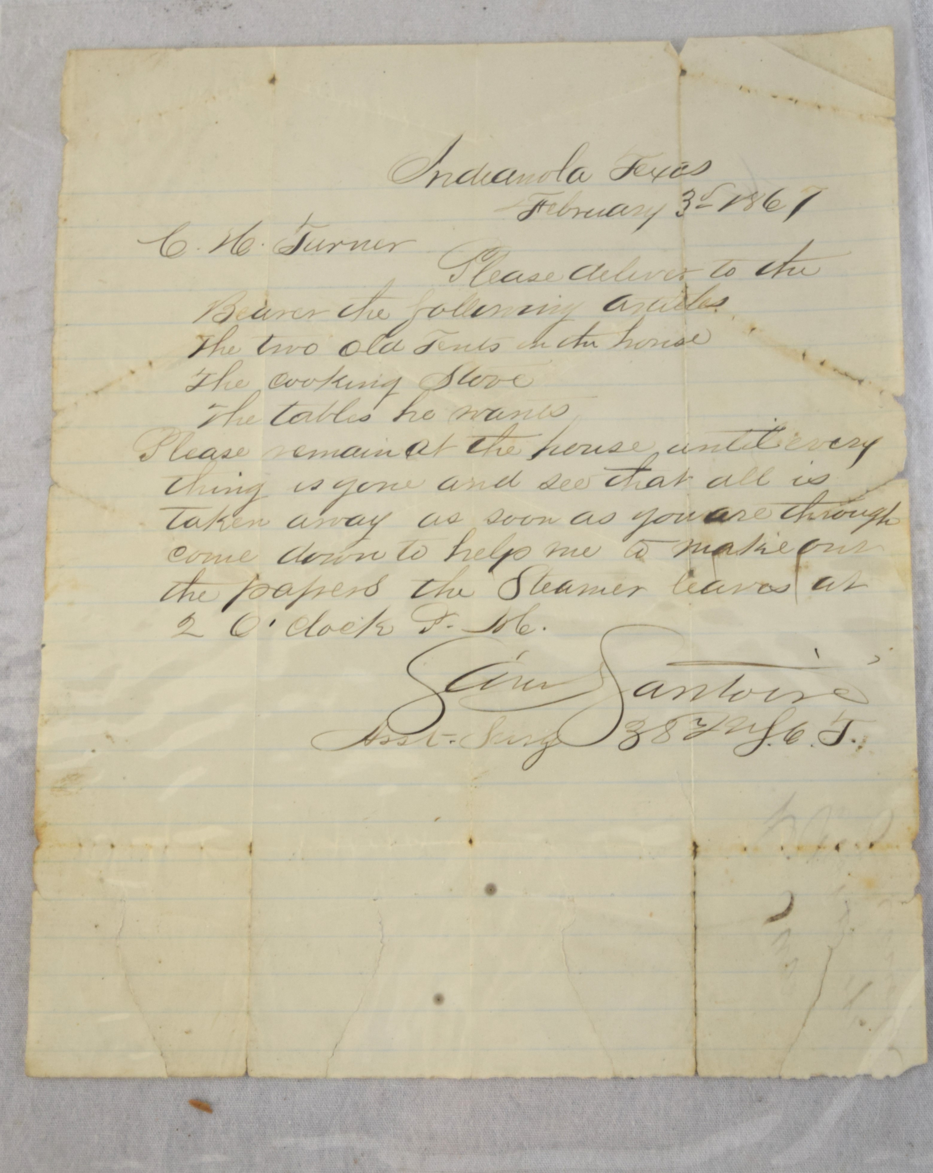 Charles H. Turner of Massachusetts enlisted in the 4th US Calvary on his 18th birthday, July 18, 1866 wearing this uniform jacket. The 10 year sash with ten stars was worn later in a GAR parade. Charles first enlisted in the 32nd Mass Volunteers in July 1862 but was discharged in Feb 18, 1863 after the Battle of Fredericksburg. He later performed 90 day service during 1864-5 period. He served at Fort Concho, Texas from 1866-72 with the 4th Cavalry who fought with the Comanche and Kiowa tribes. Several letters by relatives and friends to him while serving at Fort Concho as well as his bible and photos included in the collection.