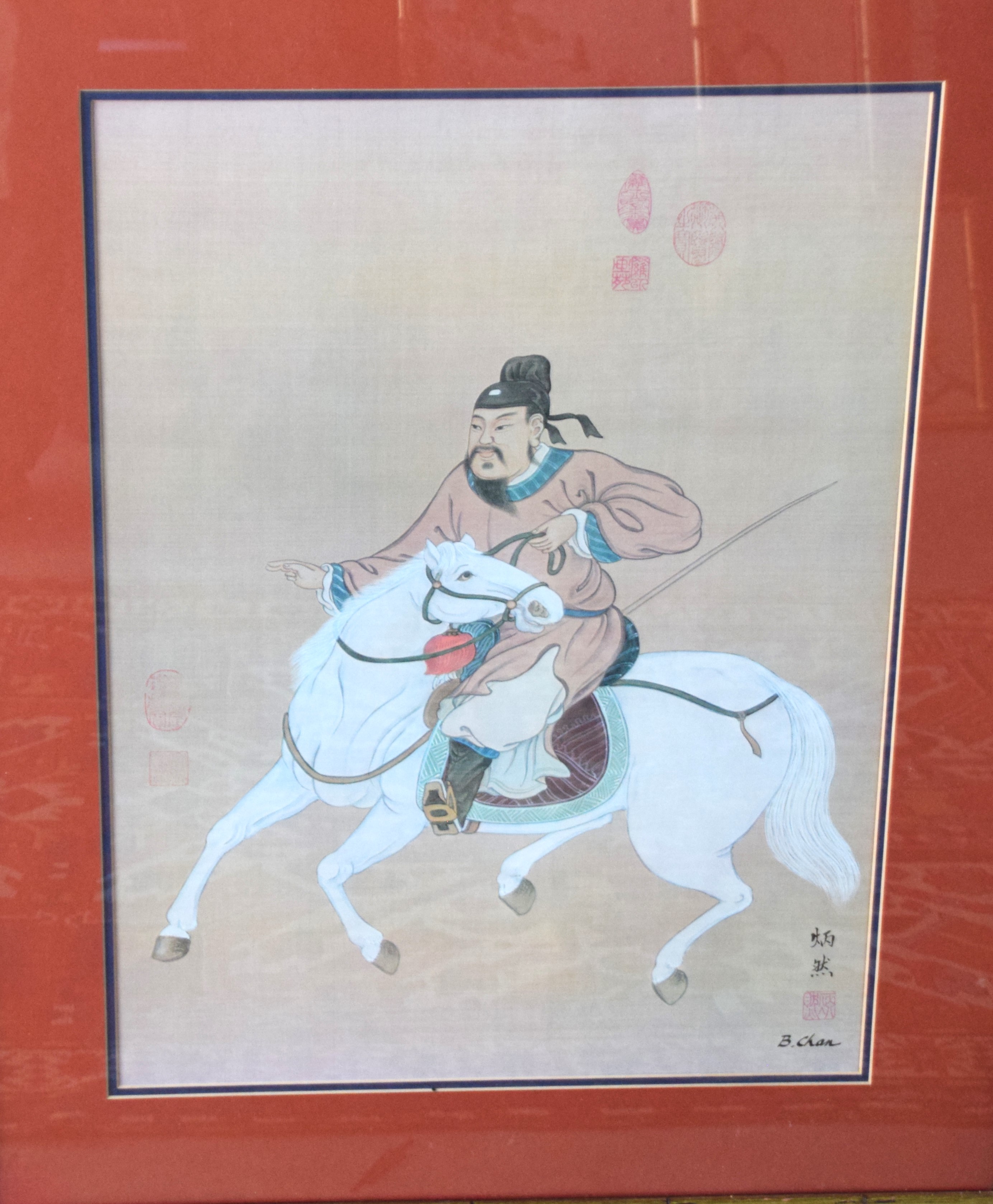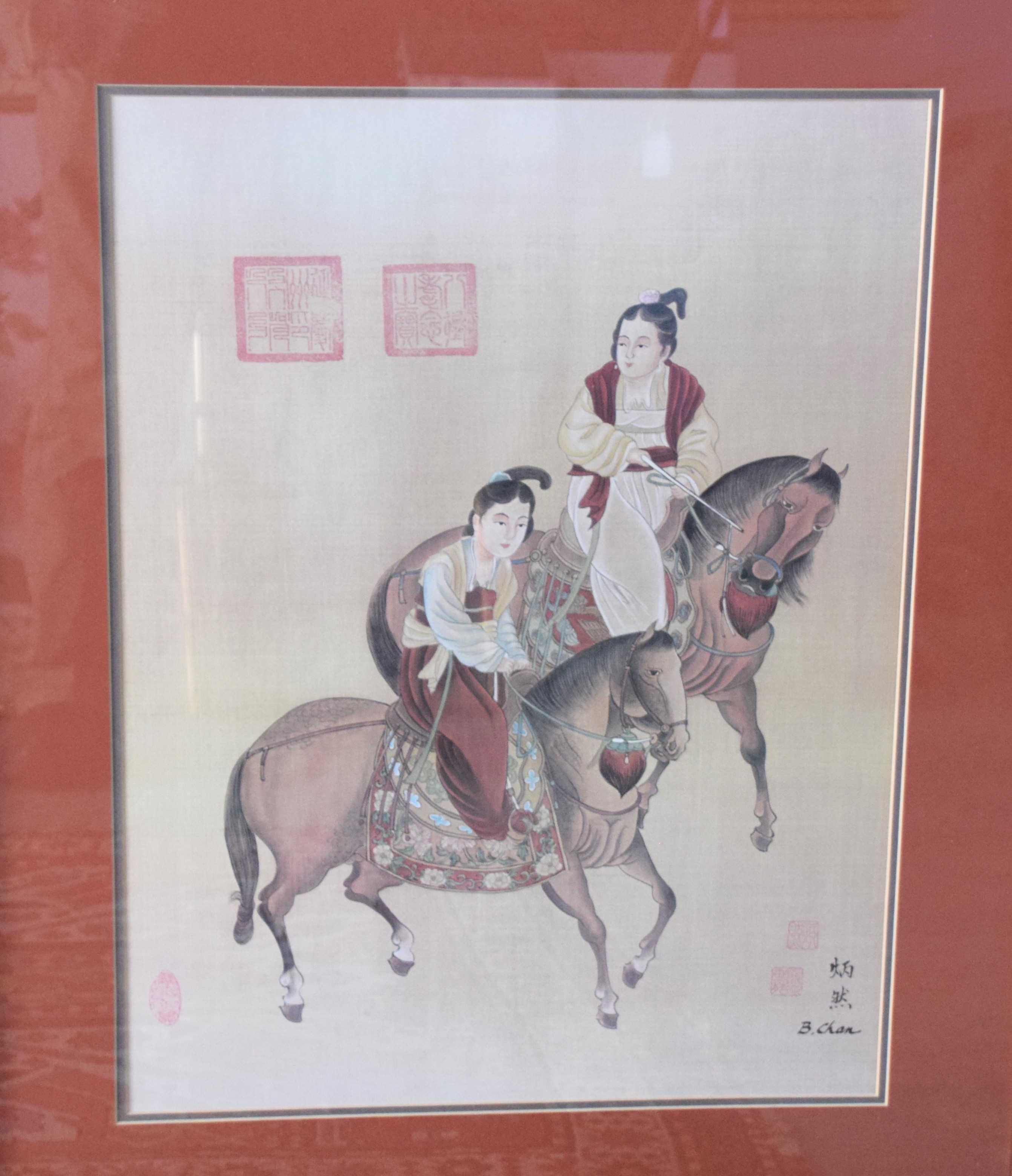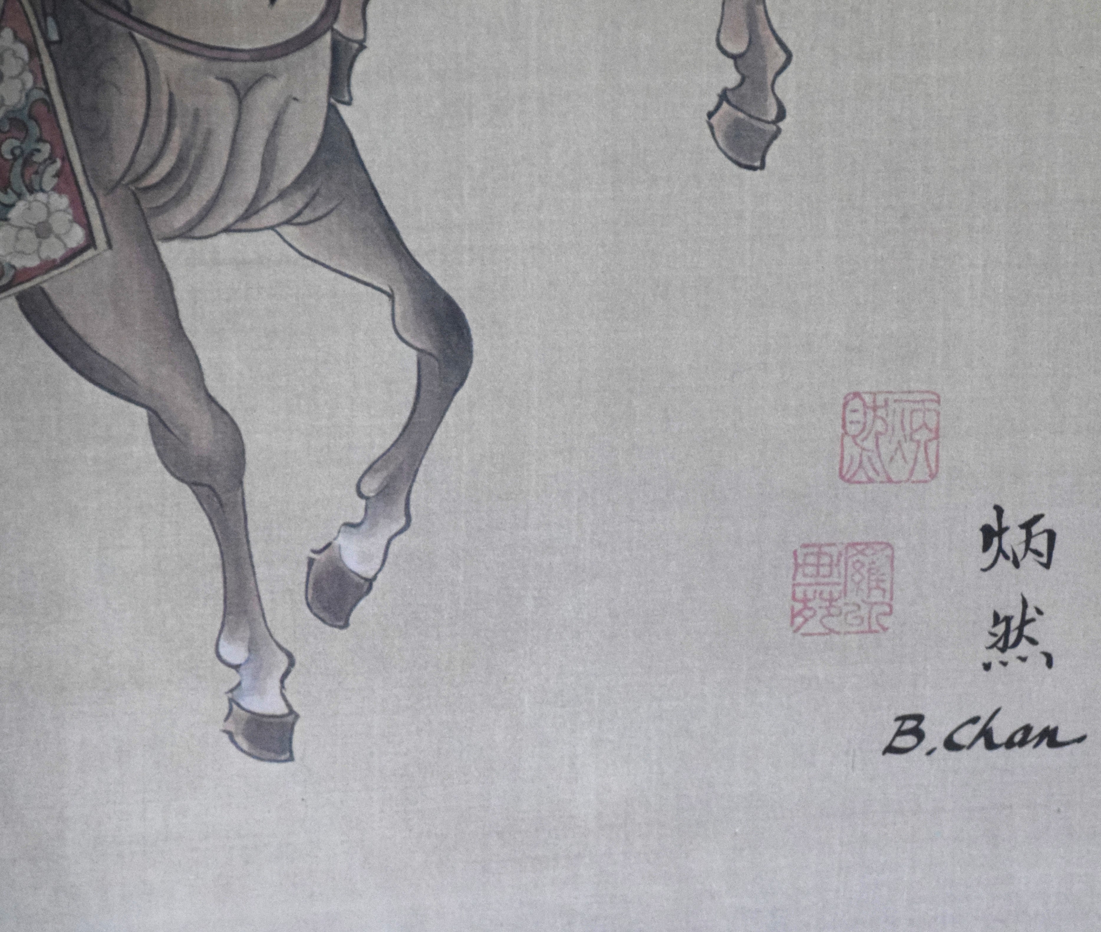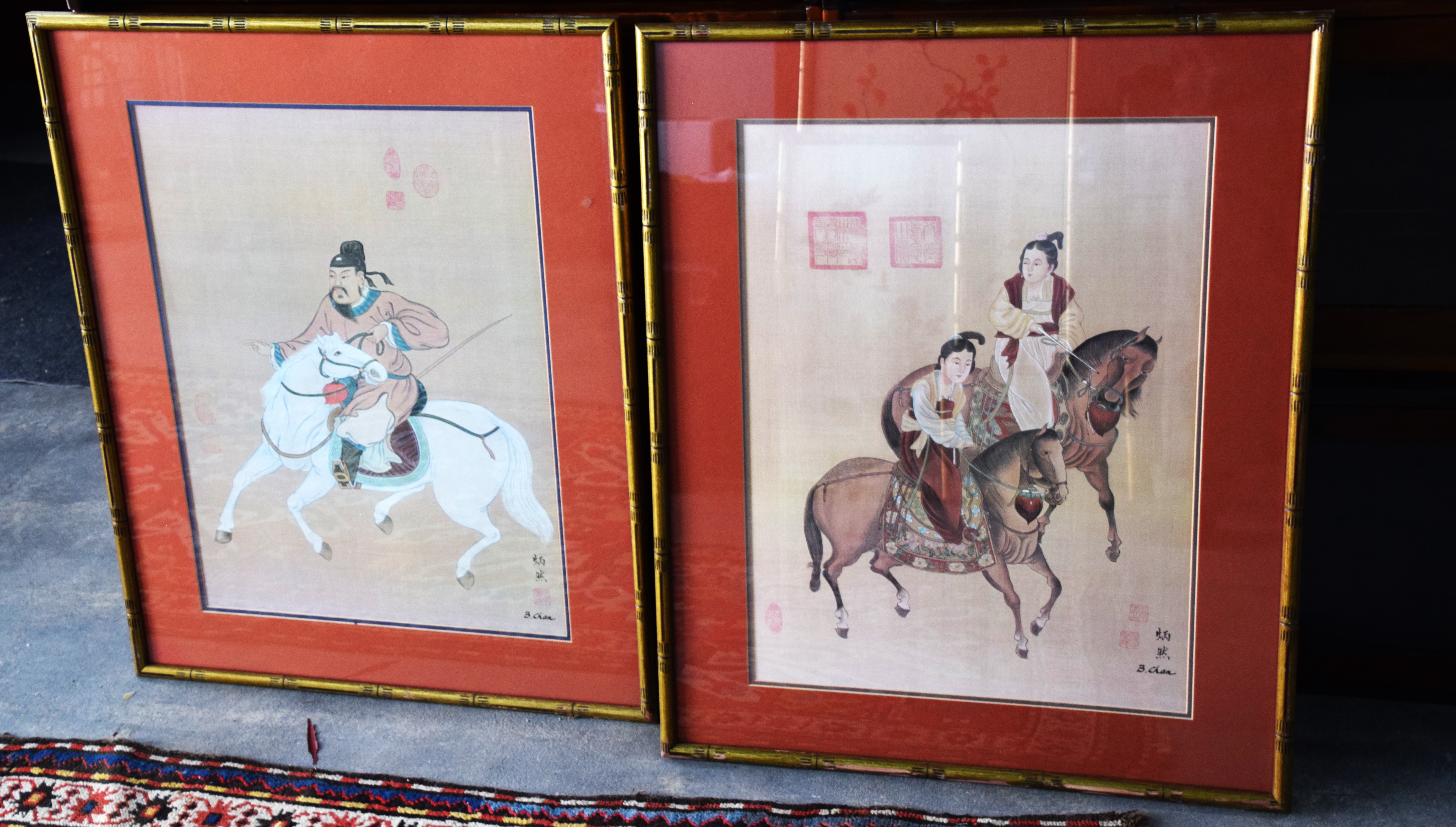 Framed pair of oriental watercolors on what appears to be linen with markings and signed B. Chan. The subjects are a man on horseback and two females on horseback. Dimensions: 26″ x 18″