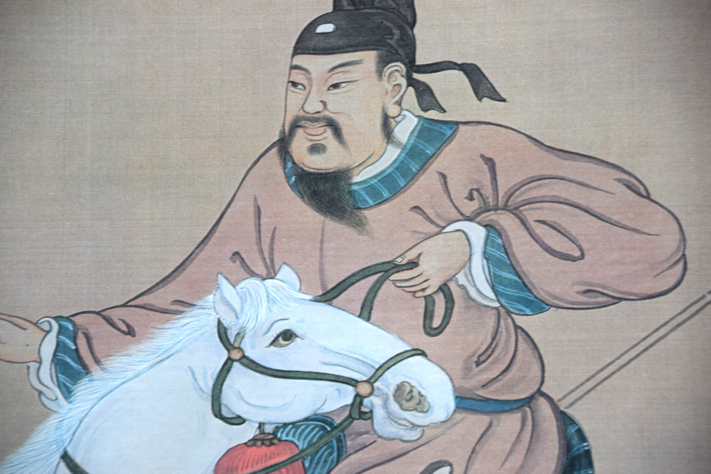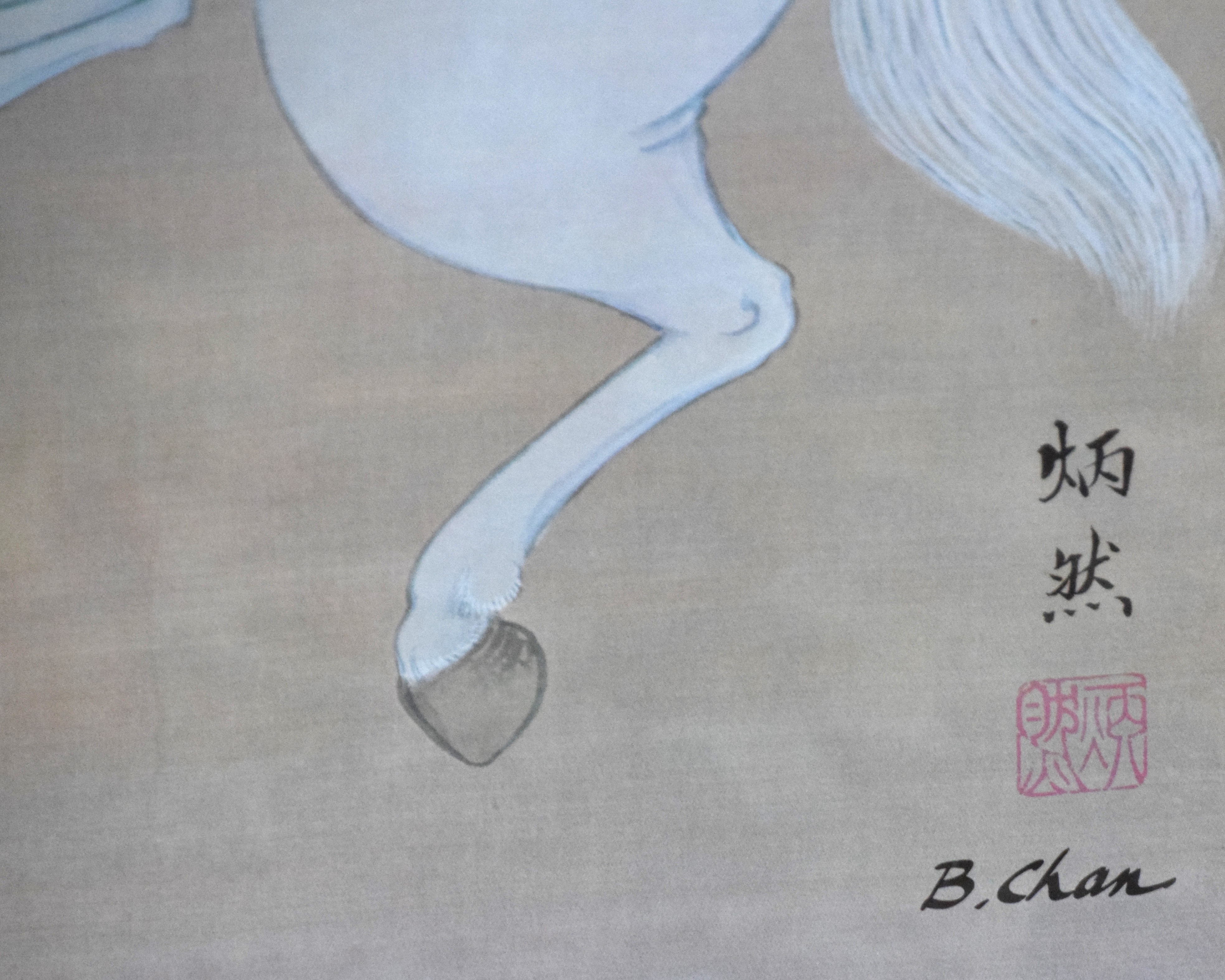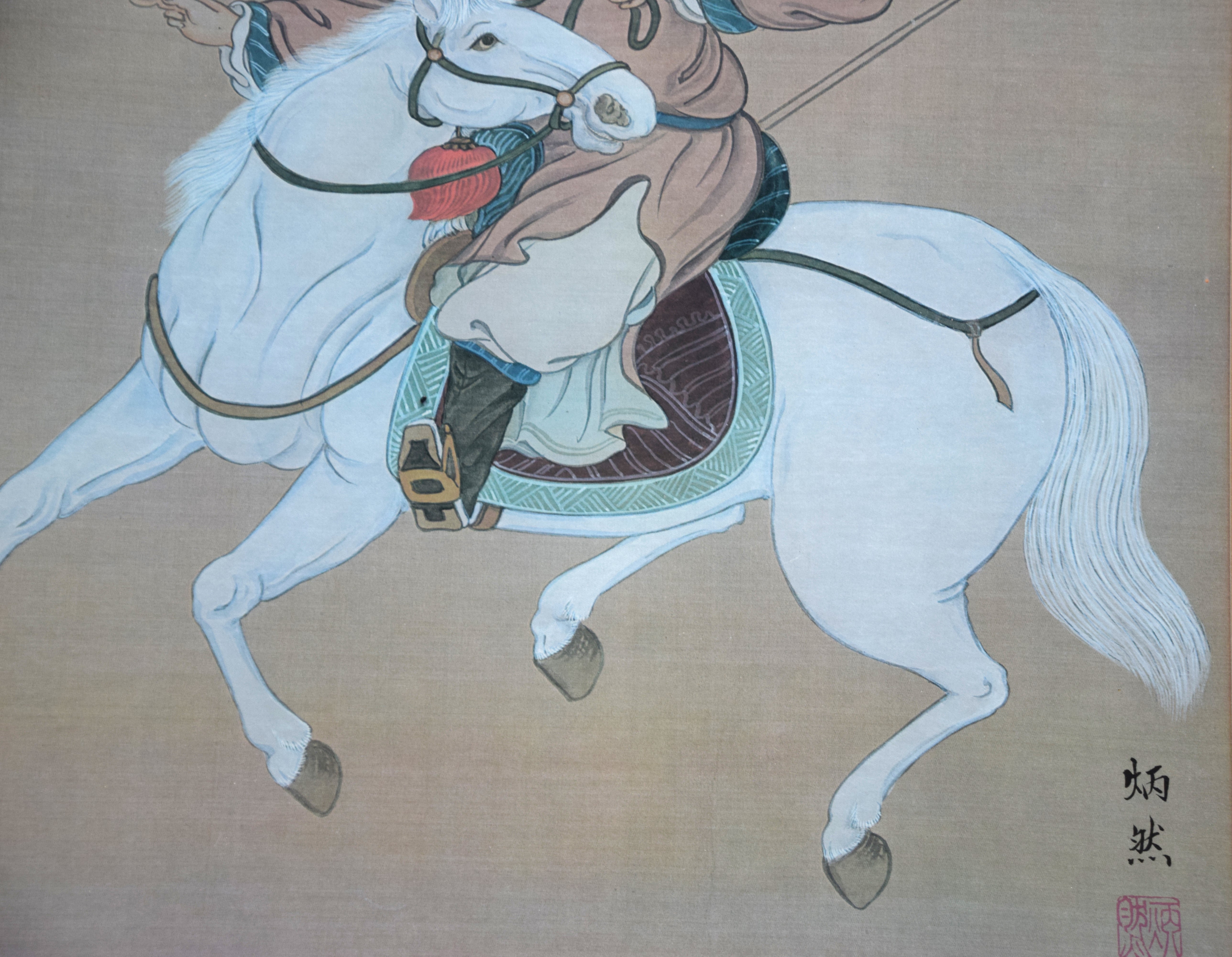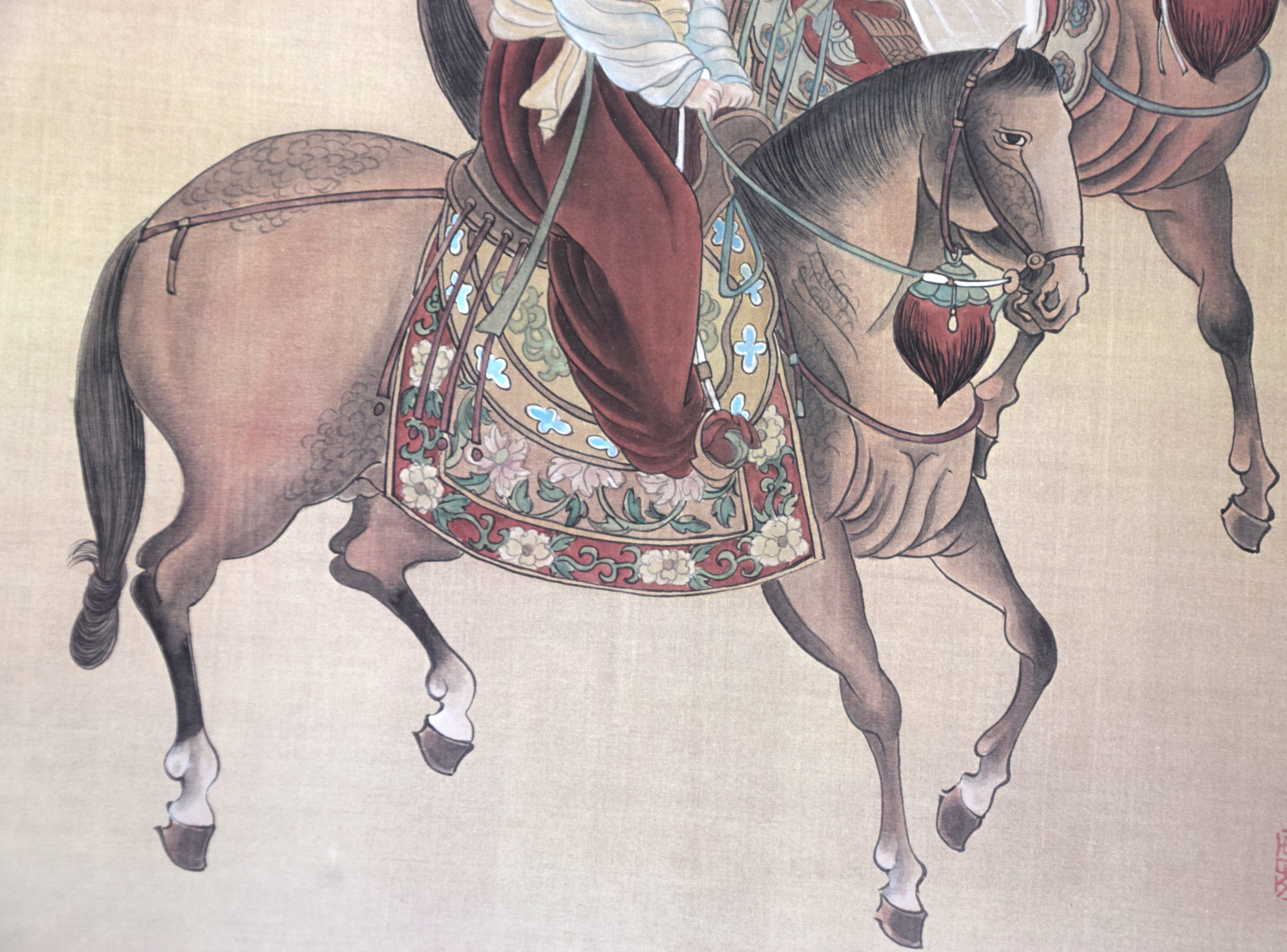 Framed pair of oriental watercolors on what appears to be linen with markings and signed B. Chan. The subjects are a man on horseback and two females on horseback. Dimensions: 26″ x 18″