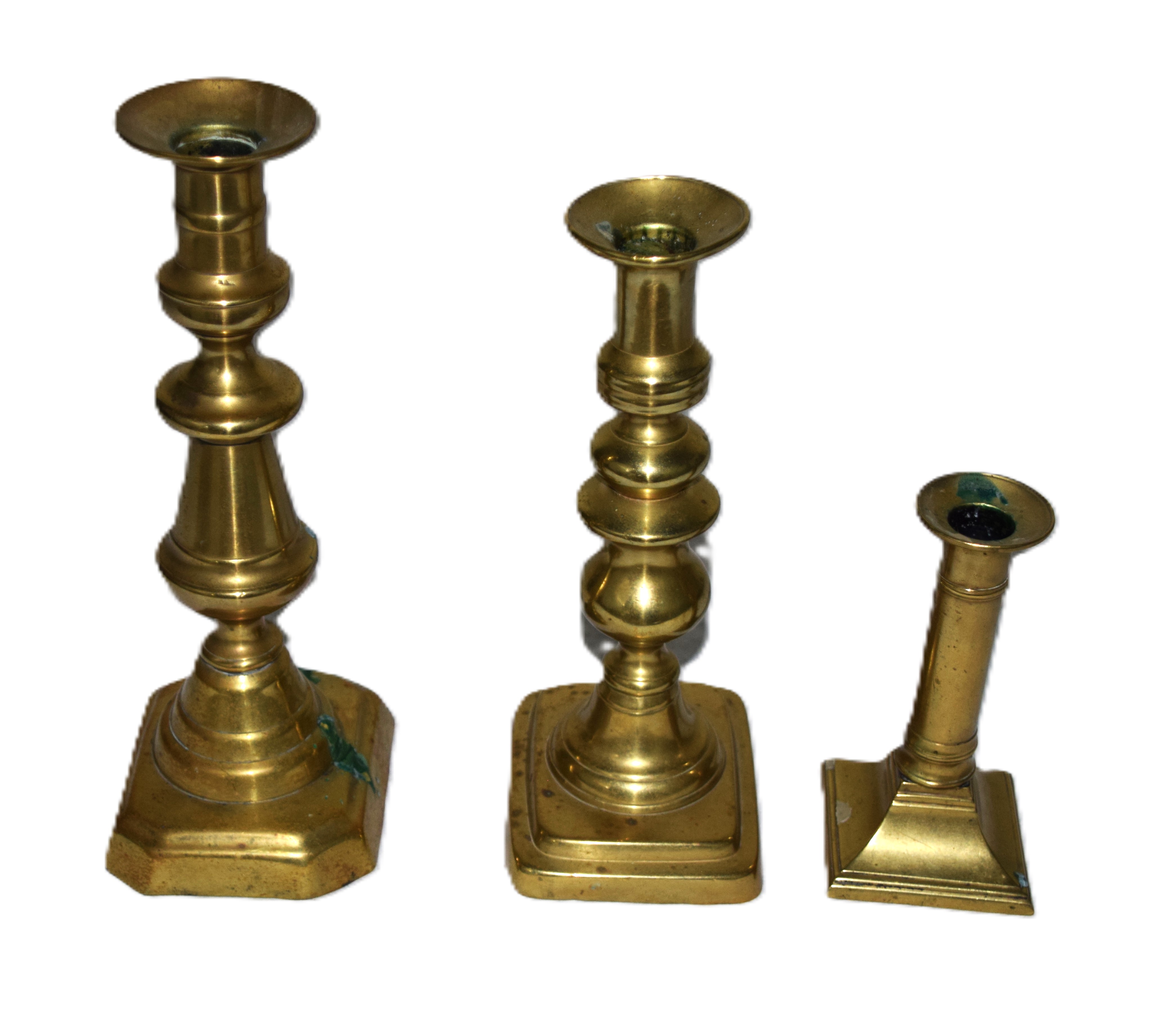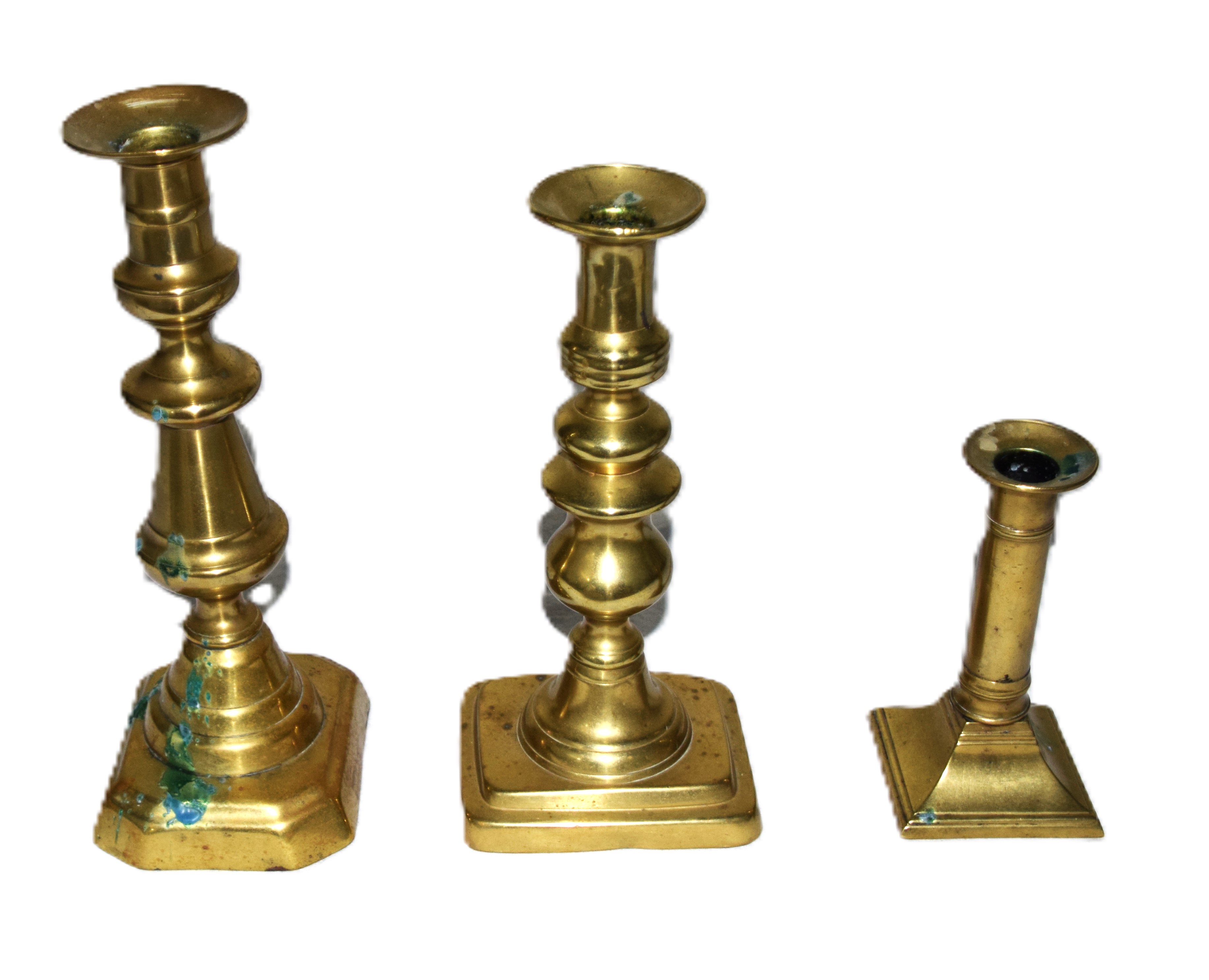 Three brass candlesticks of different designs. Dimensions: 10″ to 5.5″