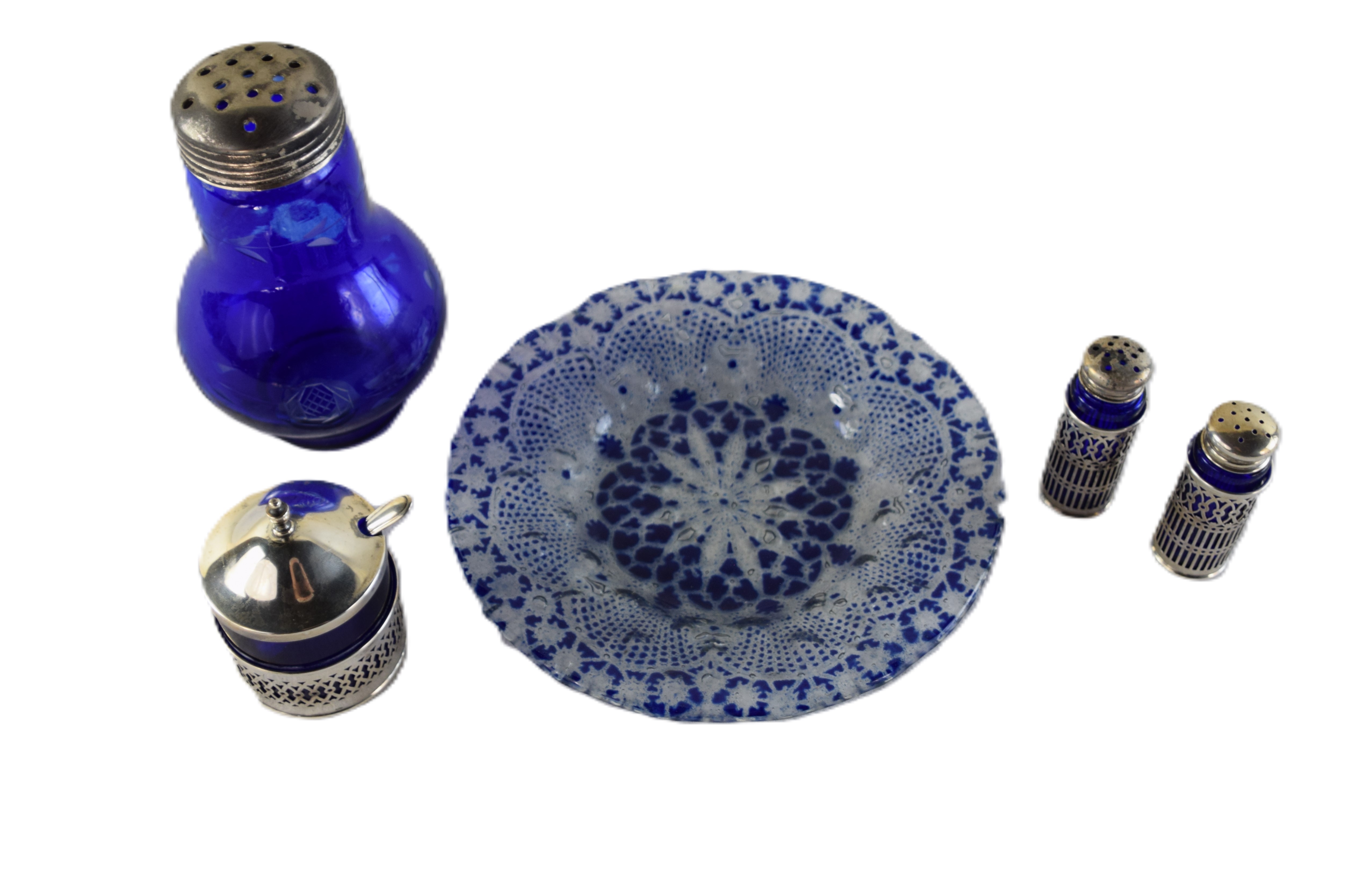 Five piece glass lot to include a cobalt blue etched muffineer shaker 6″ H; pair of cobalt blue salt shakers with Sterling silver holders, 3″ H; a cobalt blue mustard with Sterling silver holder and spoon, 3″ H; and a artist signed ( C. Bray) glass blue plate 7″ Diameter